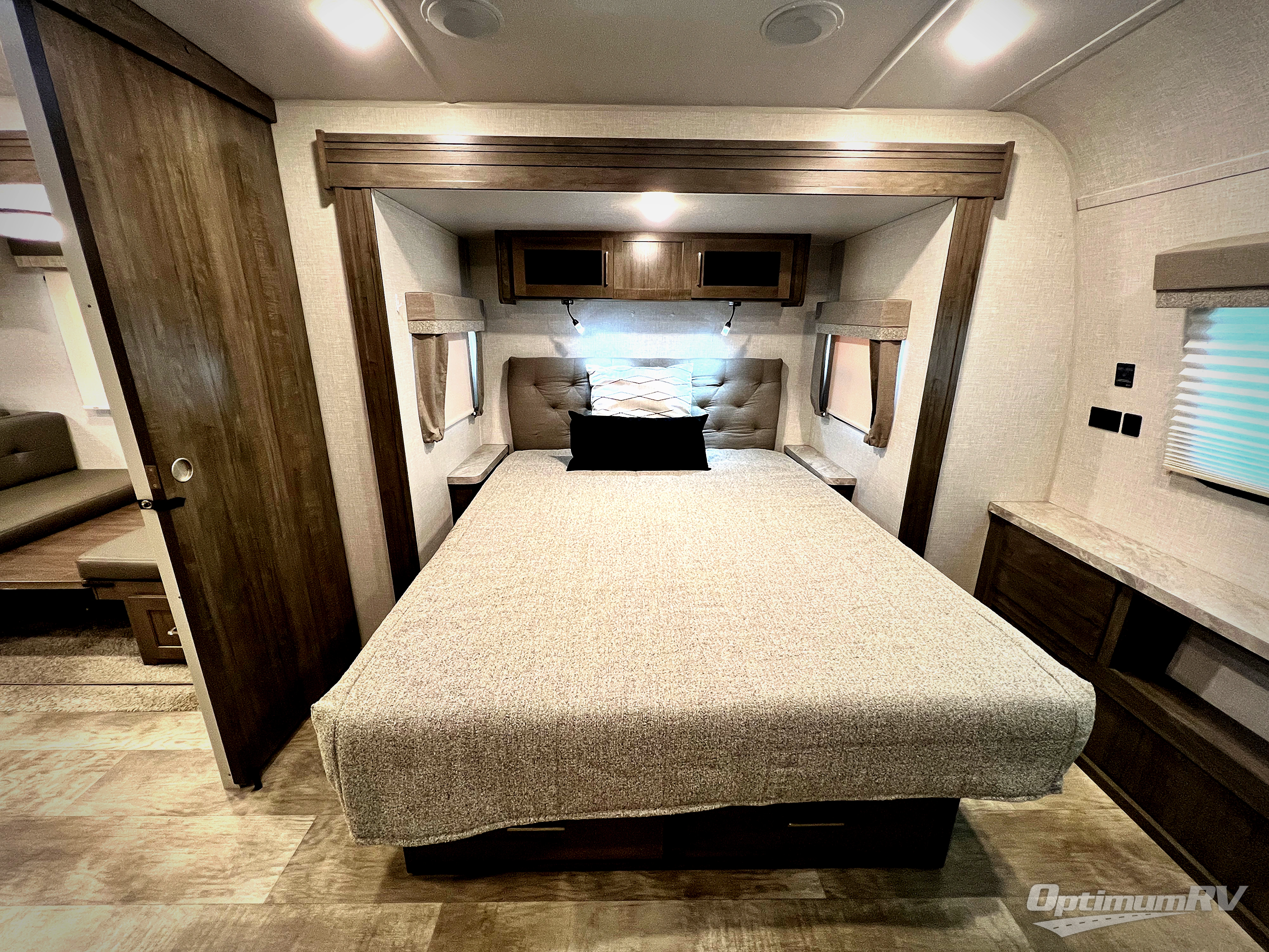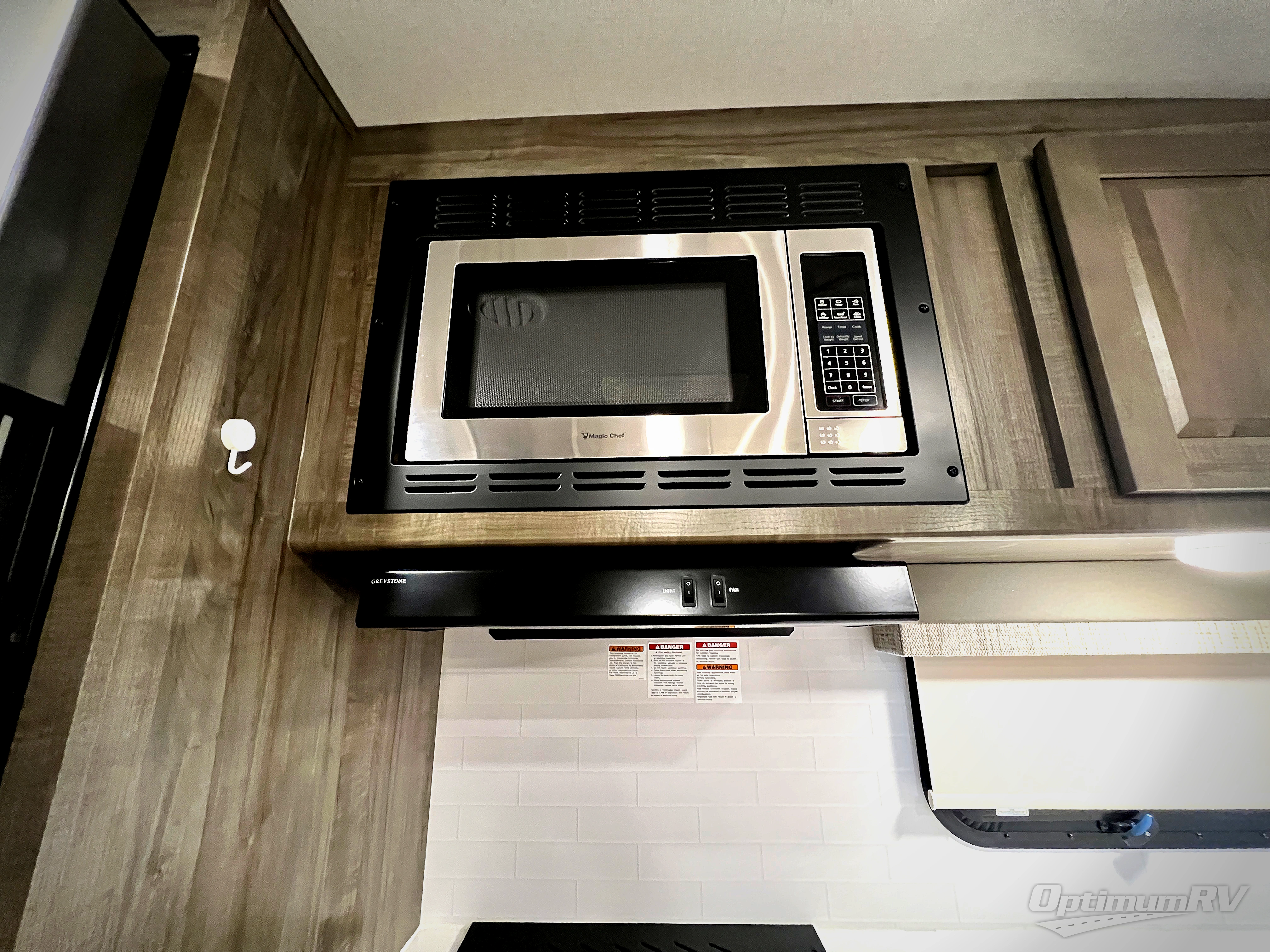 Whether you camp at state parks, National forests or on your friend's land, this trailer offers you plenty of floor space thanks to the two slide outs! As you enter the main entrance near the rear kitchen you can grab a drink from the refrigerator or a snack from the pantry and relax on the 60" theater seating or sit at the booth dinette. The LED TV offers entertainment while the fireplace will keep you cozy during the cooler months. Everyone will appreciate having a full bathroom to get cleaned up in, and the front bedroom gives you privacy and a queen bed slide, plus storage and the second exterior entry.