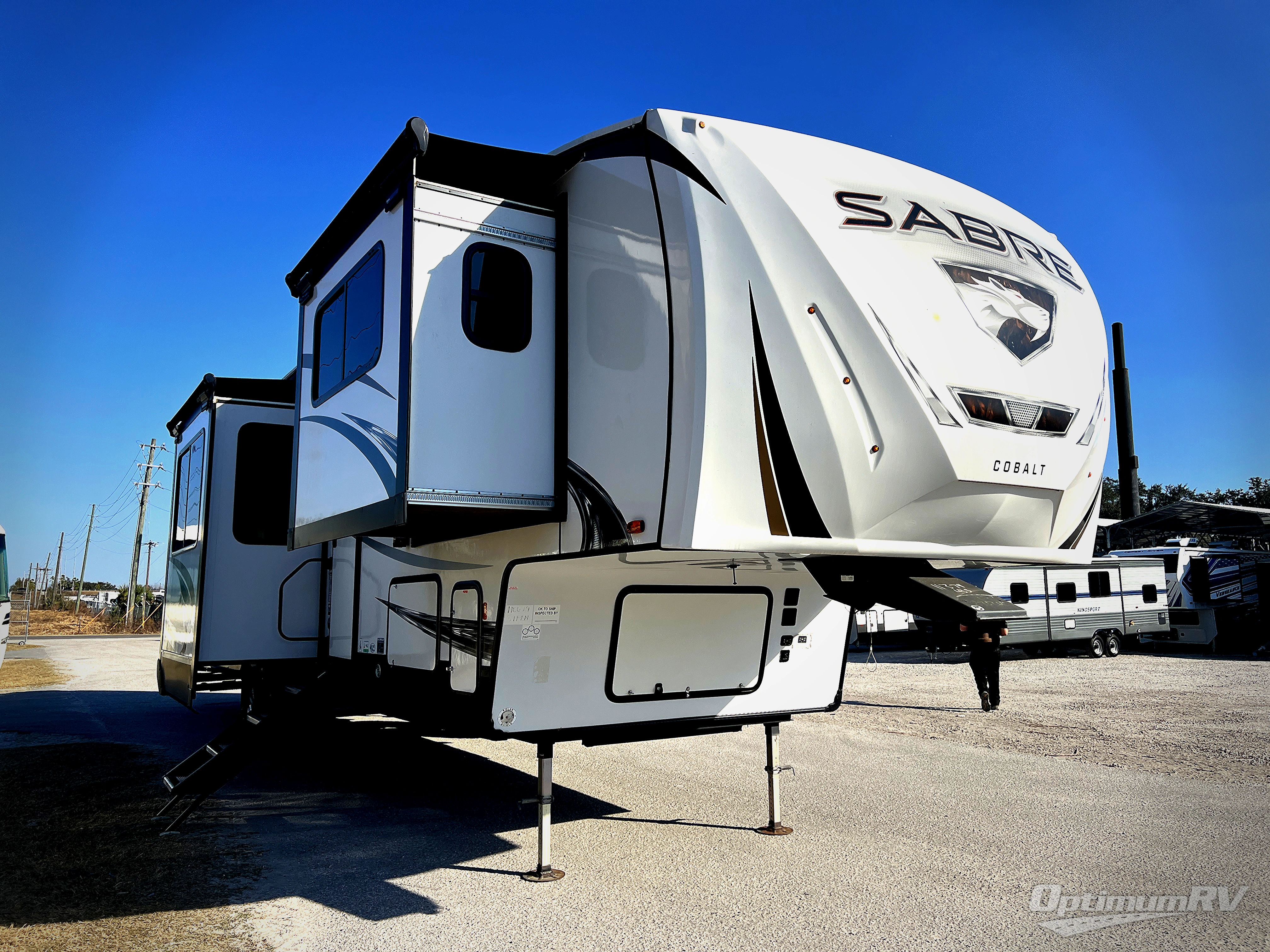 You will experience luxurious camping trips at an affordable price with any one of these Forest River Sabre fifth wheels! These models are durable and ready to travel anytime of the year thanks to features like the high-gloss gel-coat front cap with LED lighting, the PVC roof membrane, and the forced air underbelly with enclosed gate valves. The electric auto-leveling system makes setting up easy and safe, and the adjustable power awning with LED lighting will create an inviting outdoor living space. Each model includes a universal docking station which includes a black tank flush and an outside shower, and the backlit "Secure Step" landing for you to enter and exit the unit safely. Inside, you will love the design of the ambient accent lighting above the crown molding in the living area, the real wood lumbercore cabinetry, and the vintage gaslight decorative lighting!