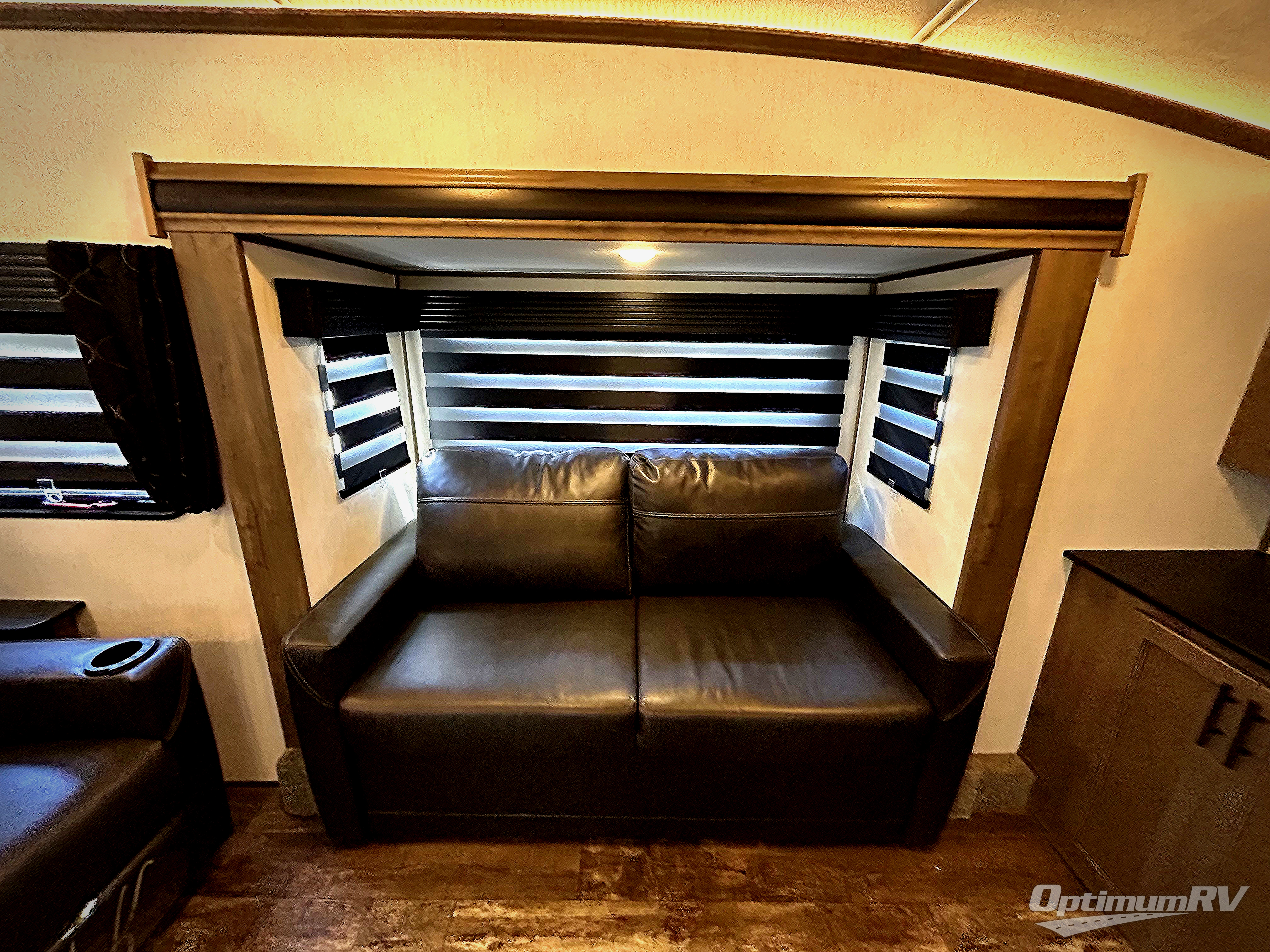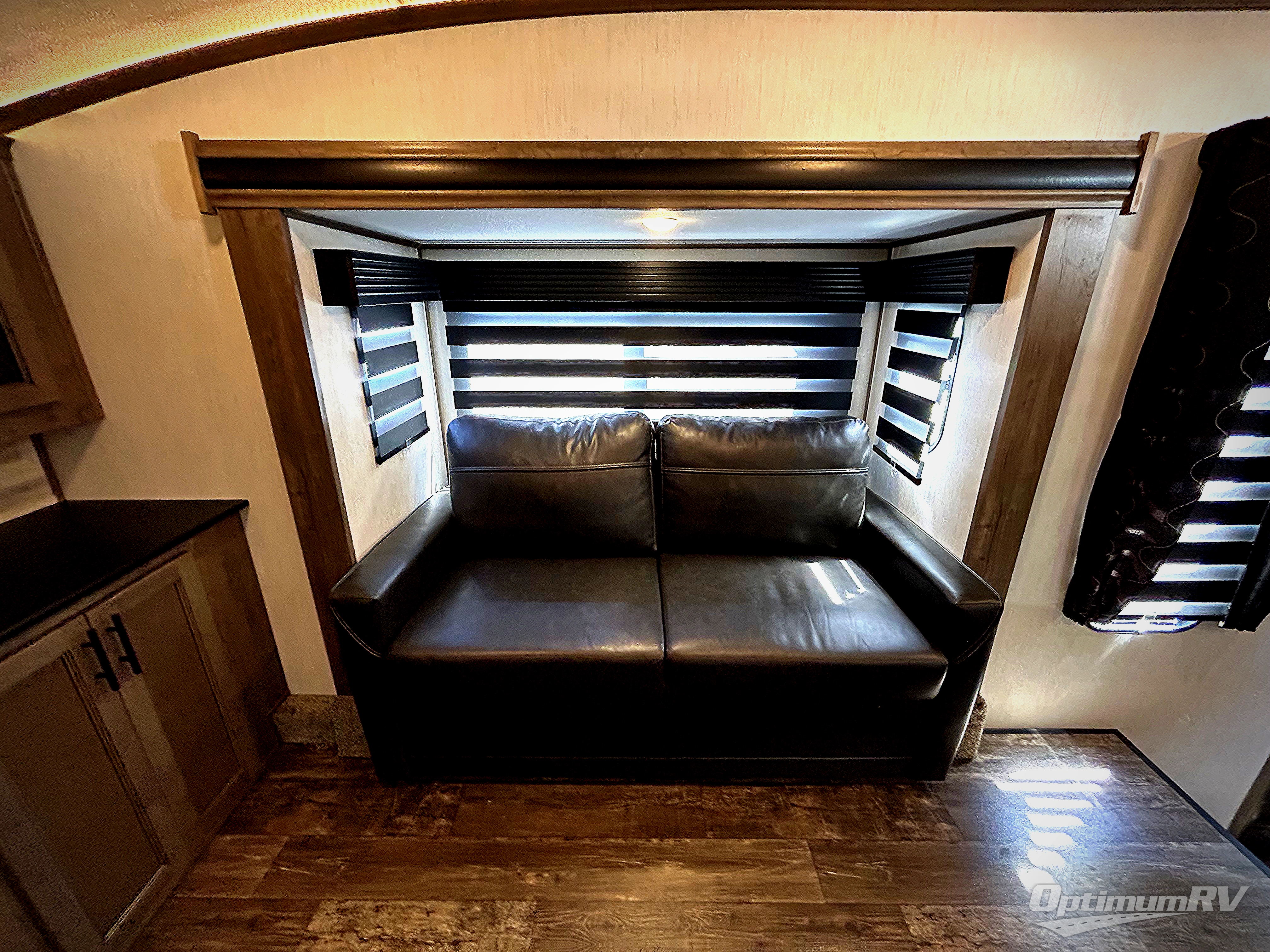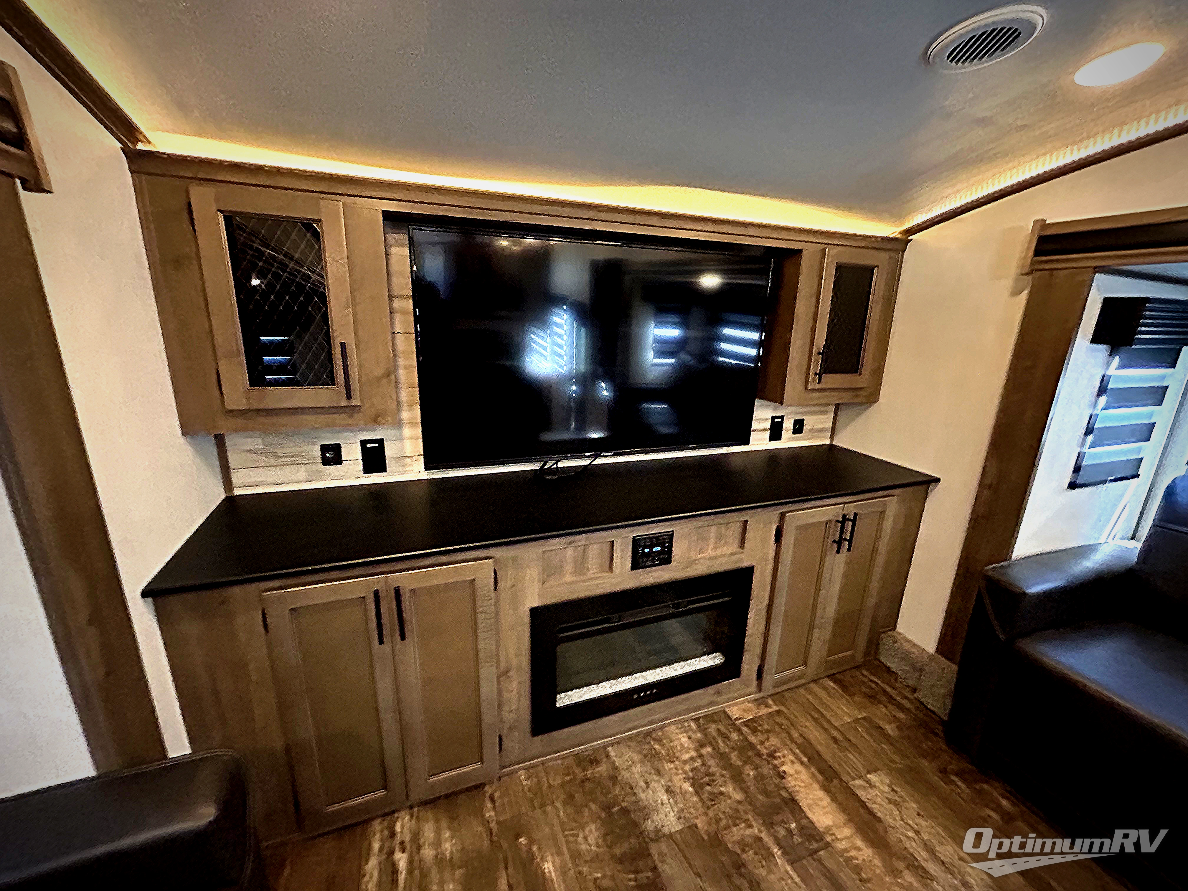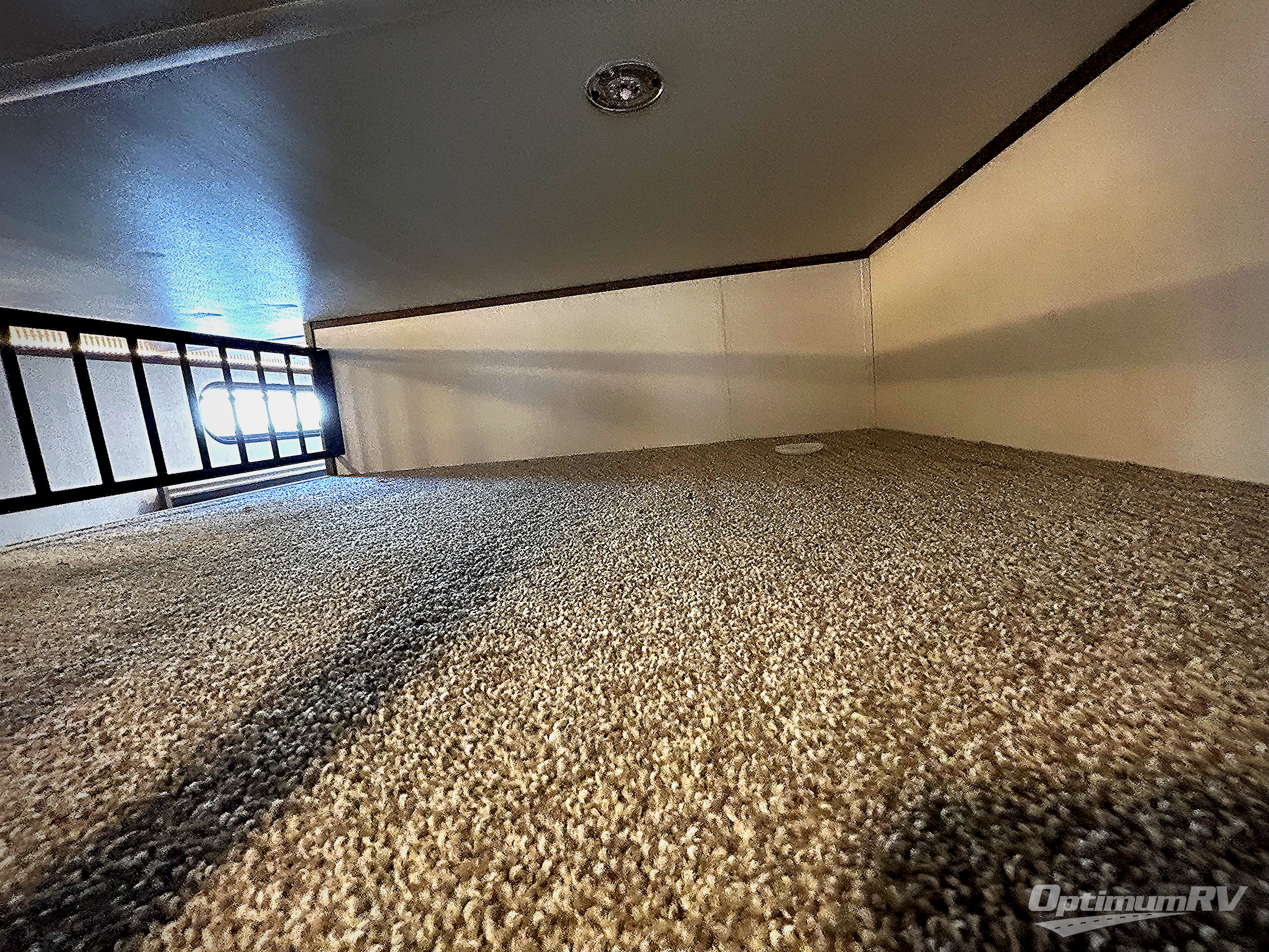 There is only one word that can describe this Sabre fifth wheel: fabulous! You will be amazed by the amount of comfortable convenience that is scattered all throughout this model for you and your family or friends. From the tri-fold sofa slides, the theater seats, the fireplace and entertainment center in the front living room to the rear bedroom with its queen bed and wardrobe slide out, you will always have a place to relax and unwind. Not only that, but there is also a large loft area up above the bedroom and bath which has sleeping space, storage, a wardrobe, and railing. The cook will enjoy the 12V refrigerator with French doors and pantry for all of your food storage needs, and the free-standing table with chairs is the perfect place to sit down and enjoy a delicious meal or play board games.