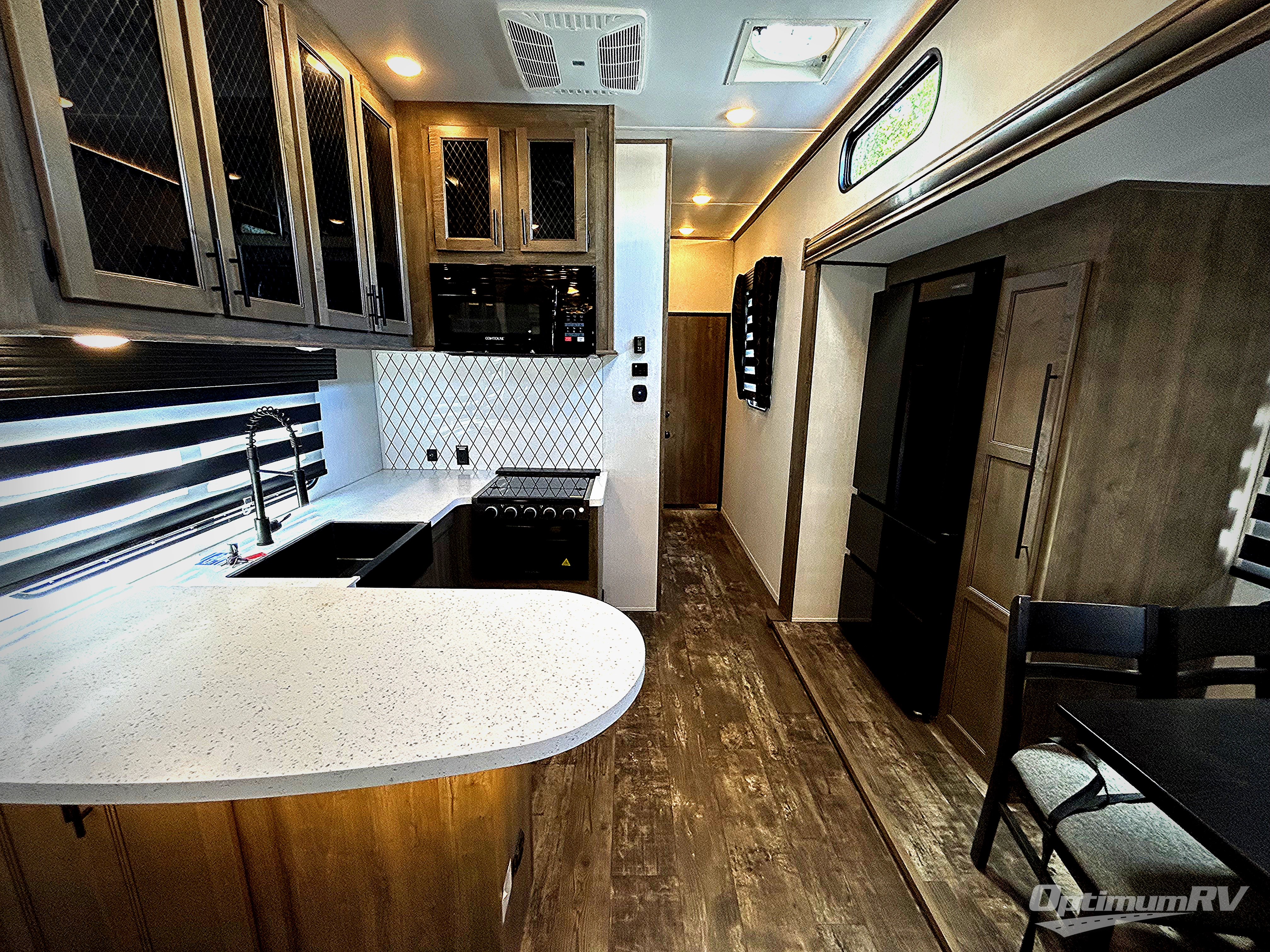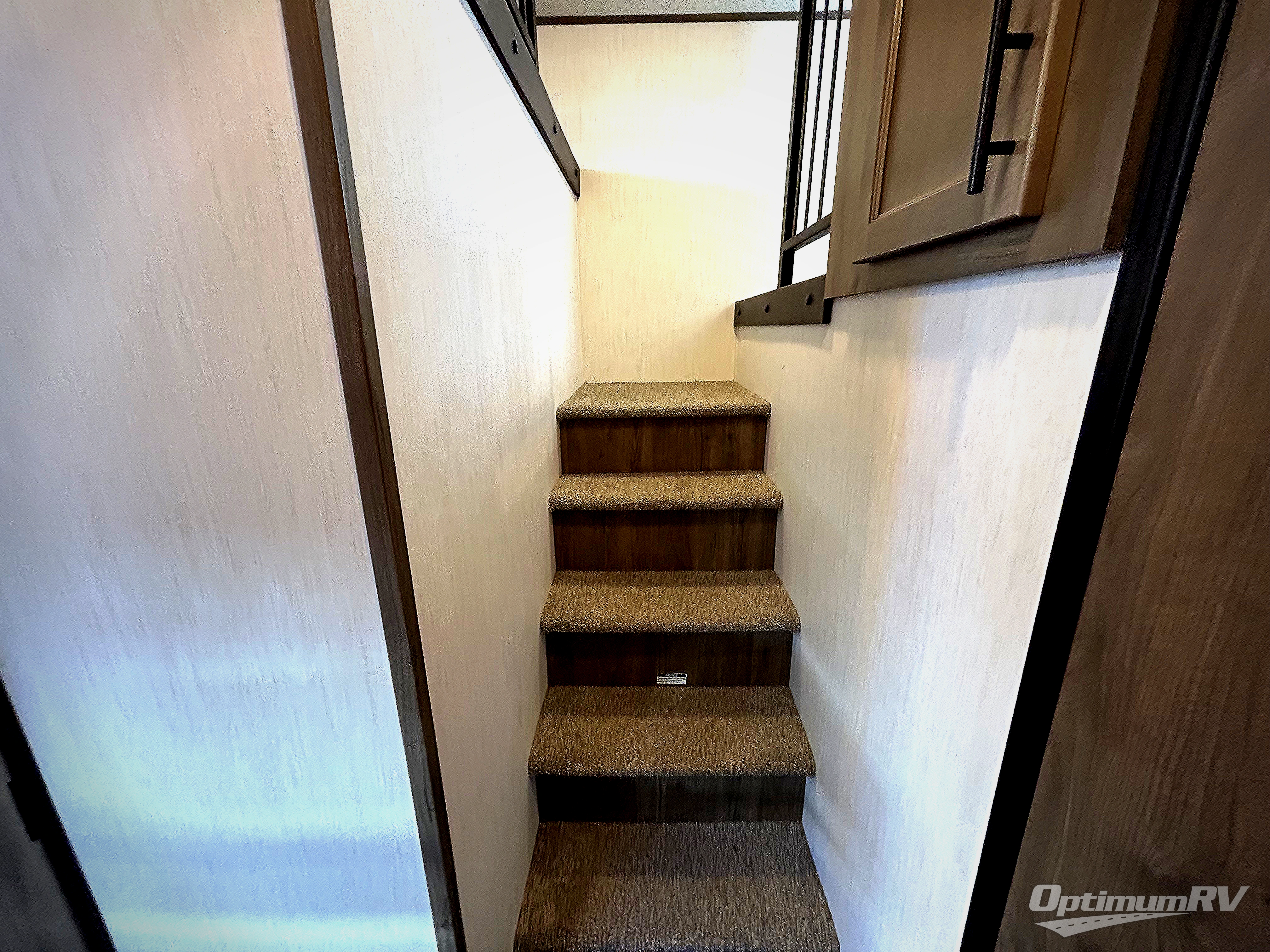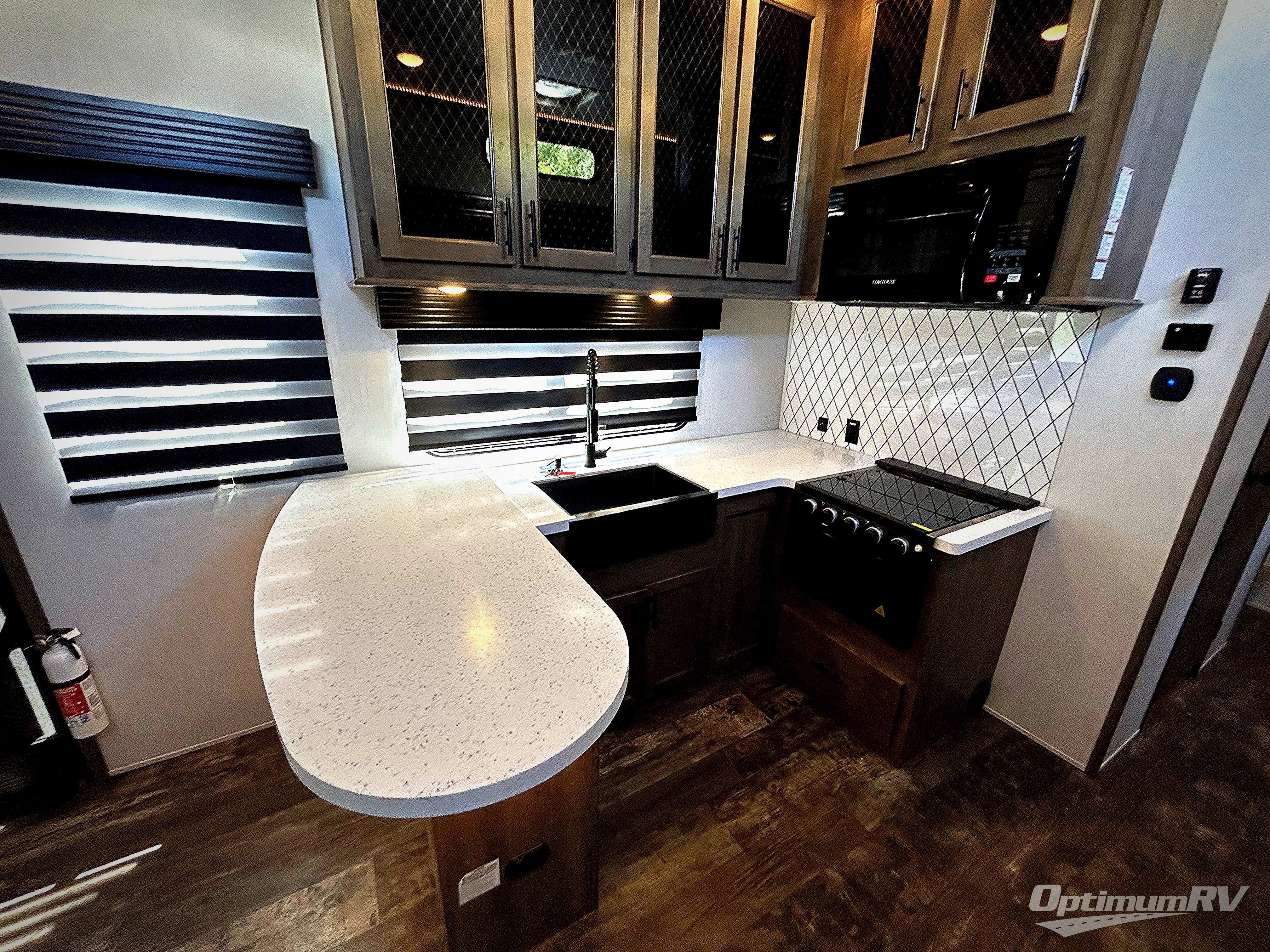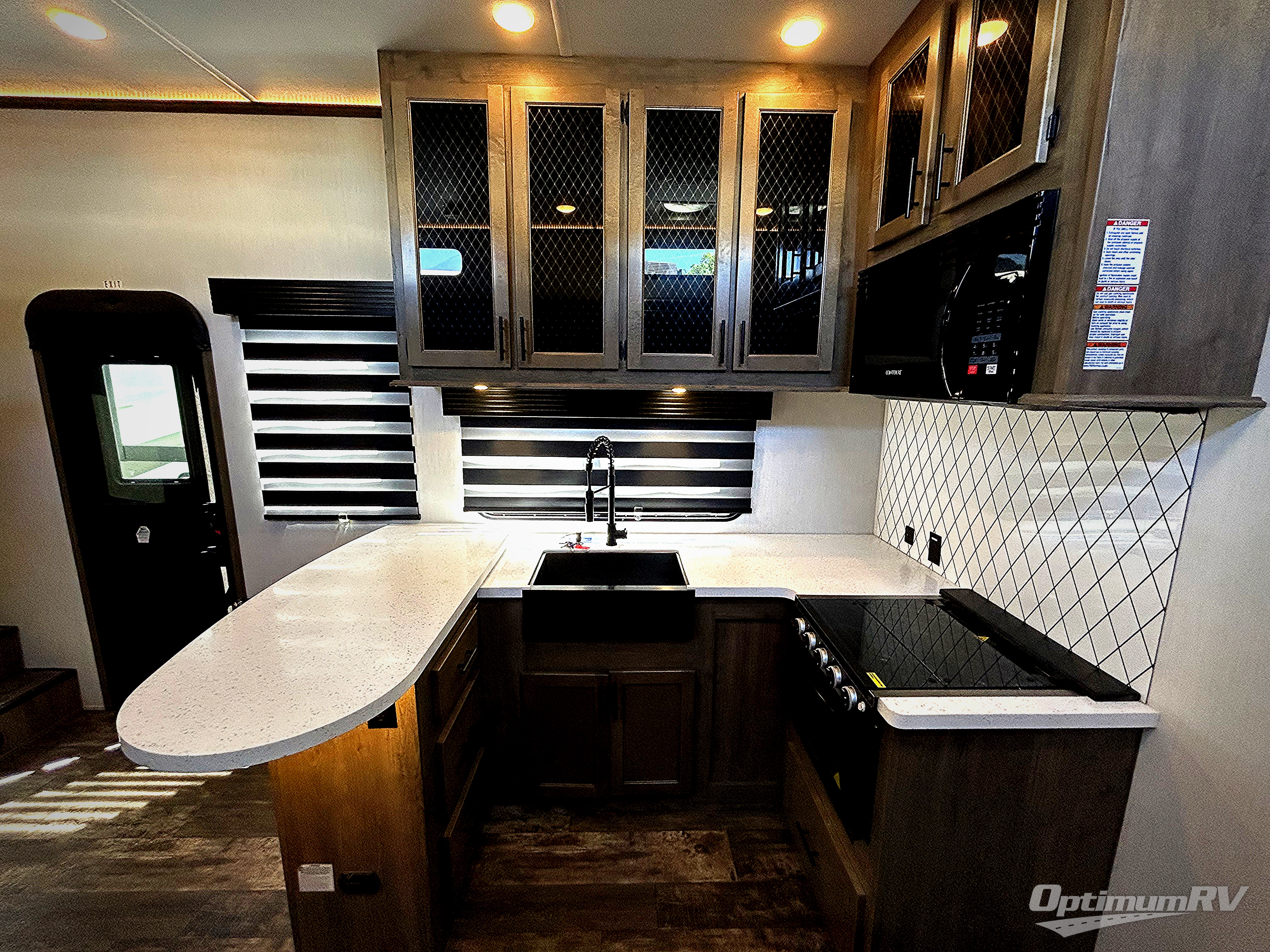 There is only one word that can describe this Sabre fifth wheel: fabulous! You will be amazed by the amount of comfortable convenience that is scattered all throughout this model for you and your family or friends. From the tri-fold sofa slides, the theater seats, the fireplace and entertainment center in the front living room to the rear bedroom with its queen bed and wardrobe slide out, you will always have a place to relax and unwind. Not only that, but there is also a large loft area up above the bedroom and bath which has sleeping space, storage, a wardrobe, and railing. The cook will enjoy the 12V refrigerator with French doors and pantry for all of your food storage needs, and the free-standing table with chairs is the perfect place to sit down and enjoy a delicious meal or play board games.