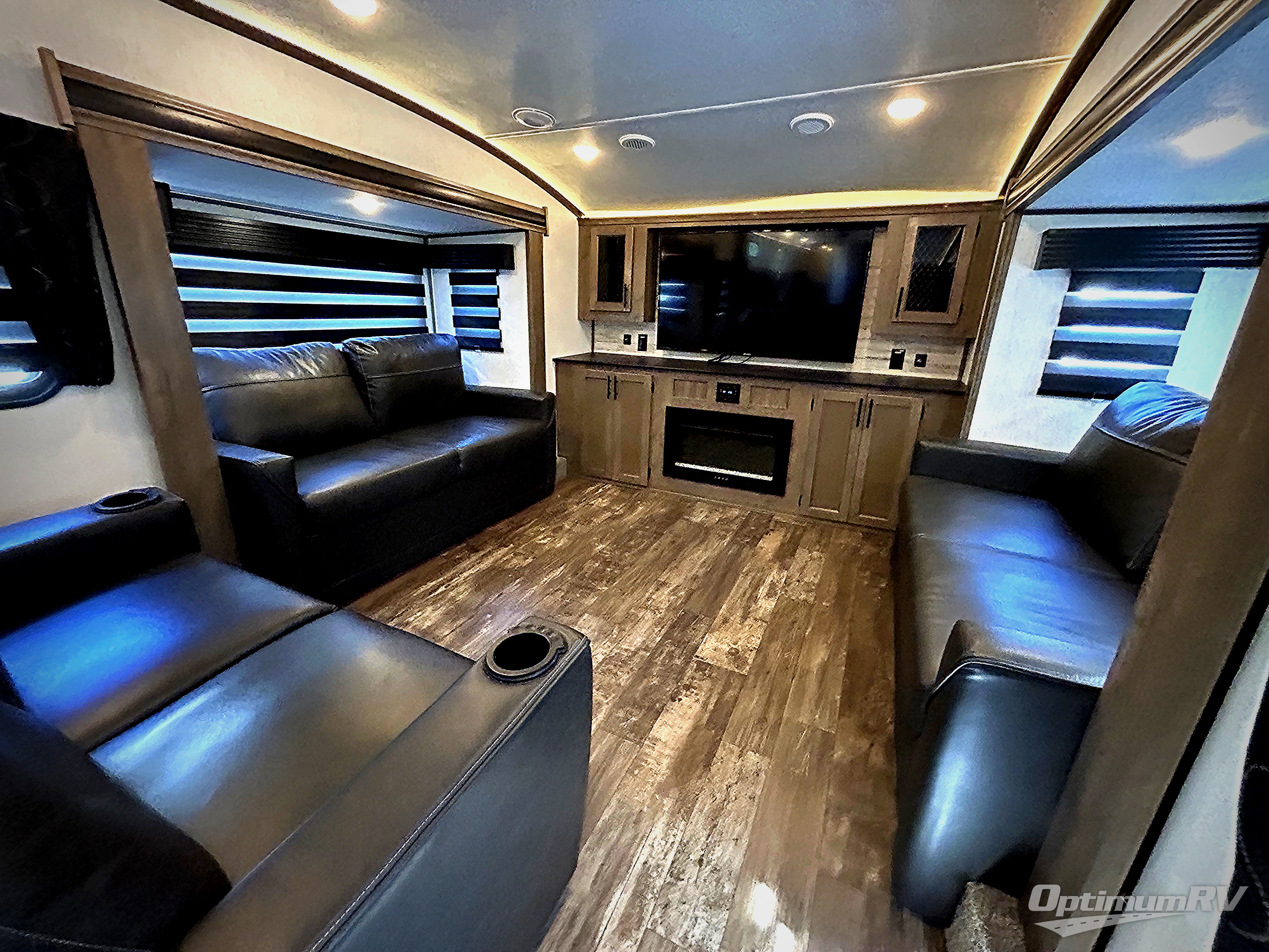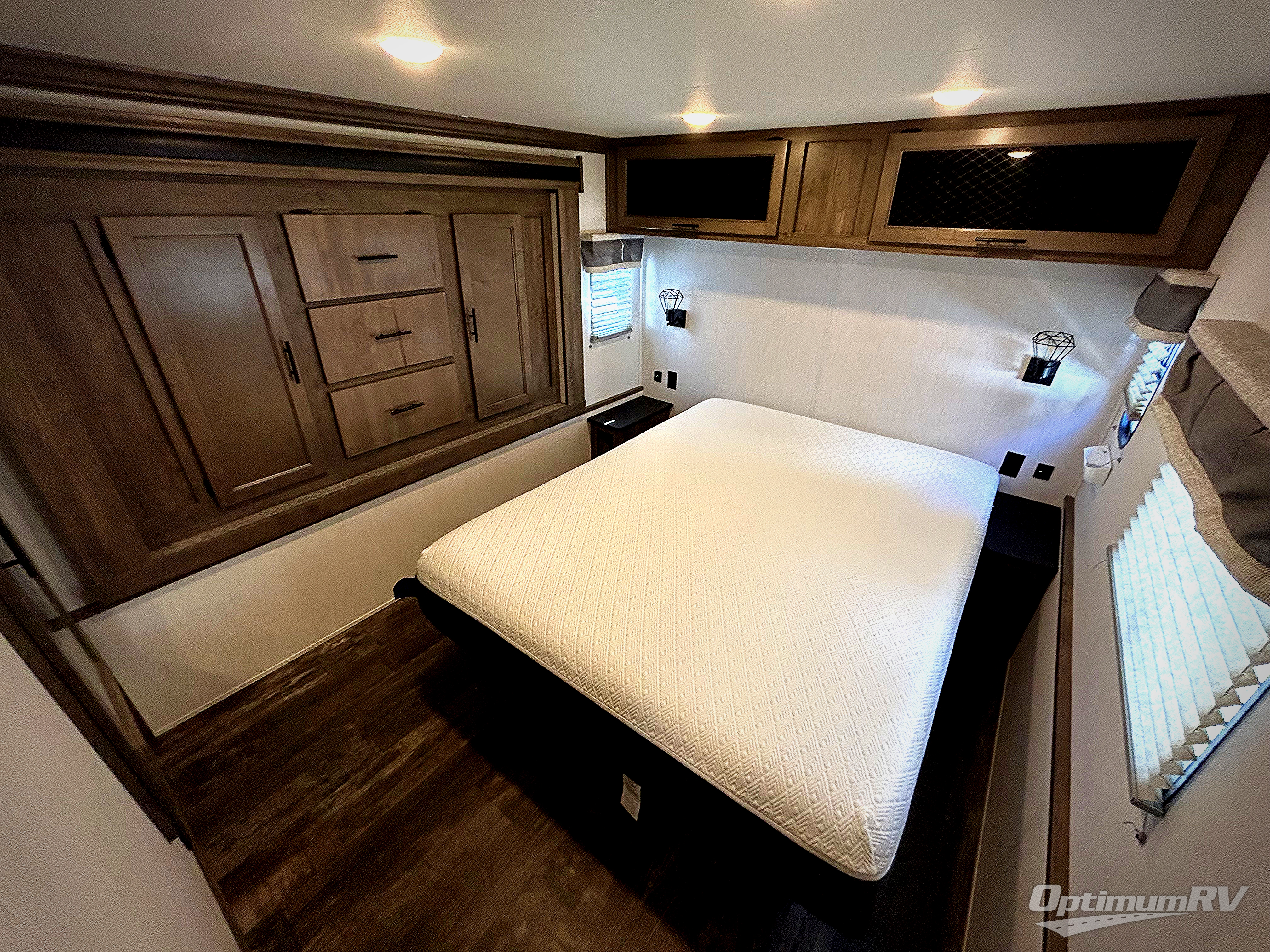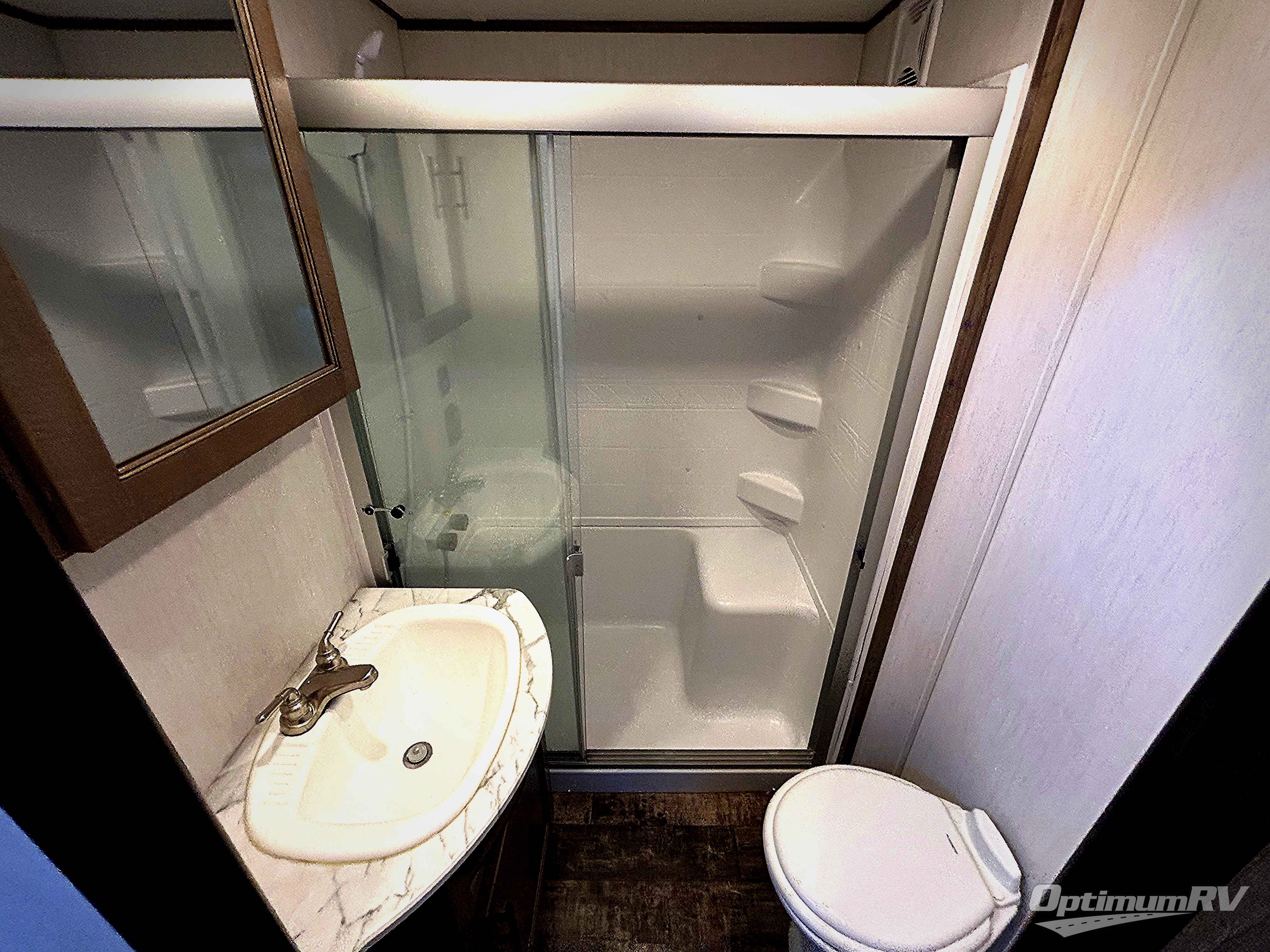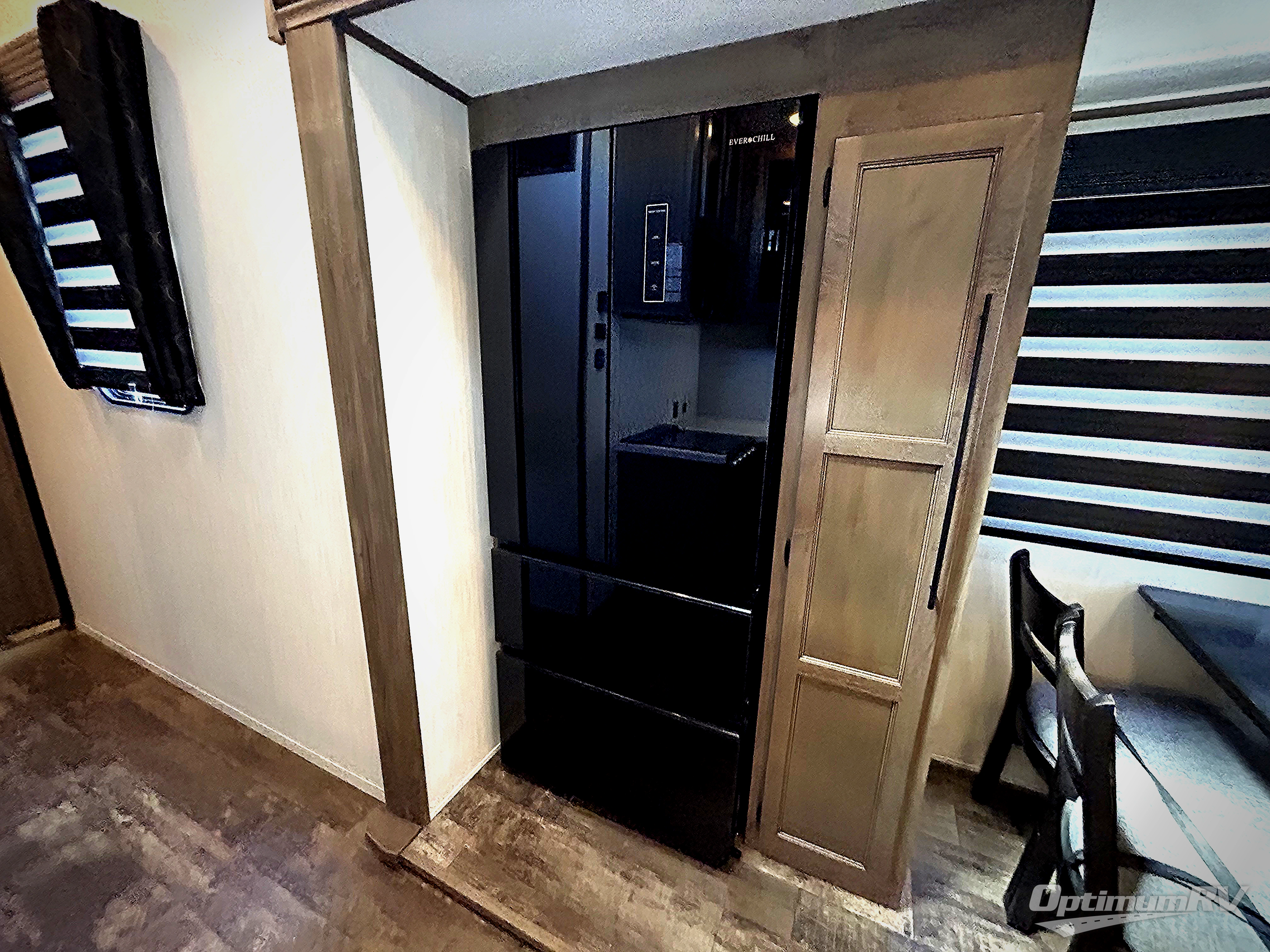 There is only one word that can describe this Sabre fifth wheel: fabulous! You will be amazed by the amount of comfortable convenience that is scattered all throughout this model for you and your family or friends. From the tri-fold sofa slides, the theater seats, the fireplace and entertainment center in the front living room to the rear bedroom with its queen bed and wardrobe slide out, you will always have a place to relax and unwind. Not only that, but there is also a large loft area up above the bedroom and bath which has sleeping space, storage, a wardrobe, and railing. The cook will enjoy the 12V refrigerator with French doors and pantry for all of your food storage needs, and the free-standing table with chairs is the perfect place to sit down and enjoy a delicious meal or play board games.