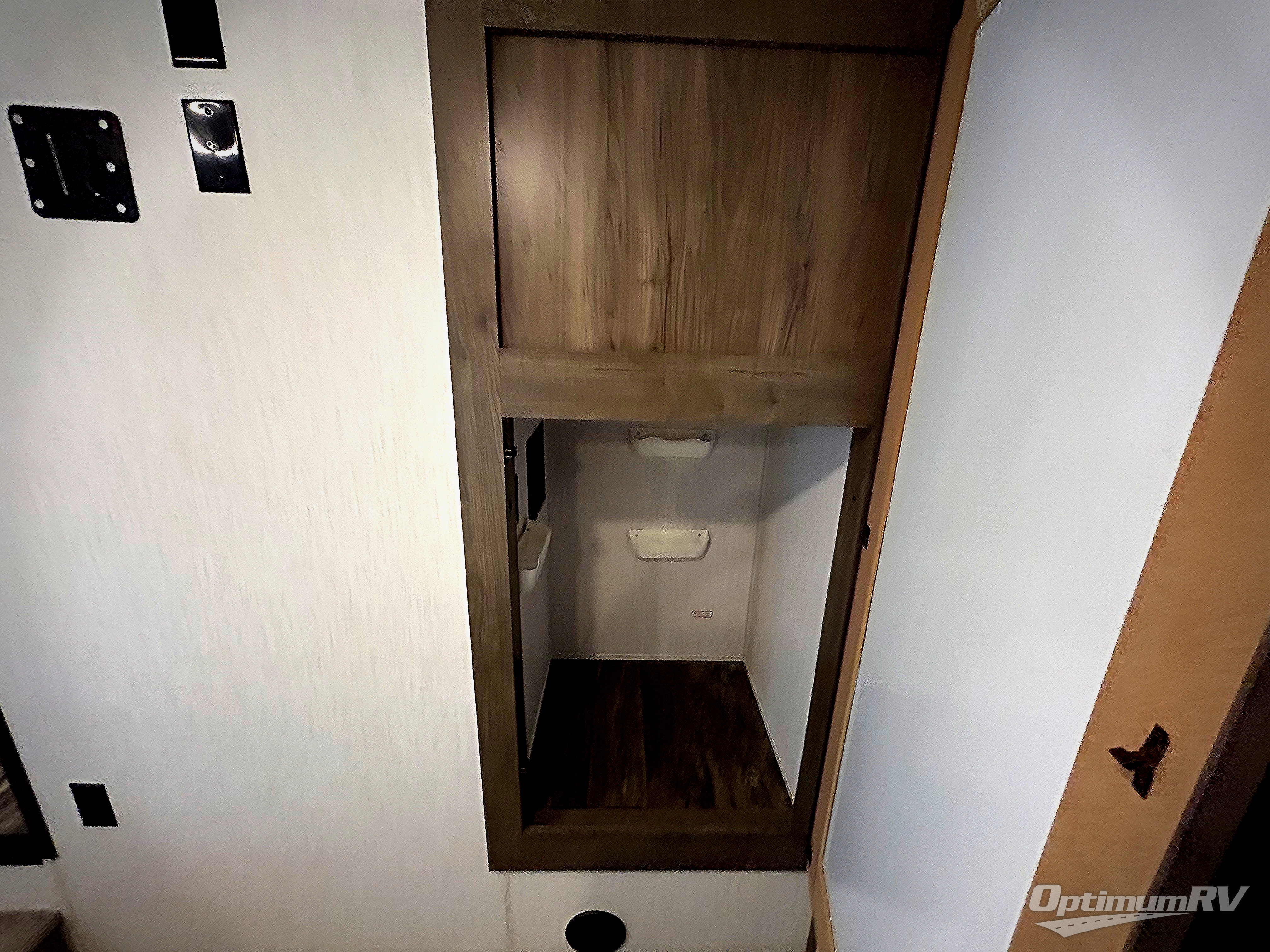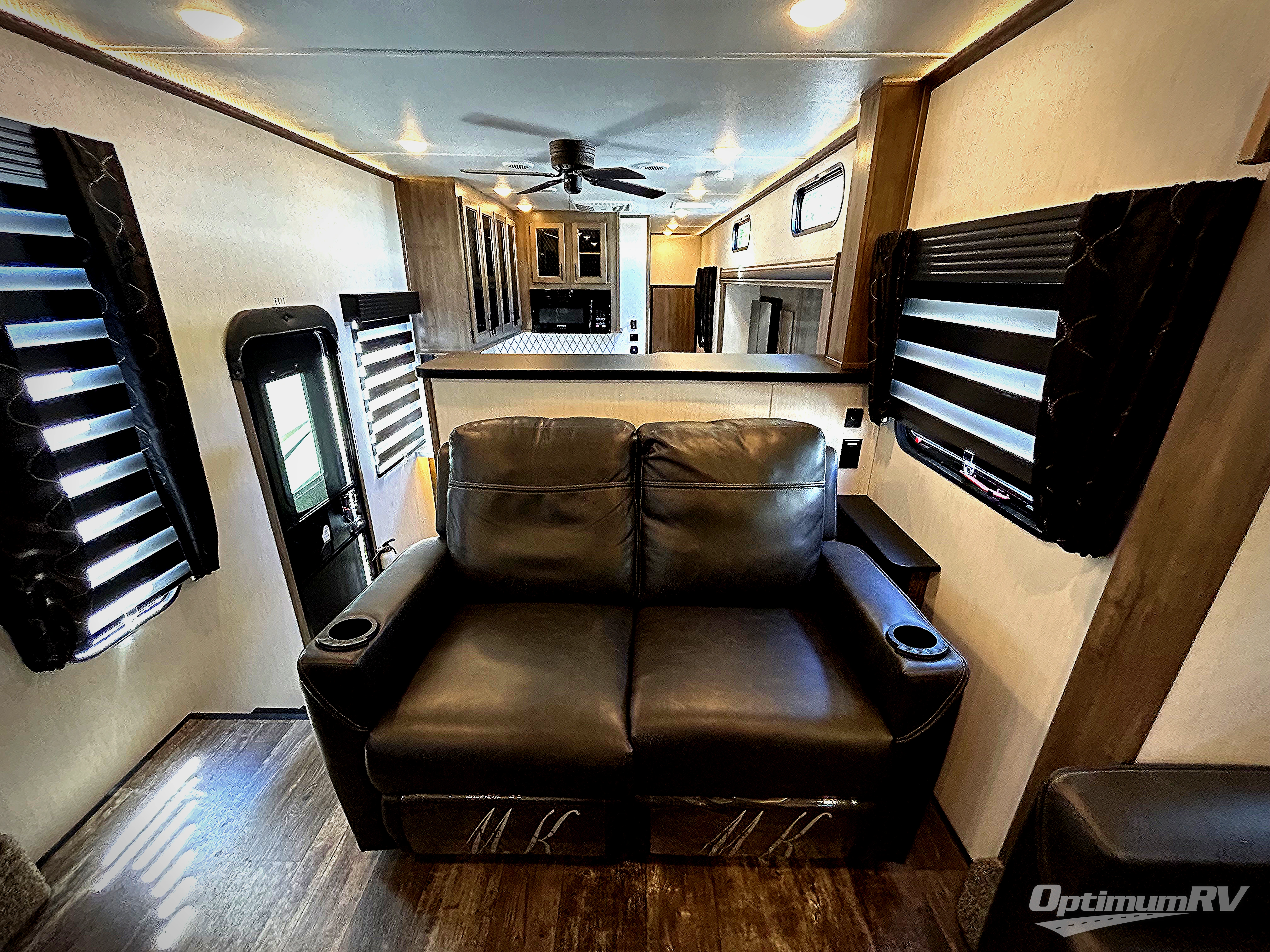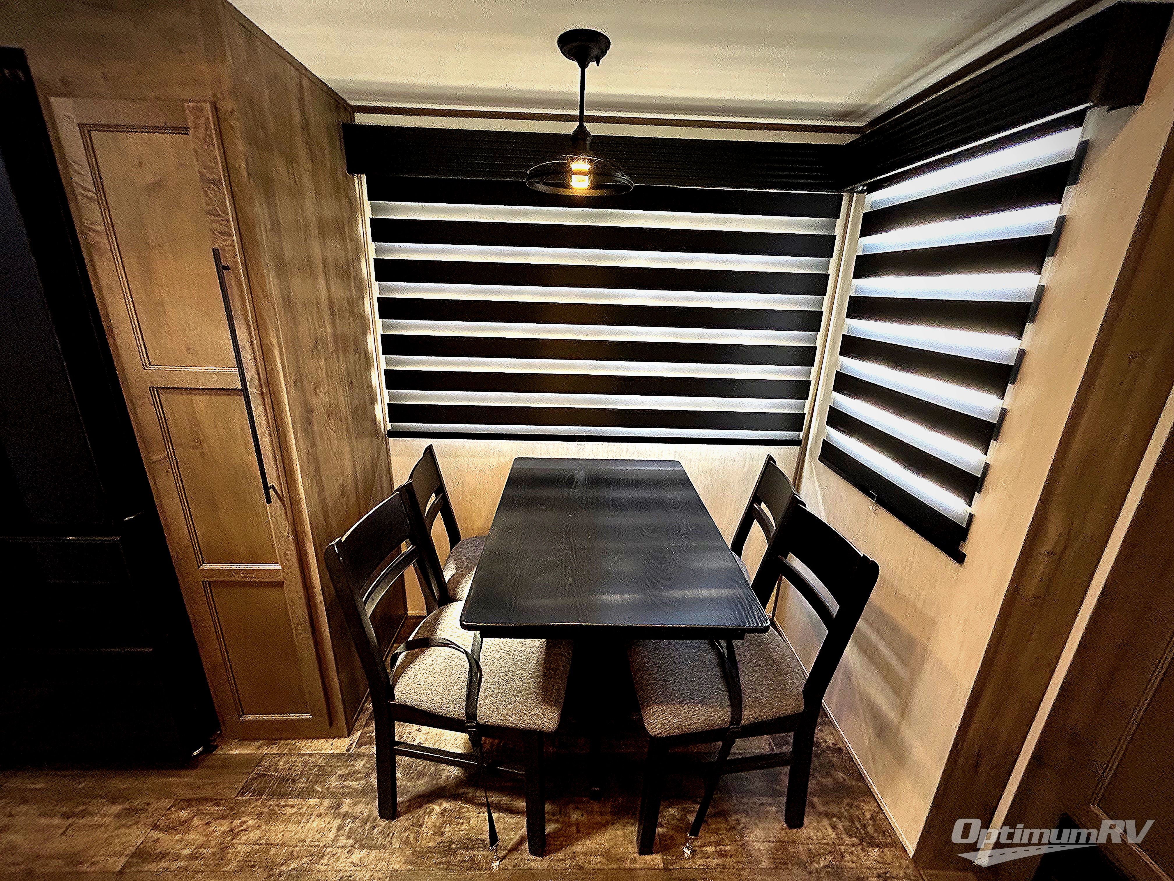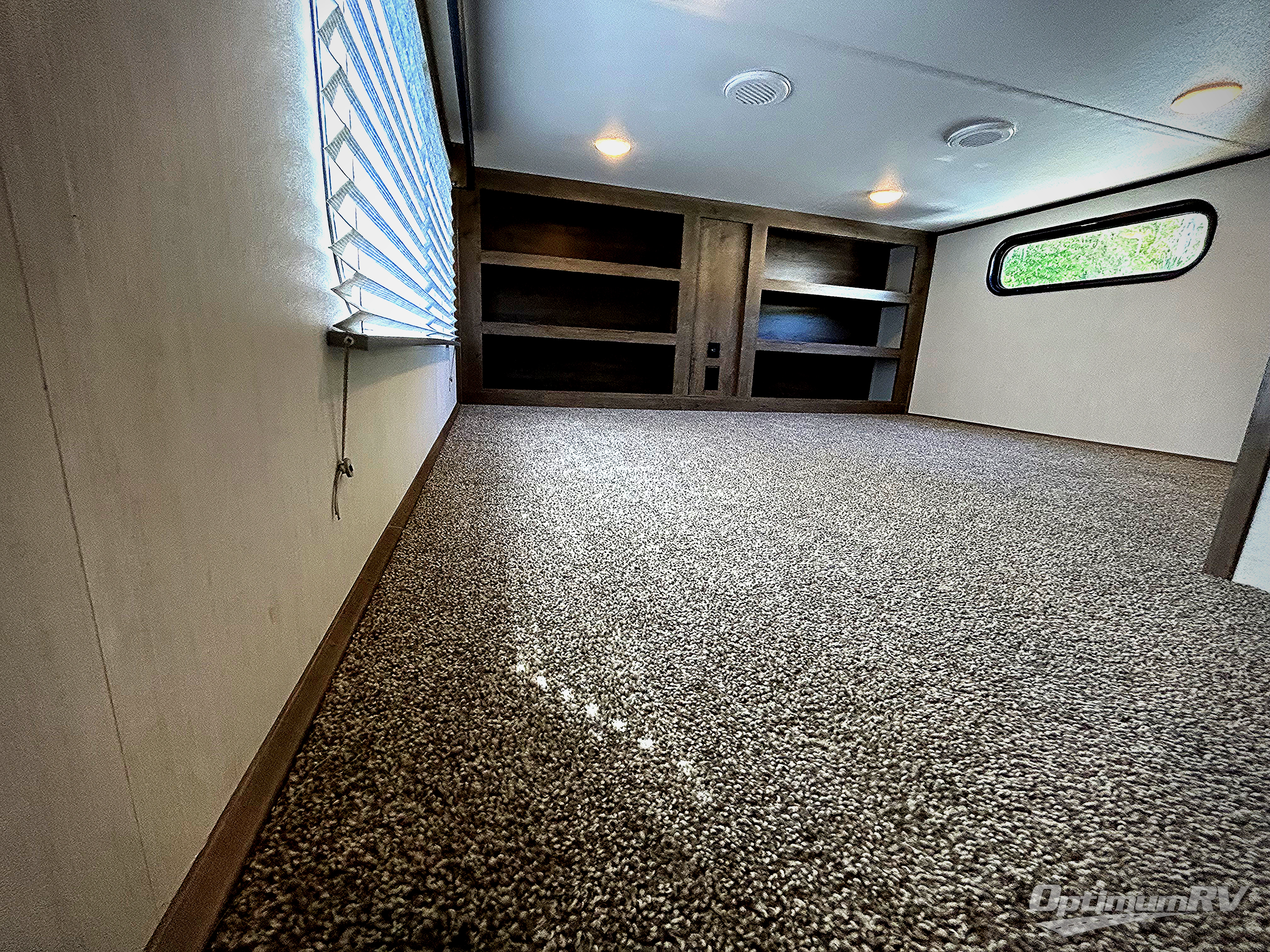 There is only one word that can describe this Sabre fifth wheel: fabulous! You will be amazed by the amount of comfortable convenience that is scattered all throughout this model for you and your family or friends. From the tri-fold sofa slides, the theater seats, the fireplace and entertainment center in the front living room to the rear bedroom with its queen bed and wardrobe slide out, you will always have a place to relax and unwind. Not only that, but there is also a large loft area up above the bedroom and bath which has sleeping space, storage, a wardrobe, and railing. The cook will enjoy the 12V refrigerator with French doors and pantry for all of your food storage needs, and the free-standing table with chairs is the perfect place to sit down and enjoy a delicious meal or play board games.