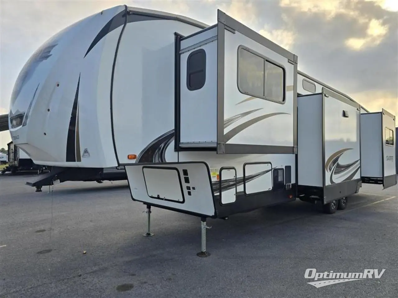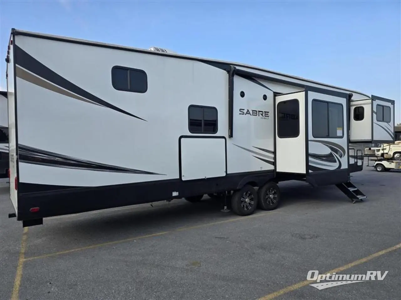 You will experience luxurious camping trips at an affordable price with any one of these Forest River Sabre fifth wheels! These models are durable and ready to travel anytime of the year thanks to features like the high-gloss gel-coat front cap with LED lighting, the PVC roof membrane, and the forced air underbelly with enclosed gate valves. The electric auto-leveling system makes setting up easy and safe, and the adjustable power awning with LED lighting will create an inviting outdoor living space. Each model includes a universal docking station which includes a black tank flush and an outside shower, and the backlit "Secure Step" landing for you to enter and exit the unit safely. Inside, you will love the design of the ambient accent lighting above the crown molding in the living area, the real wood lumbercore cabinetry, and the vintage gaslight decorative lighting!
