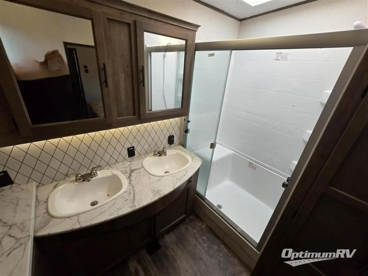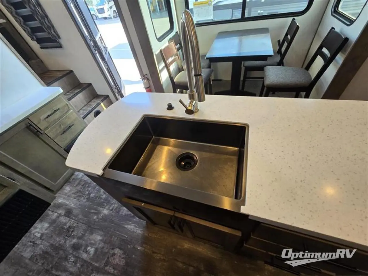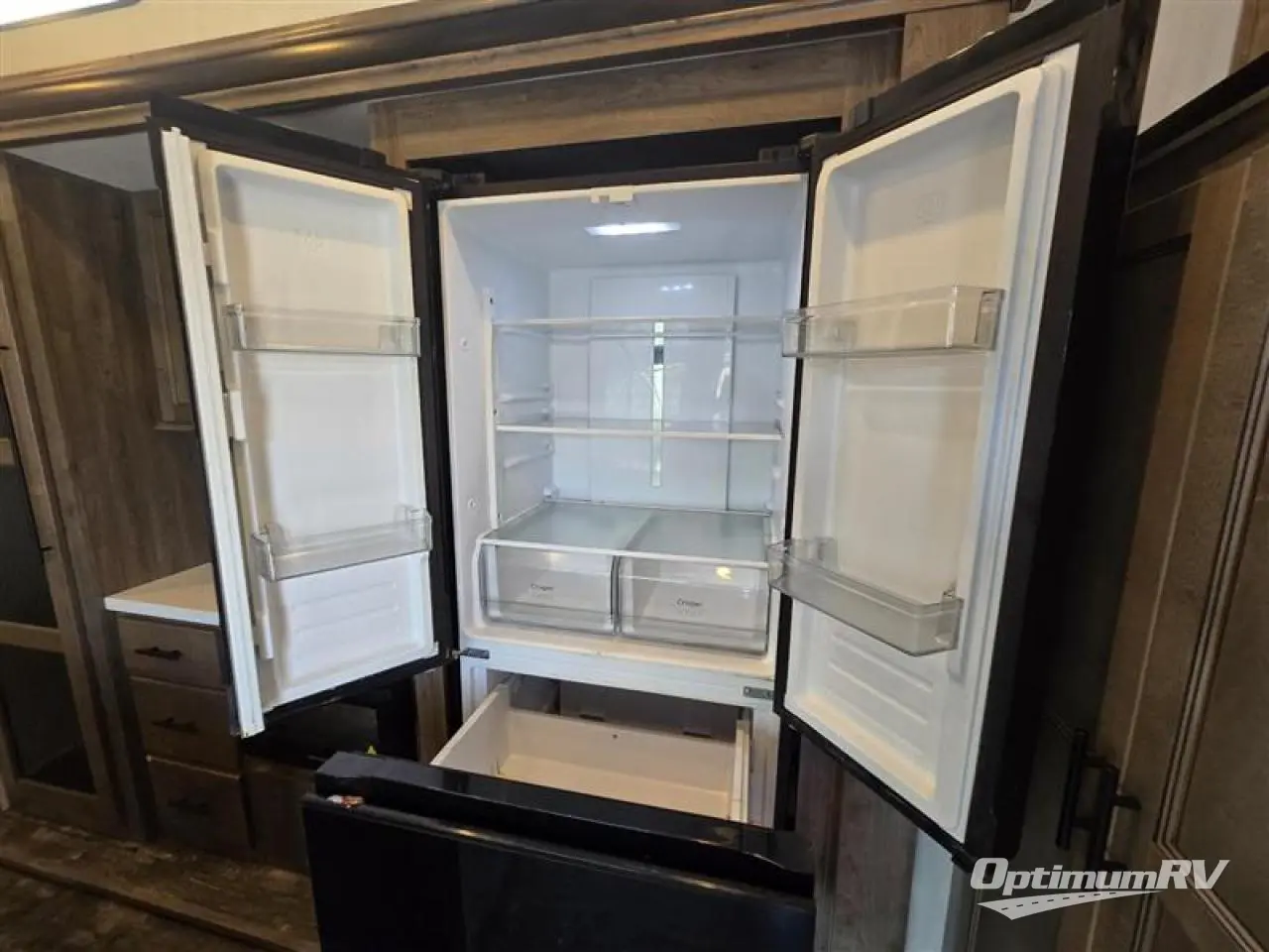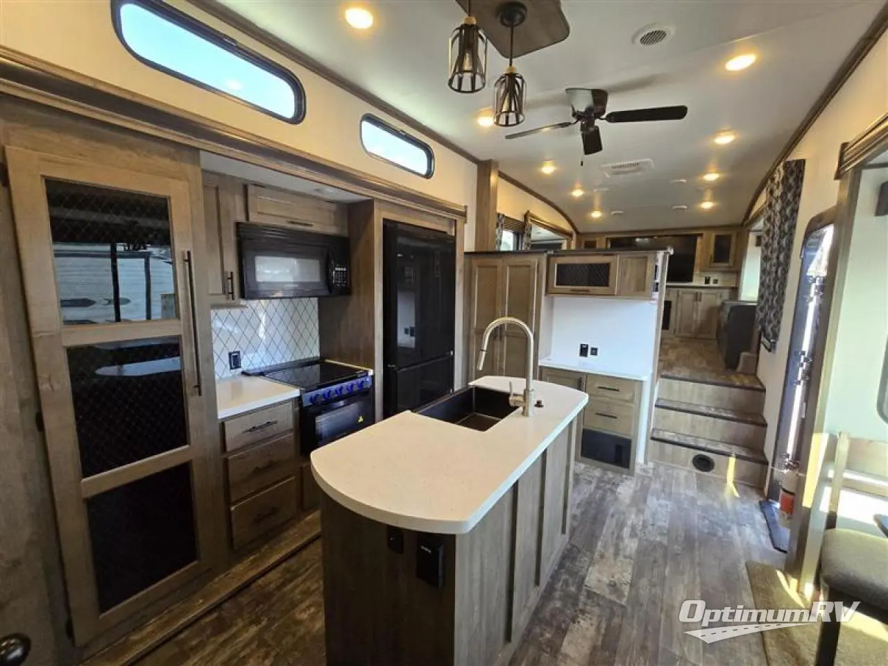 This Sabre fifth wheel with a full and half bath is sure to be a crowd pleaser! The front living area is the perfect place for everyone to visit each other comfortably on the two tri-fold sofas that can be transformed into extra sleeping spaces, or at the theater seating for complete relaxation. You will also find an entertainment center with a fireplace and a residential-size LED TV. This Sabre kitchen is packed out with convenient features, such as a 12V refrigerator with French doors, a kitchen island, and a lighted pantry with motion sensors. The rear master suite has access to its very own full bathroom with a double-sink vanity for two to get ready at once and a wardrobe that is prepped for the optional washer and dryer to be added for convenience!
