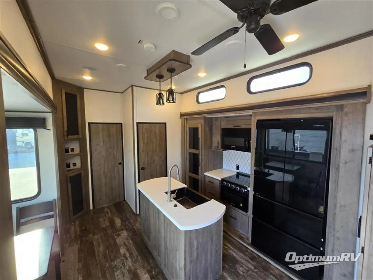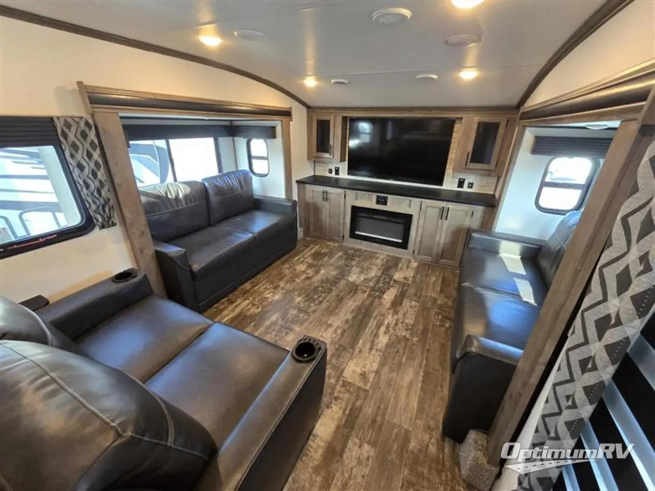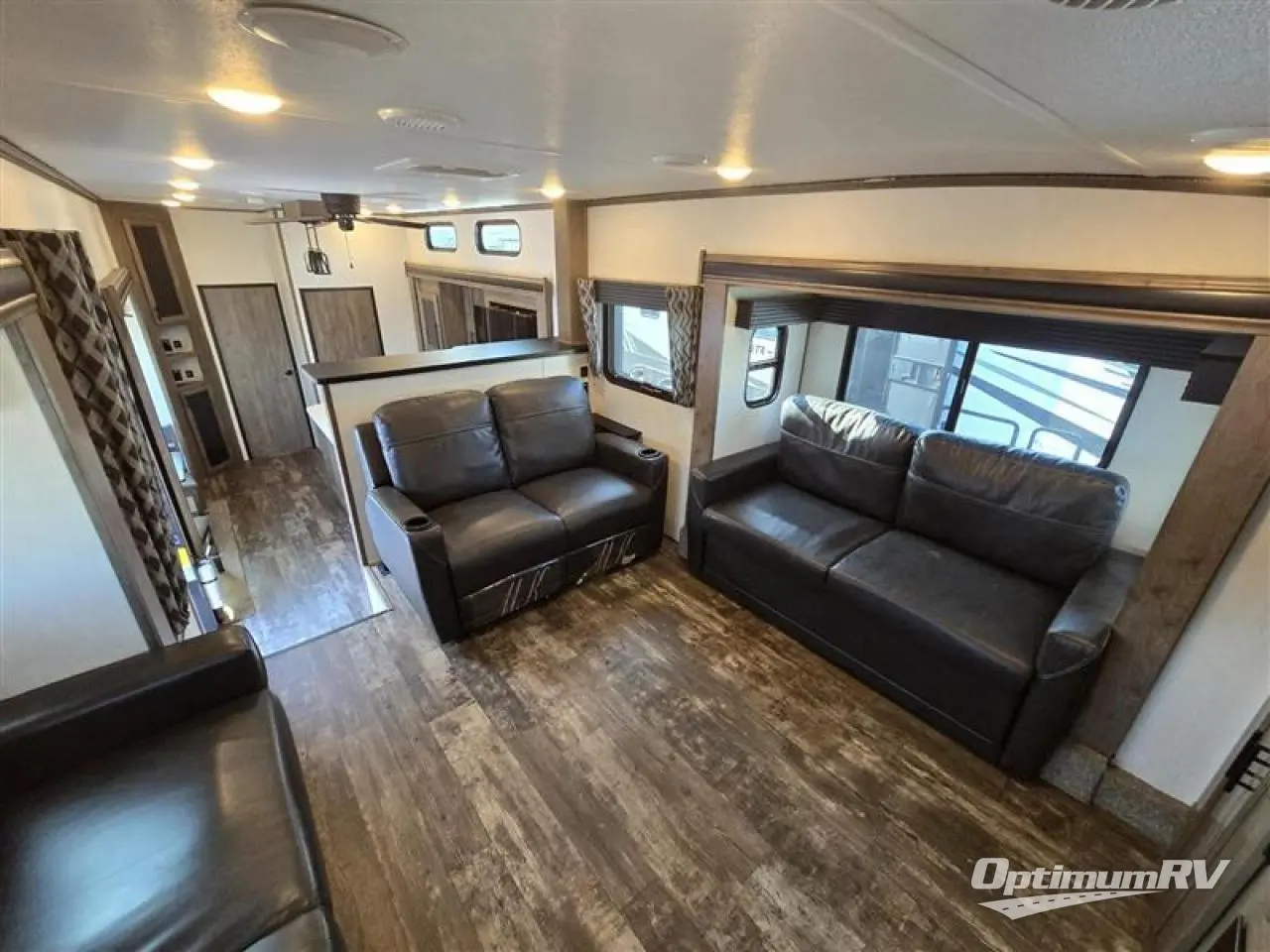 This Sabre fifth wheel with a full and half bath is sure to be a crowd pleaser! The front living area is the perfect place for everyone to visit each other comfortably on the two tri-fold sofas that can be transformed into extra sleeping spaces, or at the theater seating for complete relaxation. You will also find an entertainment center with a fireplace and a residential-size LED TV. This Sabre kitchen is packed out with convenient features, such as a 12V refrigerator with French doors, a kitchen island, and a lighted pantry with motion sensors. The rear master suite has access to its very own full bathroom with a double-sink vanity for two to get ready at once and a wardrobe that is prepped for the optional washer and dryer to be added for convenience!