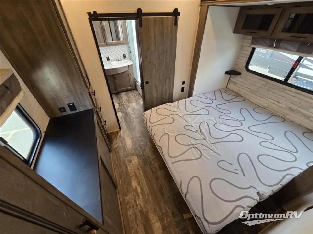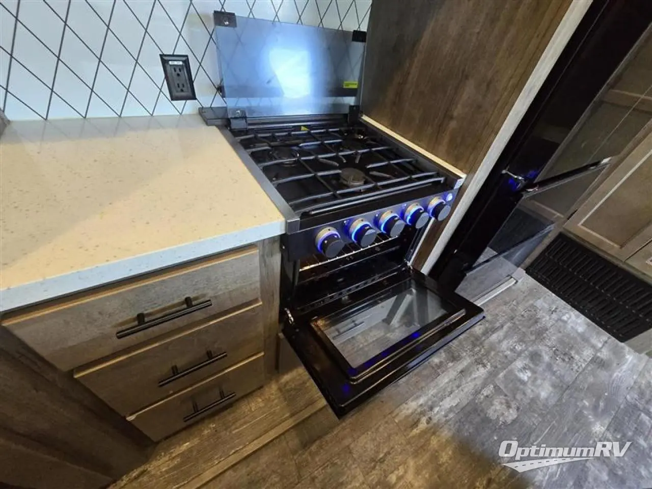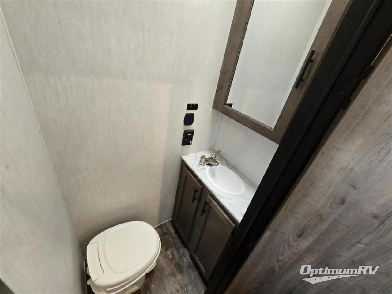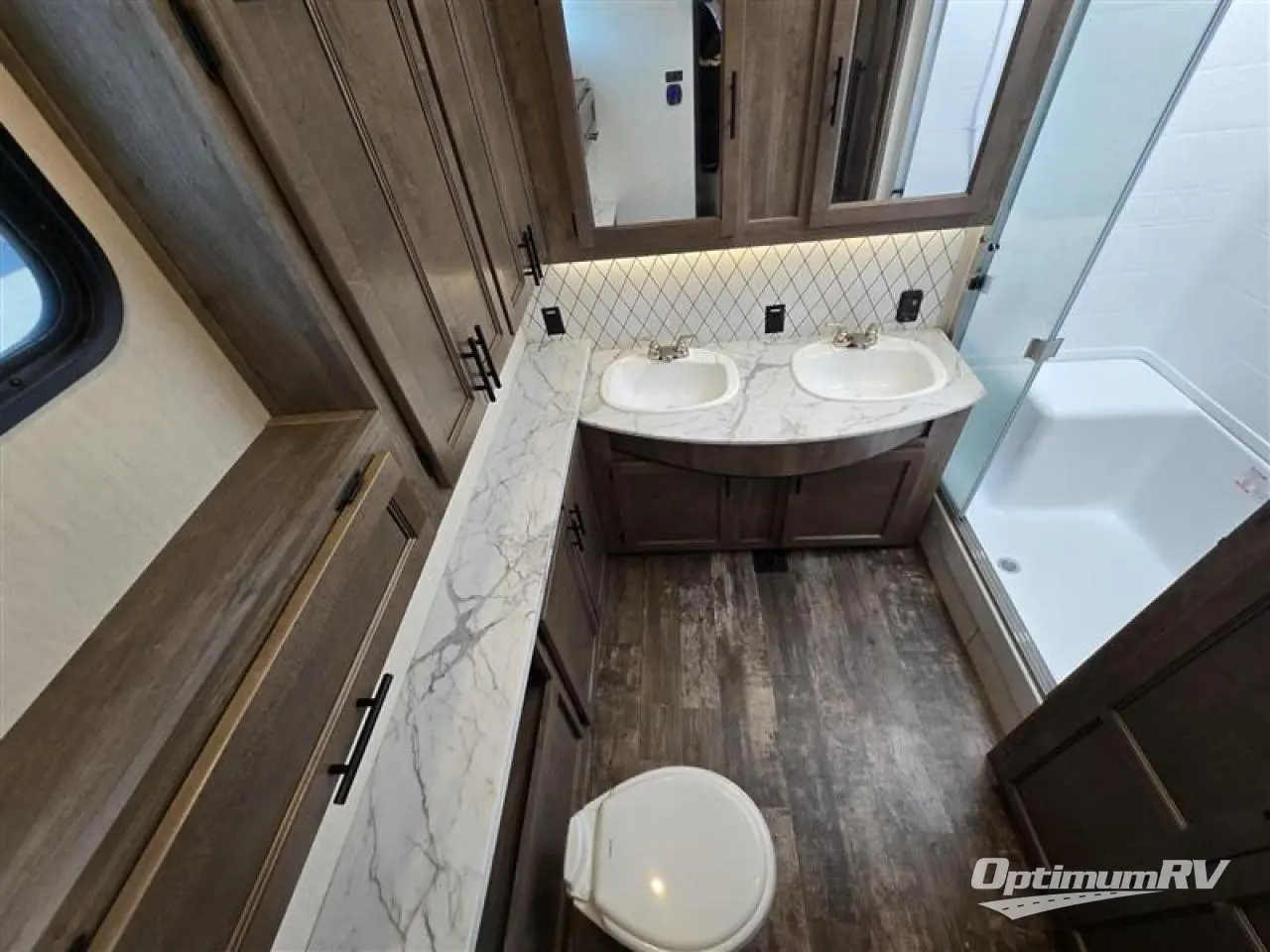 This Sabre fifth wheel with a full and half bath is sure to be a crowd pleaser! The front living area is the perfect place for everyone to visit each other comfortably on the two tri-fold sofas that can be transformed into extra sleeping spaces, or at the theater seating for complete relaxation. You will also find an entertainment center with a fireplace and a residential-size LED TV. This Sabre kitchen is packed out with convenient features, such as a 12V refrigerator with French doors, a kitchen island, and a lighted pantry with motion sensors. The rear master suite has access to its very own full bathroom with a double-sink vanity for two to get ready at once and a wardrobe that is prepped for the optional washer and dryer to be added for convenience!