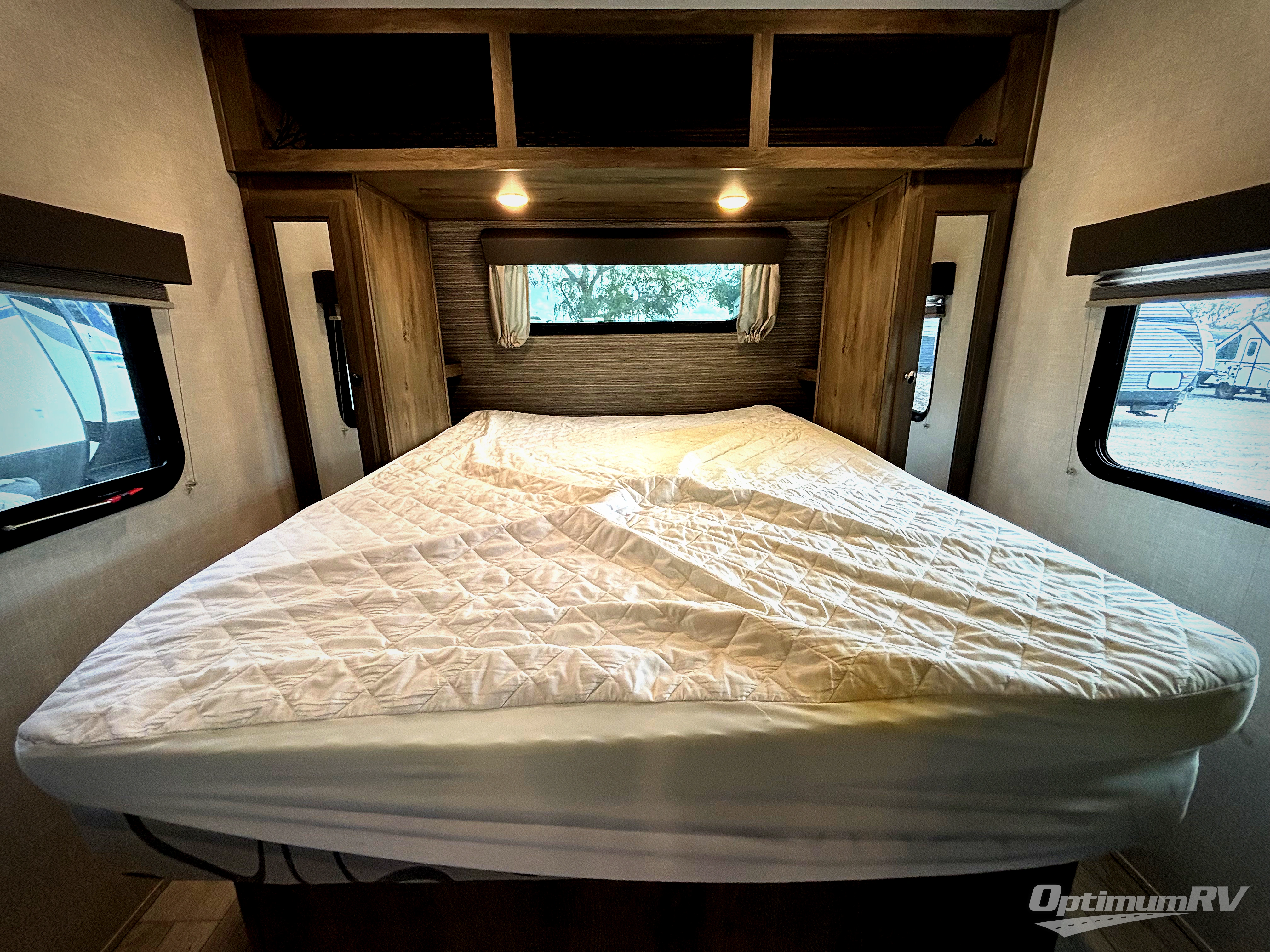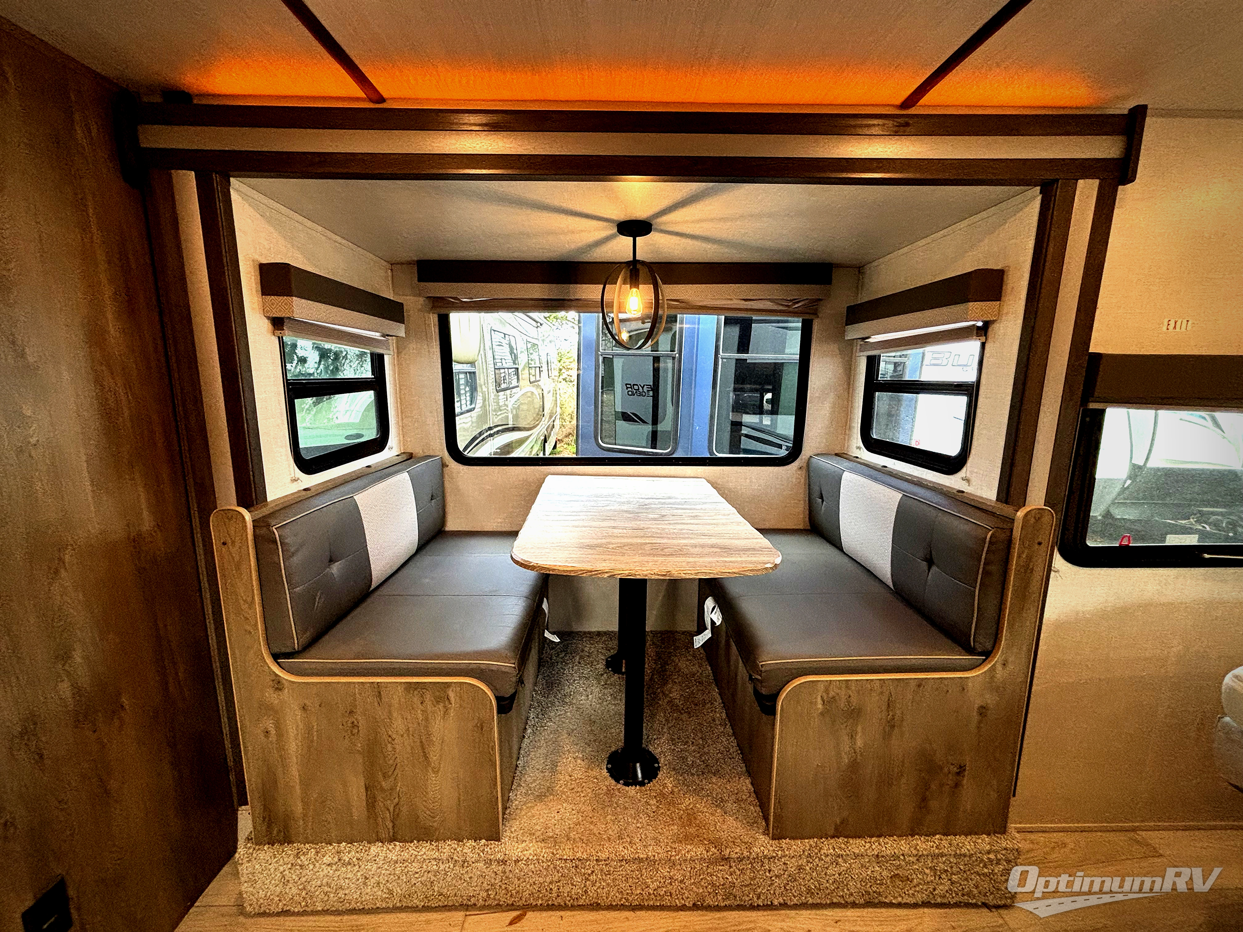 This couple's trailer resembles the layout of model 19MBLE, but with a queen-size bed up front instead of a Murphy bed. If you have an overnight guest or two little ones, they can sleep on the dinette slide, and everyone will appreciate the privacy of the full rear bath. You will have everything needed each day to prepare meals, including a two burner cooktop, a convection microwave, plus an outside kitchen. The pass-through storage will be be perfect for fishing poles, tackle boxes, or lawn chairs, plus there is additional outdoor storage for your hiking gear!
