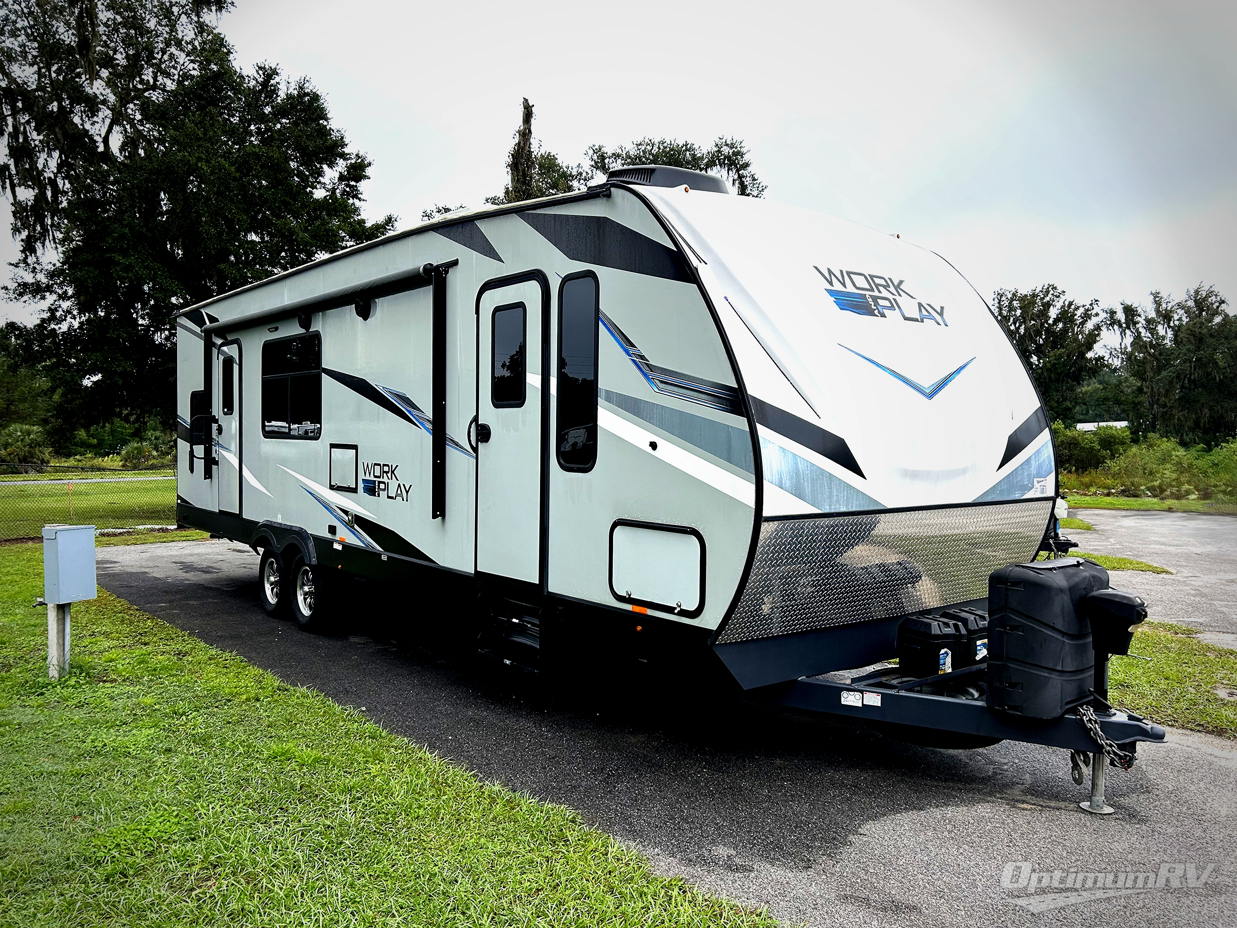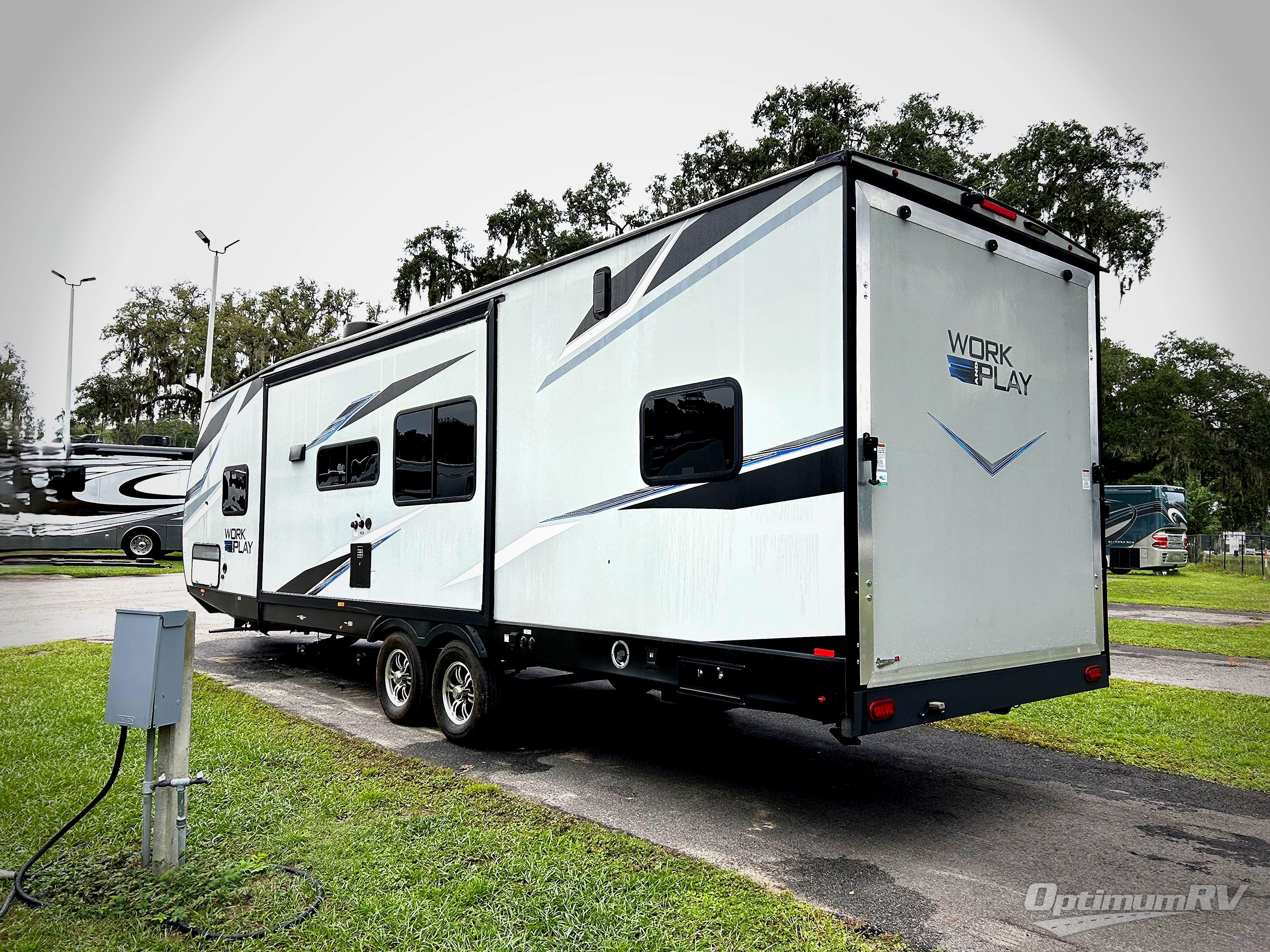 Each Work and Play toy hauler by Forest River is built tough with a mega rail powder coated chassis, a one-piece Tufflex PVC roof membrane, and a fiberglass front cap with rock guard. Towing is made hassle-free with the heavy duty Dexter axles with Nev-R-Adjust brakes and nitrogen filled tires. You will find many convenient features, such as a Winegard Air 360 and TV antenna, an outside spray port, and magnetic compartment door catches to store your riding gear. These toy haulers also include shaker style cabinets and doors, a residential bedspread, multiple USB ports for all your electronics, and many more amenities!