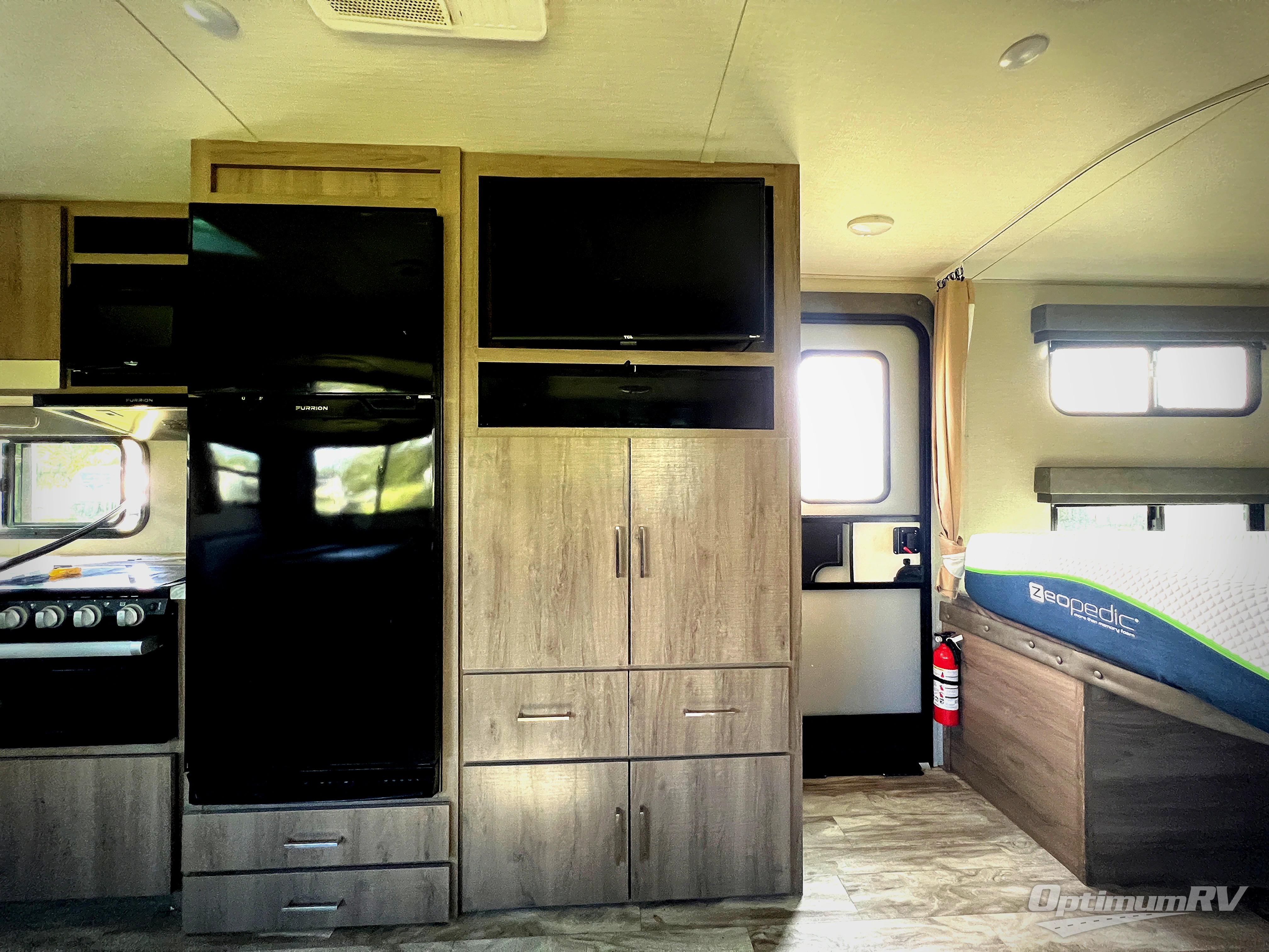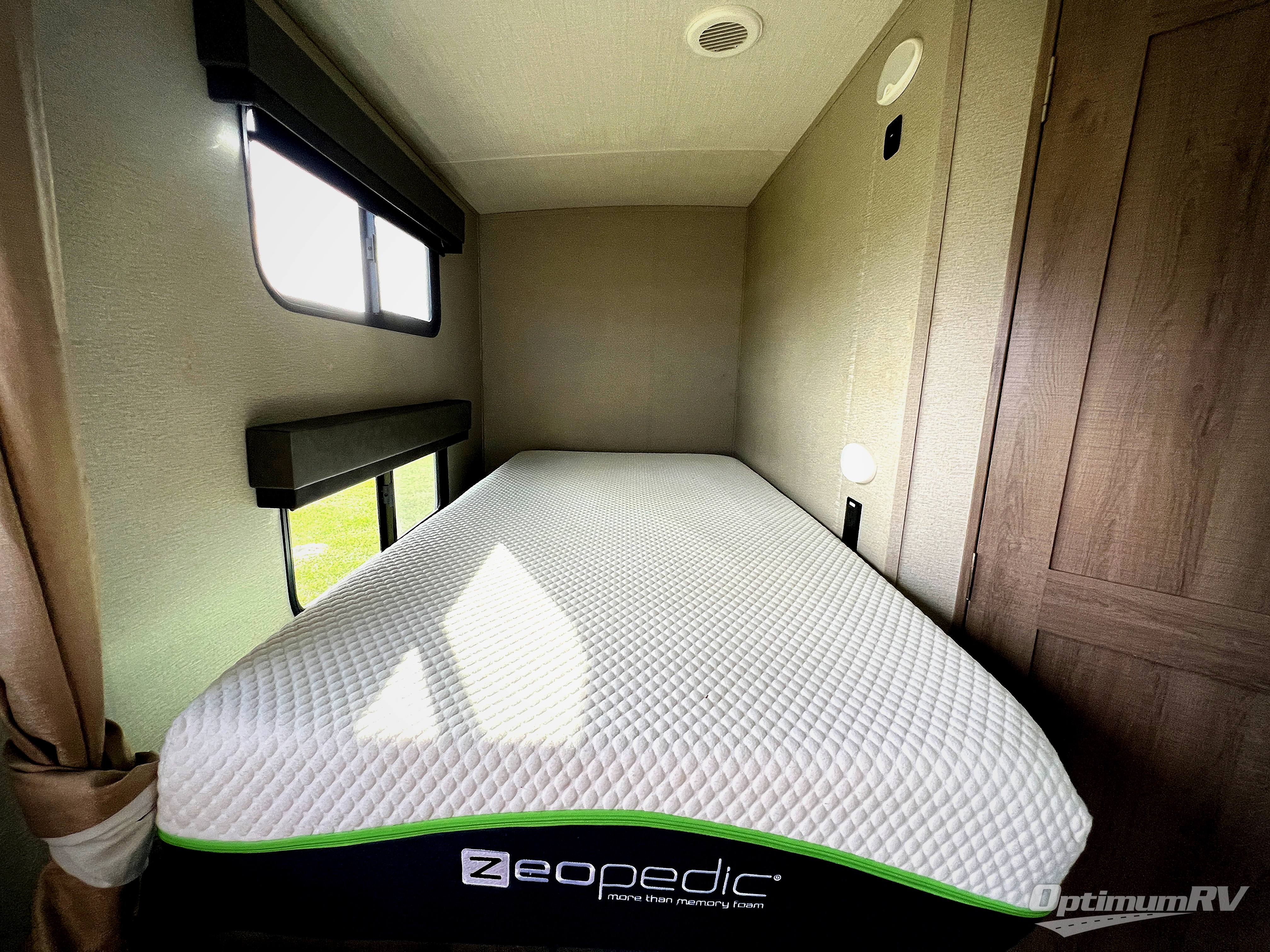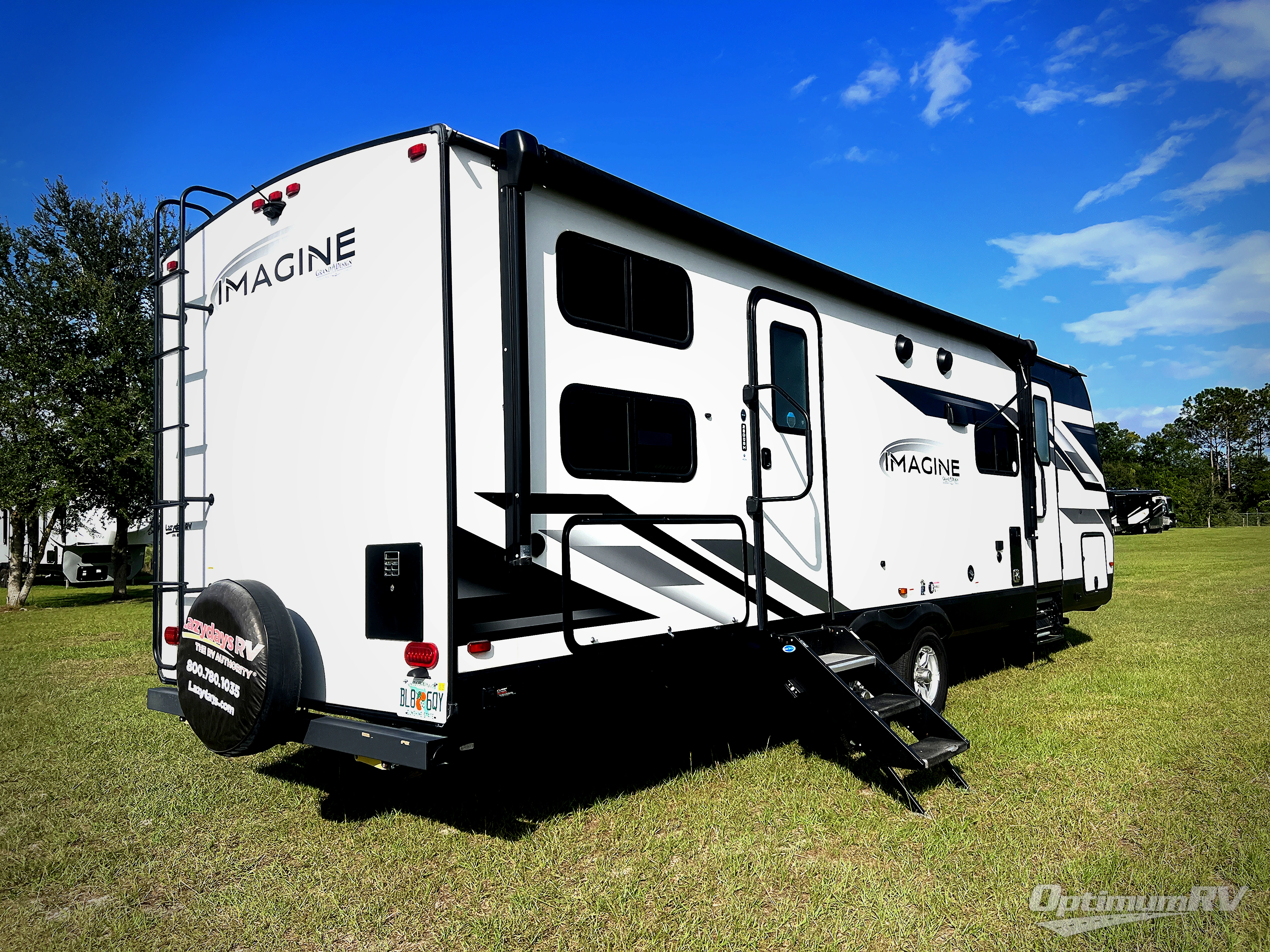 Where will you go with this Imagine travel trailer? The possibilities are endless! You can take your family on an exciting excursion because this trailer has enough sleeping space for everyone with the 60" x 80" bed in the private bedroom, the U-shaped dinette and tri-fold sofa in the main living area, and the 47" x 76" bunk beds with privacy curtains. You can come and go as you please with two entry doors, and the outdoor kitchen will be fun to use when the weather is nice. Your family's pet can eat out of the pet dish below the refrigerator, and the large slide will keep this trailer feeling spacious.