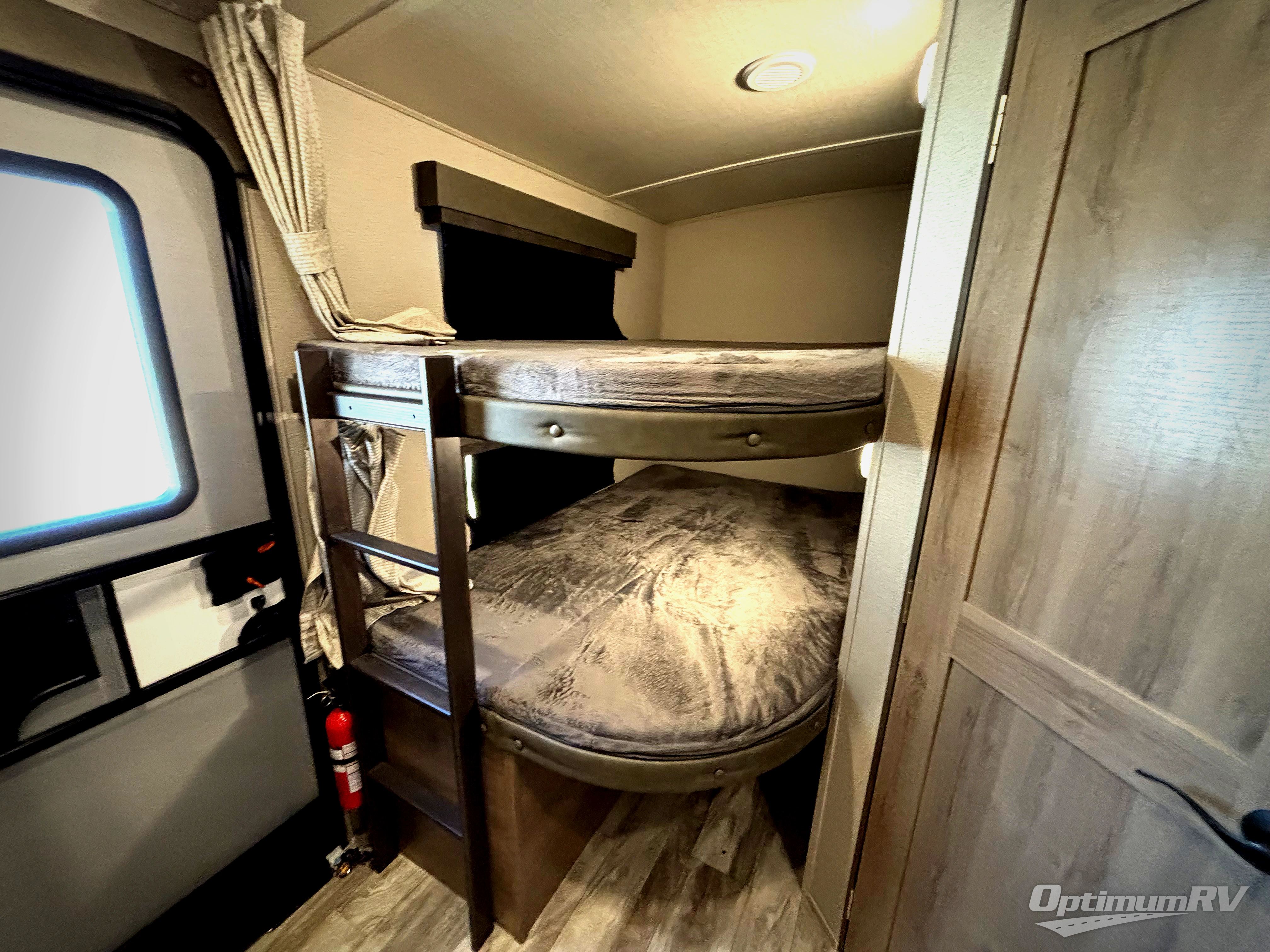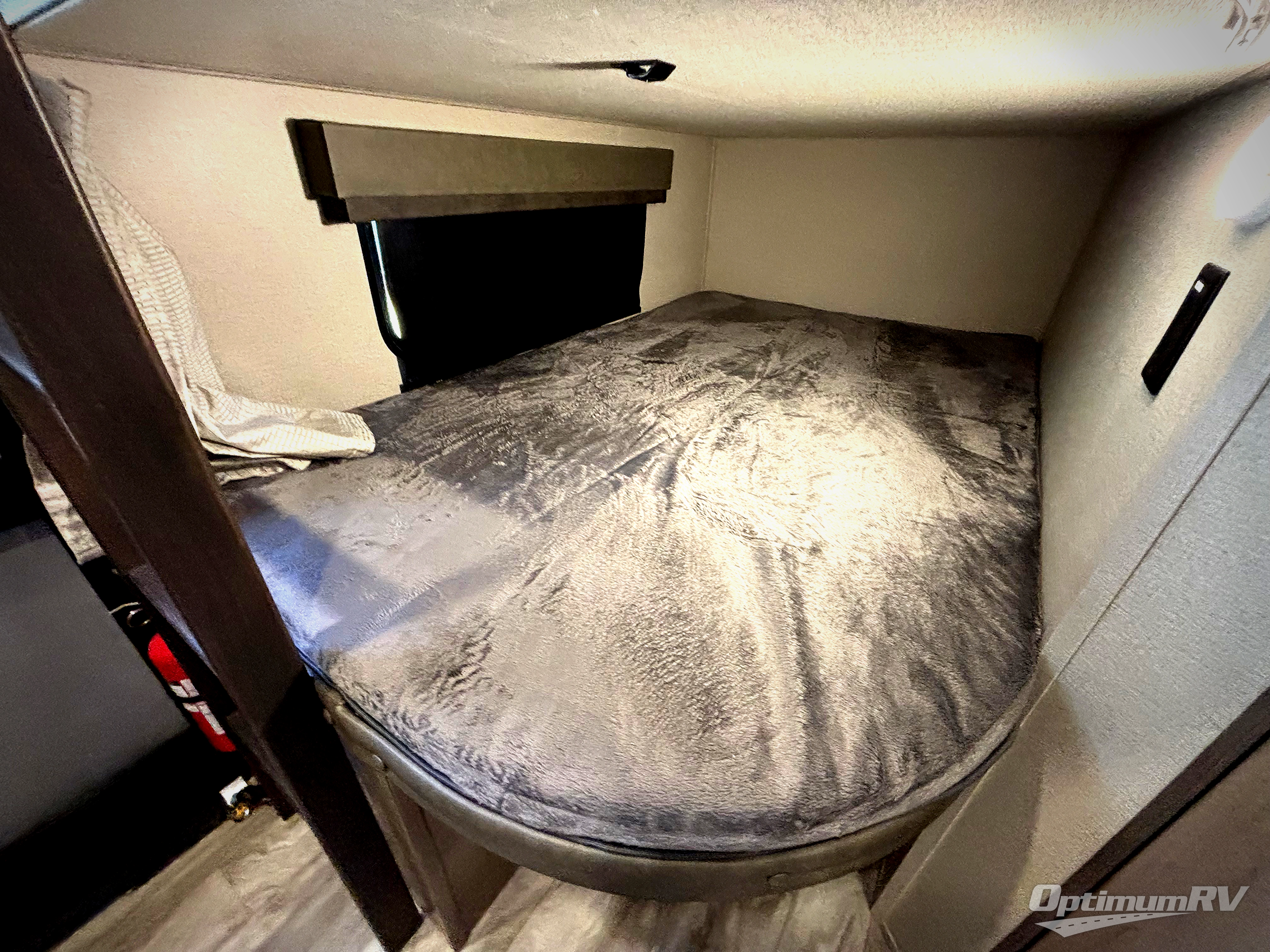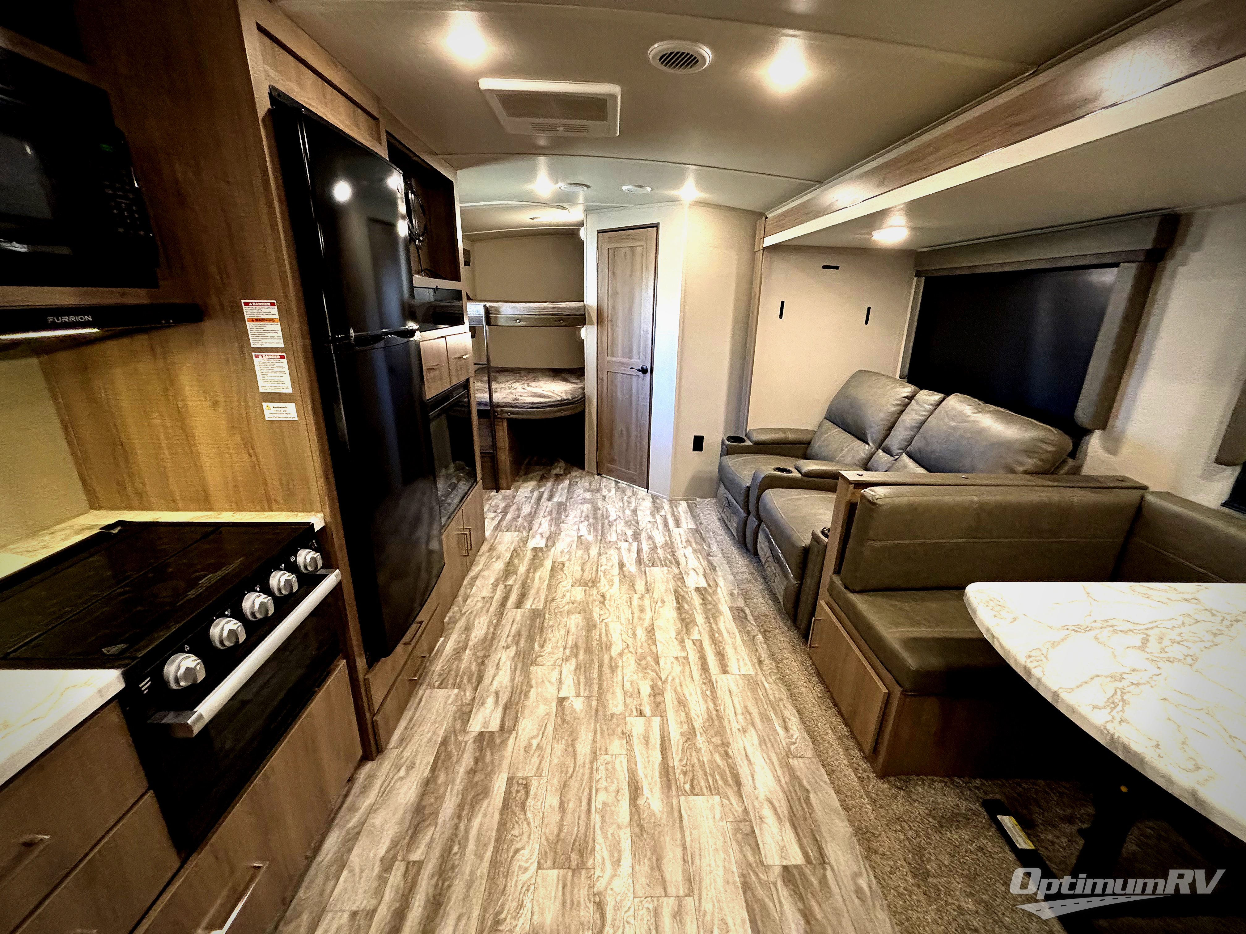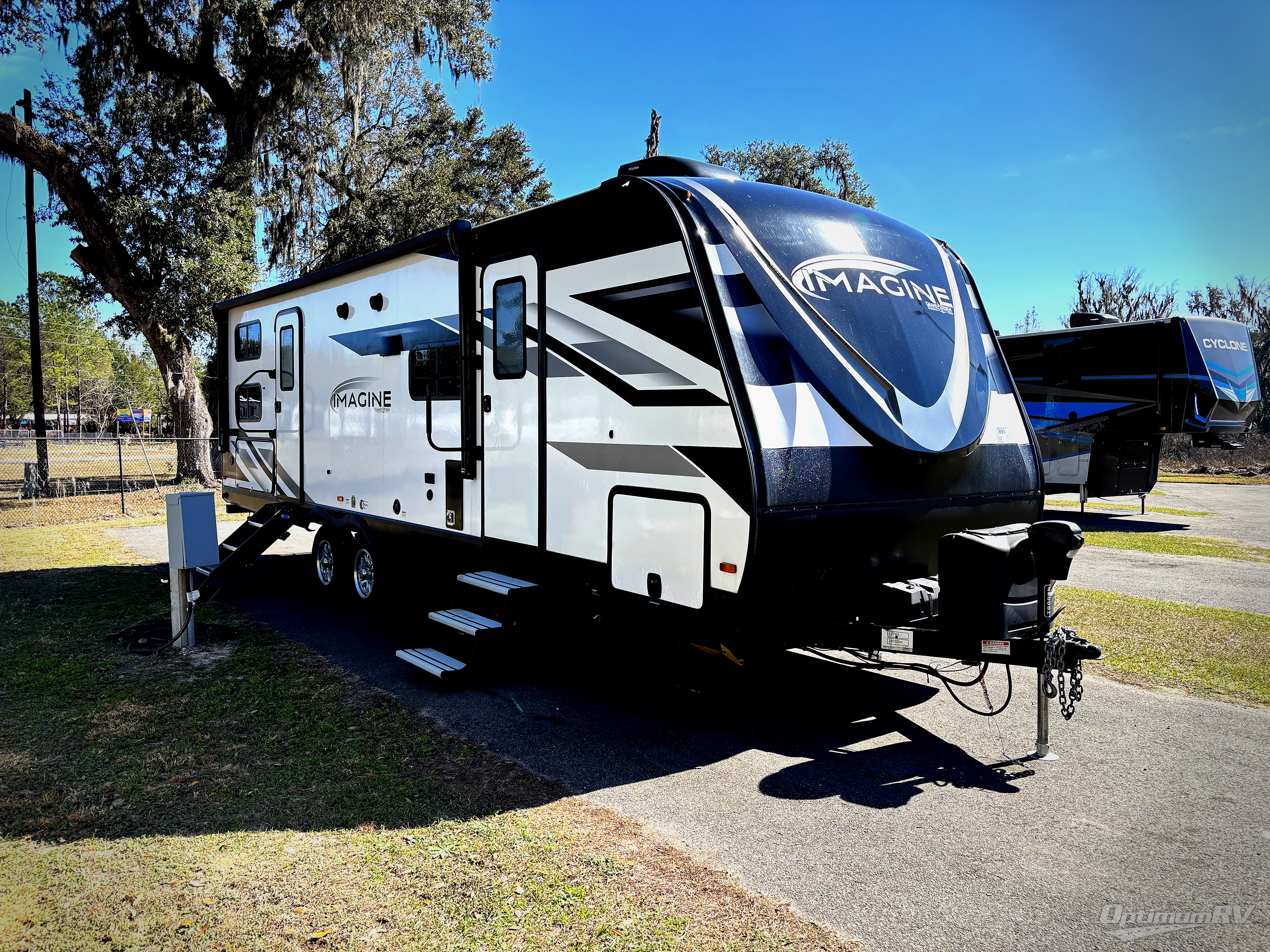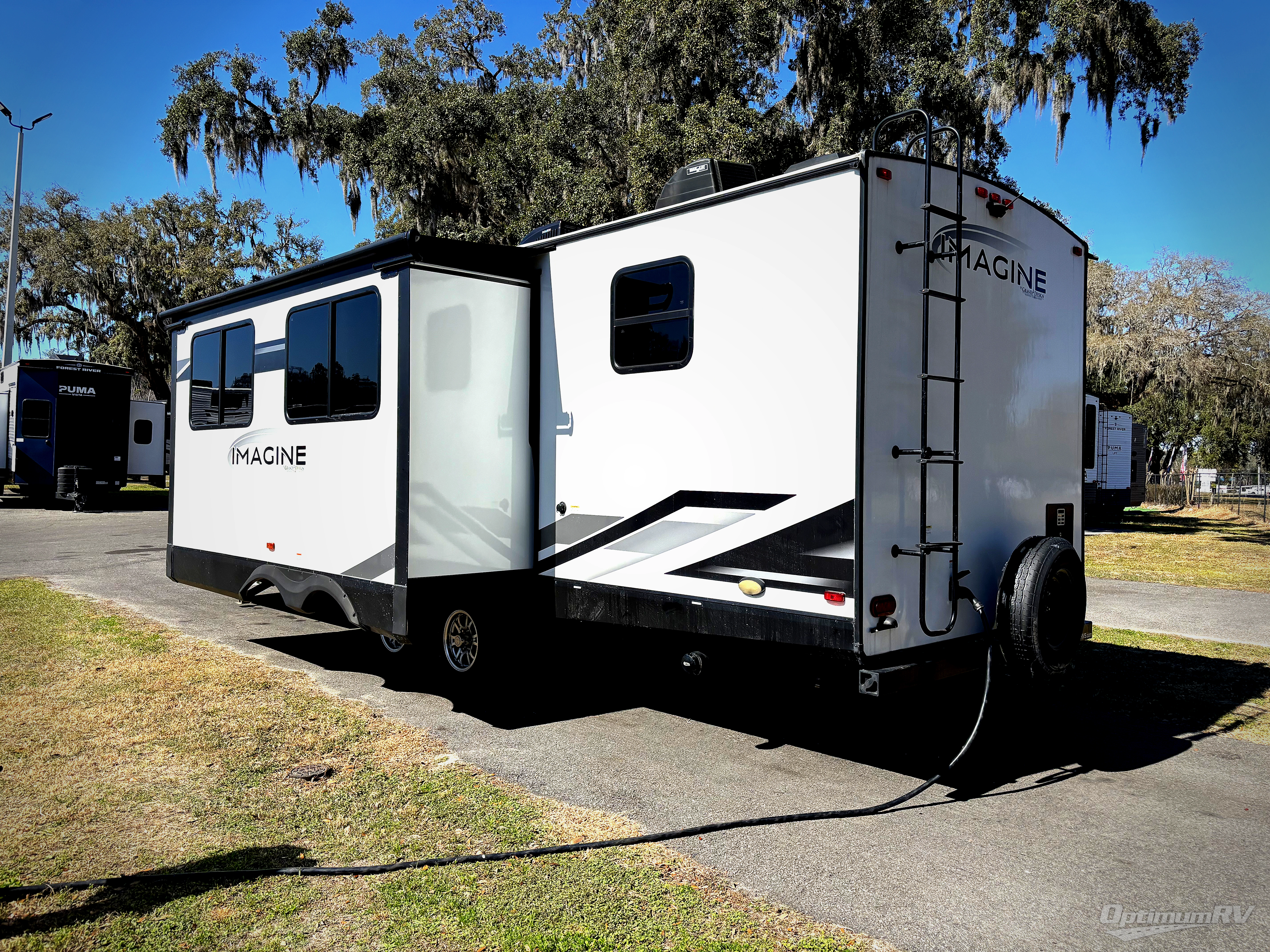 Where will you go with this Imagine travel trailer? The possibilities are endless! You can take your family on an exciting excursion because this trailer has enough sleeping space for everyone with the 60" x 80" bed in the private bedroom, the U-shaped dinette and tri-fold sofa in the main living area, and the 47" x 76" bunk beds with privacy curtains. You can come and go as you please with two entry doors, and the outdoor kitchen will be fun to use when the weather is nice. Your family's pet can eat out of the pet dish below the refrigerator, and the large slide will keep this trailer feeling spacious.