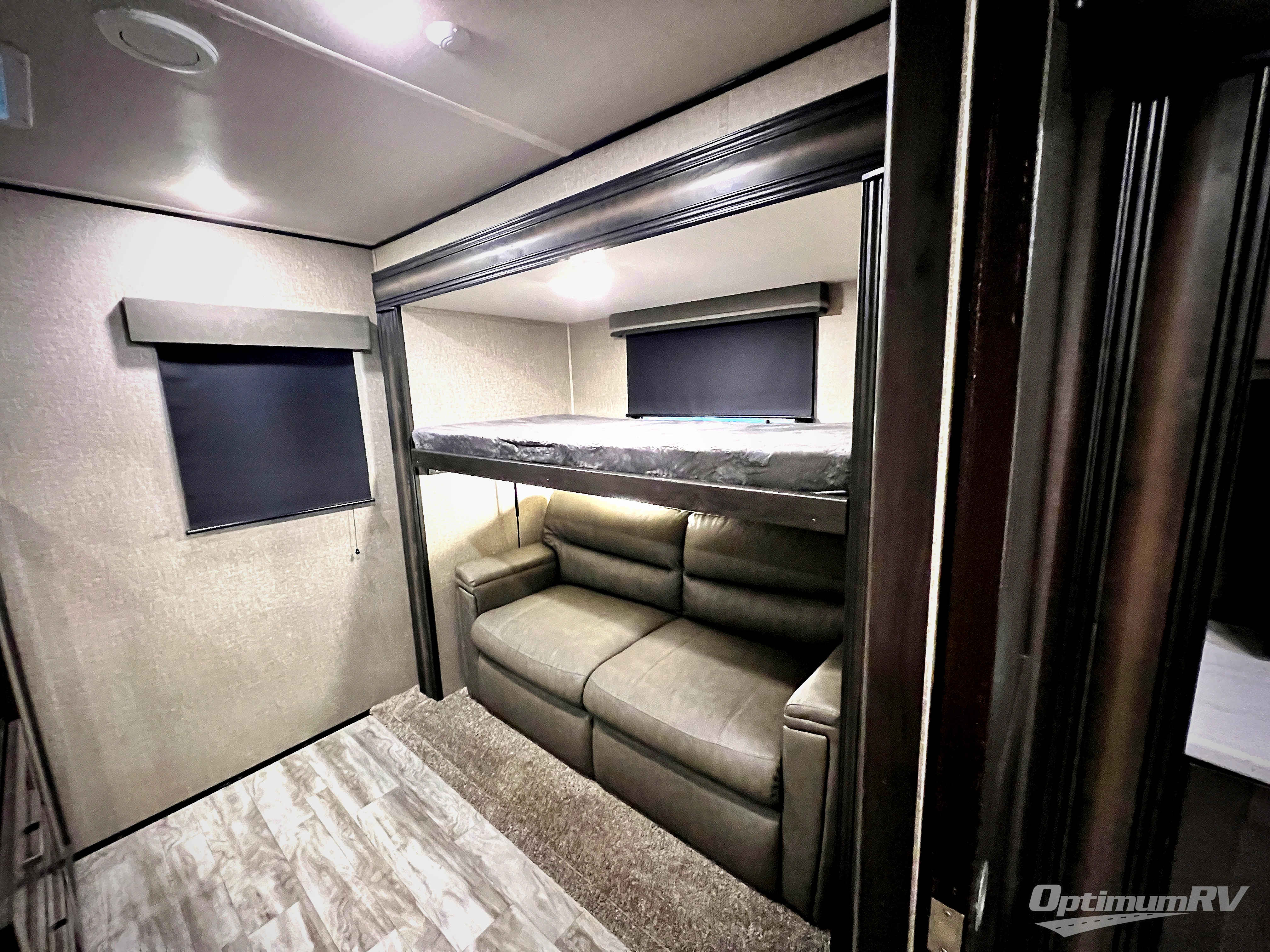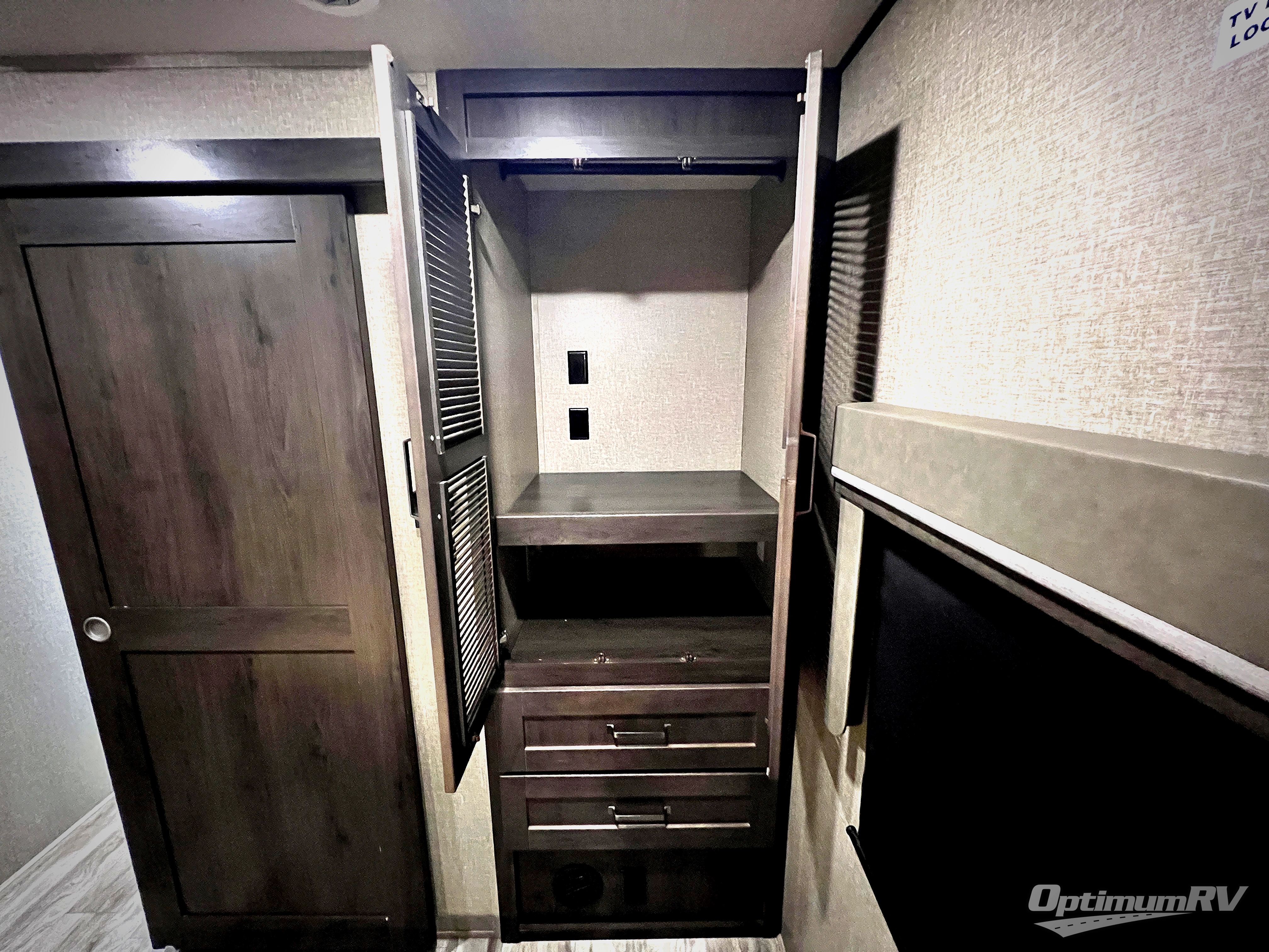 Finding the perfect trailer for a larger group is simple, take a look at this one for your next RV! The rear bunkhouse might be the first reason you fall in love because of the slide out with a flip bunk above a tri-fold sofa, the second bunk bed on the opposite side and storage below, and the large rear window for great views. The outside kitchen might be another reason allowing you to enjoy the outdoors while providing meals for everyone, and/or the inside gourmet kitchen with a 16 cu. ft. refrigerator, an island, and two hutches. Everyone can gather together and relax on the theatre seating with cupholders and the booth dinette or choose a free standing dinette option, and to visit or watch the 40" LED HDTV with fireplace below. The full bathroom includes a space savings sliding door and linen storage, and the bedroom gives you a front walk-around queen bed with storage for your clothes on each side, plus there is an additional wardrobe with drawers and the option to add a washer/dryer to the prepped space.