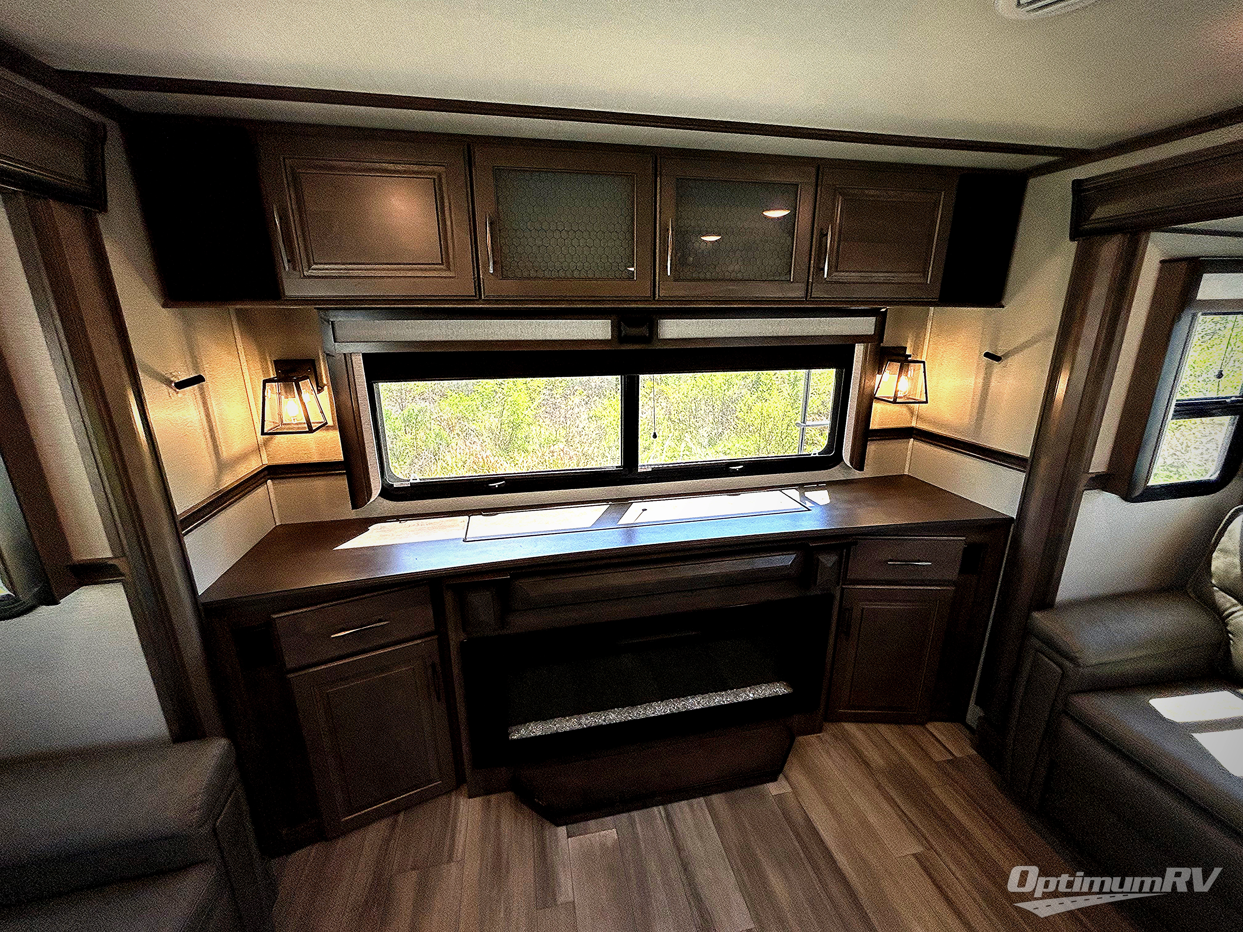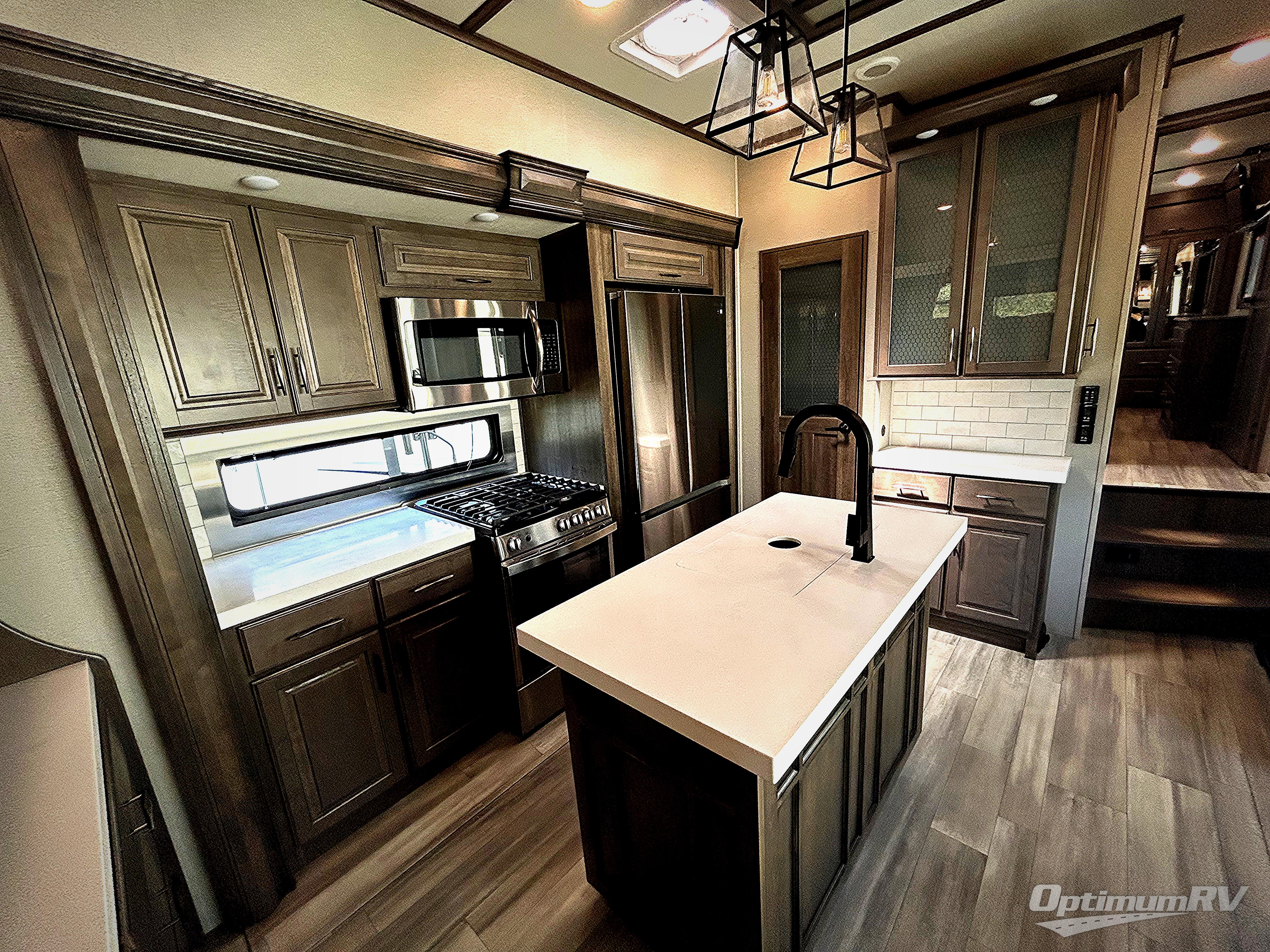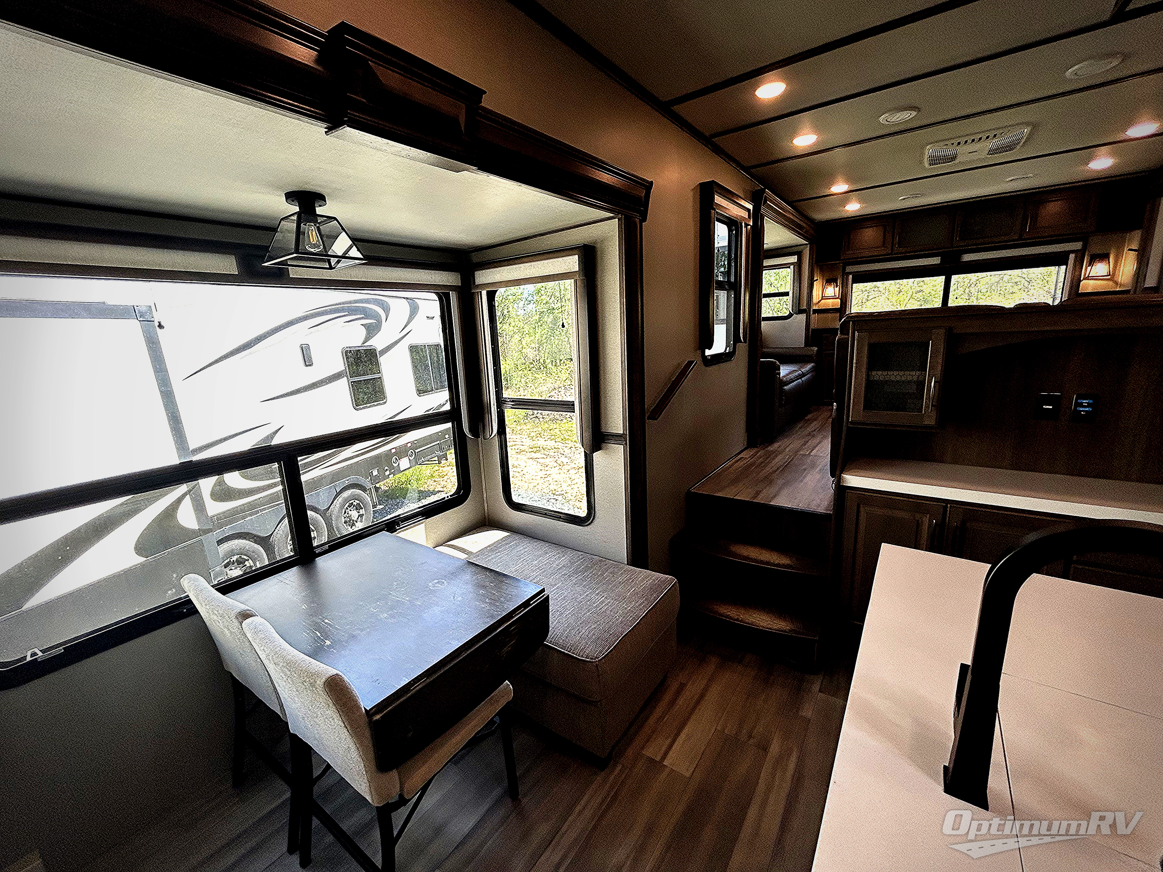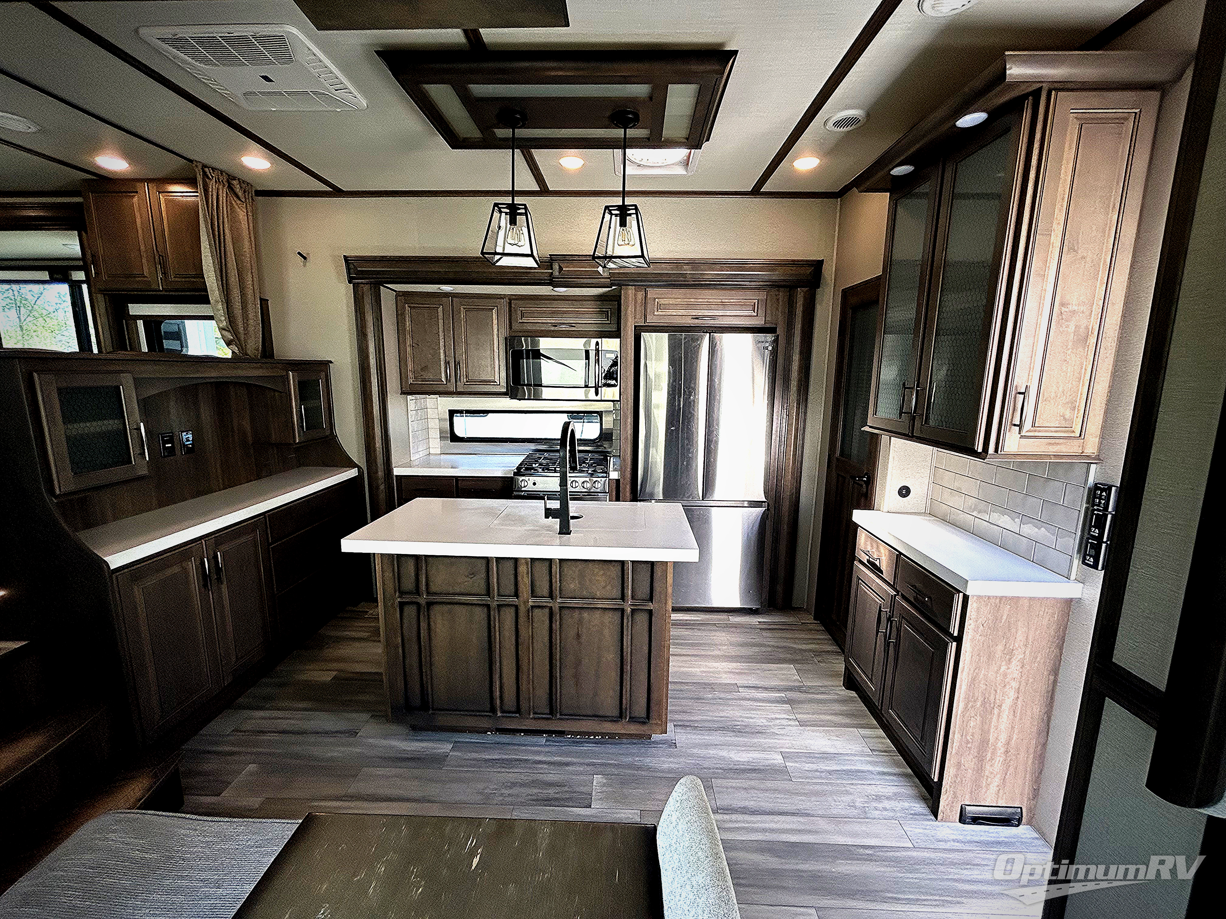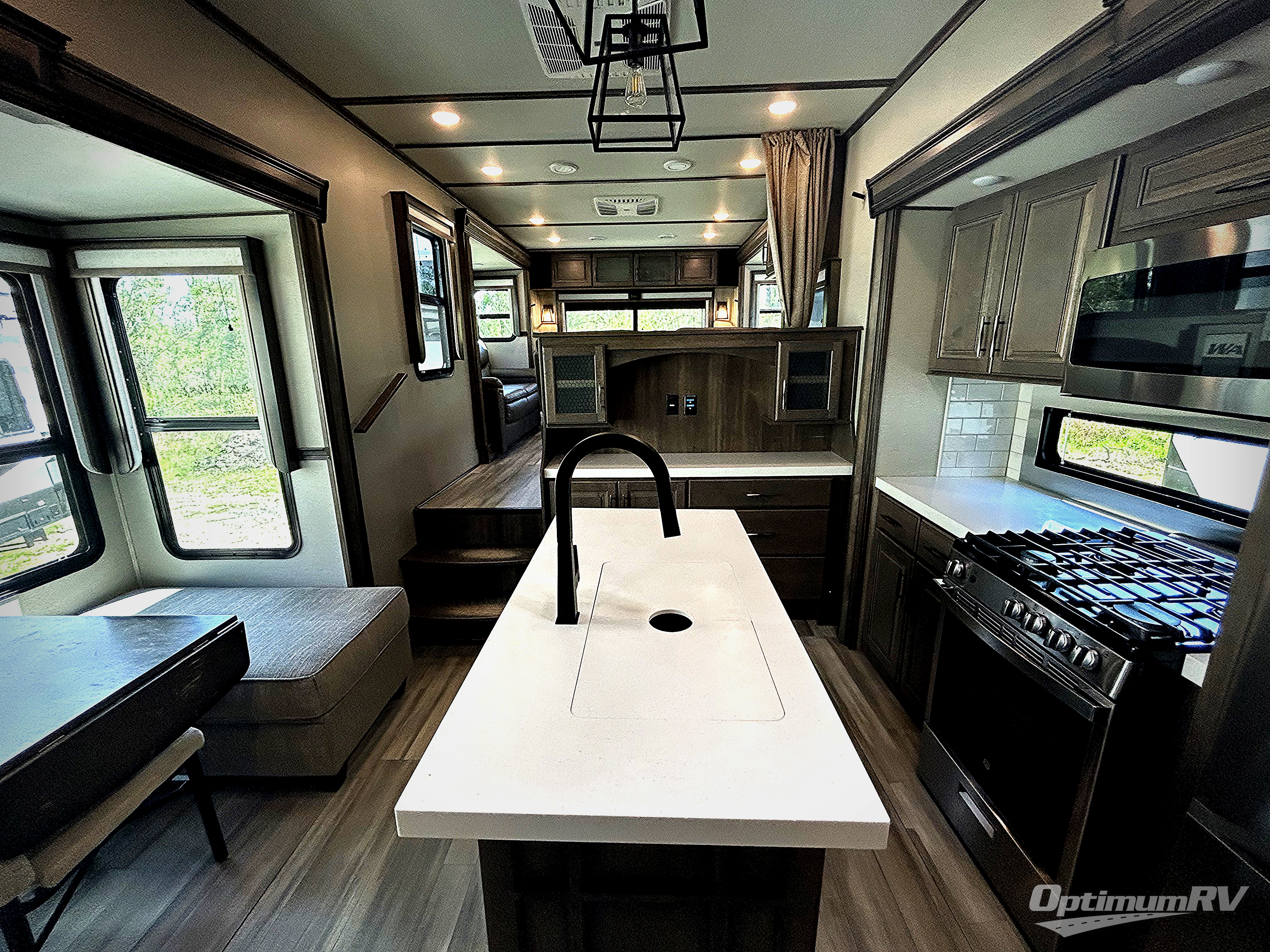 Your extended stays at any location will be enjoyable in this fifth wheel with the separate rooms, the five slide outs and the storage found inside as well as outside! The exterior rear storage with sliding tray is super handy to carry the larger camping items and totes plus there are several other compartments for items such as charcoal, outdoor games, hiking boots, fishing gear and more. The separate rear entertainment and living area provides an LED TV with fireplace below, several windows for great views, furniture to relax on as well as sleep on, plus USB charging outlets for your cellphones and such. The middle kitchen offers a buffet, a hutch, an oversized pantry, stainless steel appliances, and a free-standing dinette slide out with more views out of the windows. The full bathroom is up a few steps and before you reach the front bedroom. You will love the seated shower and linen storage. The bedroom provides a queen bed slide, a pull-out ottoman, a flip-up dresser with LED TV, and a mirrored wardrobe. There are a few more options to add if you wish such as a washer/dryer, an outside pull-out kitchen, and/or a Solitude solar system.