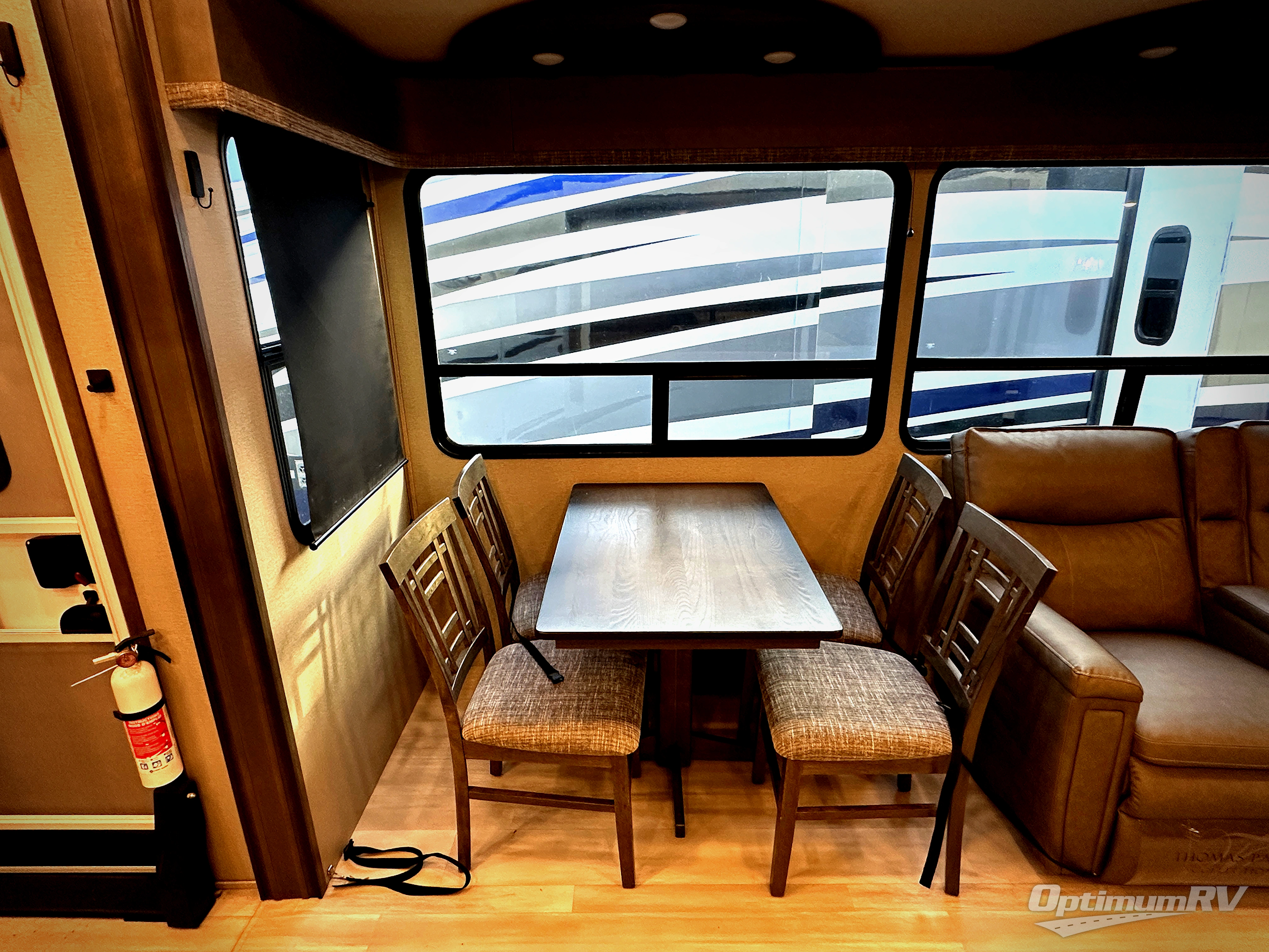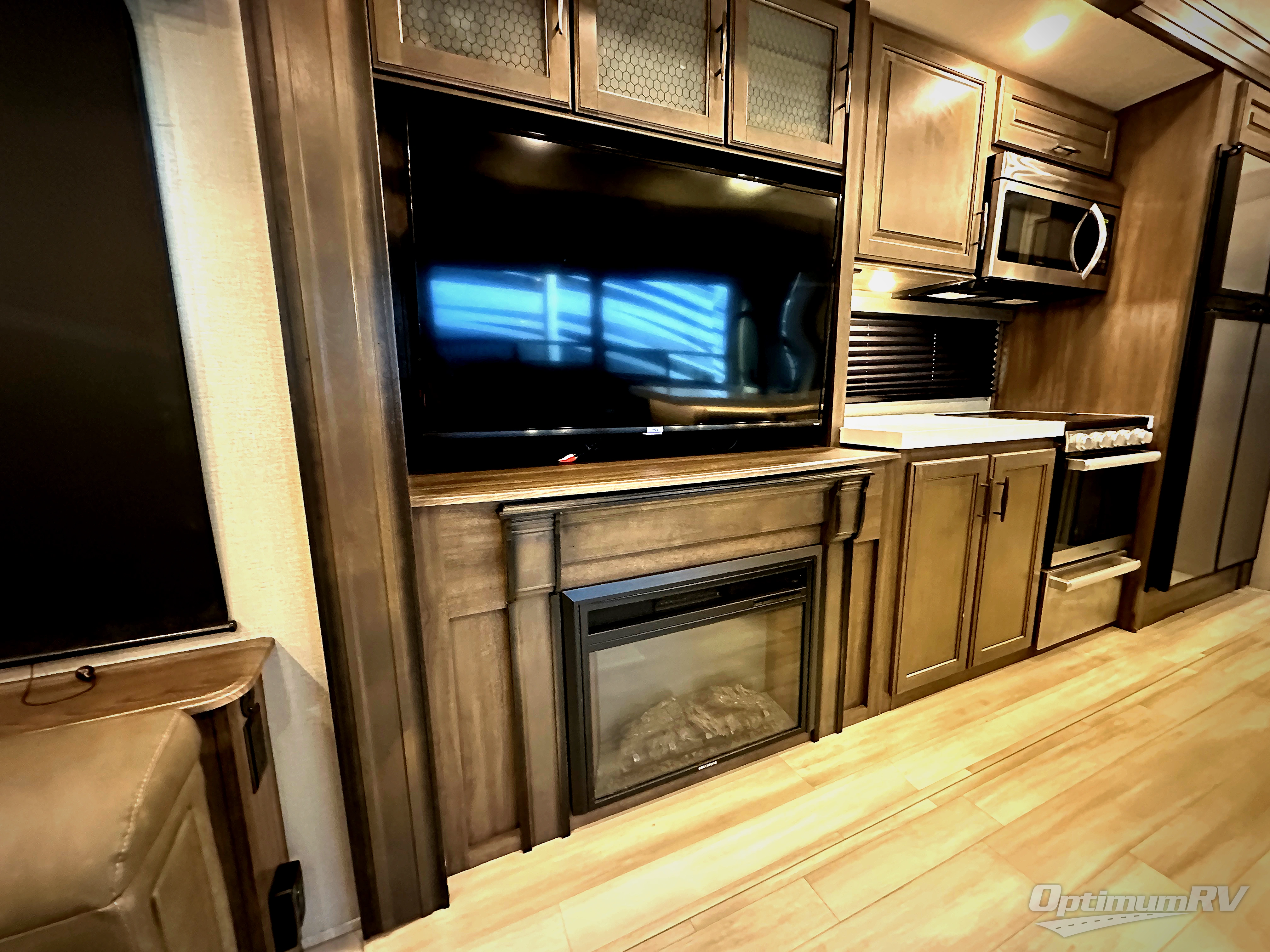 You'll feel right at home in this spacious fifth wheel with triple slides, a front master bedroom, and a kitchen island with extra counter space. The theatre seating is right across from the LED TV and fireplace, and there is a rear tri-fold sofa if you have any guests stay over. This model includes a hutch in the kitchen with cabinets above to store you nice dishes, plus there is a large pantry with washer and dryer prep if you plan to go full-time. Head to the dual entry bath that includes a linen closet and a spacious shower with a skylight, and check out the front master bedroom with its queen bed, slide out wardrobe, and 32" LED TV!