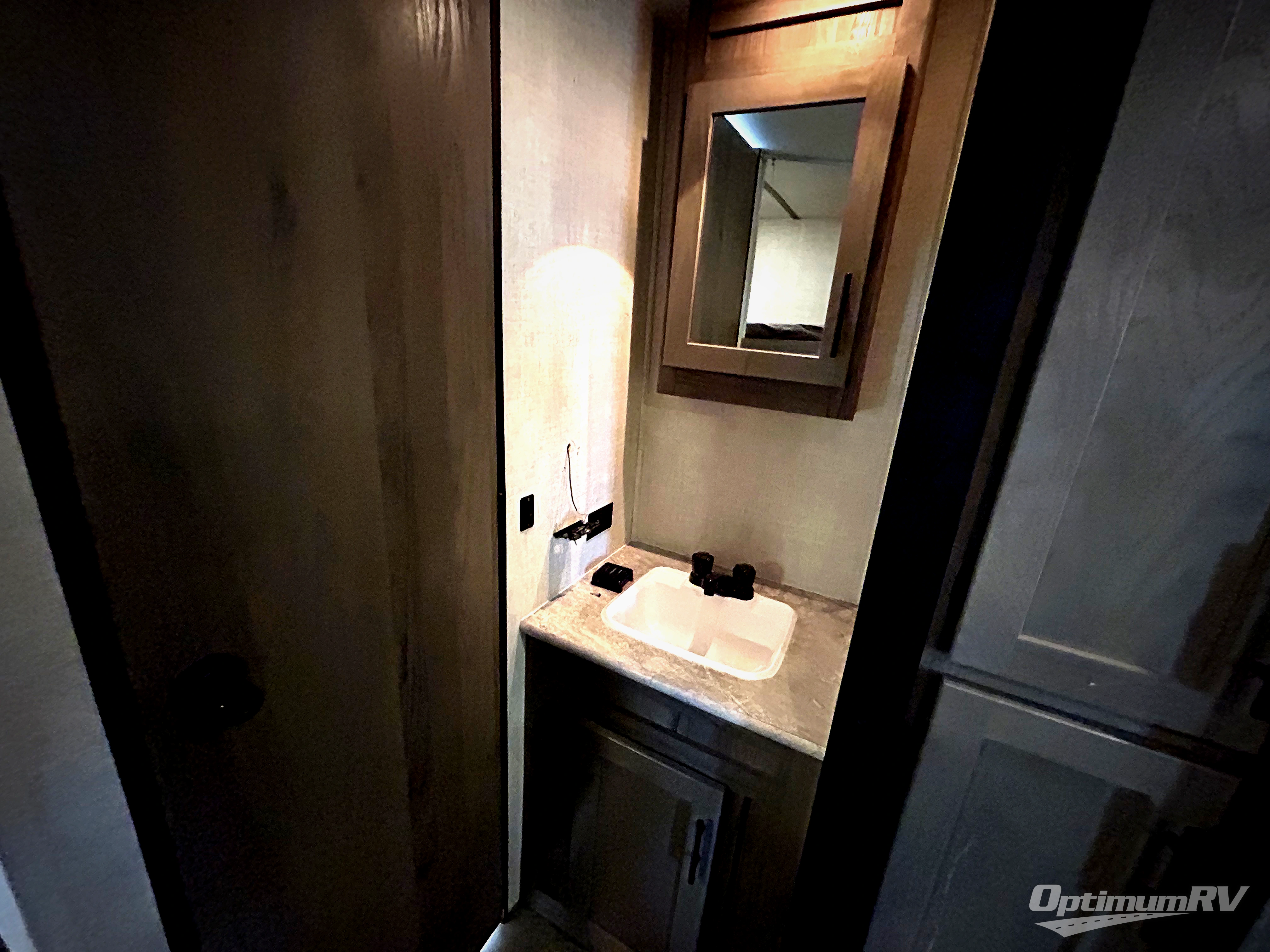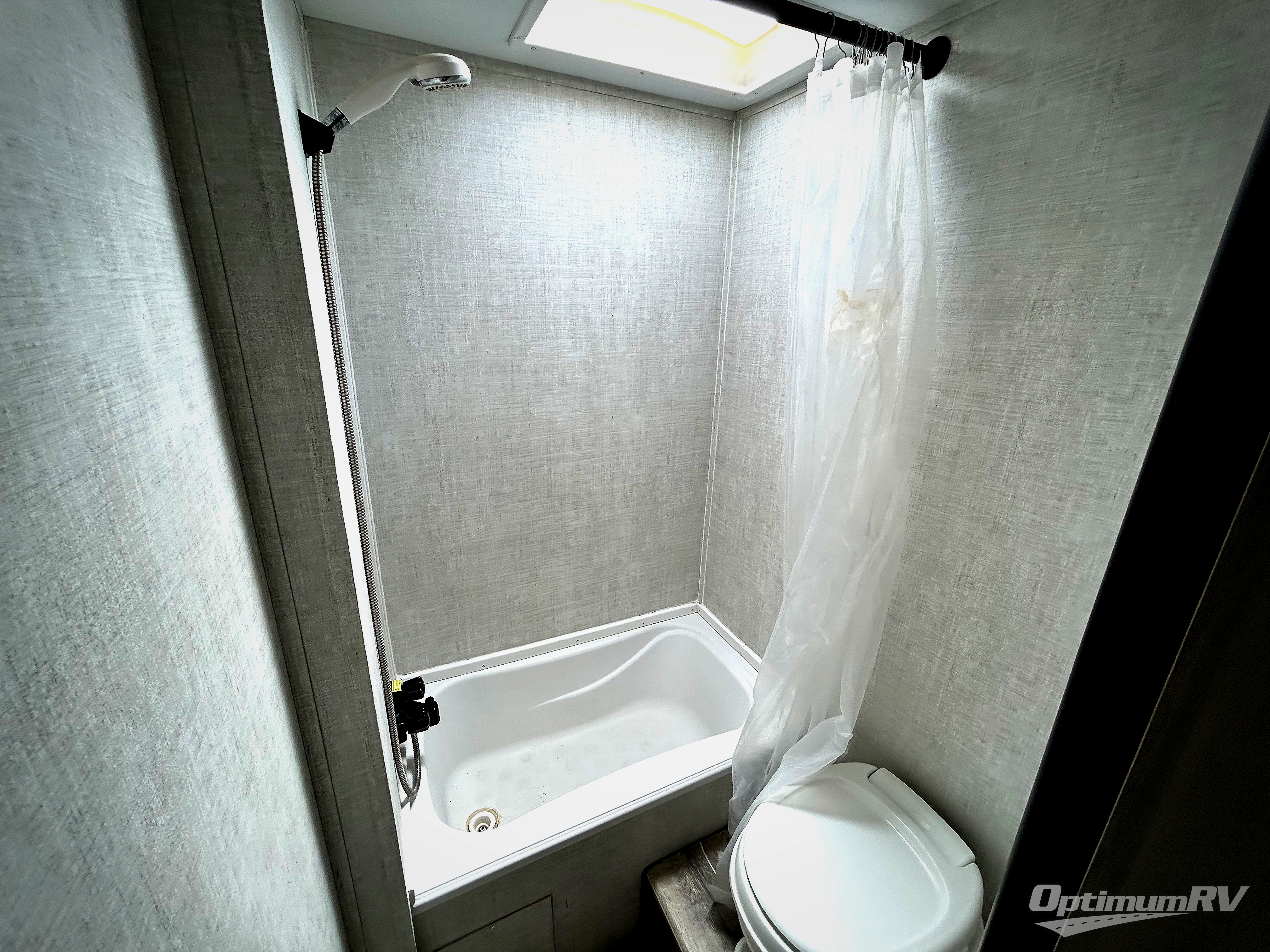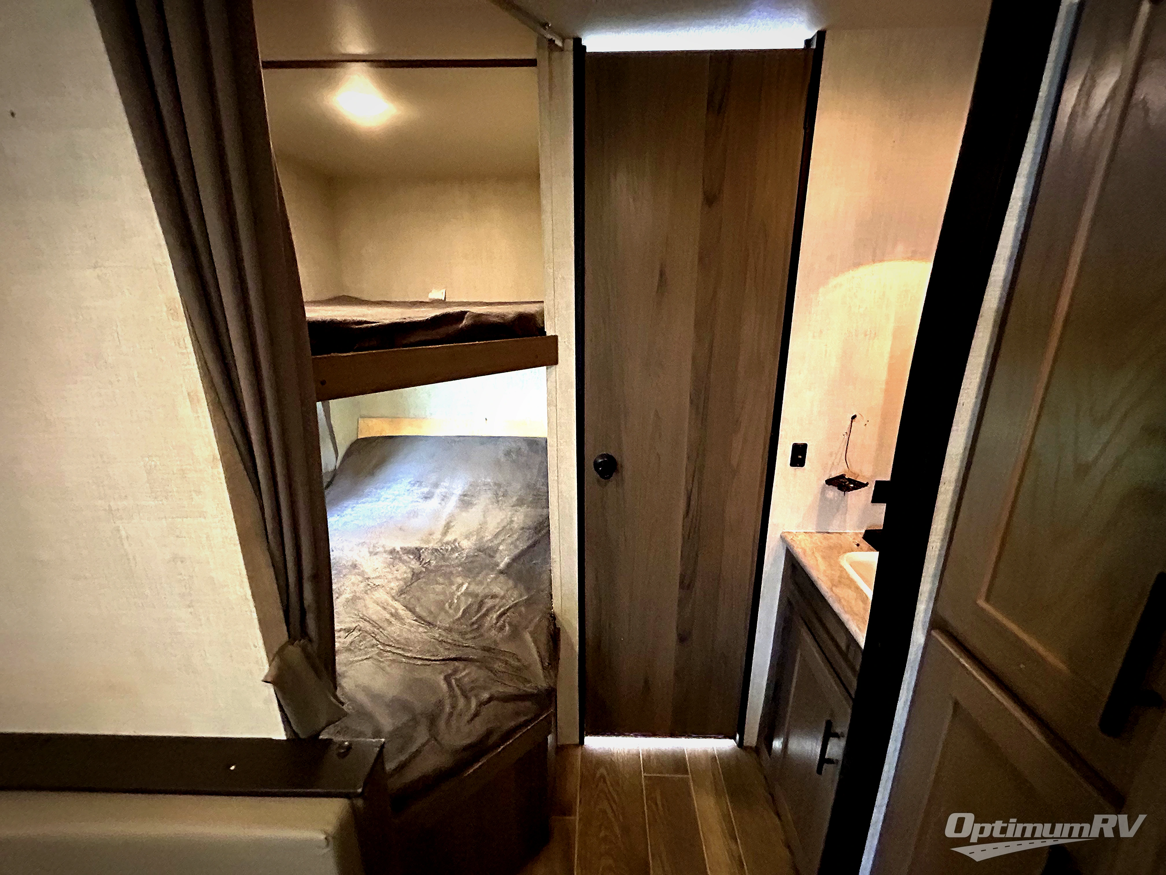 This semi-private front bedroom travel trailer allows you to change in privacy when you close the curtain and sleep on a queen-size bed or choose the optional Murphy bed/sofa for versatility. You will find your own wardrobe and a handy shelf at the head of the bed for your belongings. Your friends or kids will loving sleeping on the double-size bunks in the rear next to the private toilet and tub/shower room. The bathroom sink is just outside the door which is handy when two people need to get ready at once. And the cook will have full amenities, plus a pantry, and overhead storage for all the dishes, pots, and spices.