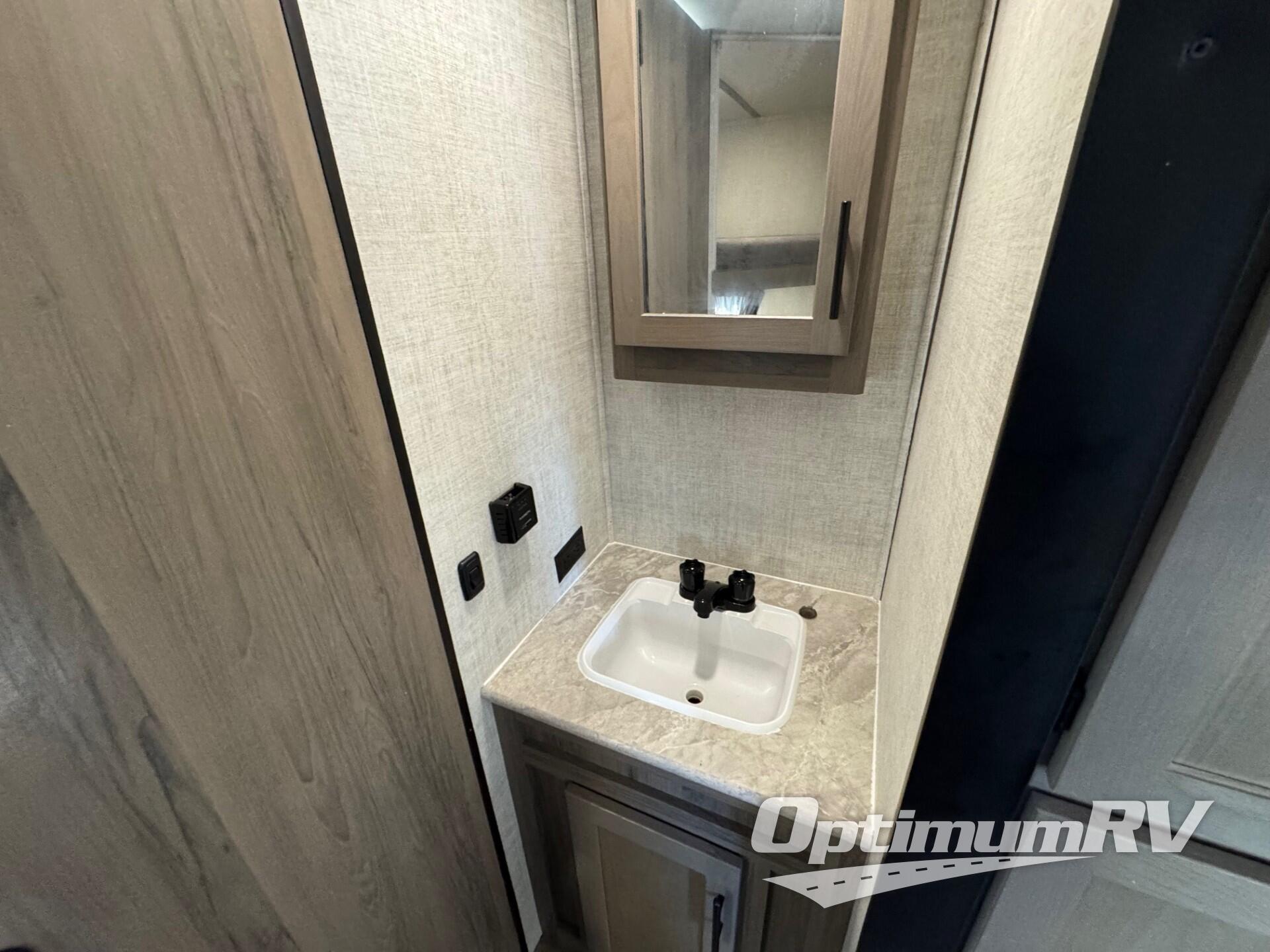 This semi-private front bedroom travel trailer allows you to change in privacy when you close the curtain and sleep on a queen-size bed or choose the optional Murphy bed/sofa for versatility. You will find your own wardrobe and a handy shelf at the head of the bed for your belongings. Your friends or kids will loving sleeping on the double-size bunks in the rear next to the private toilet and tub/shower room. The bathroom sink is just outside the door which is handy when two people need to get ready at once. And the cook will have full amenities, plus a pantry, and overhead storage for all the dishes, pots, and spices.