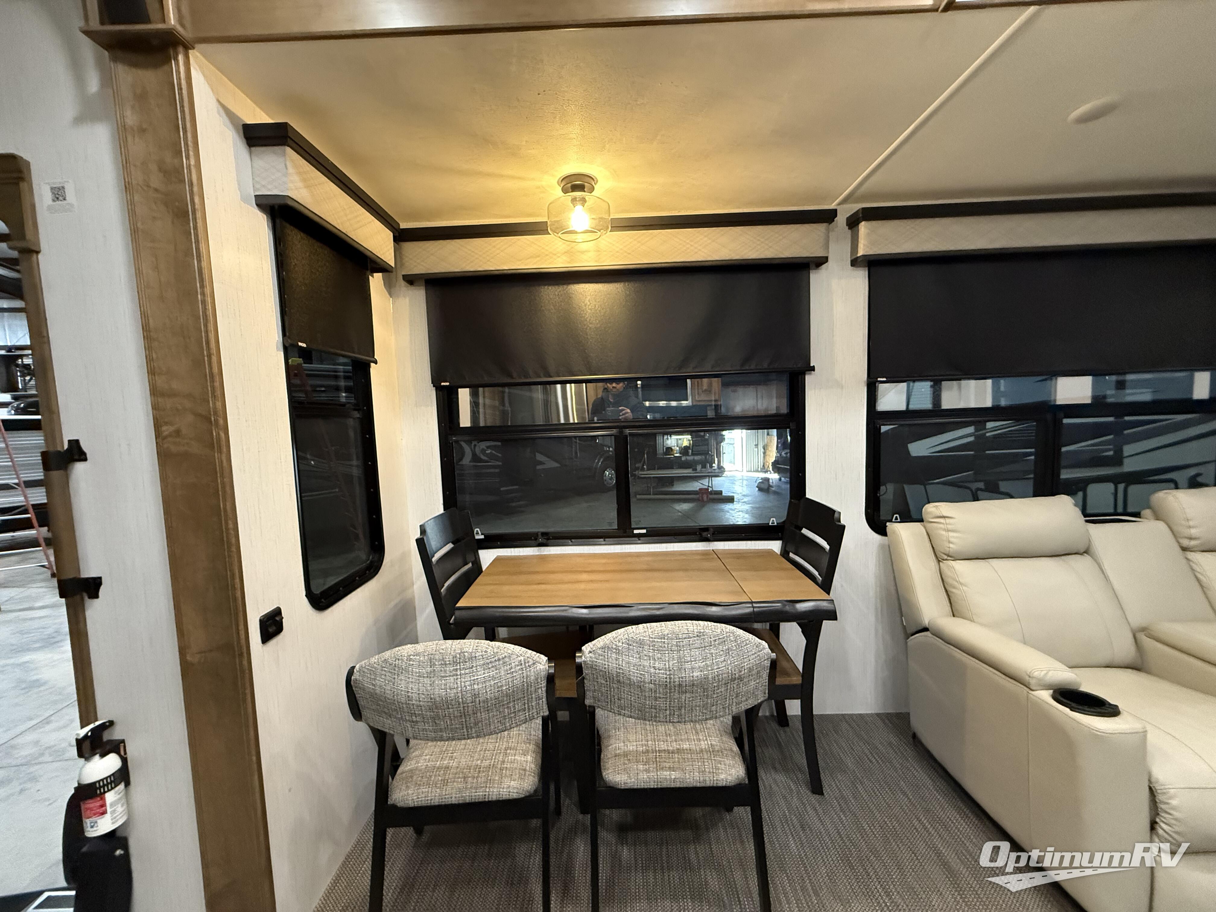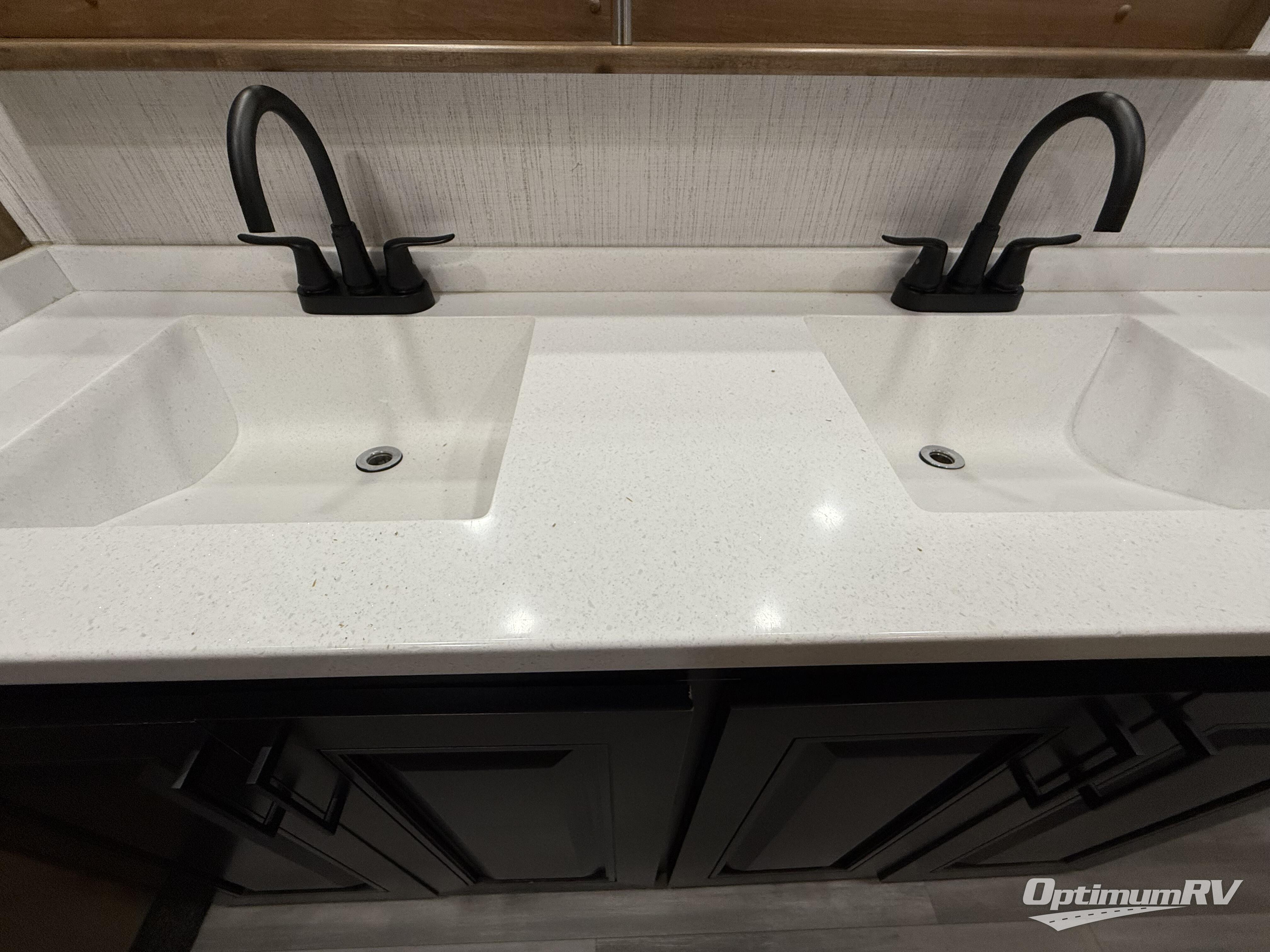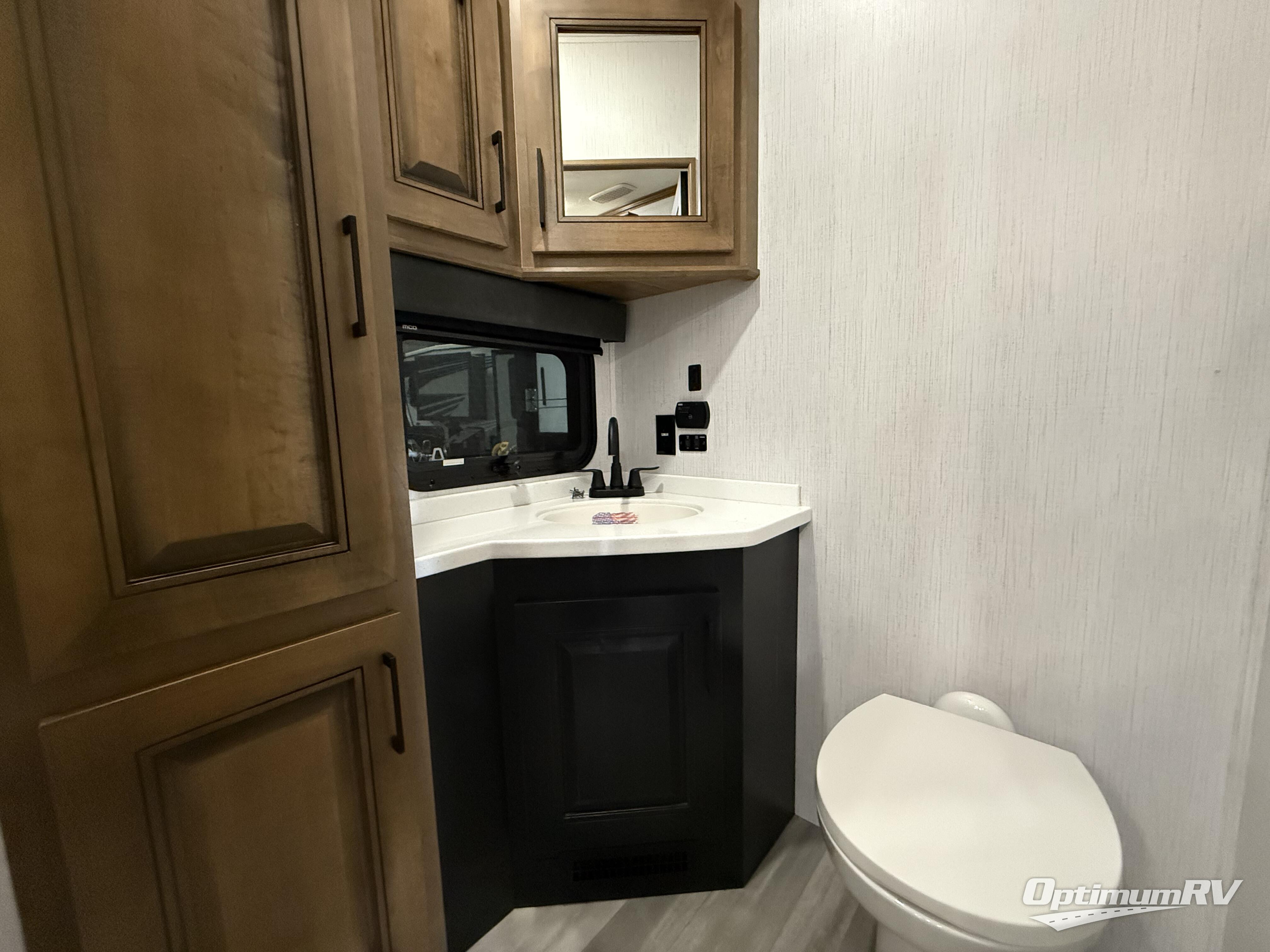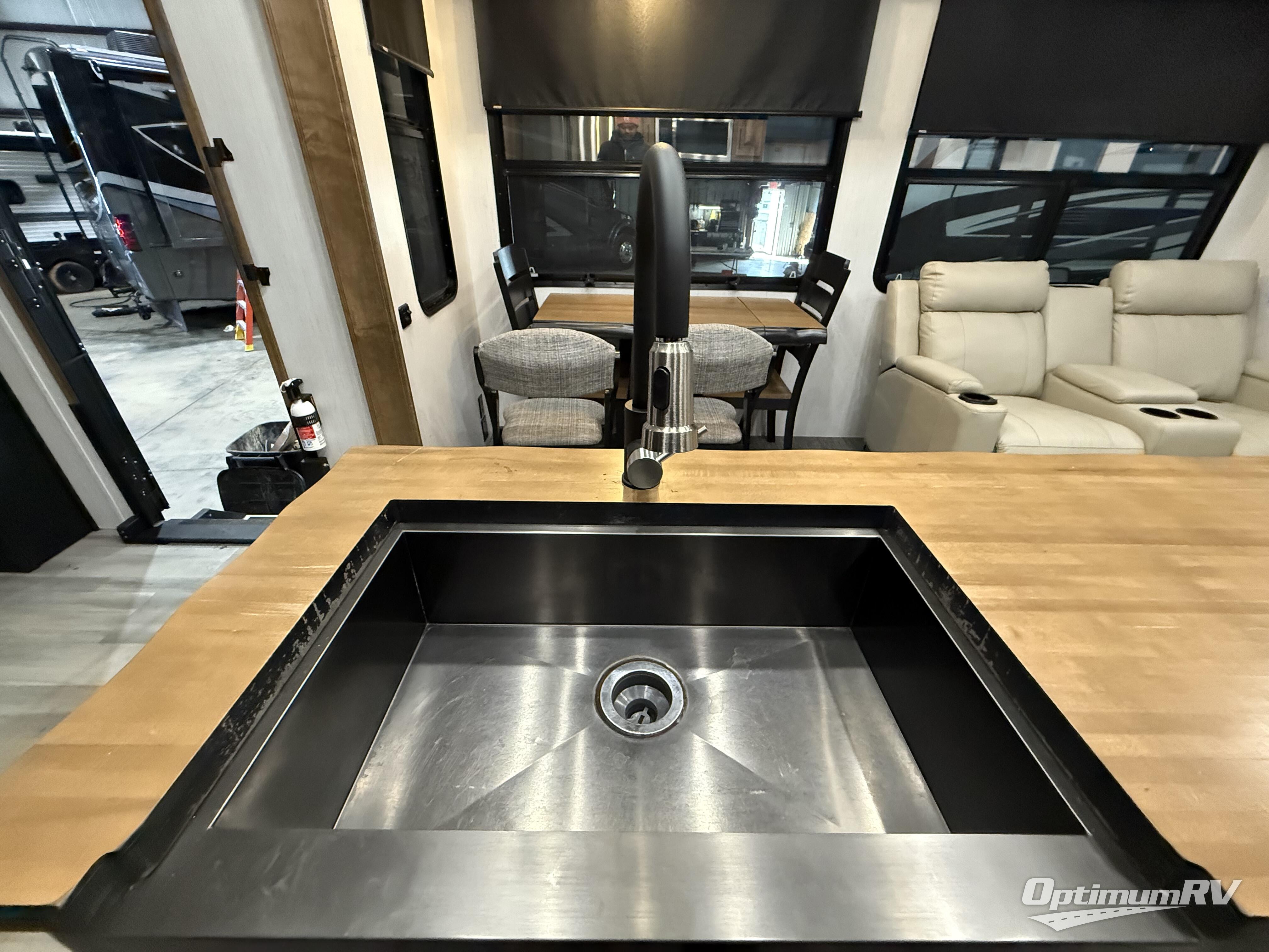 With a bath and a half and an outside shower, everyone will stay clean in this fifth wheel! The front full bathroom features a full wall closet, a shower with a teak seat and a dual sink vanity for two to get ready at once, plus a large linen closet to store your towels. Just outside the bathroom, the private bedroom offers a king bed slide for you to enjoy a good night's rest each night. The half bathroom is conveniently off of the kitchen so you can get back to cooking dinner with full amenities including a kitchen island. The live edge dinette table has two standard chairs and two folding chairs to keep your games close by. The flip and fold sleeper sofa allows you to bring a of couple guests and the power theater seating will have you feeling right at home!