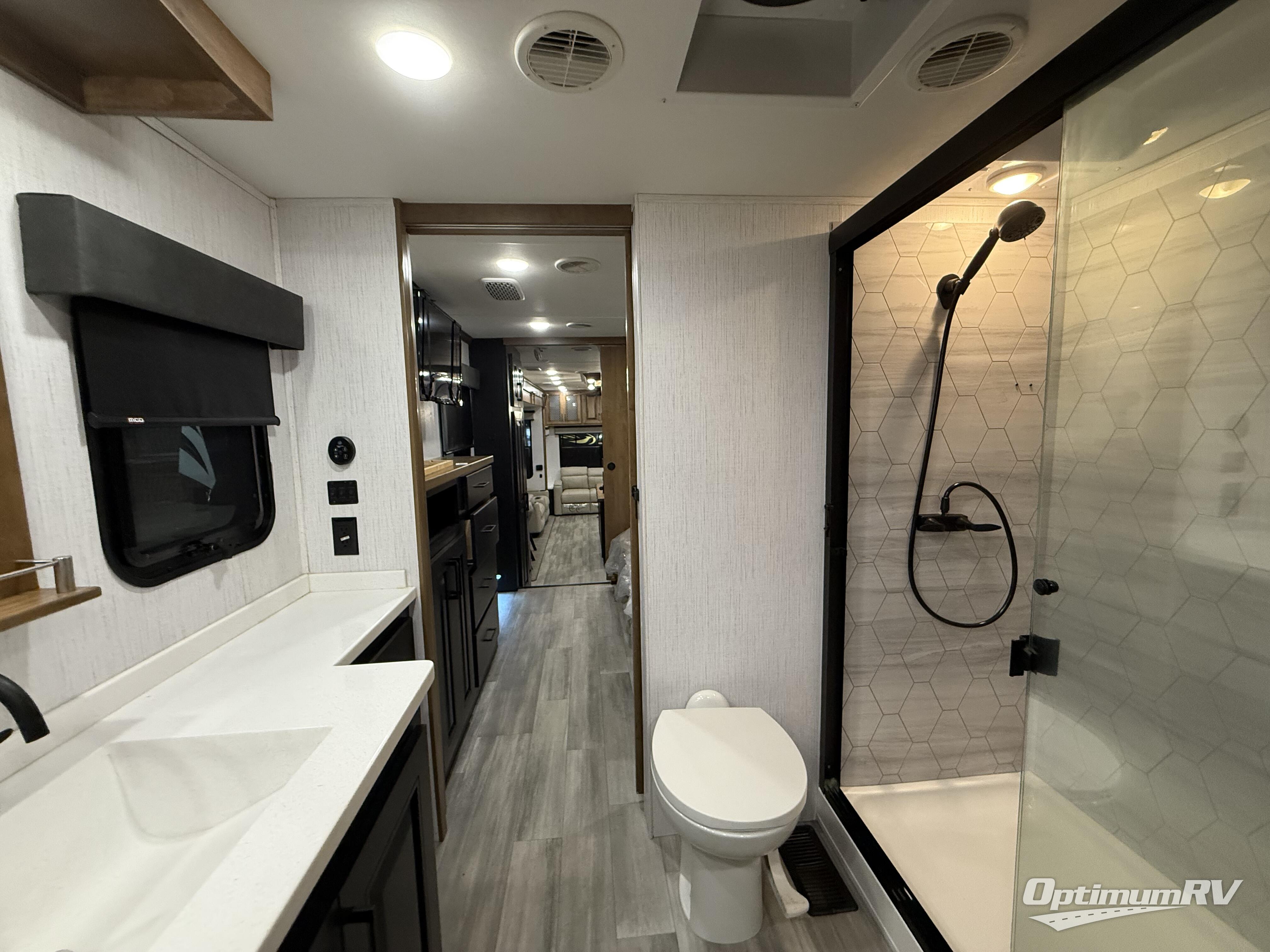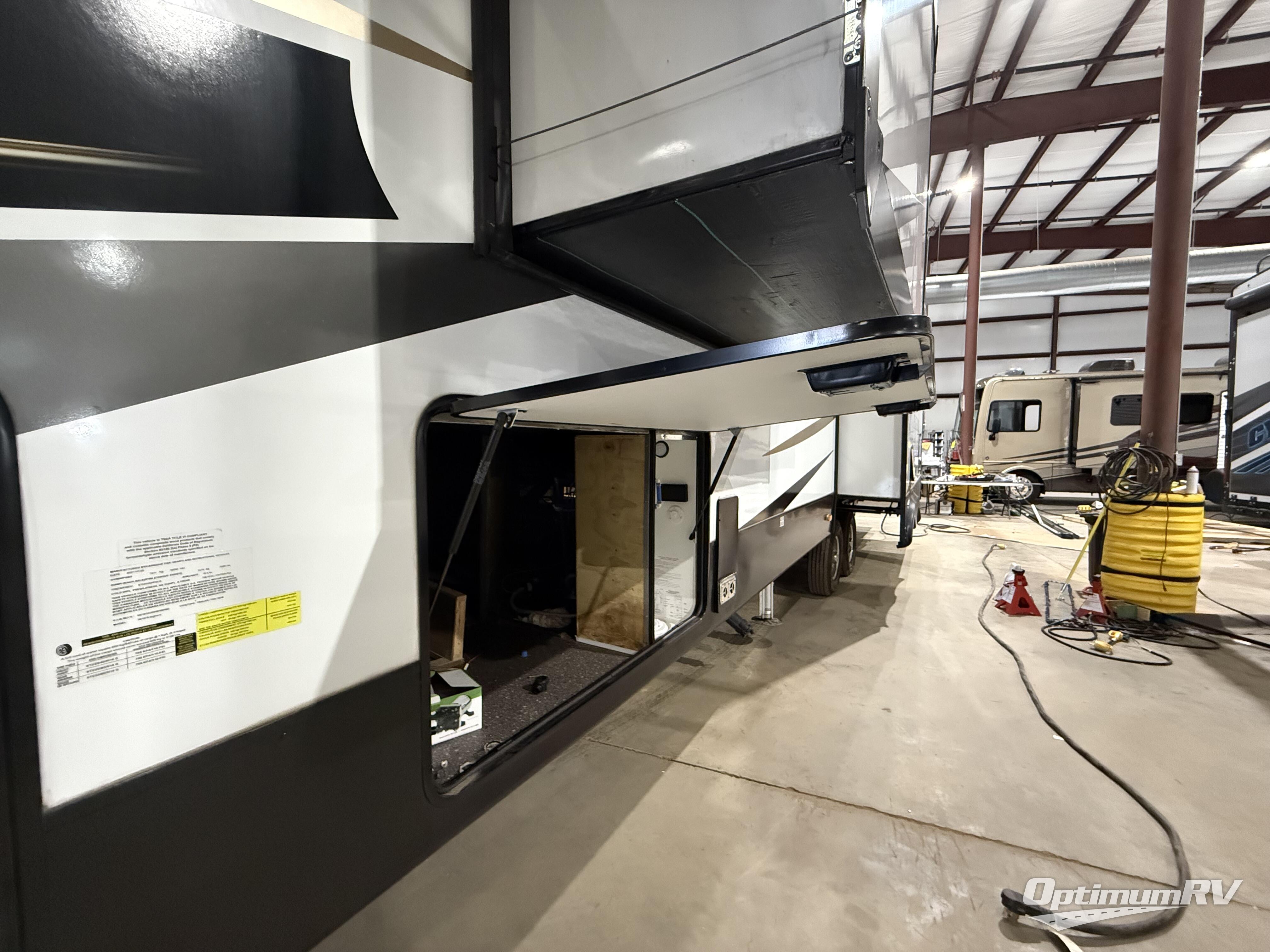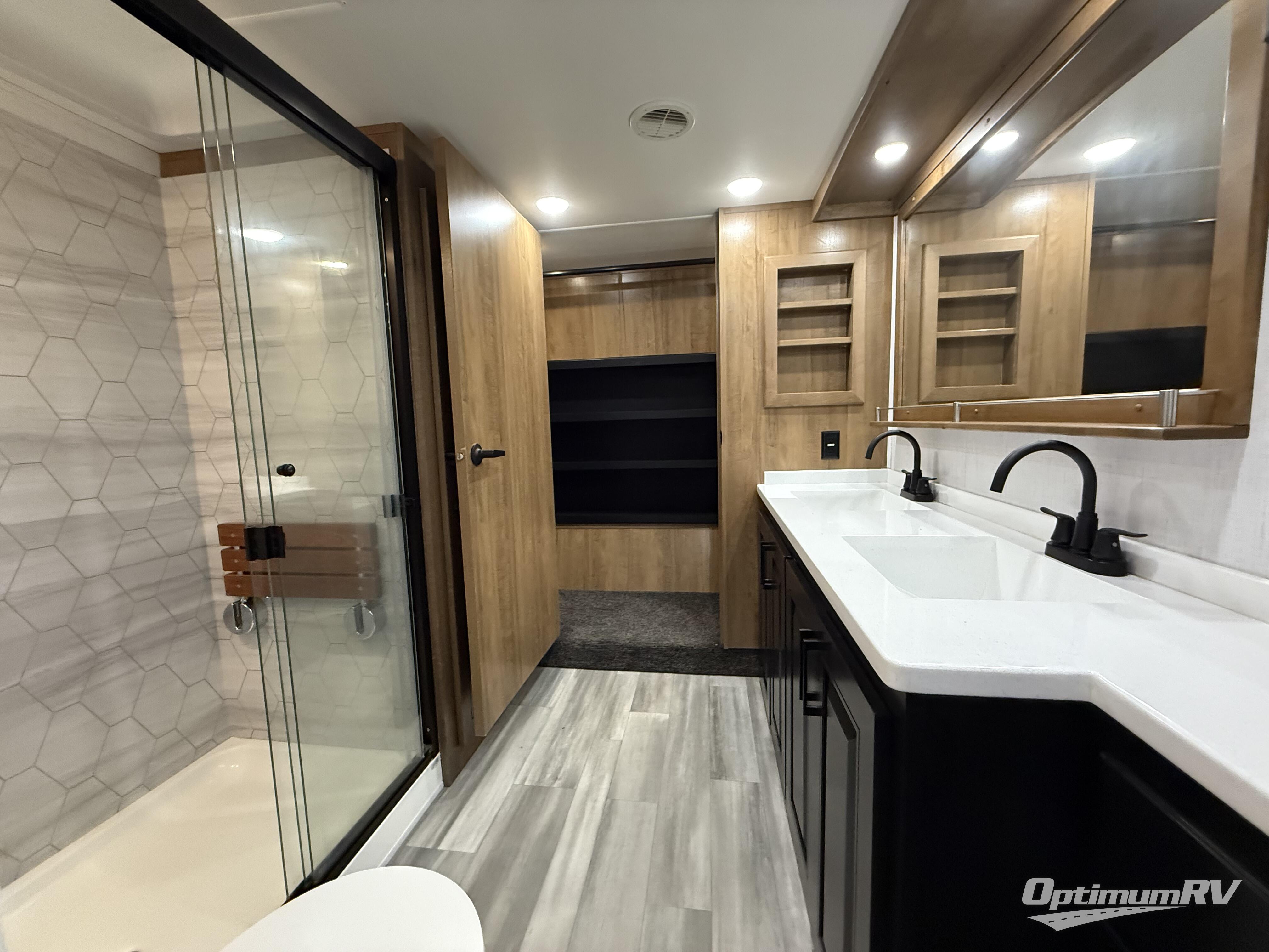 With a bath and a half and an outside shower, everyone will stay clean in this fifth wheel! The front full bathroom features a full wall closet, a shower with a teak seat and a dual sink vanity for two to get ready at once, plus a large linen closet to store your towels. Just outside the bathroom, the private bedroom offers a king bed slide for you to enjoy a good night's rest each night. The half bathroom is conveniently off of the kitchen so you can get back to cooking dinner with full amenities including a kitchen island. The live edge dinette table has two standard chairs and two folding chairs to keep your games close by. The flip and fold sleeper sofa allows you to bring a of couple guests and the power theater seating will have you feeling right at home!