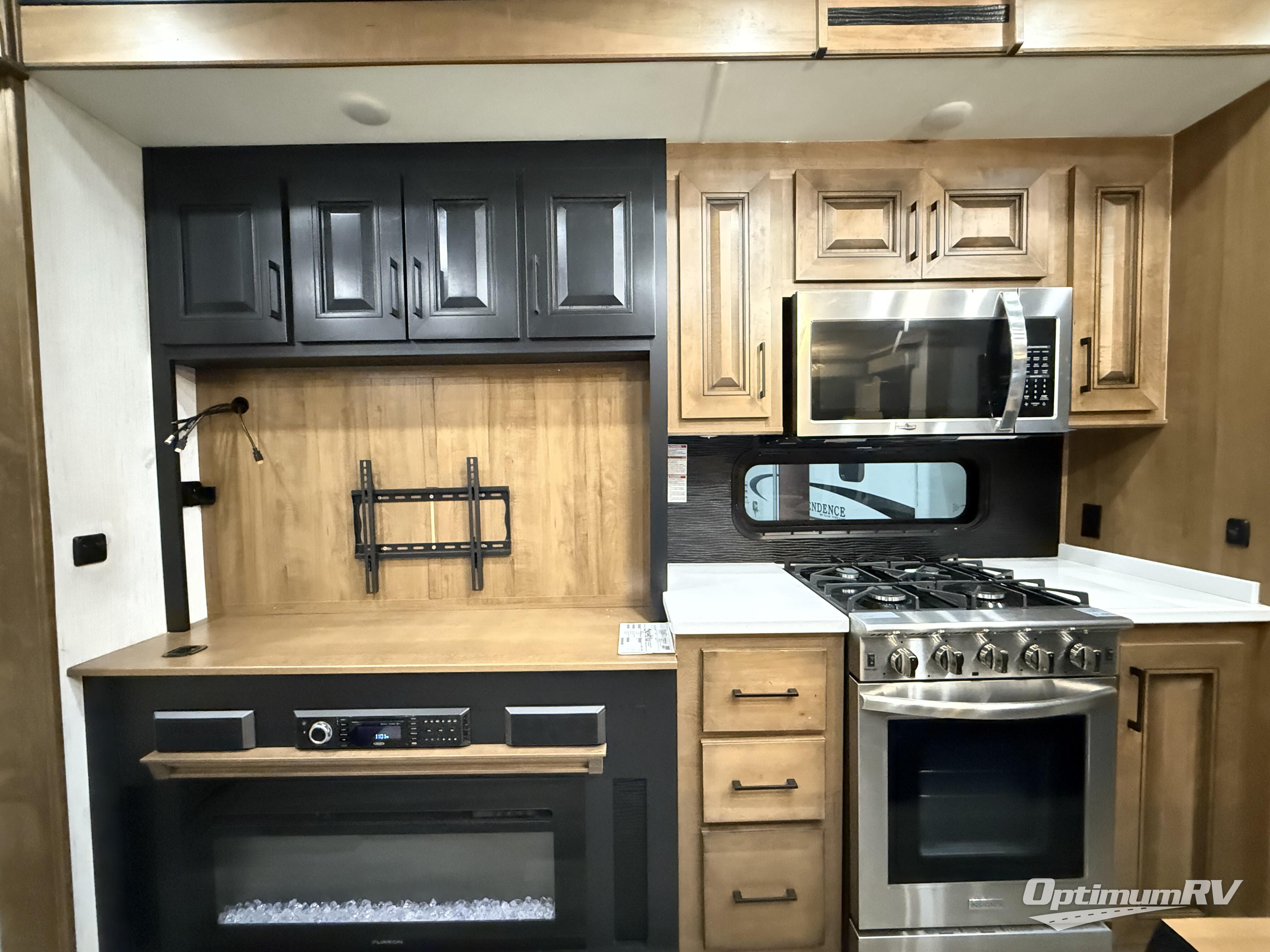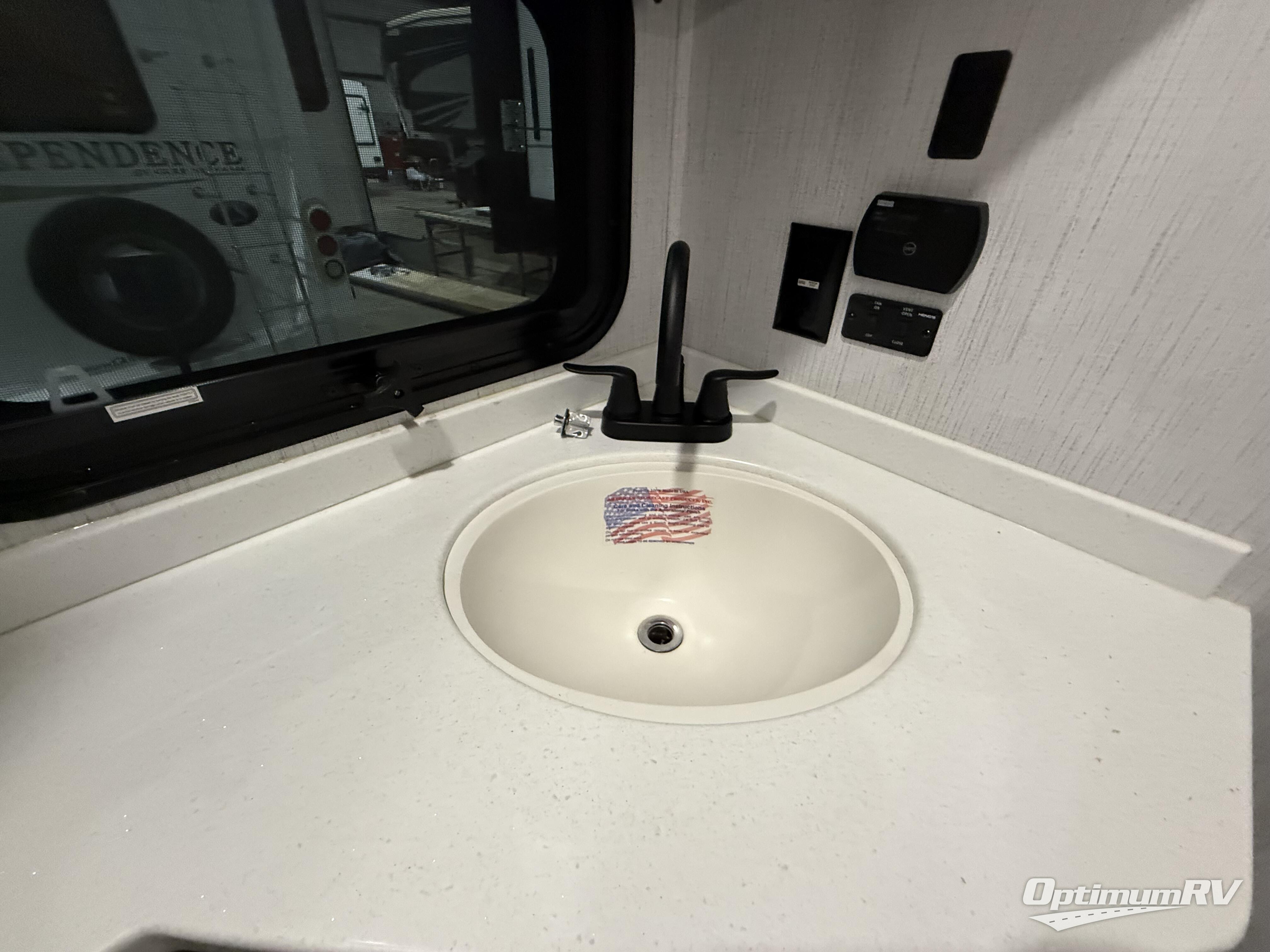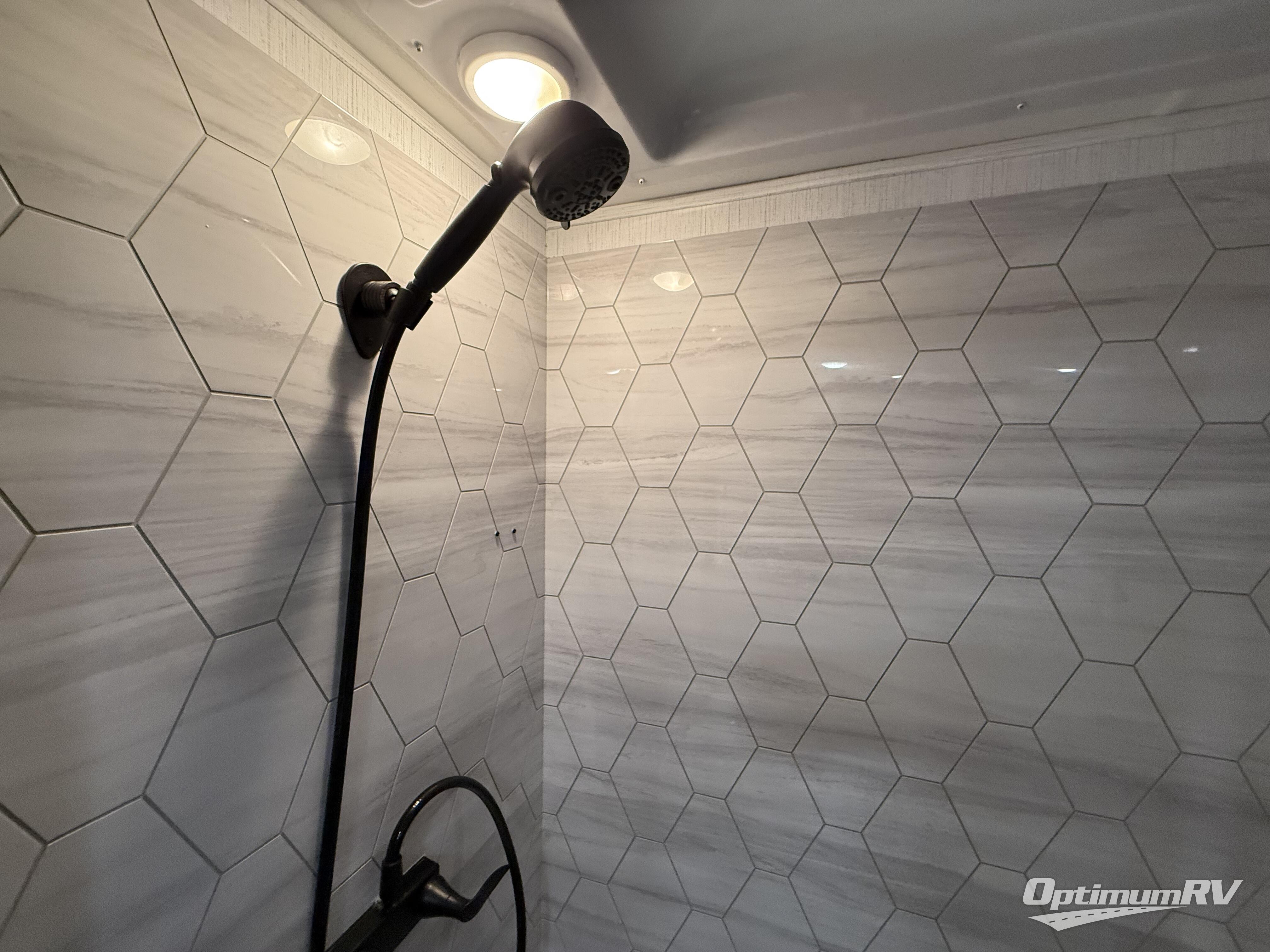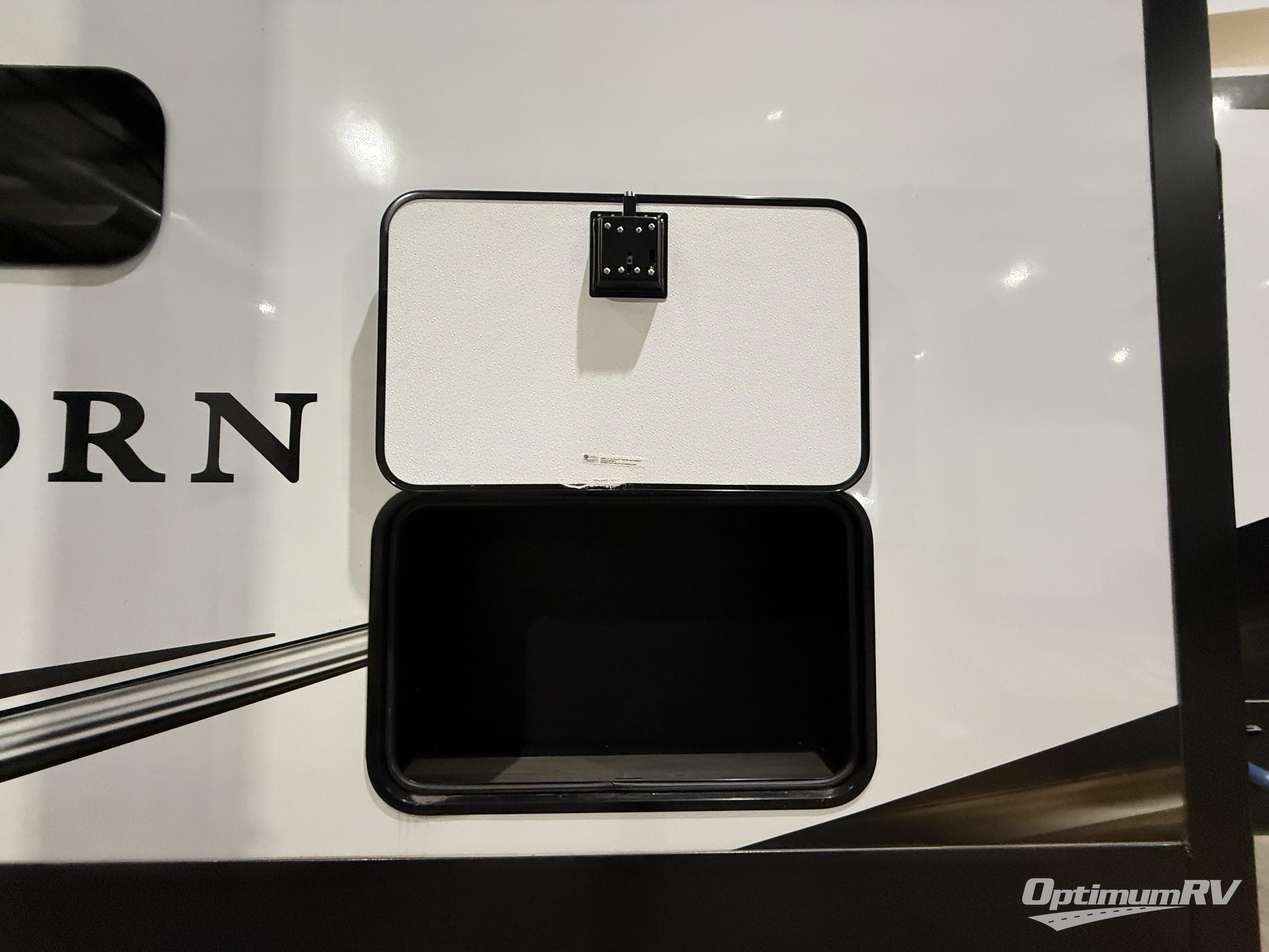 With a bath and a half and an outside shower, everyone will stay clean in this fifth wheel! The front full bathroom features a full wall closet, a shower with a teak seat and a dual sink vanity for two to get ready at once, plus a large linen closet to store your towels. Just outside the bathroom, the private bedroom offers a king bed slide for you to enjoy a good night's rest each night. The half bathroom is conveniently off of the kitchen so you can get back to cooking dinner with full amenities including a kitchen island. The live edge dinette table has two standard chairs and two folding chairs to keep your games close by. The flip and fold sleeper sofa allows you to bring a of couple guests and the power theater seating will have you feeling right at home!