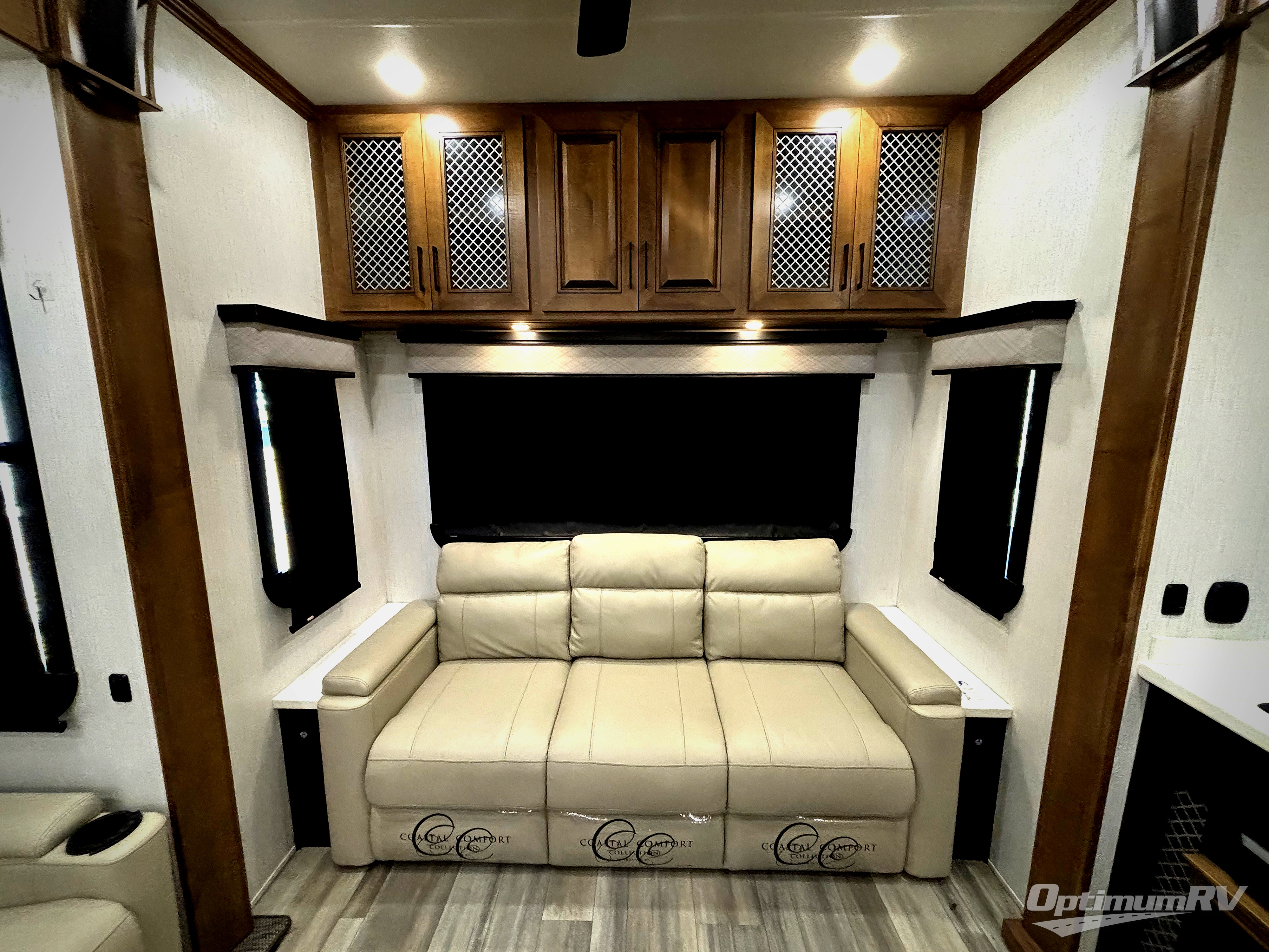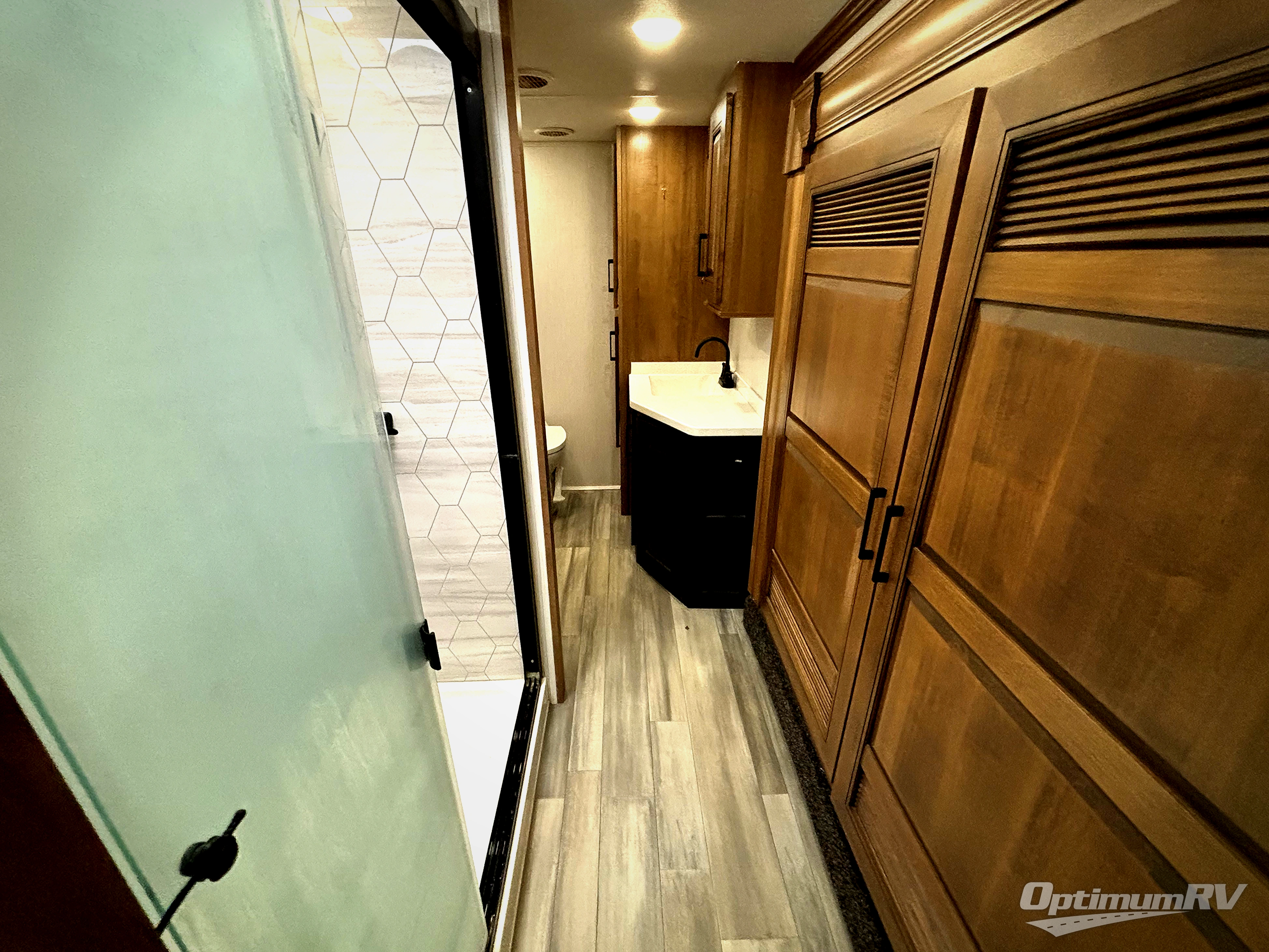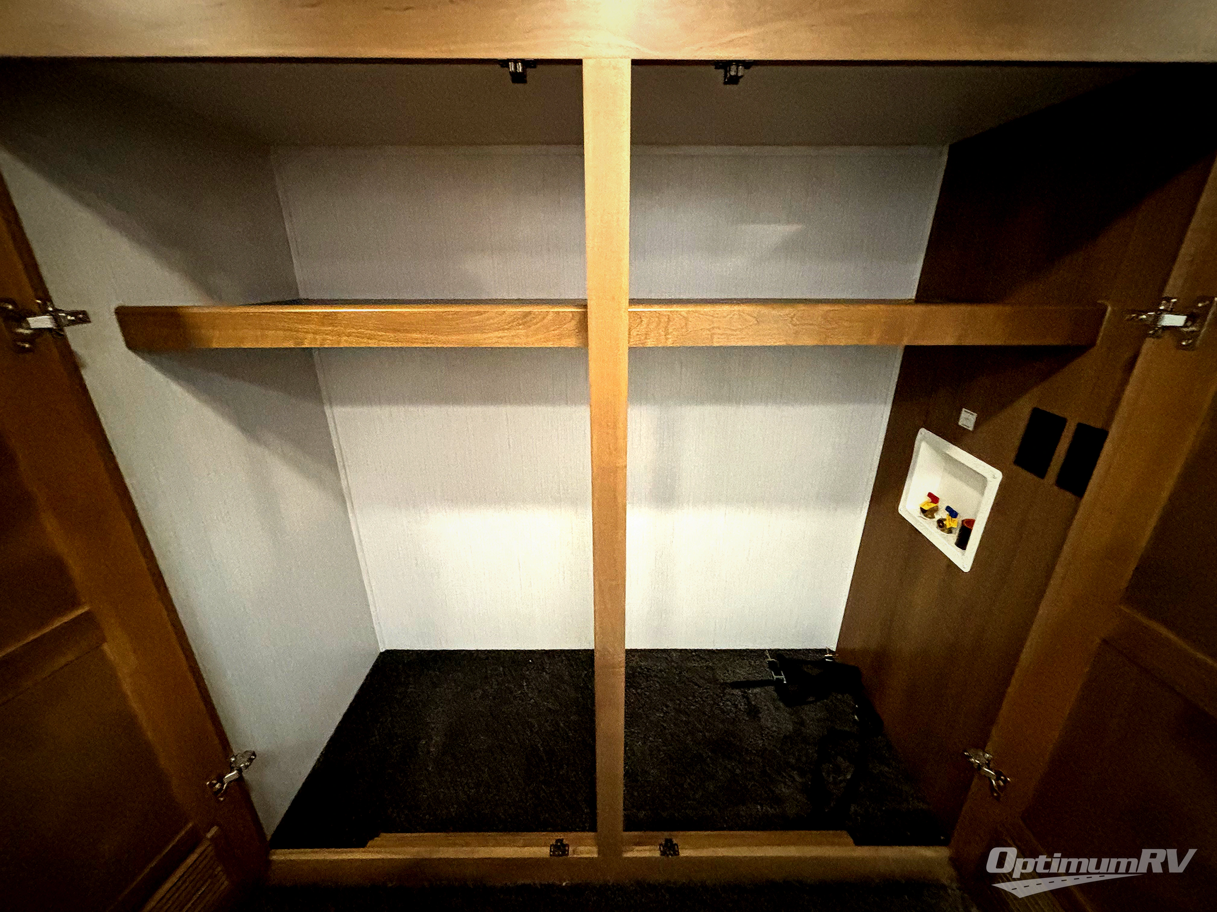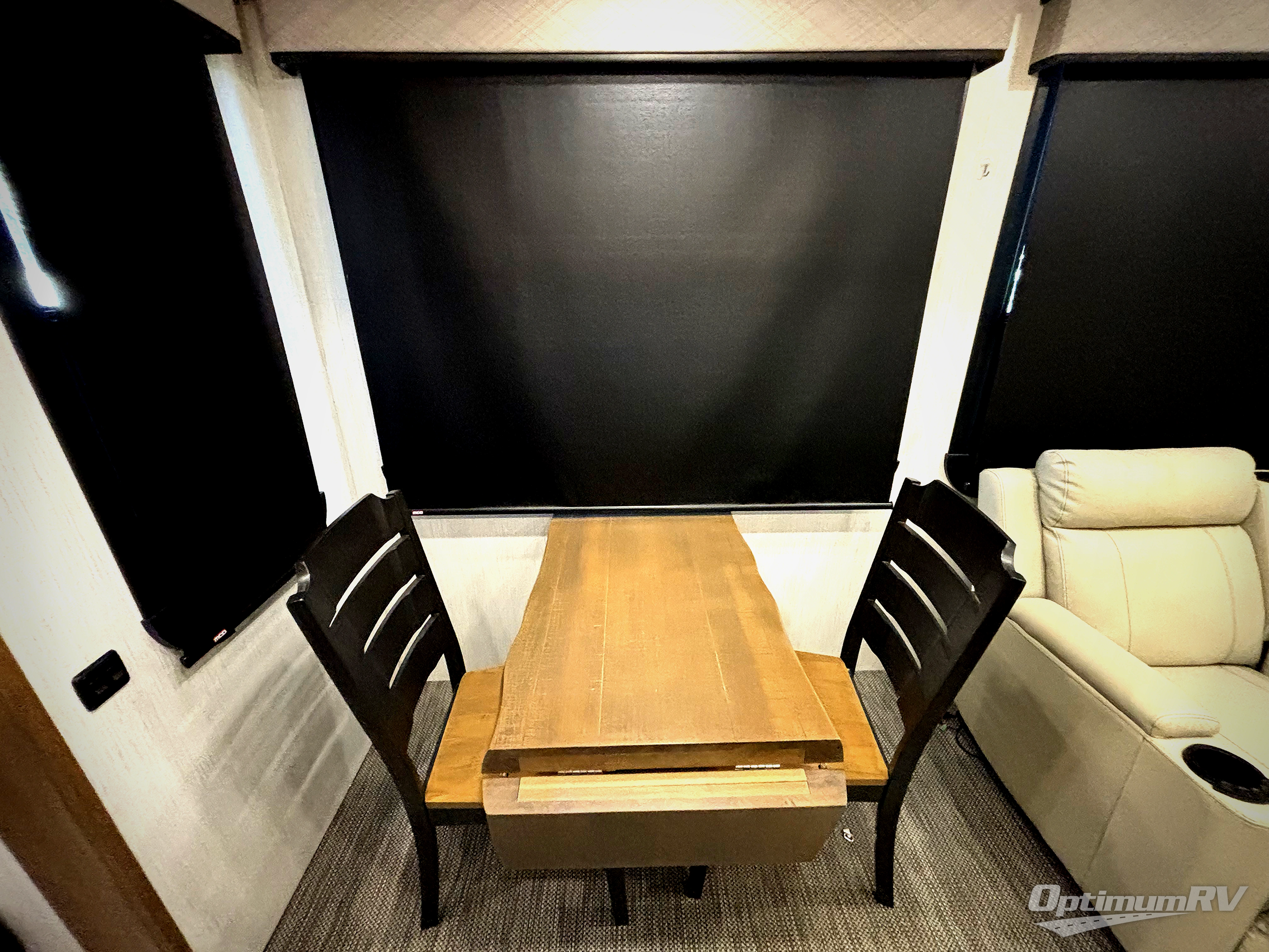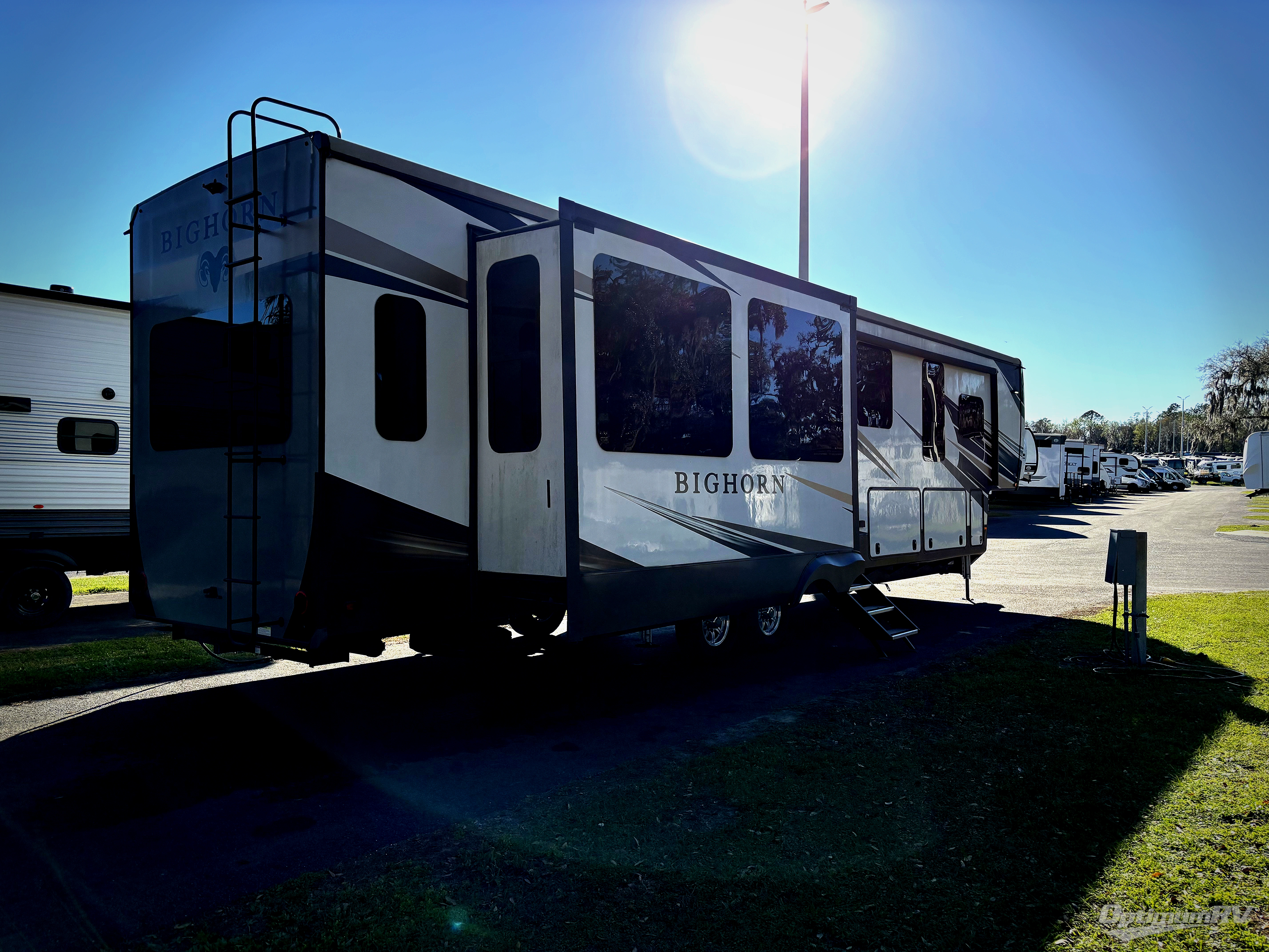 When you camp, you don't have to give up your spacious bathroom and bedroom you are accustom to having when you have this Bighorn! The extended slide in the bedroom stretches to the bathroom, plus you have double entry from either the front bedroom or the hallway. The shower includes a teak seat, and the bathroom closet allows you to hang clothes as well as choose a washer/dryer option for the prepped space. There is more storage for linens, toiletries and such. The front bedroom gives you unique front wall seating with a window, overhead cabinets, and drawer storage plus counter tops to place your phone, books and even display photos and decor. The kitchen and living area is spacious with dual slide outs, and the cook will love the island, the pantry, the residential refrigerator and the four-burner cooktop. The power theater seats with heat and massage as well as the upgraded flip and fold sleeper sofa, and the live edge dinette table with chairs, are just more reasons you will love this RV!