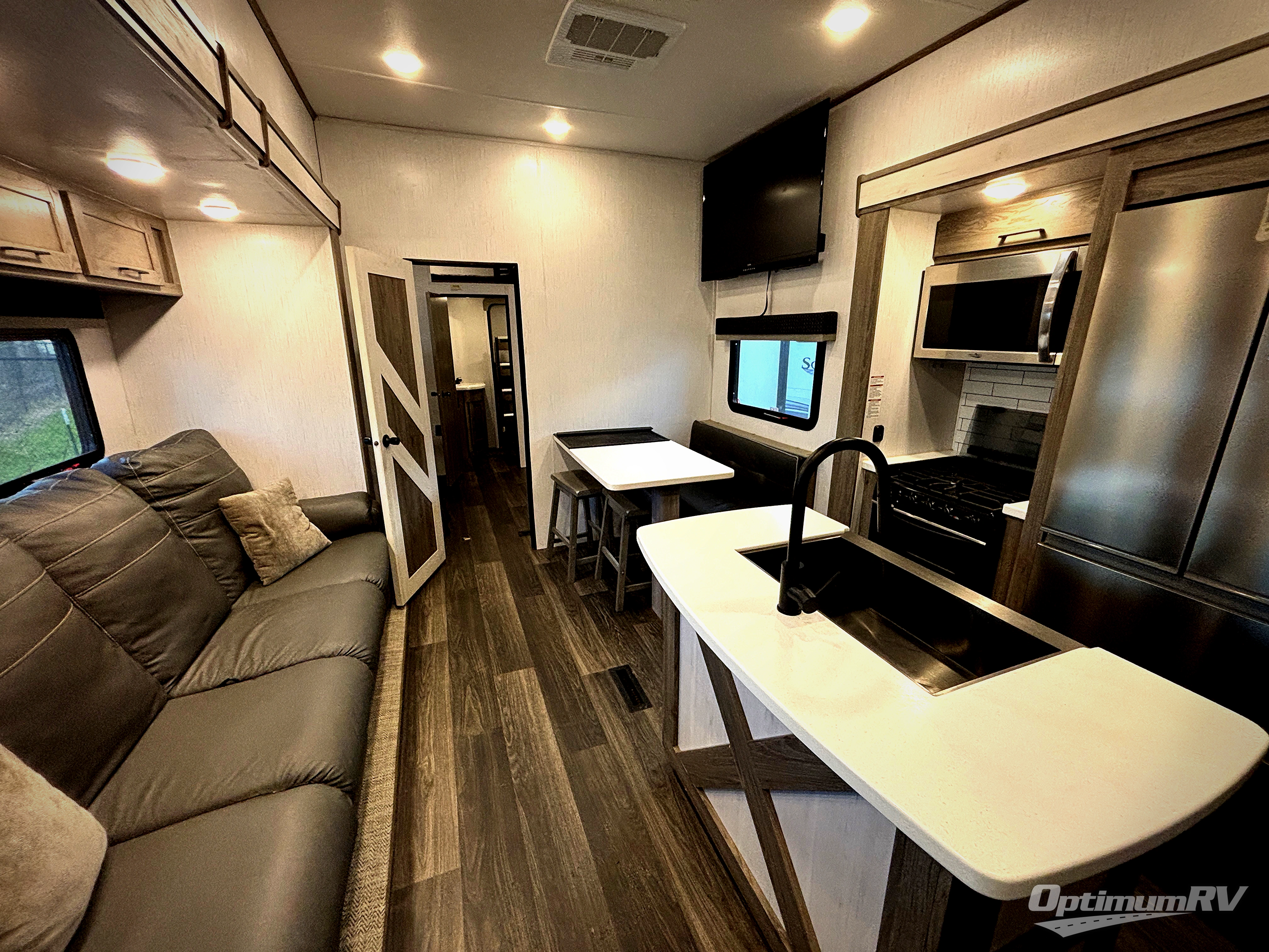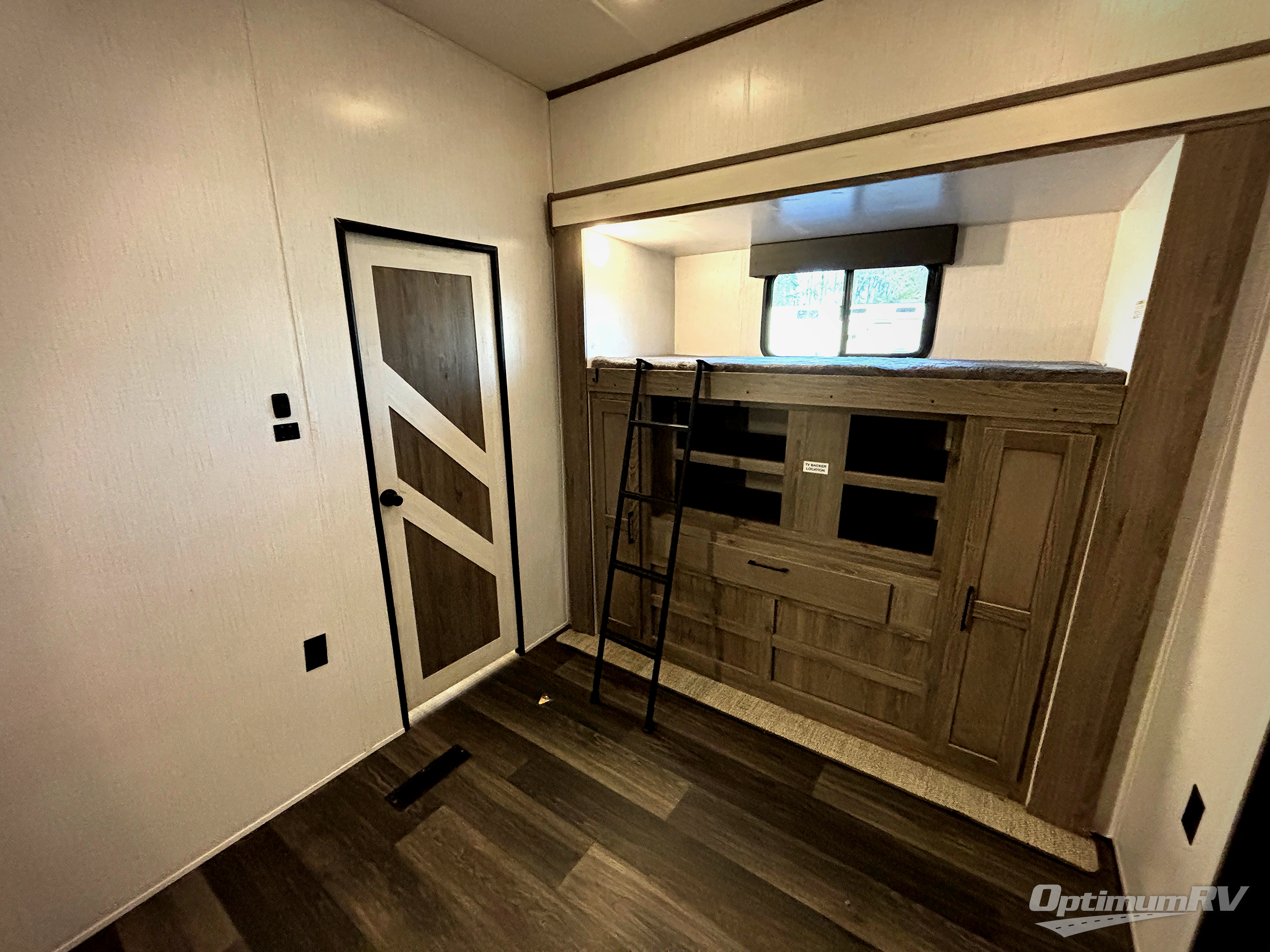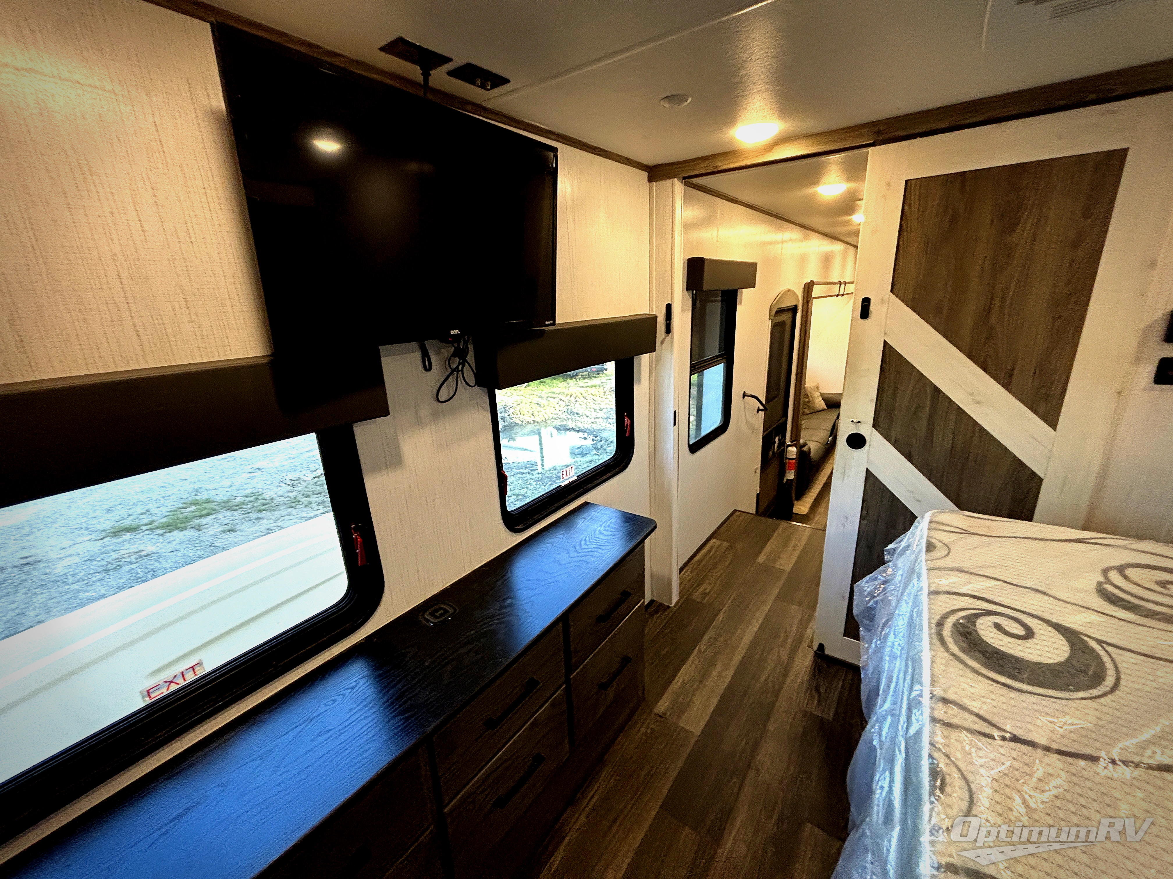 This toy hauler is decked out in features you will love! Starting with the rear entrance that leads directly into the spacious rear private bunkhouse with a sofa slide, a set of bunk beds slide, and a loft above a full bathroom. Everyone's bellies will stay full with the recessed three burner cooktop with oven and the residential French door 14.9 cu. ft. refrigerator with 1000w inverter or you can prepare your delicious home cooked meals while breathing in some fresh air with the outdoor kitchen. Enjoy your meal at the one sided booth dinette then relax on the four person sofa slide by the 40" electric fireplace with accent lighting or freshen up in the second full bathroom which has a shower with a seat. The front private bedroom has a king bed slide to lay your head on at night and a front closet with an area prepped to add an optional washer and dryer!