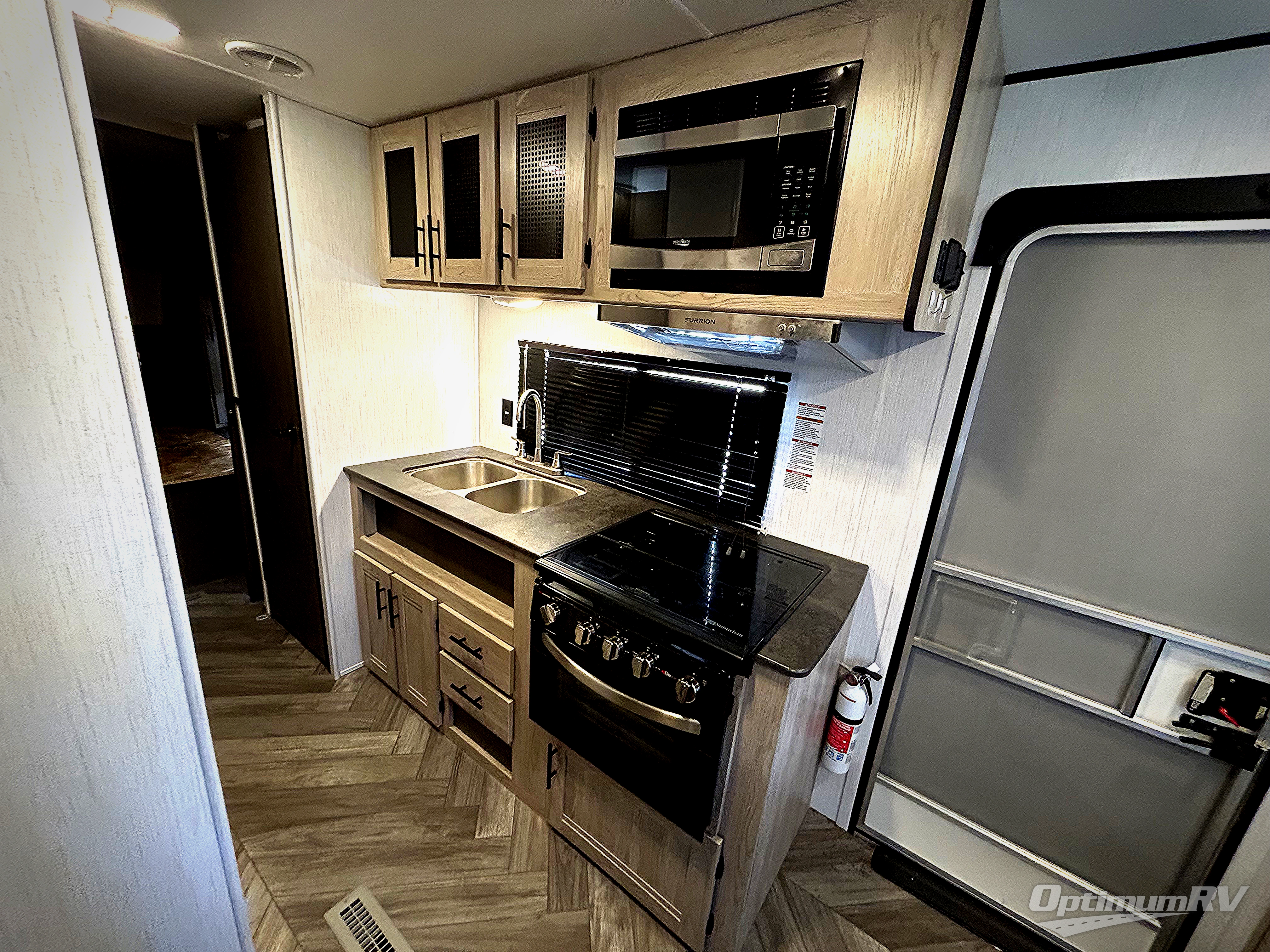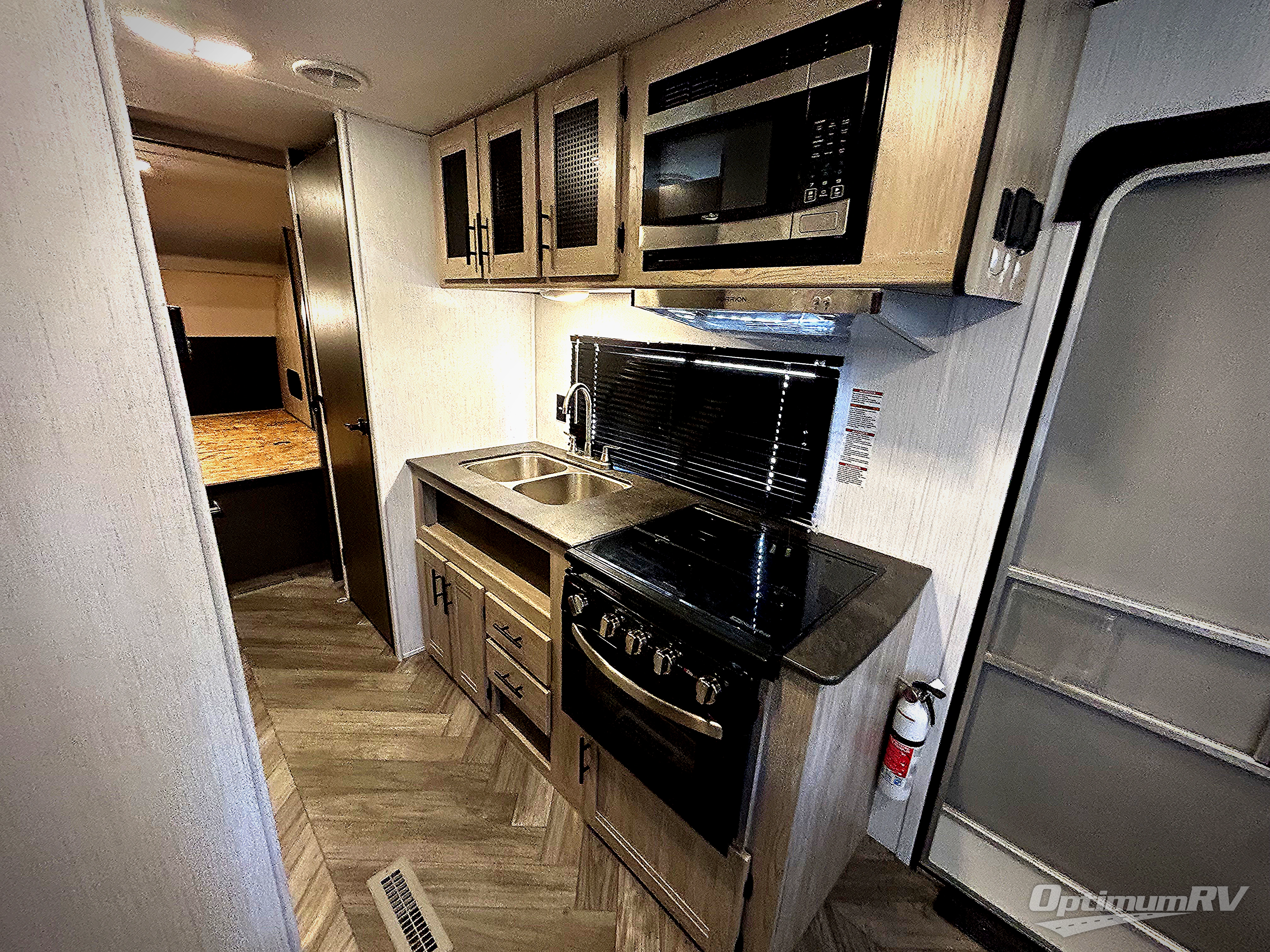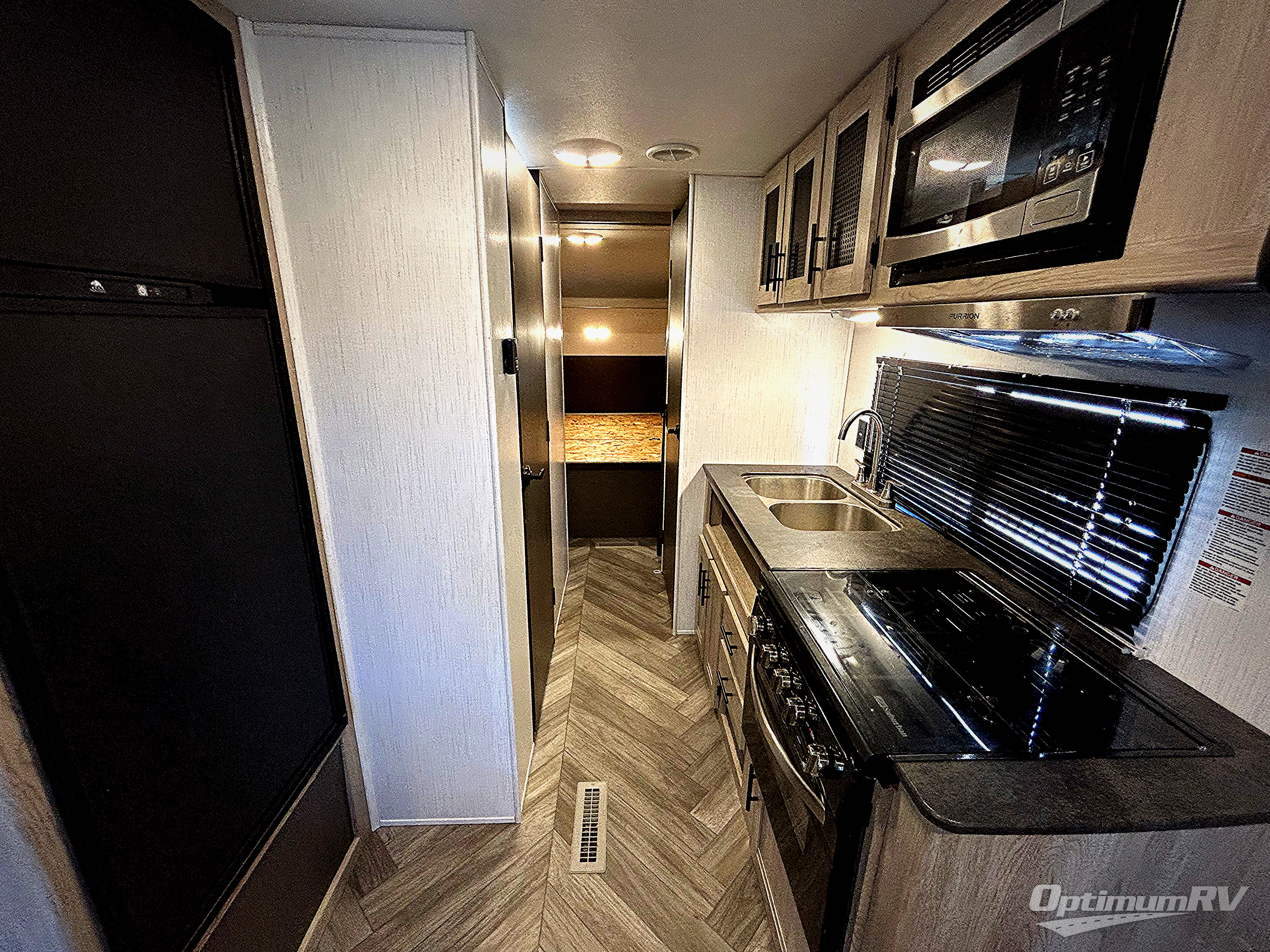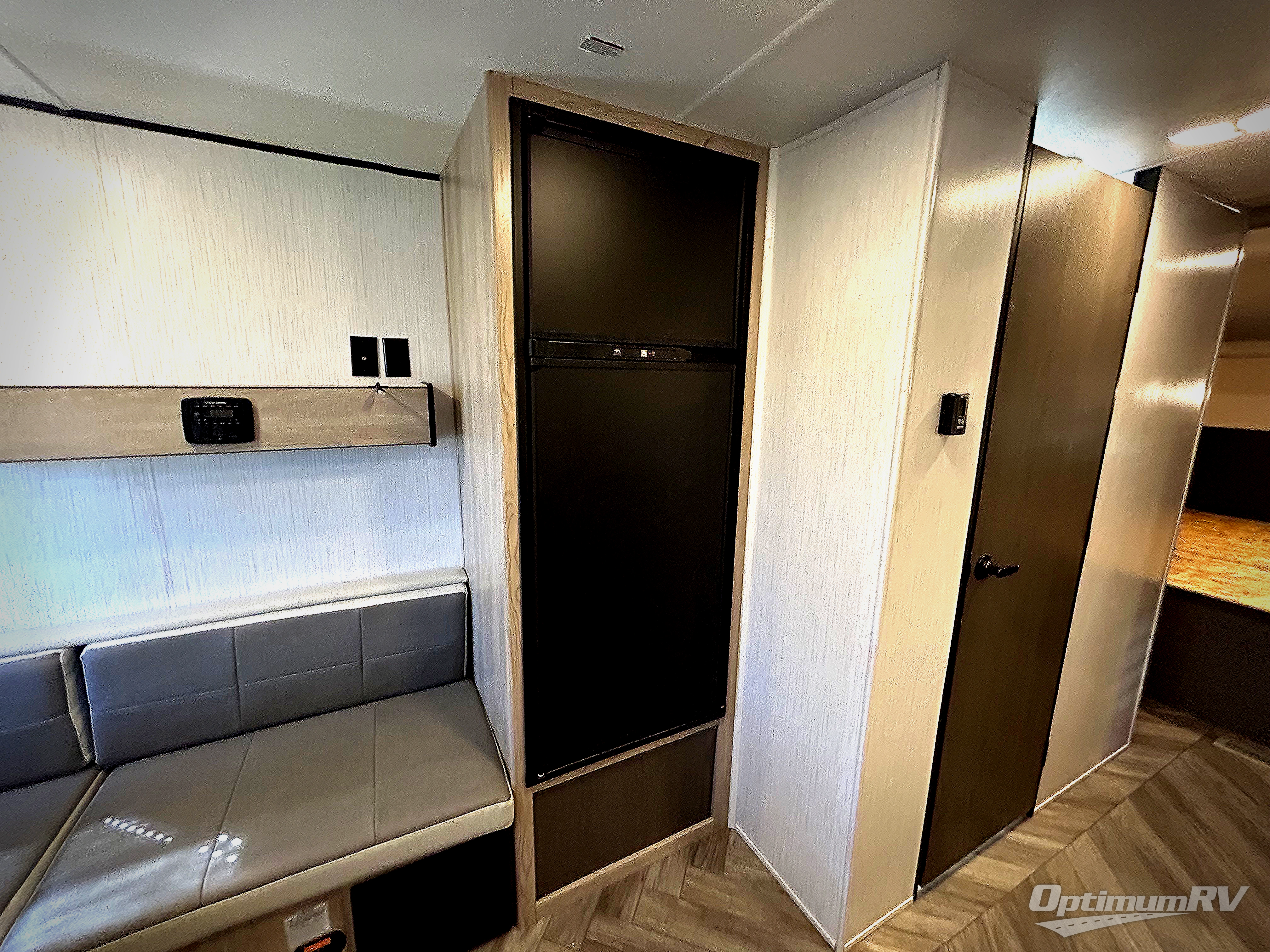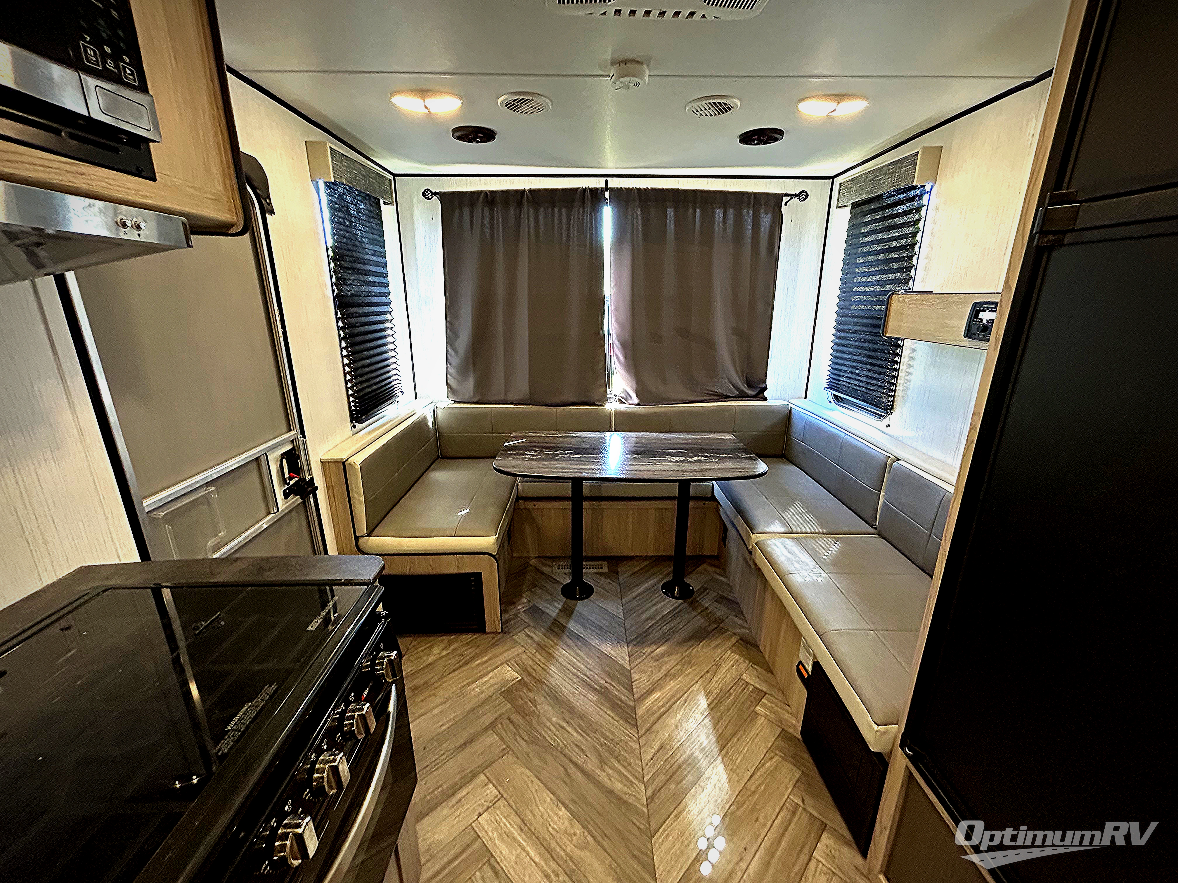 This is the perfect upgrade if you're ready to go from a tent to a travel trailer. You will have your own queen bed in the front private bedroom, plus dual shirt wardrobes to keep your clothes wrinkle-free. The U-shaped dinette in the back provides a place to dine at, and your guests can sleep here if you have any. Whip up your best meals on the three burner cooktop or in the microwave oven, and the pull-out faucet will make clean-up a breeze. This model also includes a pantry/wardrobe to store jackets, shoes, and dry goods.