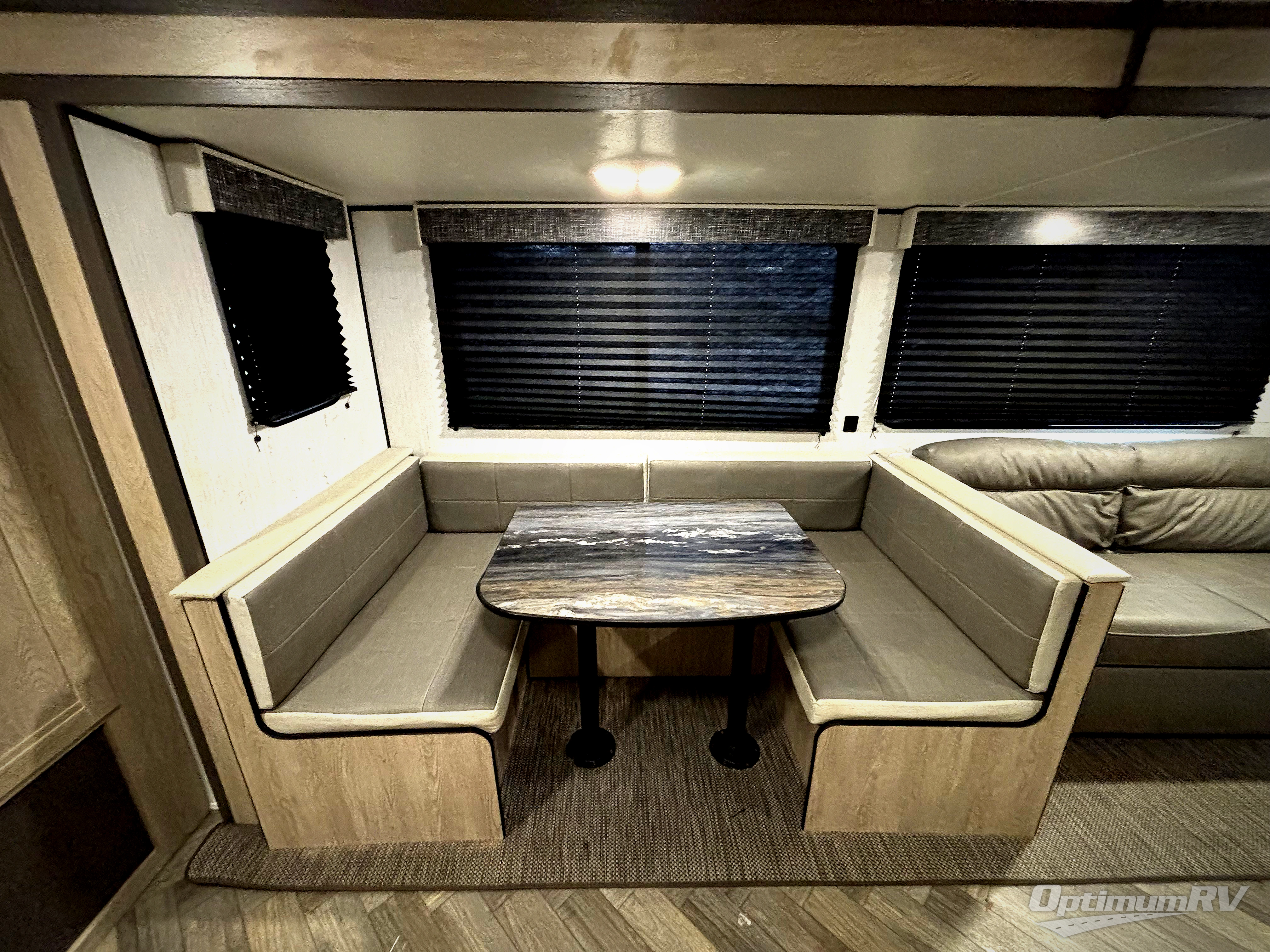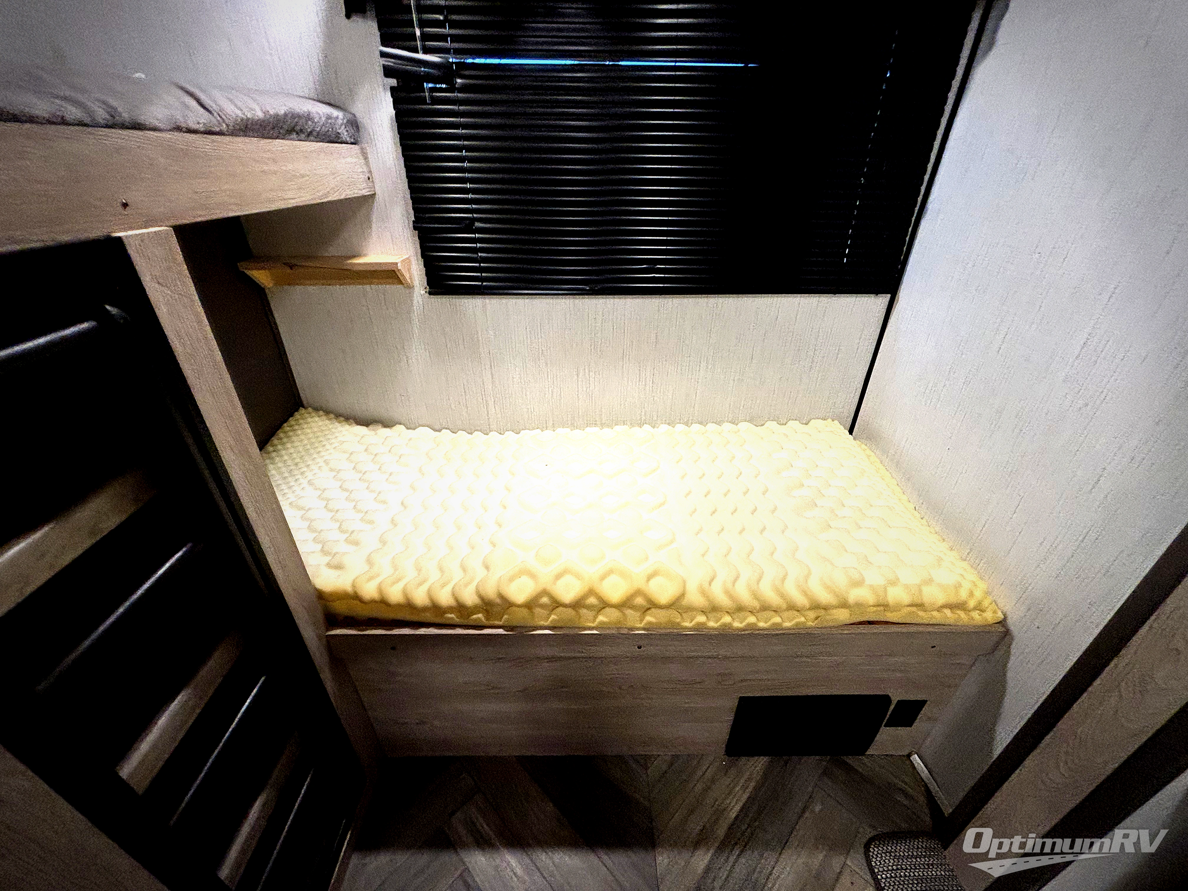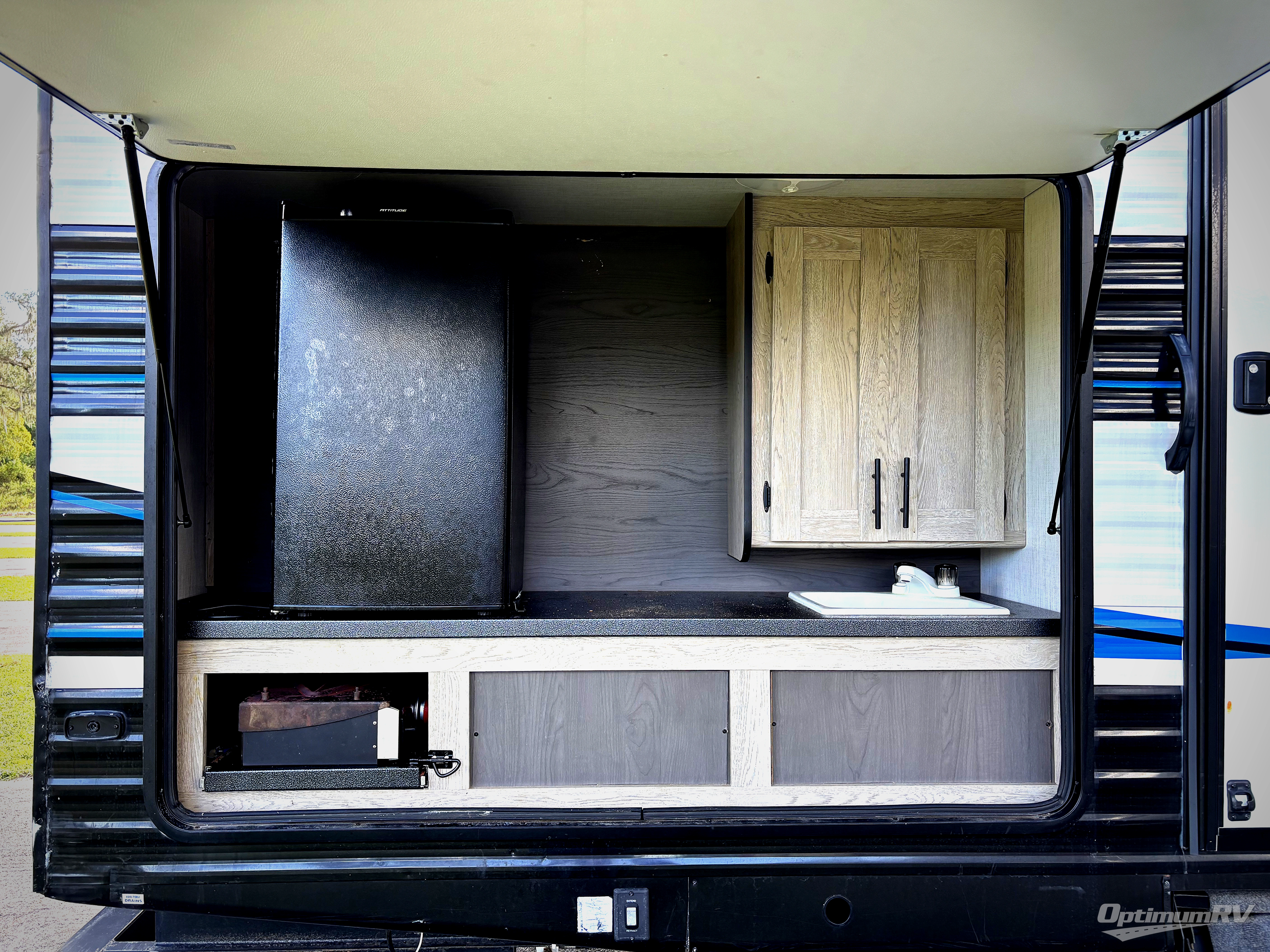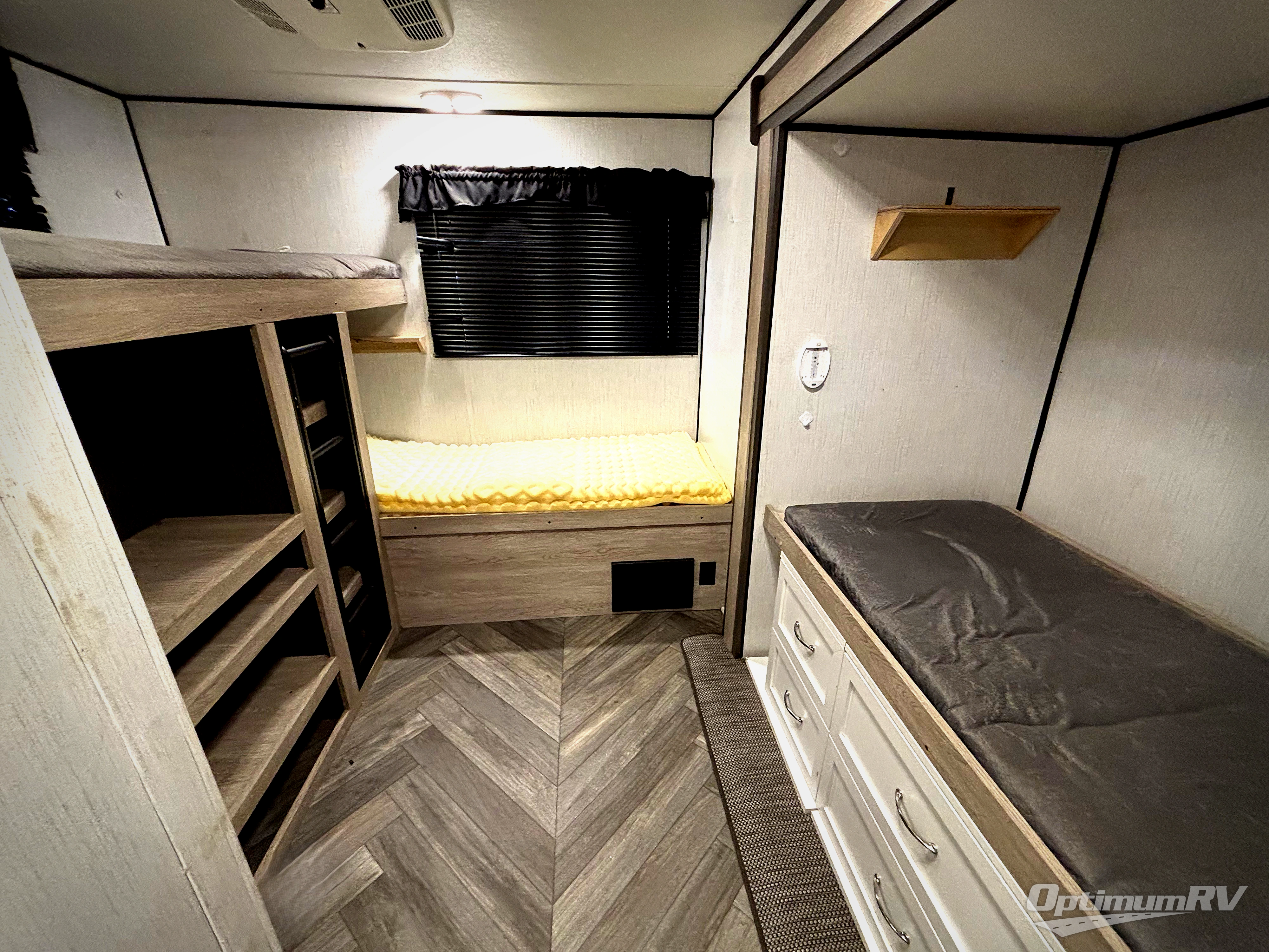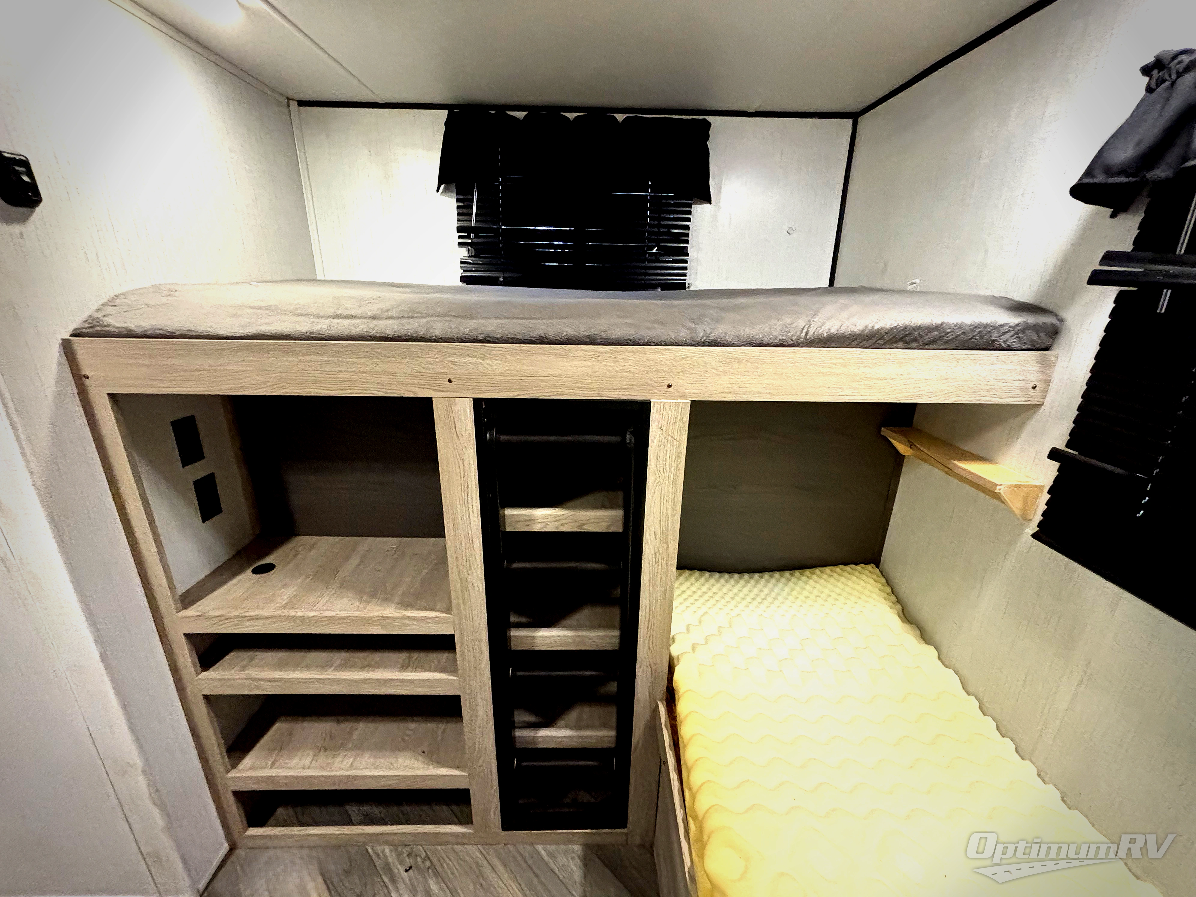 You can't go wrong with this double slide travel trailer in tow! The chef of your group can prepare lunch on the outdoor kitchen with a griddle before you all head off on a trail. The full bath includes its own exterior entry door for convenience, and you'll find a second entry door leading into the main living area. The bunkhouse includes a slide out for more space, three bunks, plus game chairs below one bunk the little ones are sure to love. You'll find a sofa and U-shaped dinette within the living area, and all the kitchen appliances needed to prepare at-home meals. This model also includes a front private bedroom with a queen bed for all-around comfort!