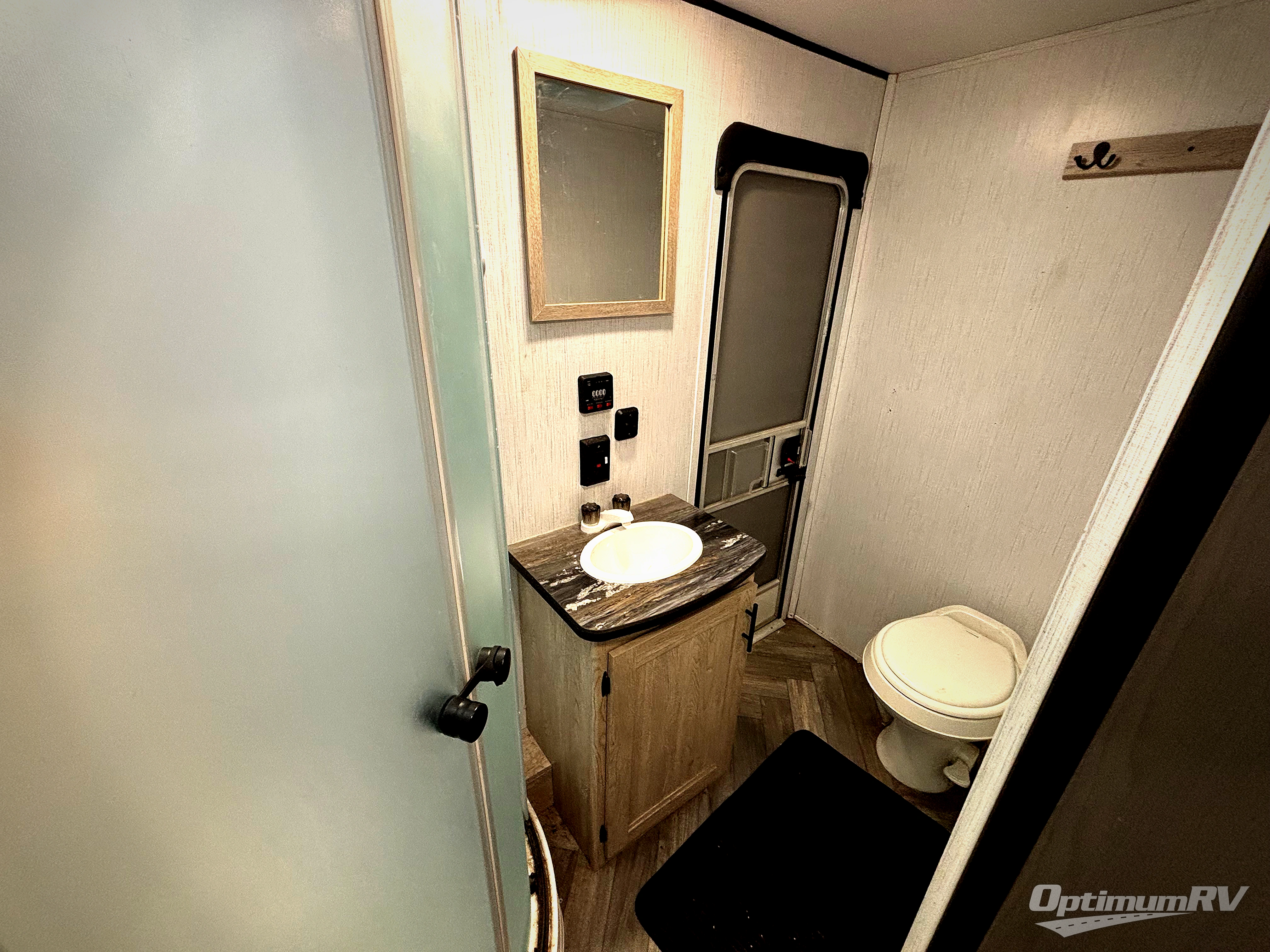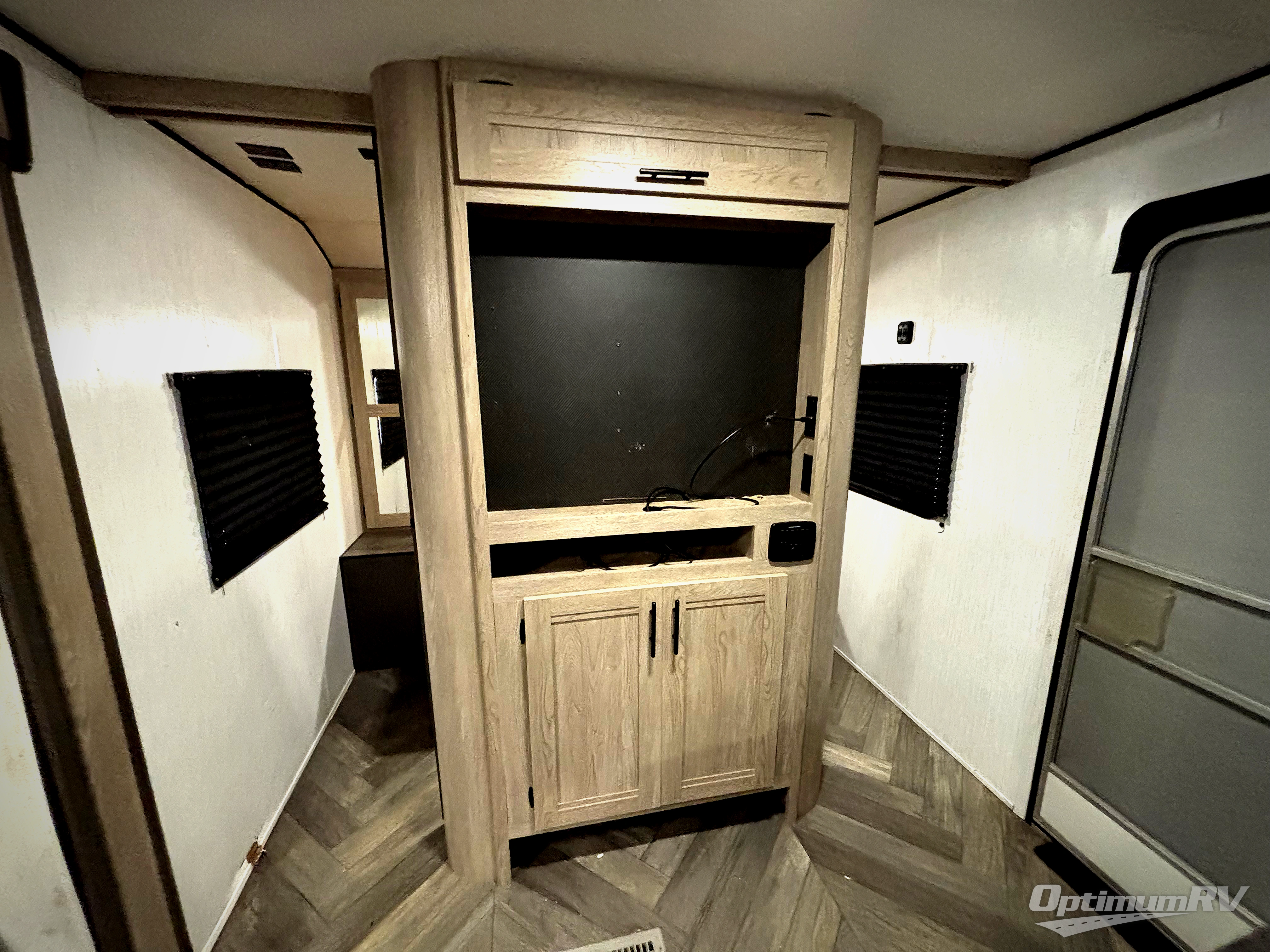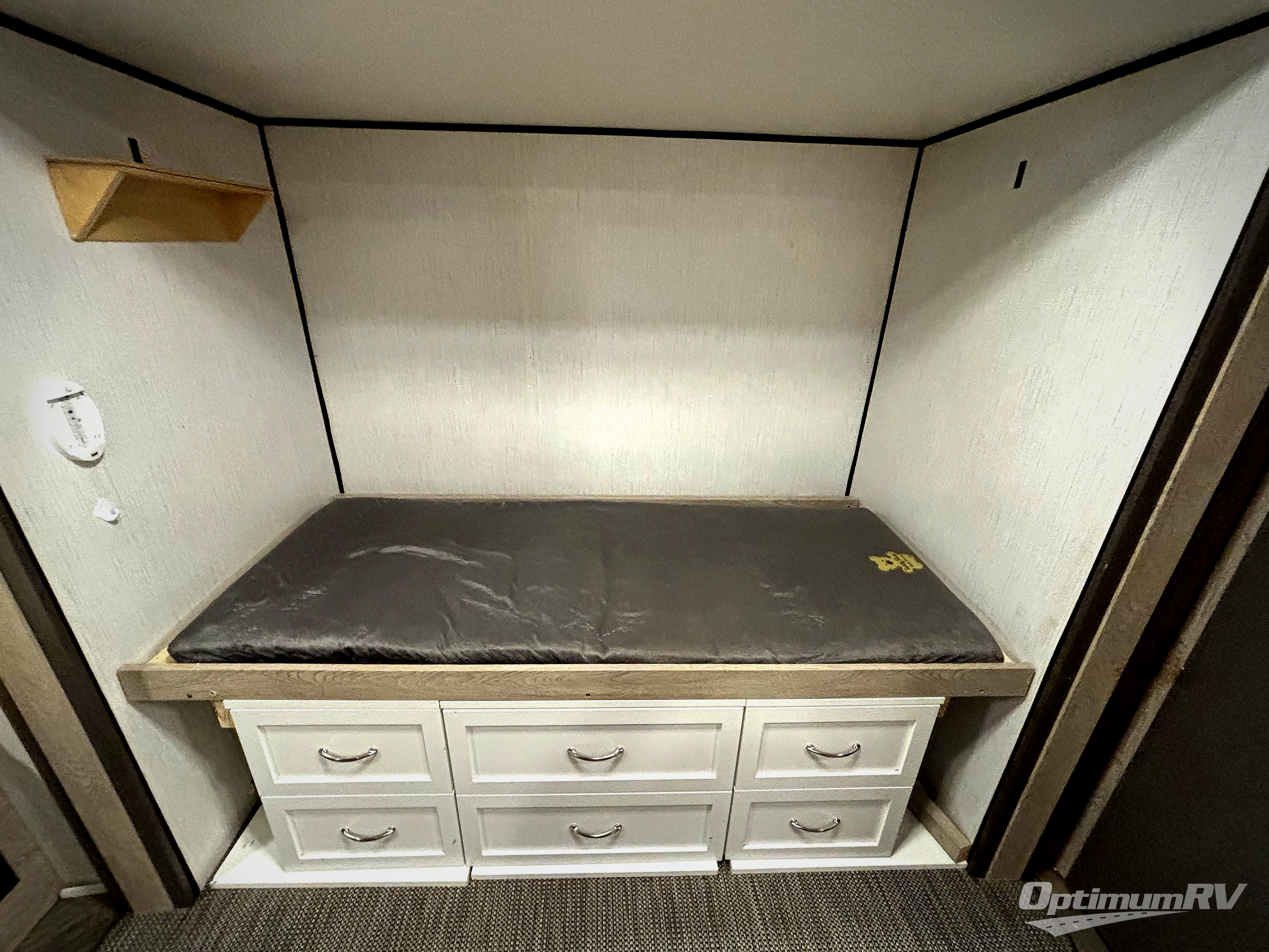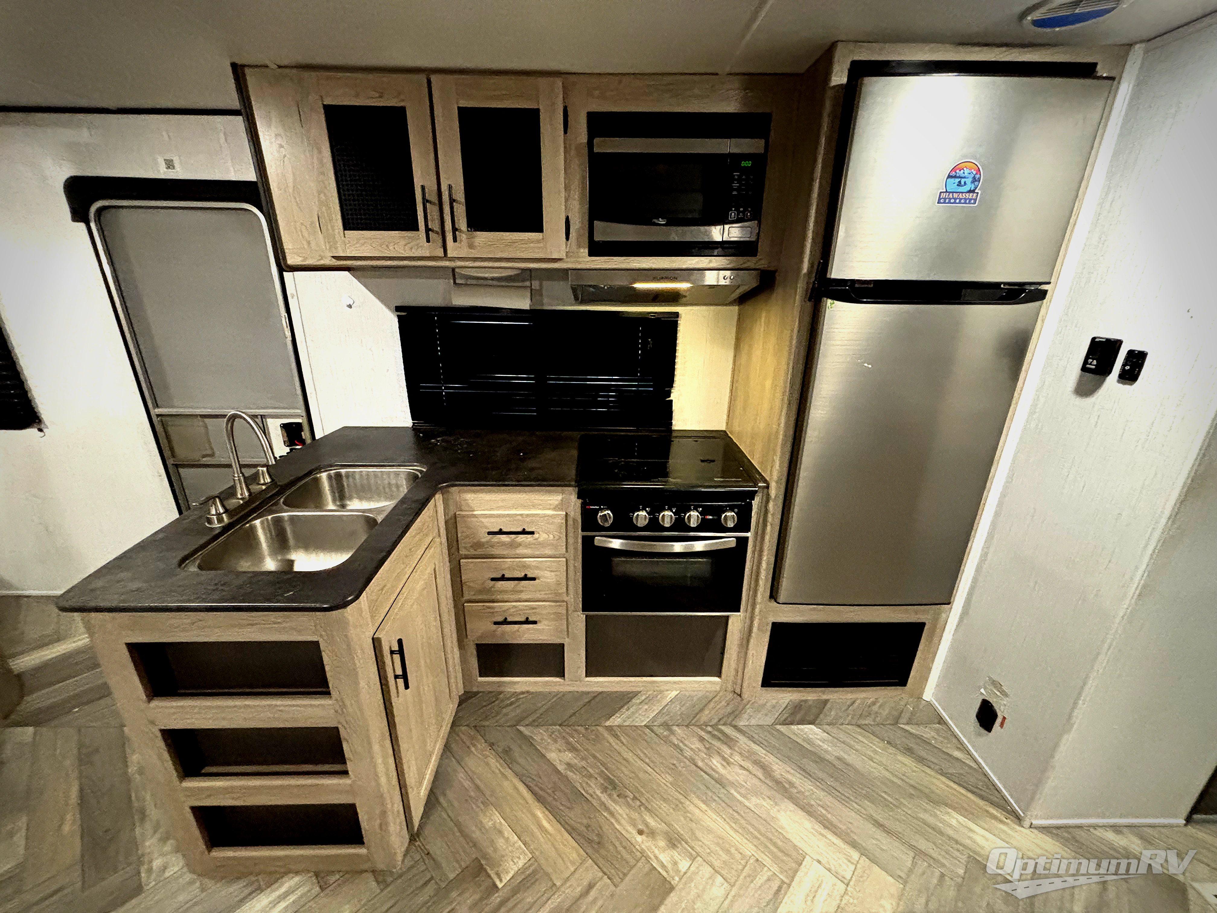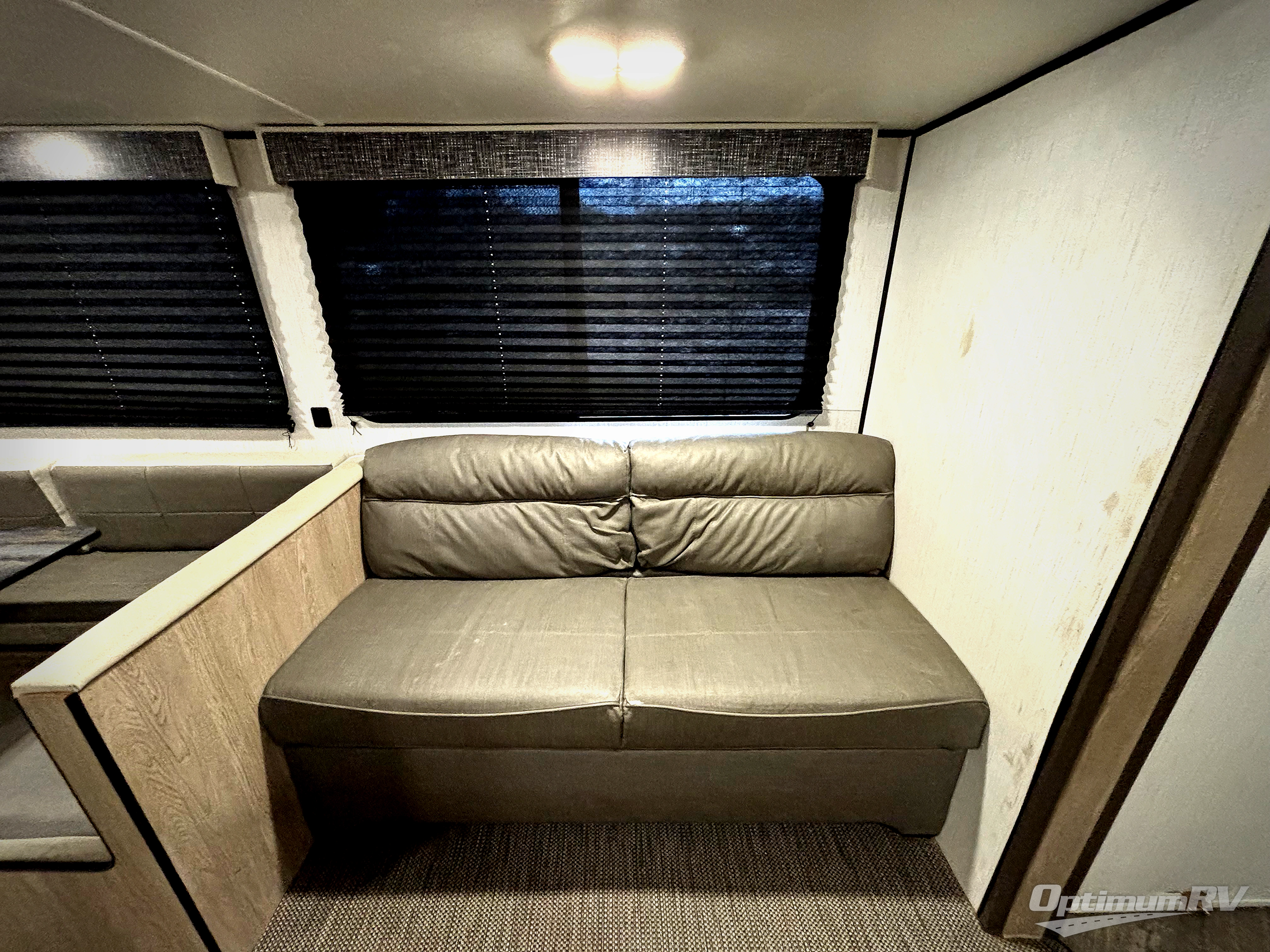 You can't go wrong with this double slide travel trailer in tow! The chef of your group can prepare lunch on the outdoor kitchen with a griddle before you all head off on a trail. The full bath includes its own exterior entry door for convenience, and you'll find a second entry door leading into the main living area. The bunkhouse includes a slide out for more space, three bunks, plus game chairs below one bunk the little ones are sure to love. You'll find a sofa and U-shaped dinette within the living area, and all the kitchen appliances needed to prepare at-home meals. This model also includes a front private bedroom with a queen bed for all-around comfort!