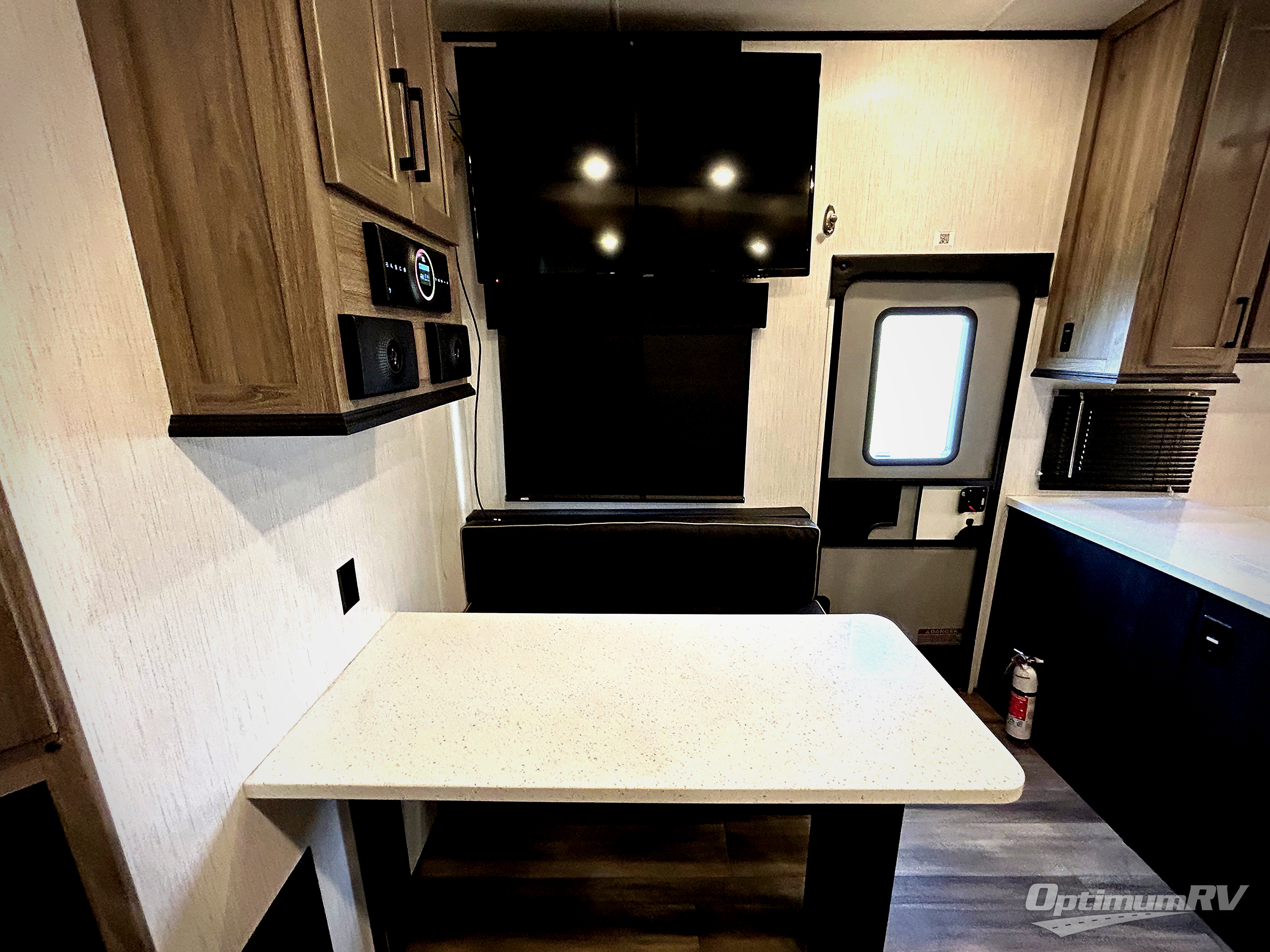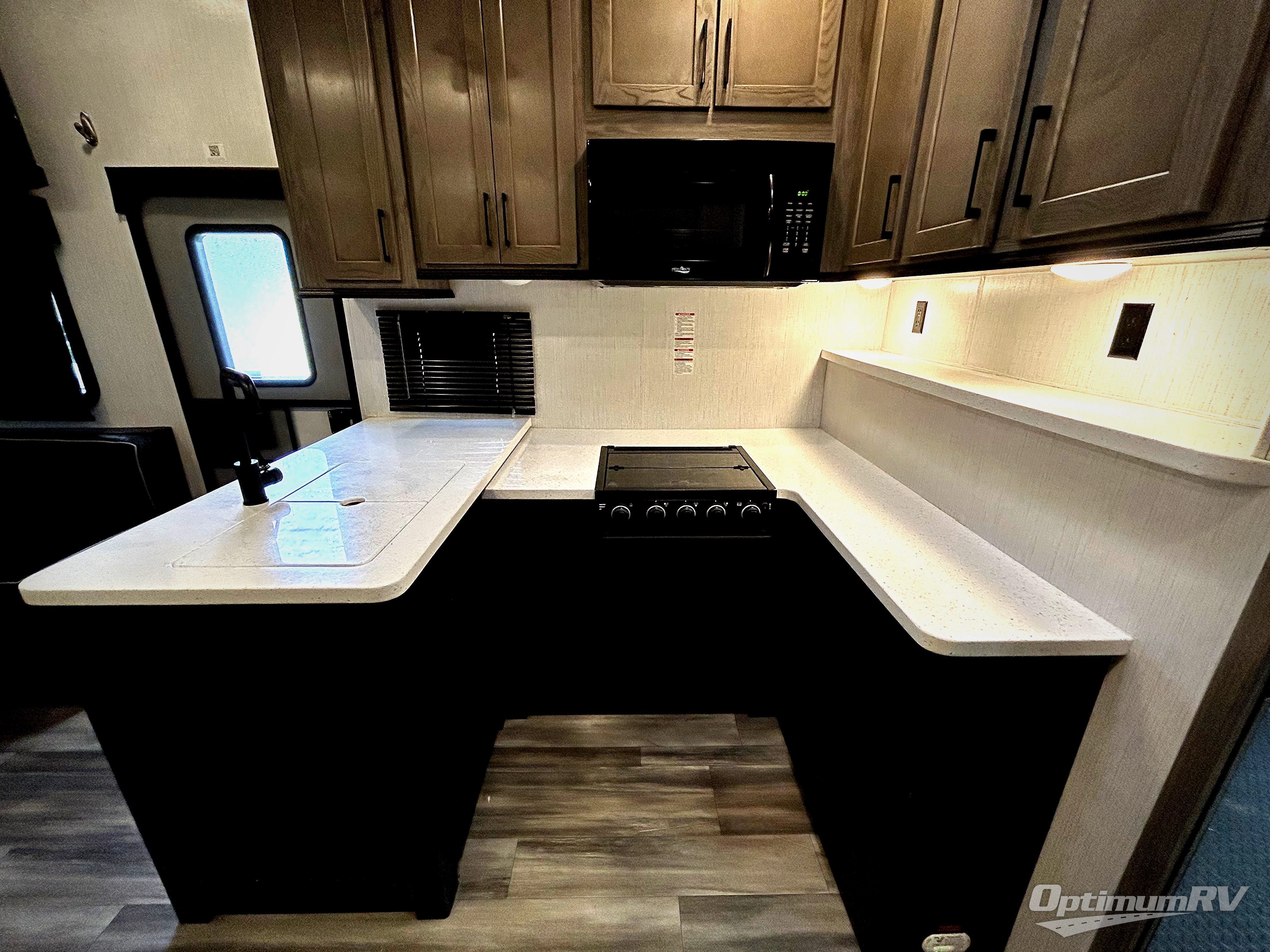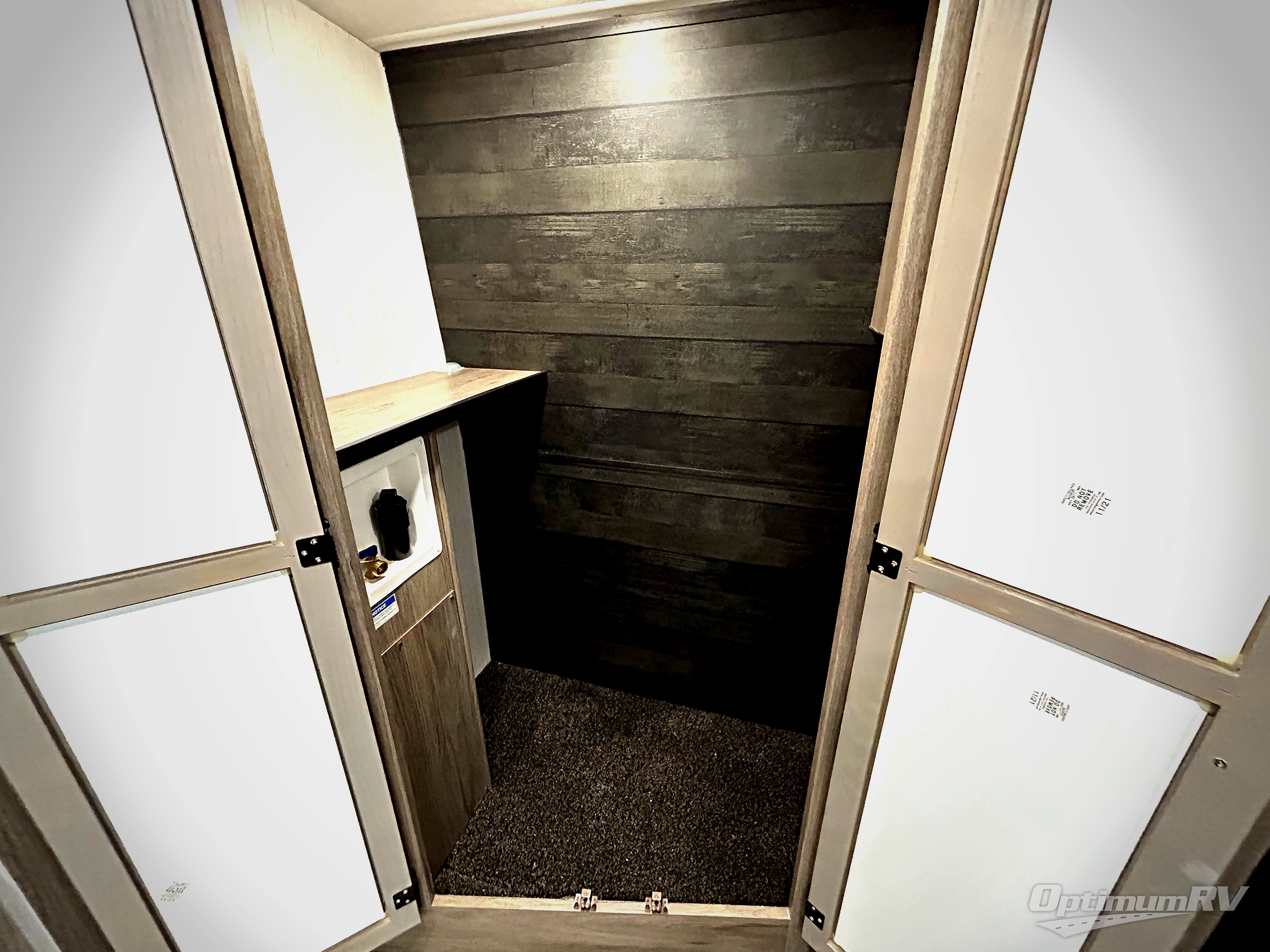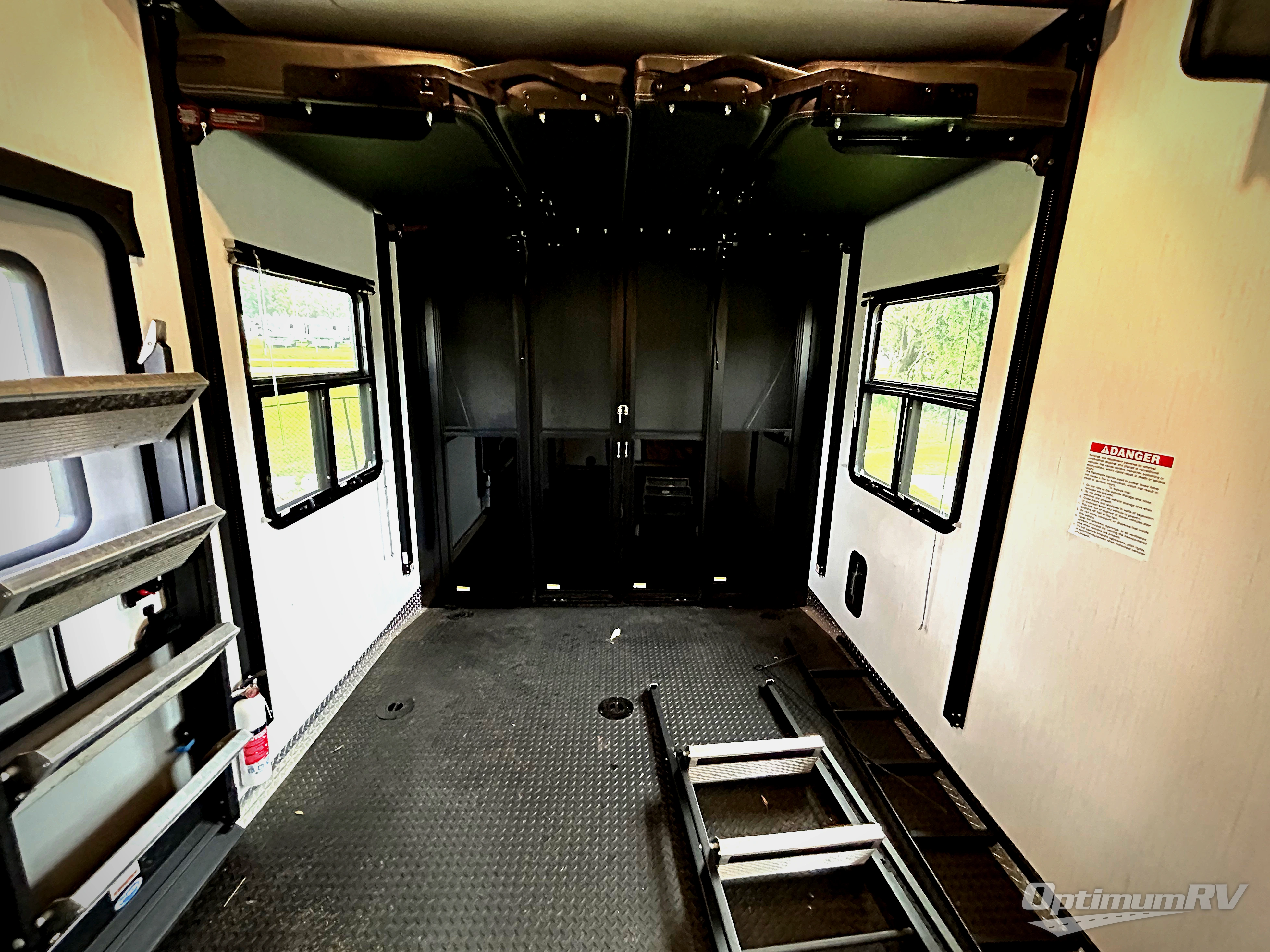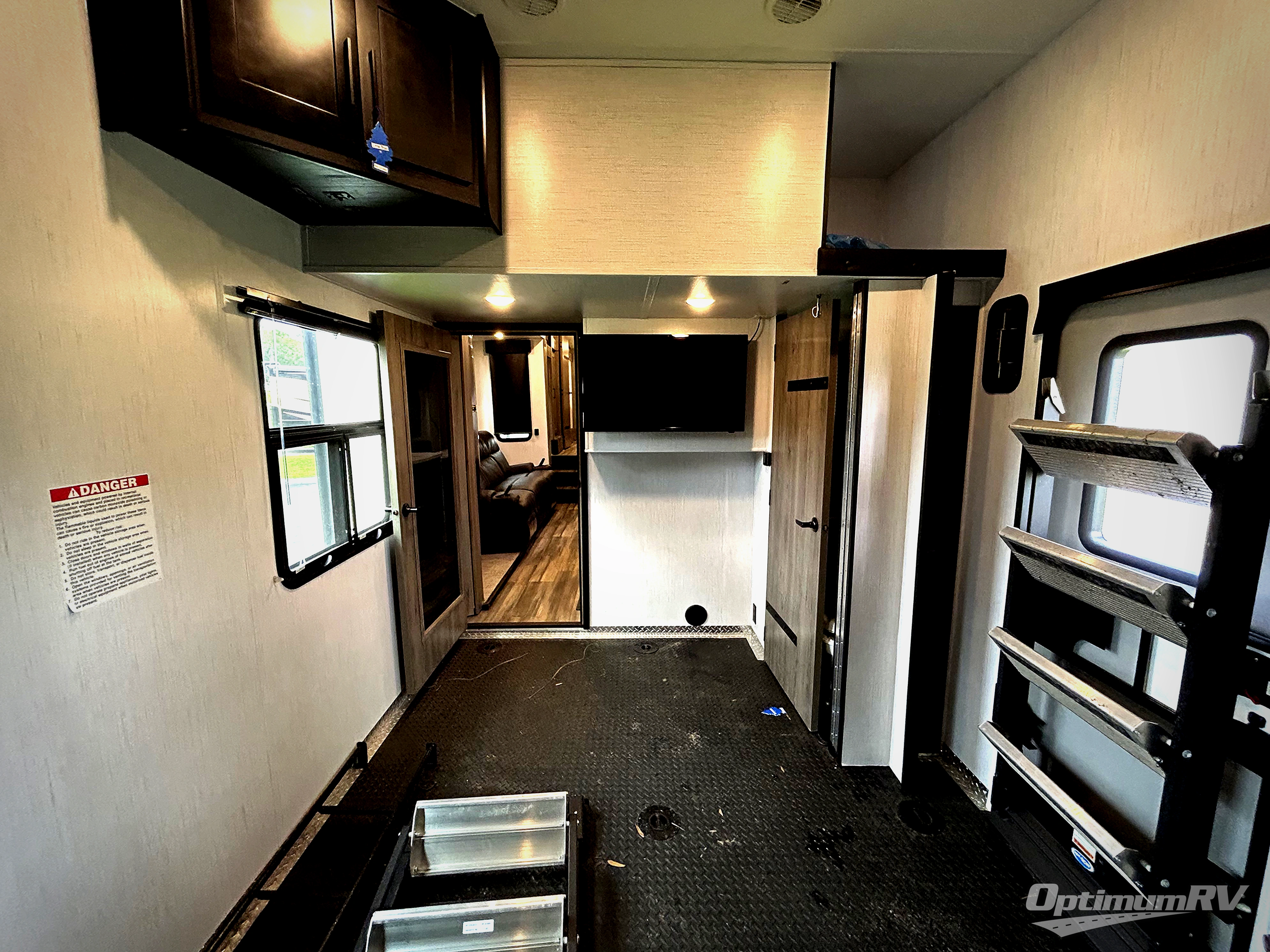 This toy hauler garage offers a folding wall, a half bath, a side man door and a space for 13' of cargo such as a side-by-side, bicycles or motorcycles. After loading up the ramp door, secure your toys to the tie downs and head to the trails. Once at your site, unload and convert this area into a staging space or even a bedroom/living area if you add the electric queen bed-split bench seat/bed option. And you will stay prepared thanks to the 30 gallon fuel station with a second 30 gallon aux tank along the exterior. Inside the main living and kitchen area you will love the U-shaped kitchen with full amenities, the bench seating at the dinette, and the slide out with an 18 cu. ft. refrigerator and a three-person sofa. The full bathroom is up front just before you reach the private bedroom where you will sleep like a king, and enjoy lots of storage along the front wall and within a slide that stretches into the hallway closet.