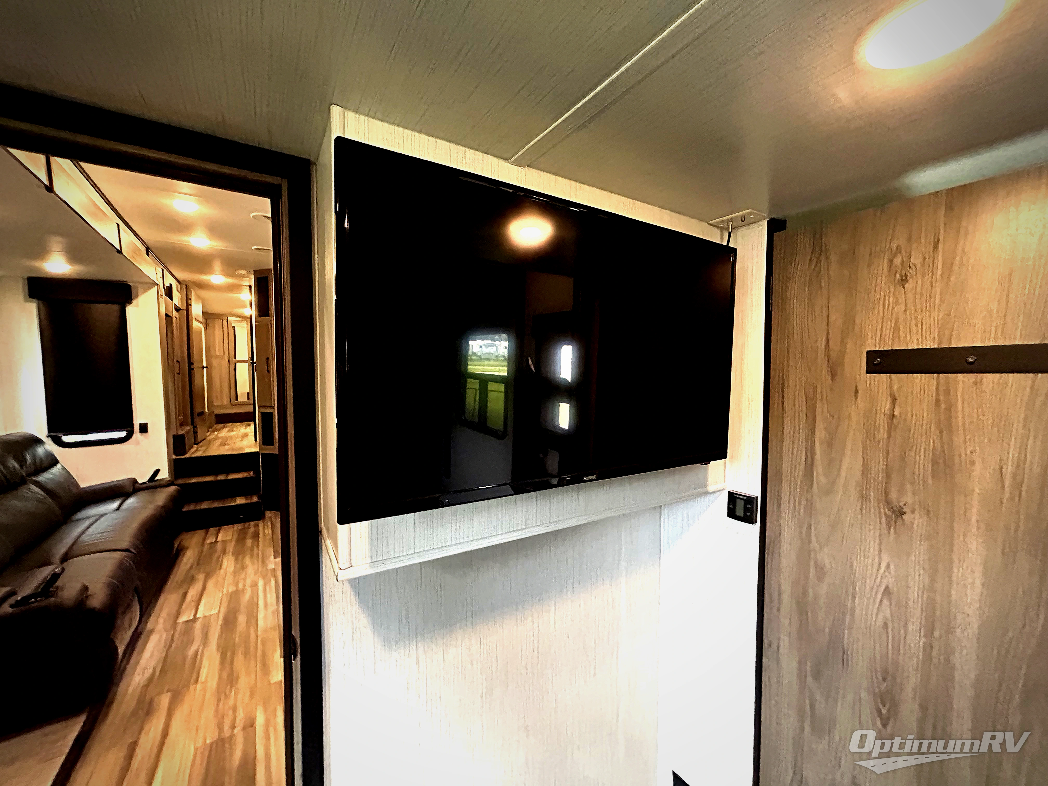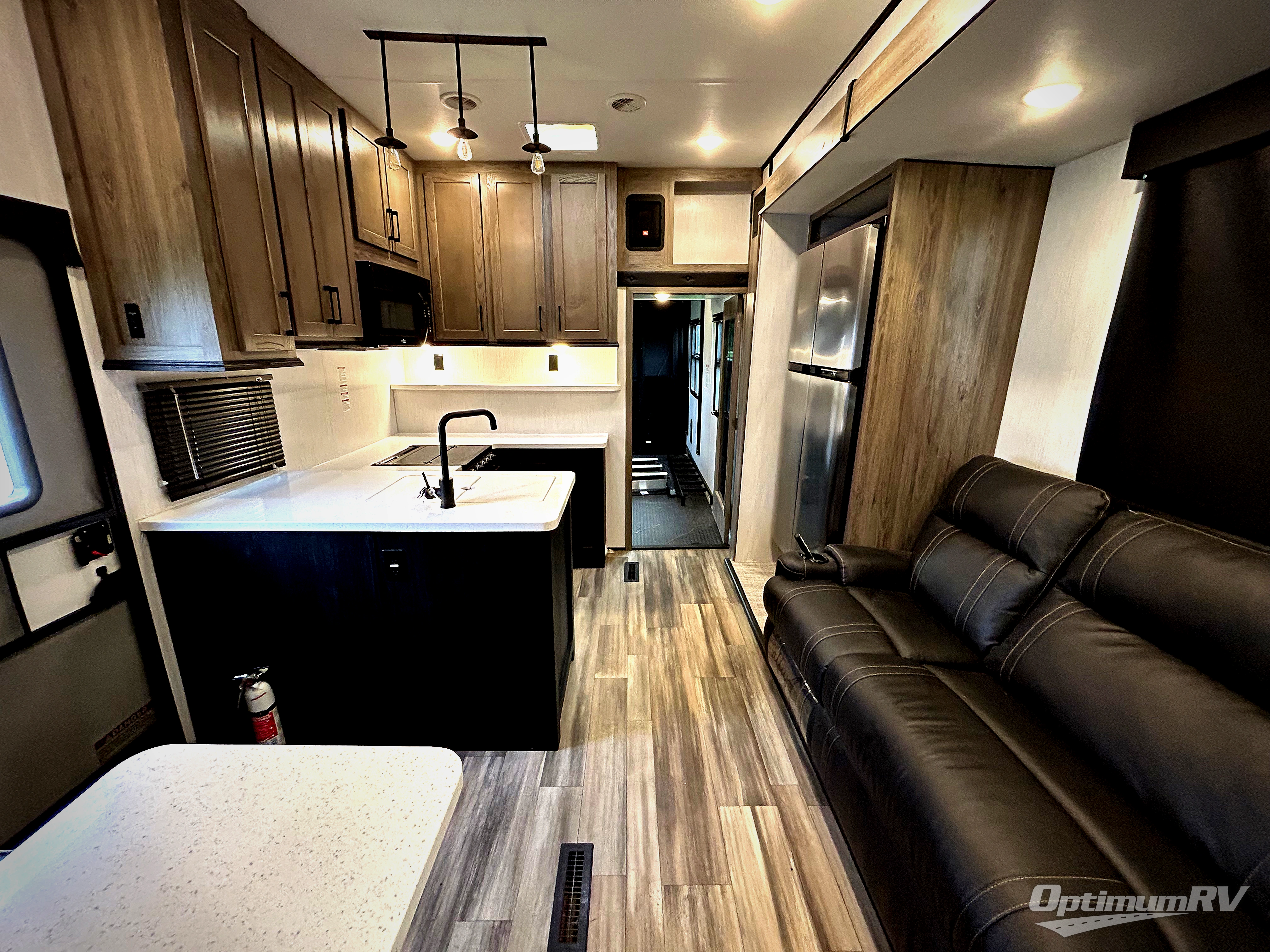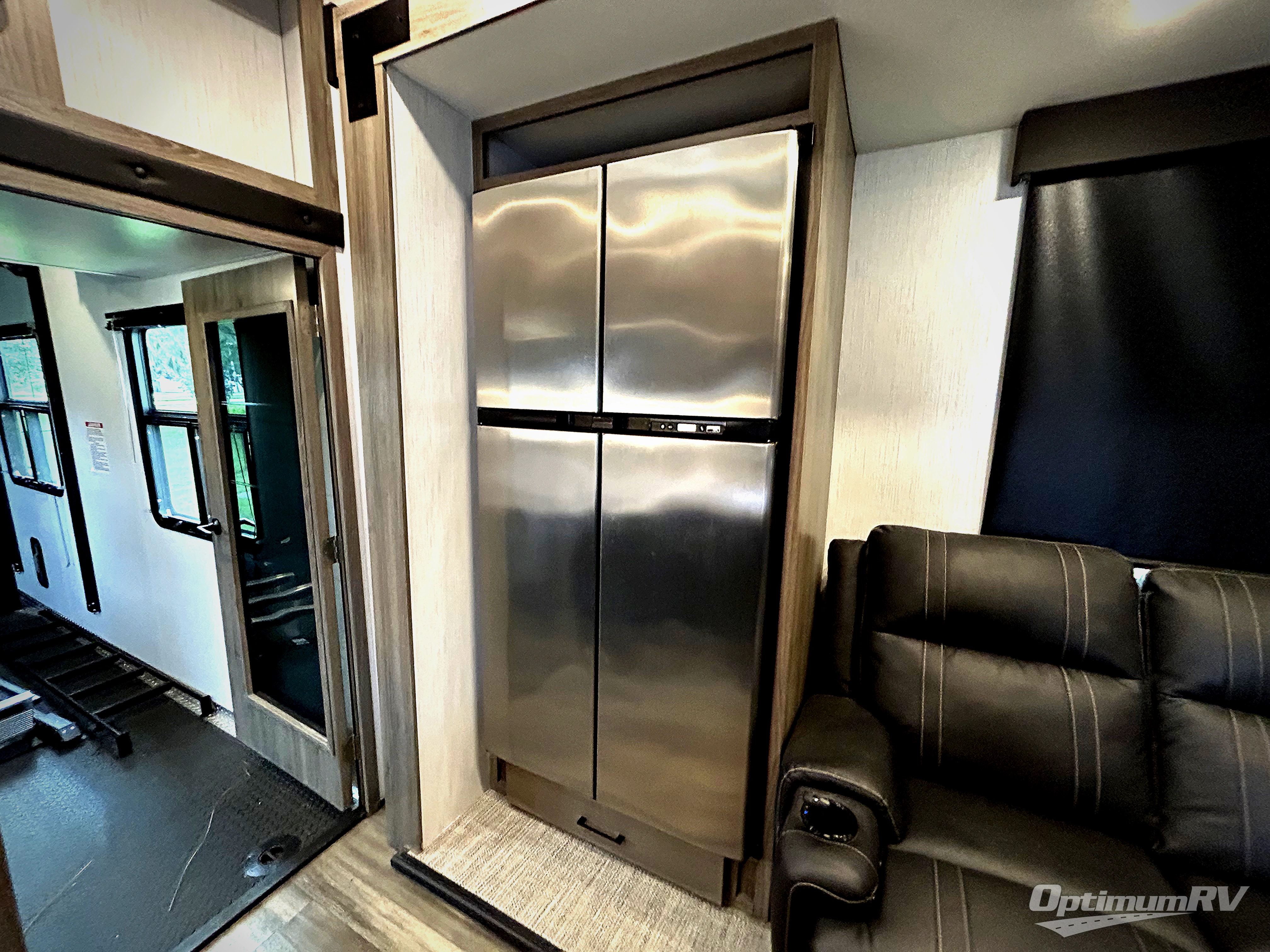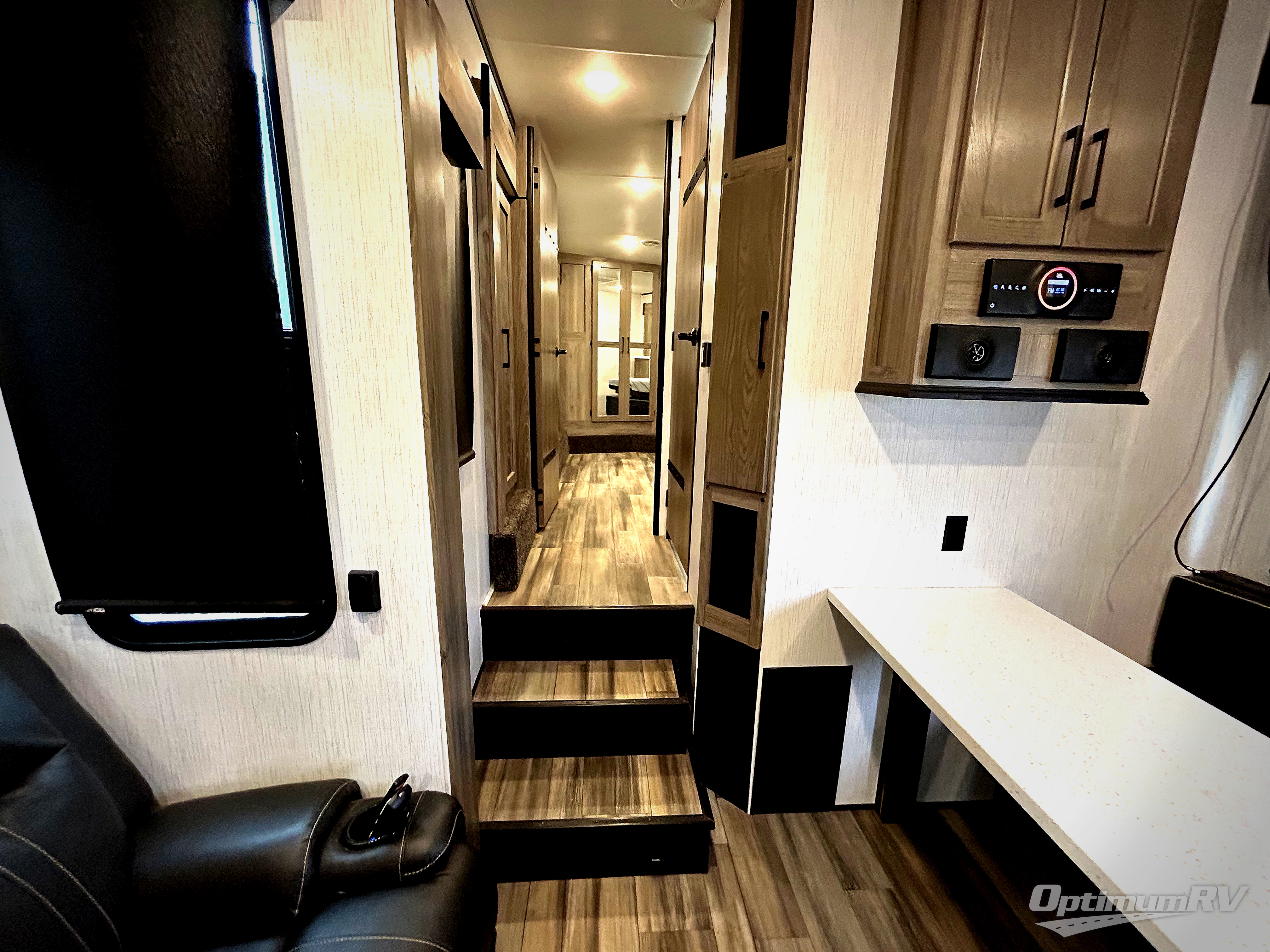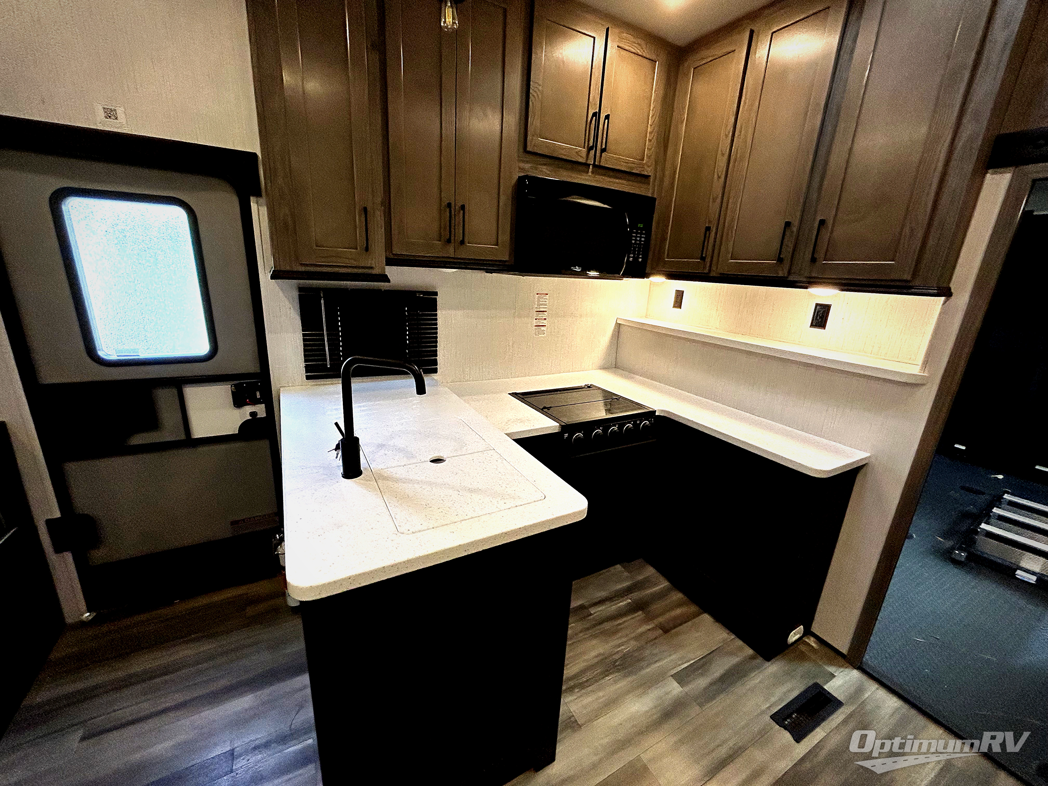 This toy hauler garage offers a folding wall, a half bath, a side man door and a space for 13' of cargo such as a side-by-side, bicycles or motorcycles. After loading up the ramp door, secure your toys to the tie downs and head to the trails. Once at your site, unload and convert this area into a staging space or even a bedroom/living area if you add the electric queen bed-split bench seat/bed option. And you will stay prepared thanks to the 30 gallon fuel station with a second 30 gallon aux tank along the exterior. Inside the main living and kitchen area you will love the U-shaped kitchen with full amenities, the bench seating at the dinette, and the slide out with an 18 cu. ft. refrigerator and a three-person sofa. The full bathroom is up front just before you reach the private bedroom where you will sleep like a king, and enjoy lots of storage along the front wall and within a slide that stretches into the hallway closet.