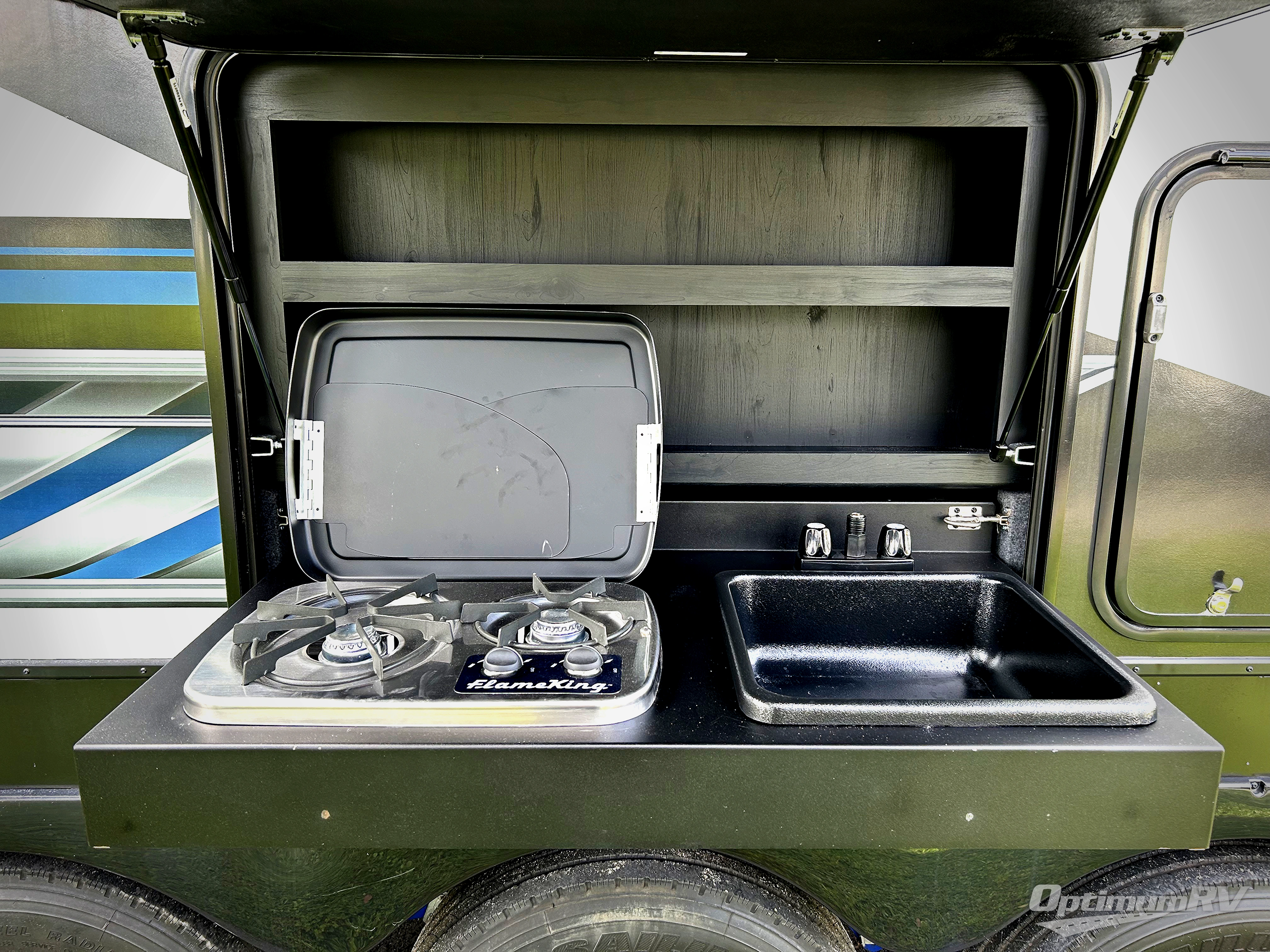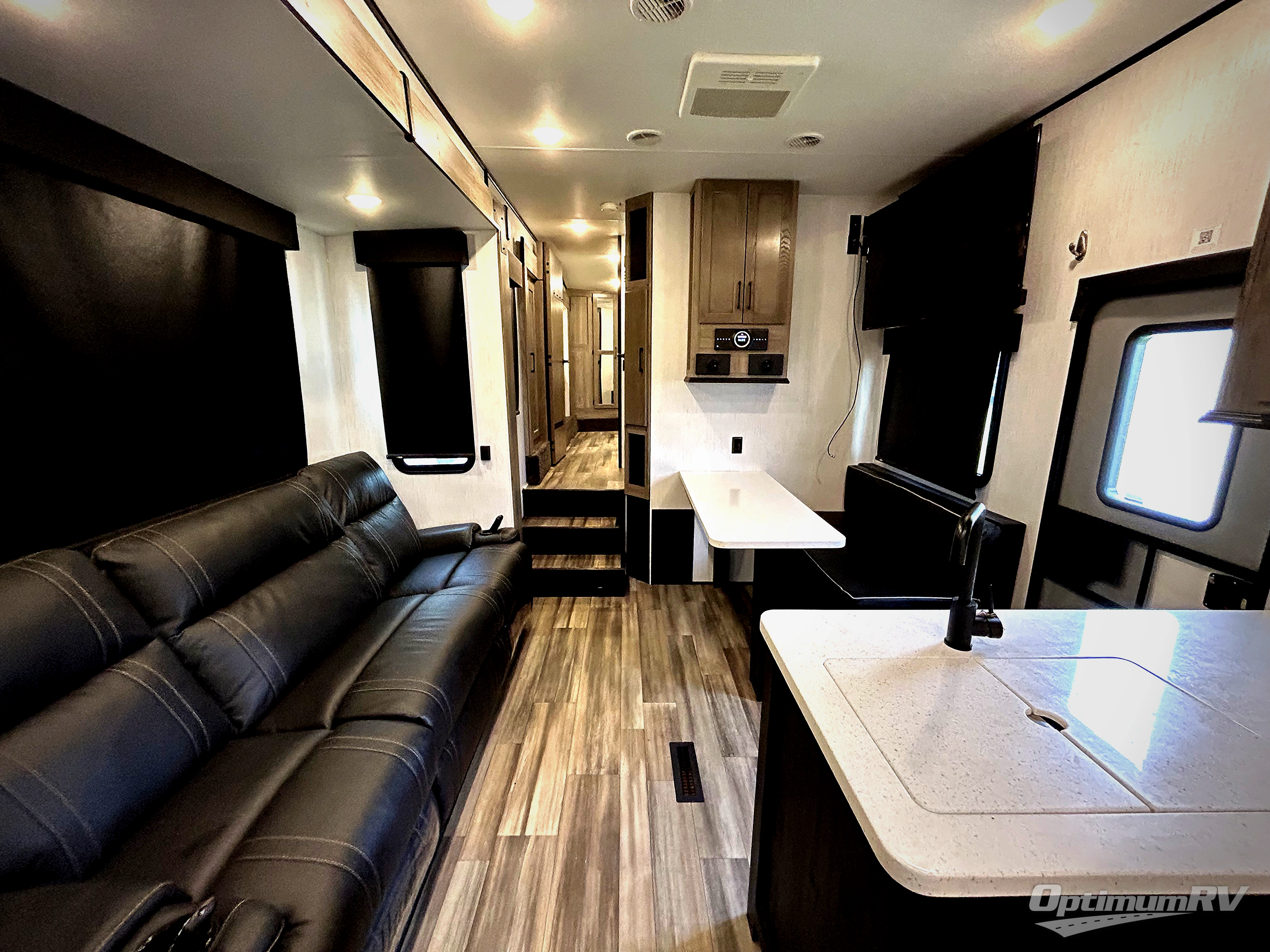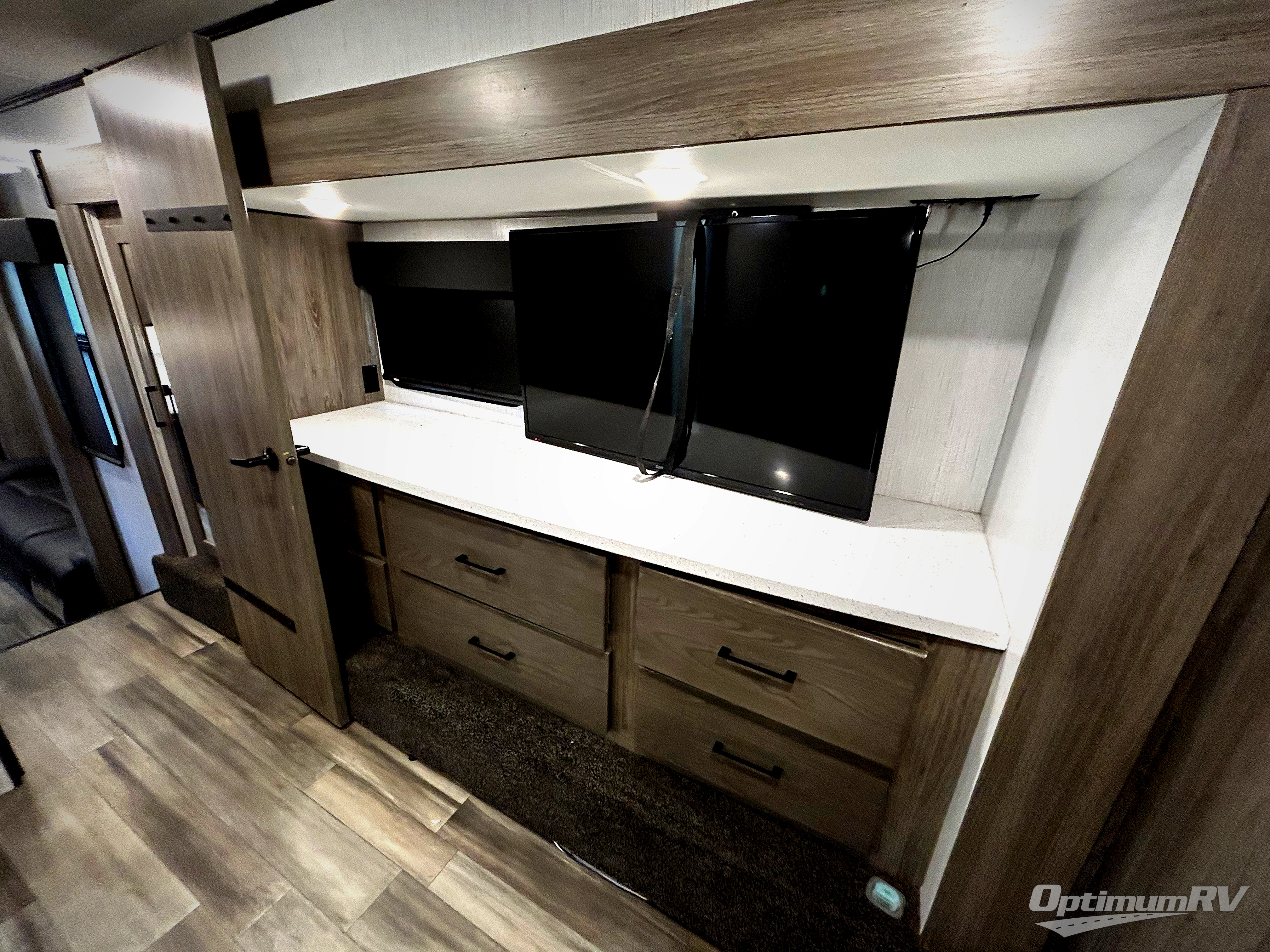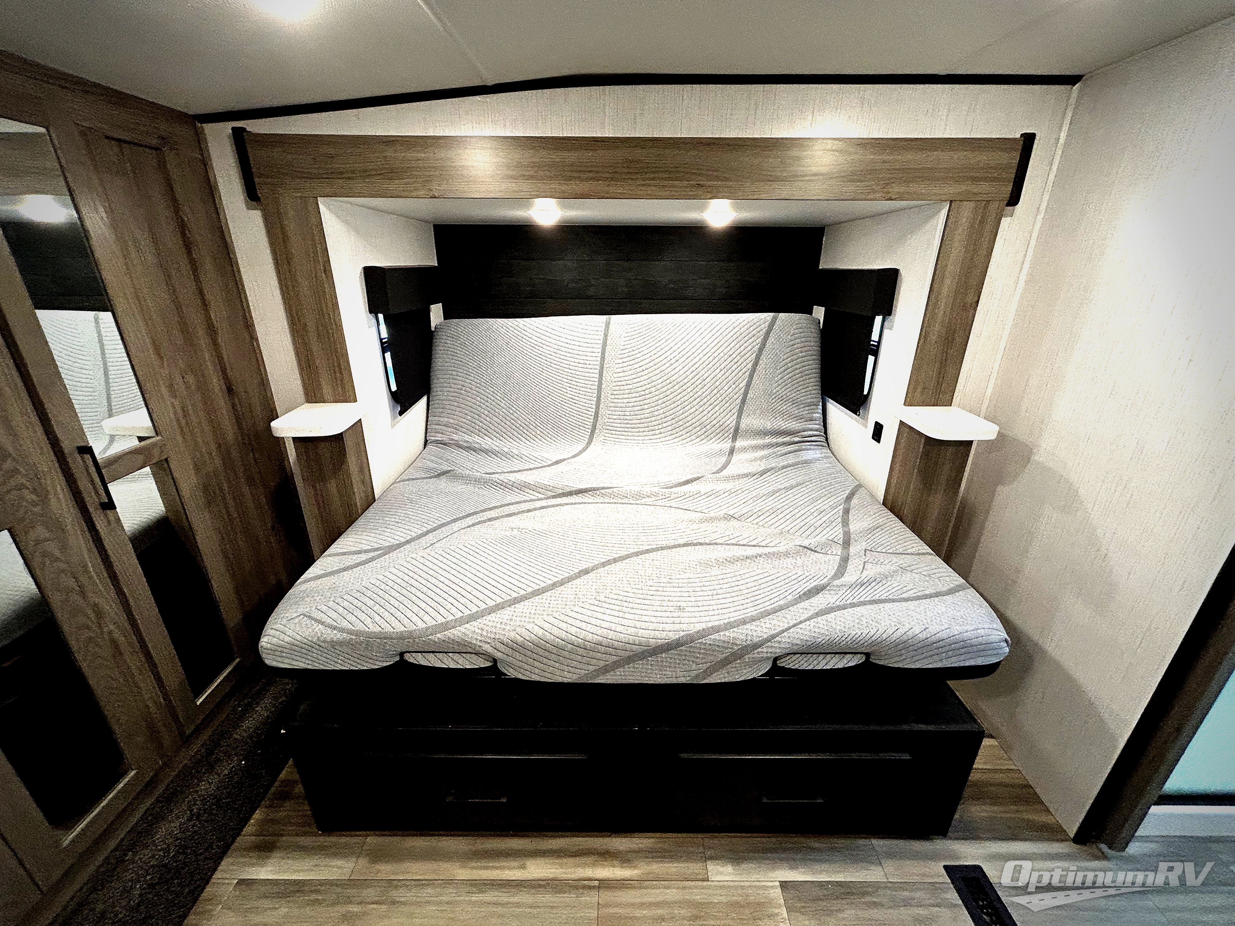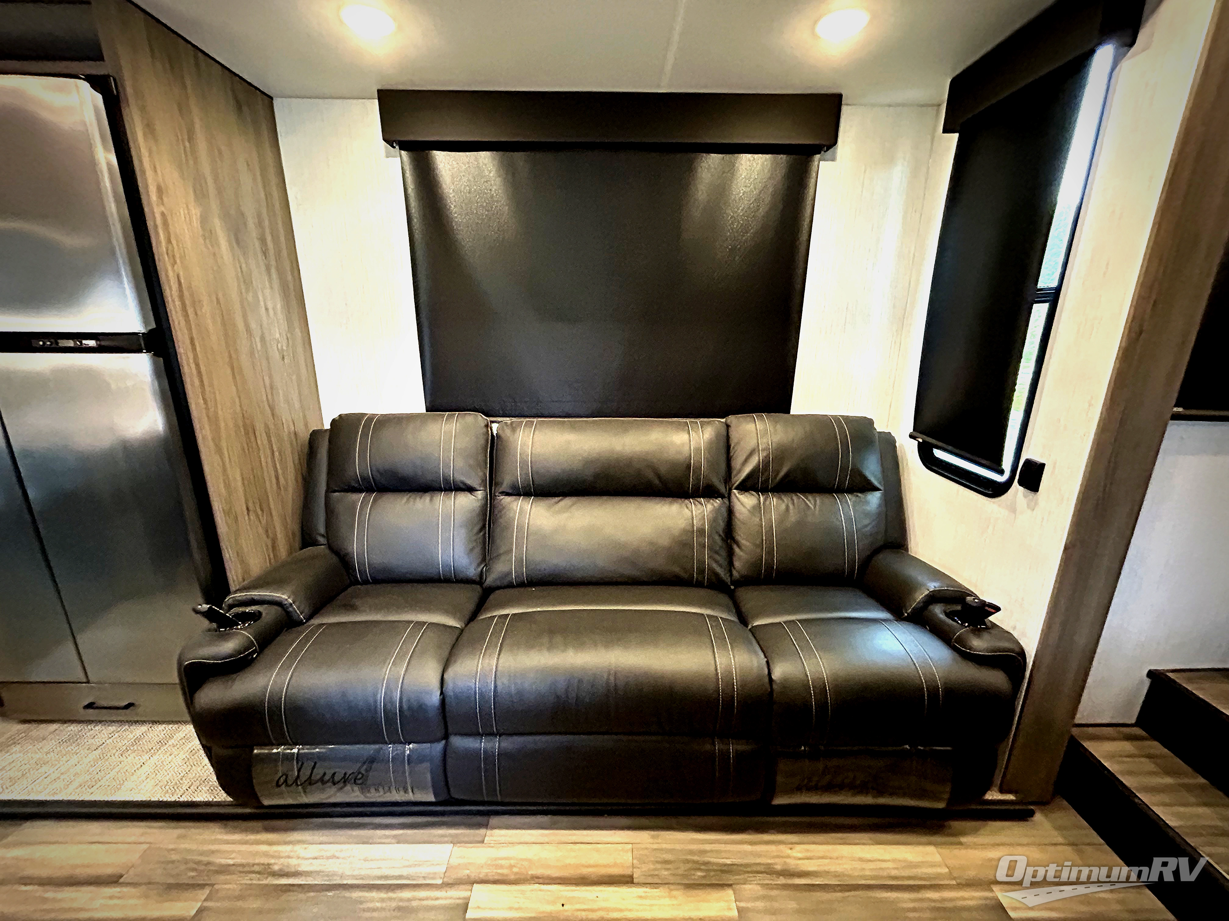 This toy hauler garage offers a folding wall, a half bath, a side man door and a space for 13' of cargo such as a side-by-side, bicycles or motorcycles. After loading up the ramp door, secure your toys to the tie downs and head to the trails. Once at your site, unload and convert this area into a staging space or even a bedroom/living area if you add the electric queen bed-split bench seat/bed option. And you will stay prepared thanks to the 30 gallon fuel station with a second 30 gallon aux tank along the exterior. Inside the main living and kitchen area you will love the U-shaped kitchen with full amenities, the bench seating at the dinette, and the slide out with an 18 cu. ft. refrigerator and a three-person sofa. The full bathroom is up front just before you reach the private bedroom where you will sleep like a king, and enjoy lots of storage along the front wall and within a slide that stretches into the hallway closet.