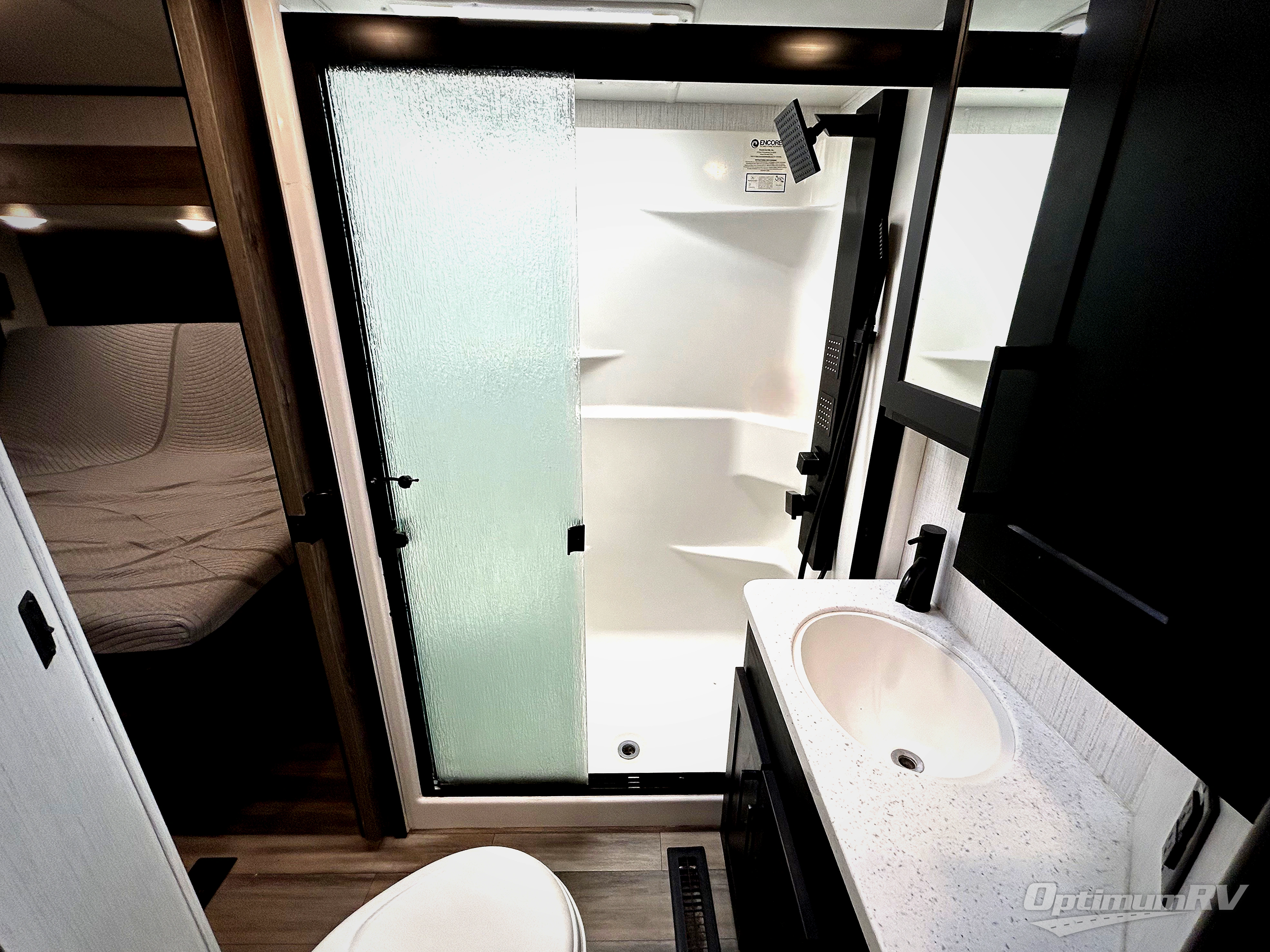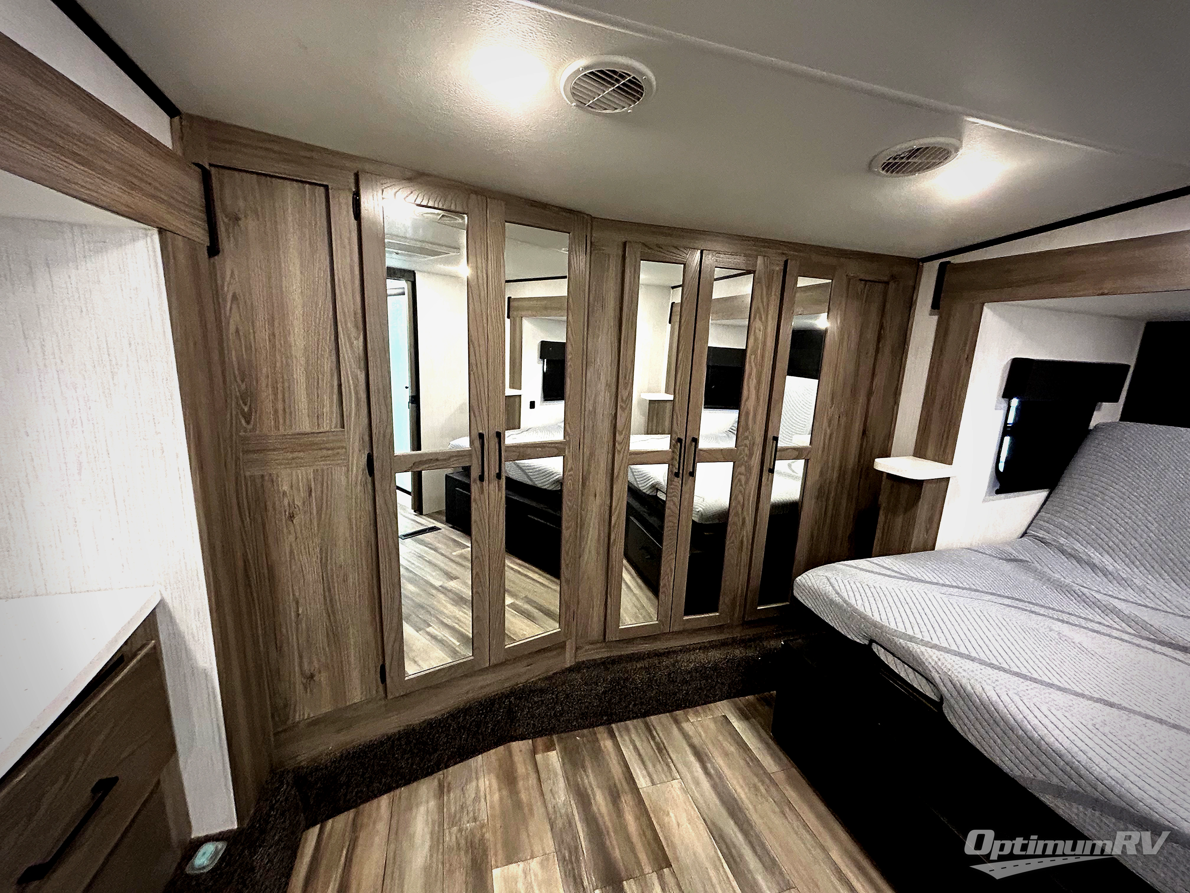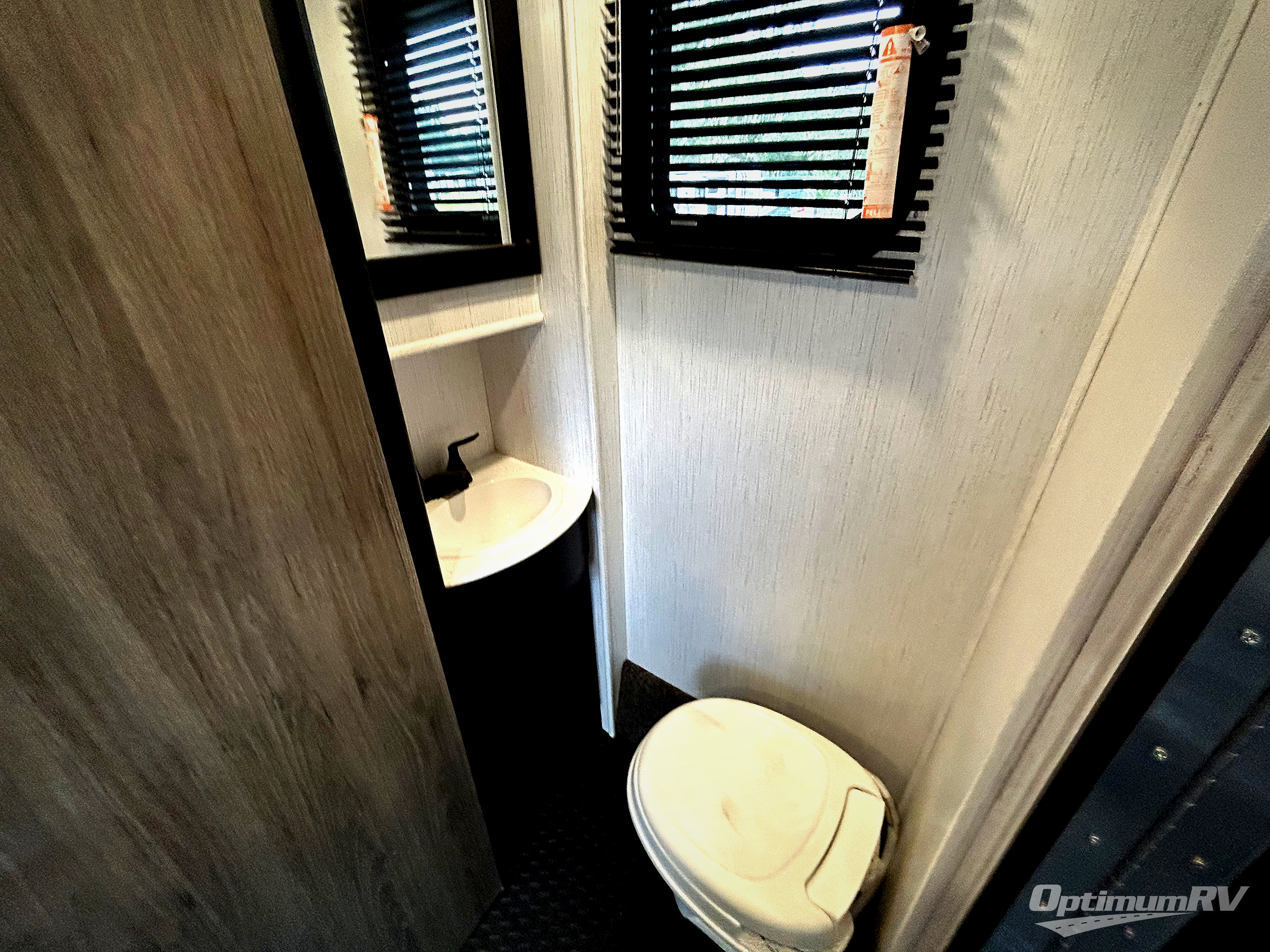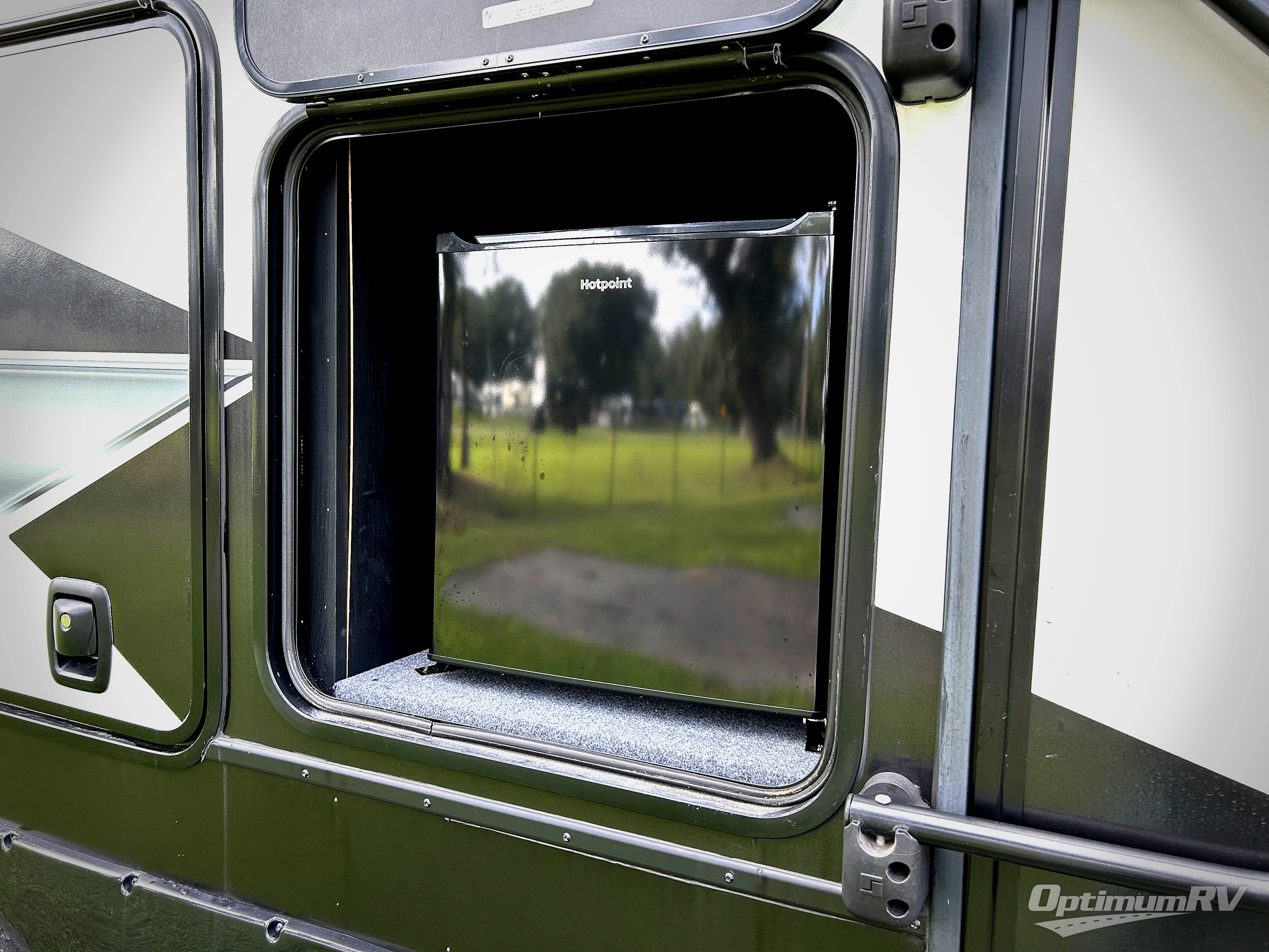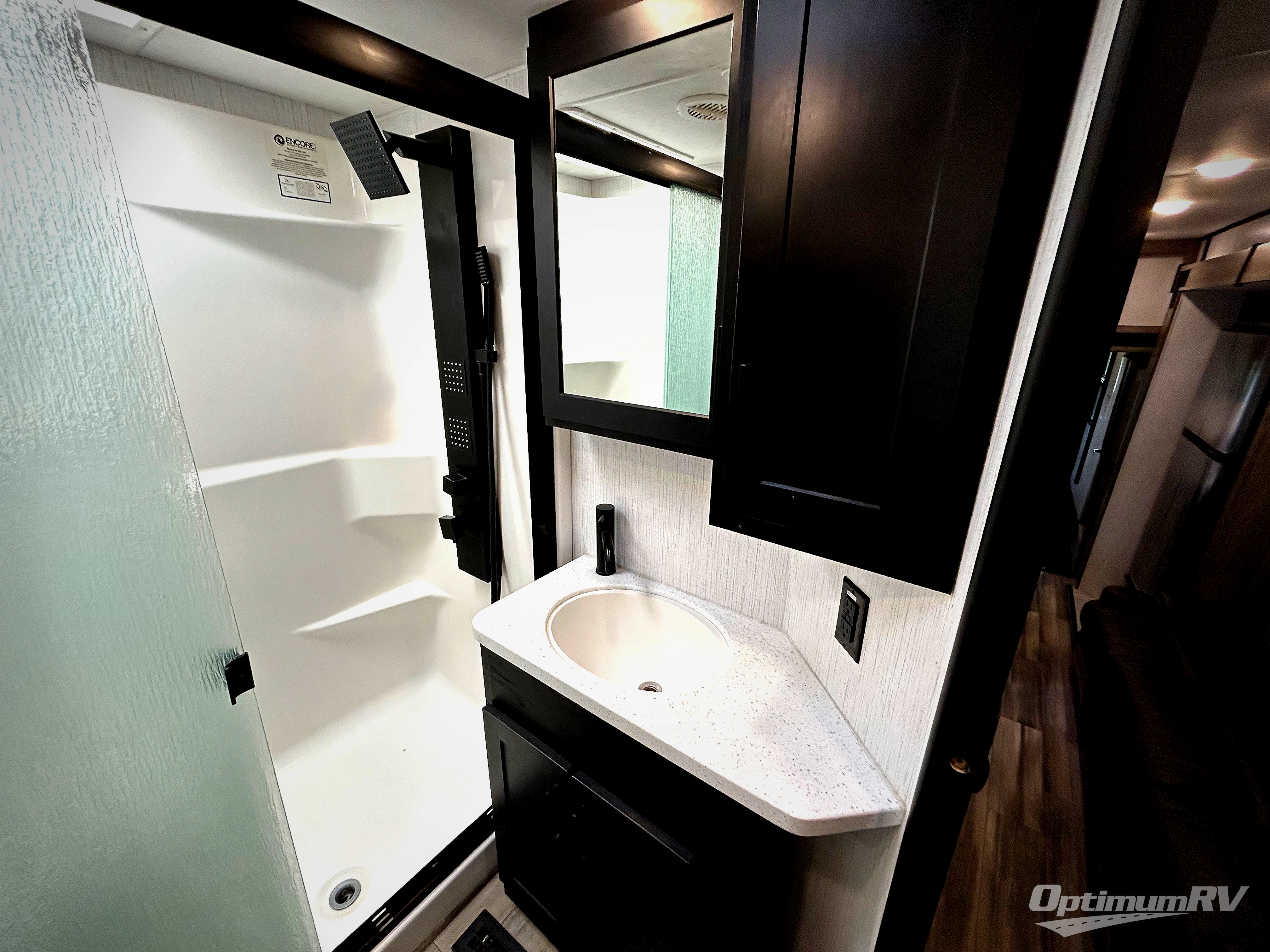 This toy hauler garage offers a folding wall, a half bath, a side man door and a space for 13' of cargo such as a side-by-side, bicycles or motorcycles. After loading up the ramp door, secure your toys to the tie downs and head to the trails. Once at your site, unload and convert this area into a staging space or even a bedroom/living area if you add the electric queen bed-split bench seat/bed option. And you will stay prepared thanks to the 30 gallon fuel station with a second 30 gallon aux tank along the exterior. Inside the main living and kitchen area you will love the U-shaped kitchen with full amenities, the bench seating at the dinette, and the slide out with an 18 cu. ft. refrigerator and a three-person sofa. The full bathroom is up front just before you reach the private bedroom where you will sleep like a king, and enjoy lots of storage along the front wall and within a slide that stretches into the hallway closet.