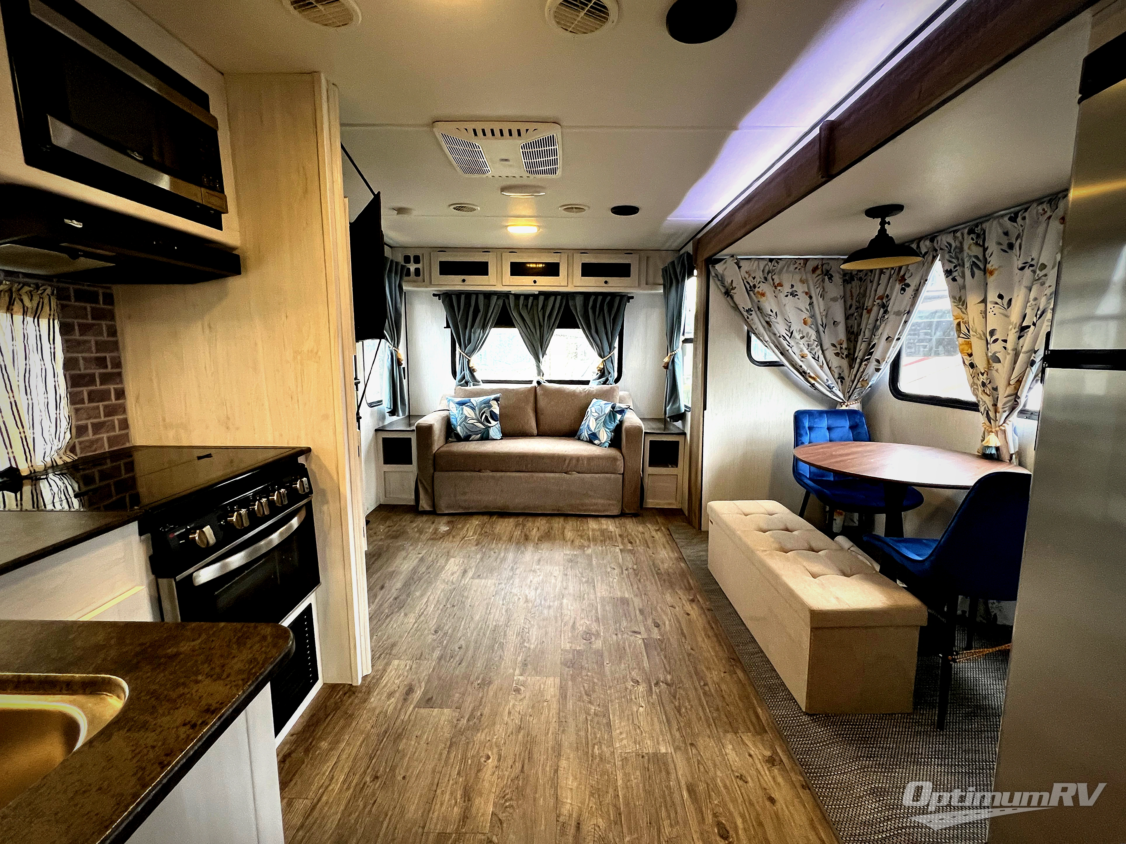 With dual entry doors, you will experience a smooth flow of traffic in and out of this travel trailer! One of the entrances even leads directly into the front master suite with a queen bed that has under-bed storage and wireless cell charging stations, plus an entrance into the walk-through bathroom. Prepare your best home cooked meals with the three burner cooktop and 10 cu. ft. stainless steel refrigerator then enjoy them at the U-shaped dinette slide. Relax each evening on the rear sofa across from the optional LED HDTV if you chose to add it or head outside to relax underneath the 20' power awning with LED light strip to highlight the good times!