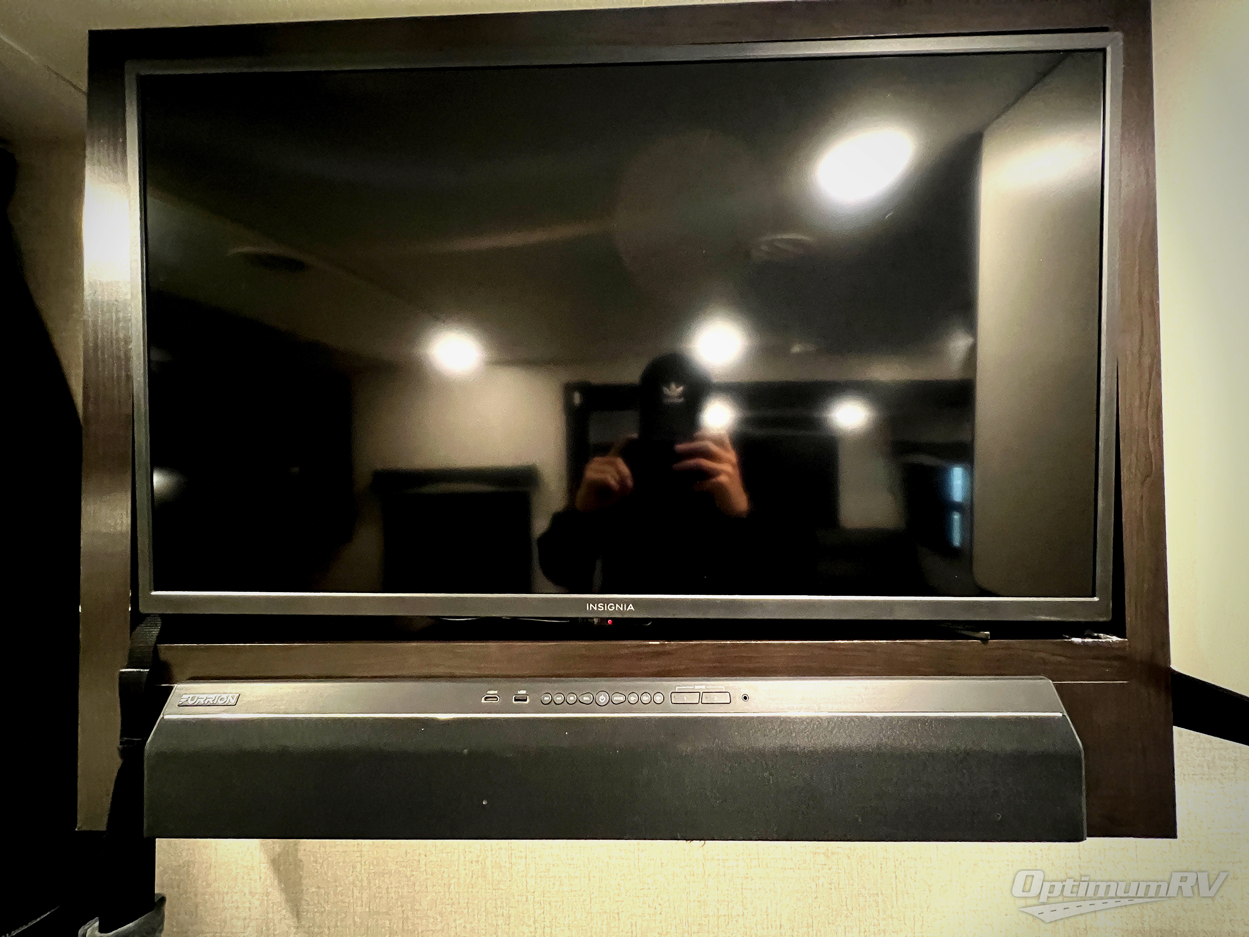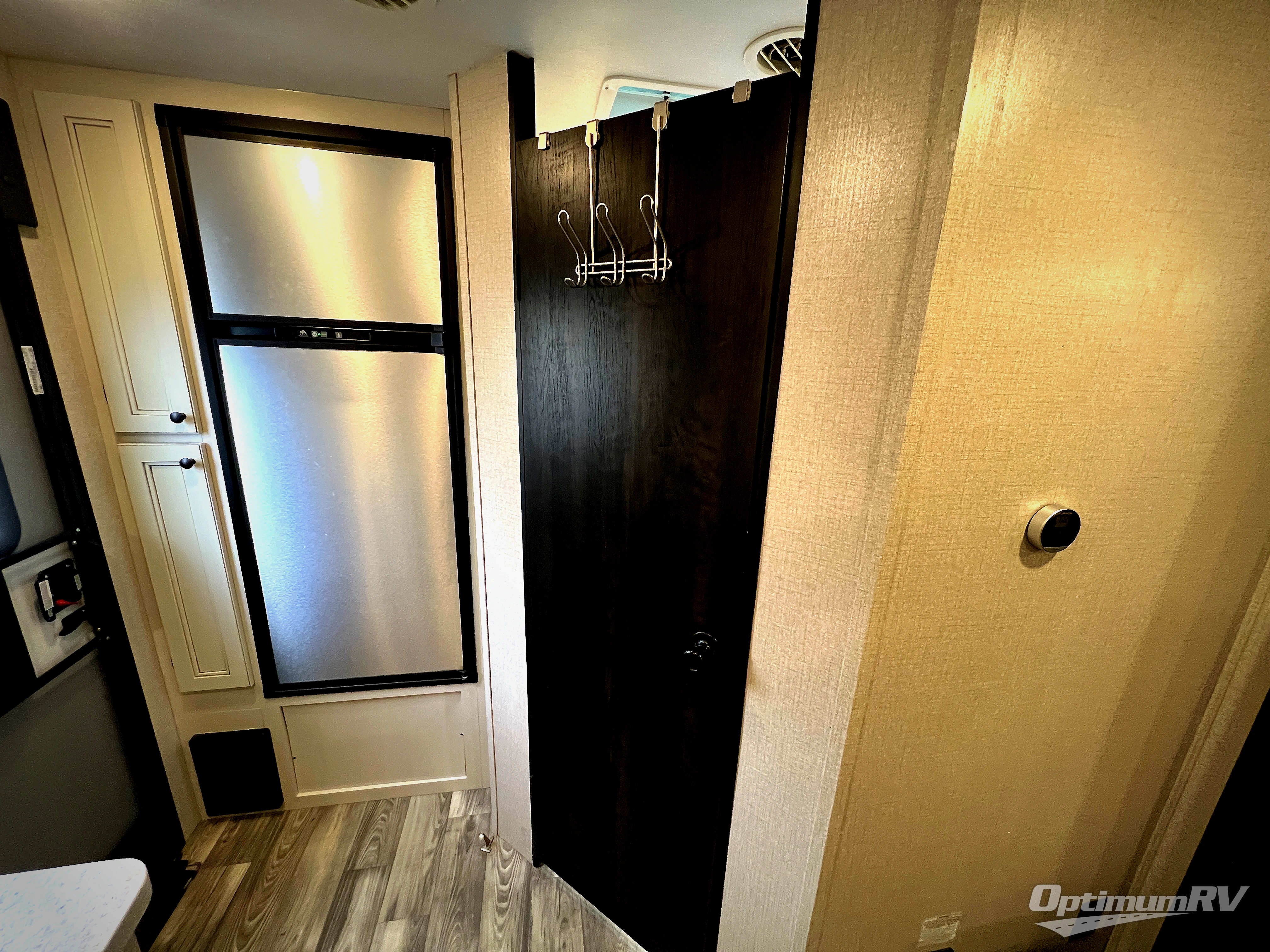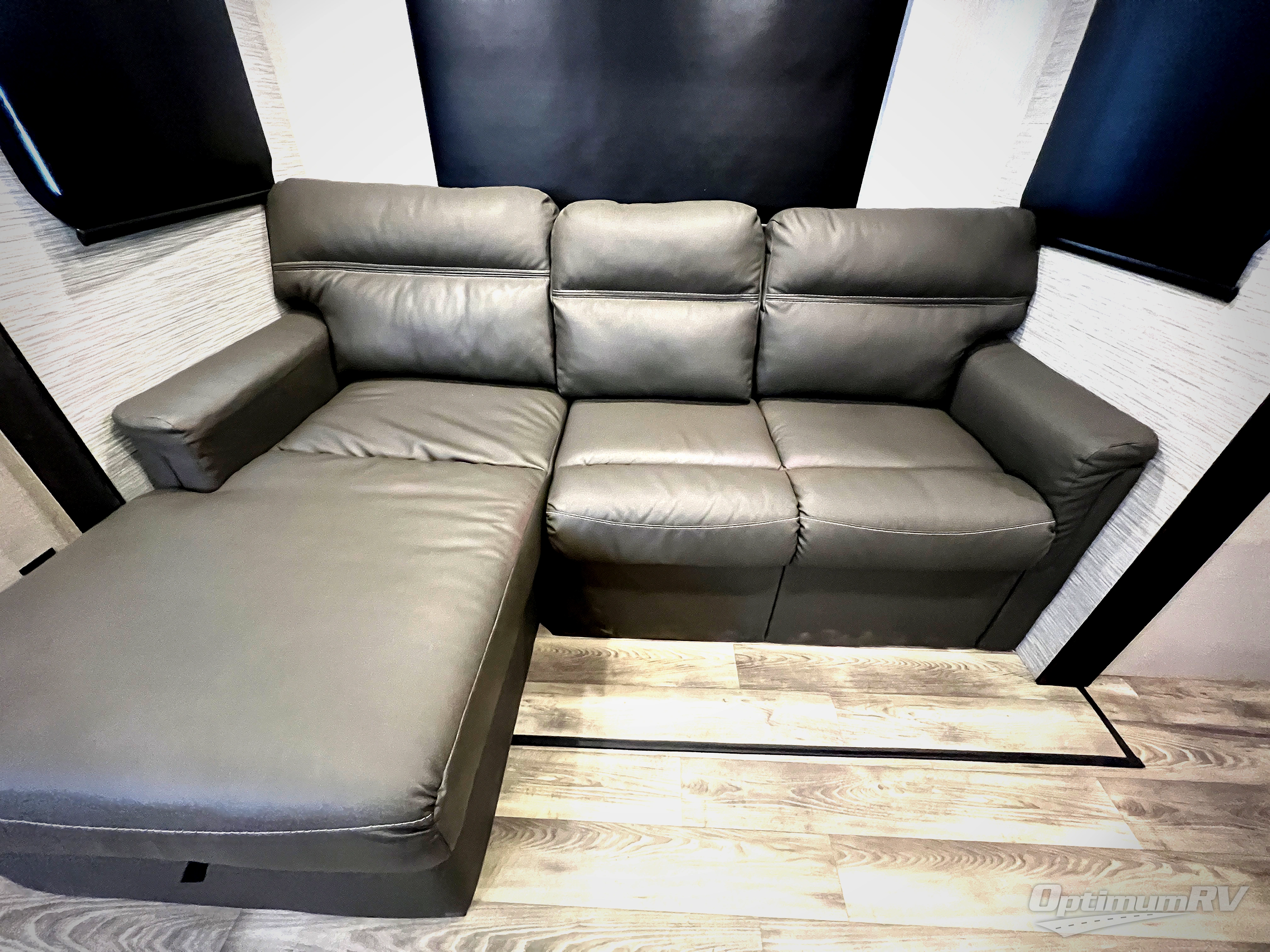 This travel trailer is the perfect couple's getaway! It features a front queen bed with wardrobes on either side for your clothes, a laundry chute on one side, overhead cabinets, and a privacy curtain to draw at night. You can prepare your best meals with the three burner cooktop with a 17" oven, enjoy them at the L-sofa with table which is conveniently across from the entertainment center that has a LED HDTV, and store any leftovers in the 8 cu. ft. refrigerator. The rear corner bathroom has a radius shower to freshen up in each morning, a medicine cabinet to store your toiletries, and a linen closet to keep your towels close.