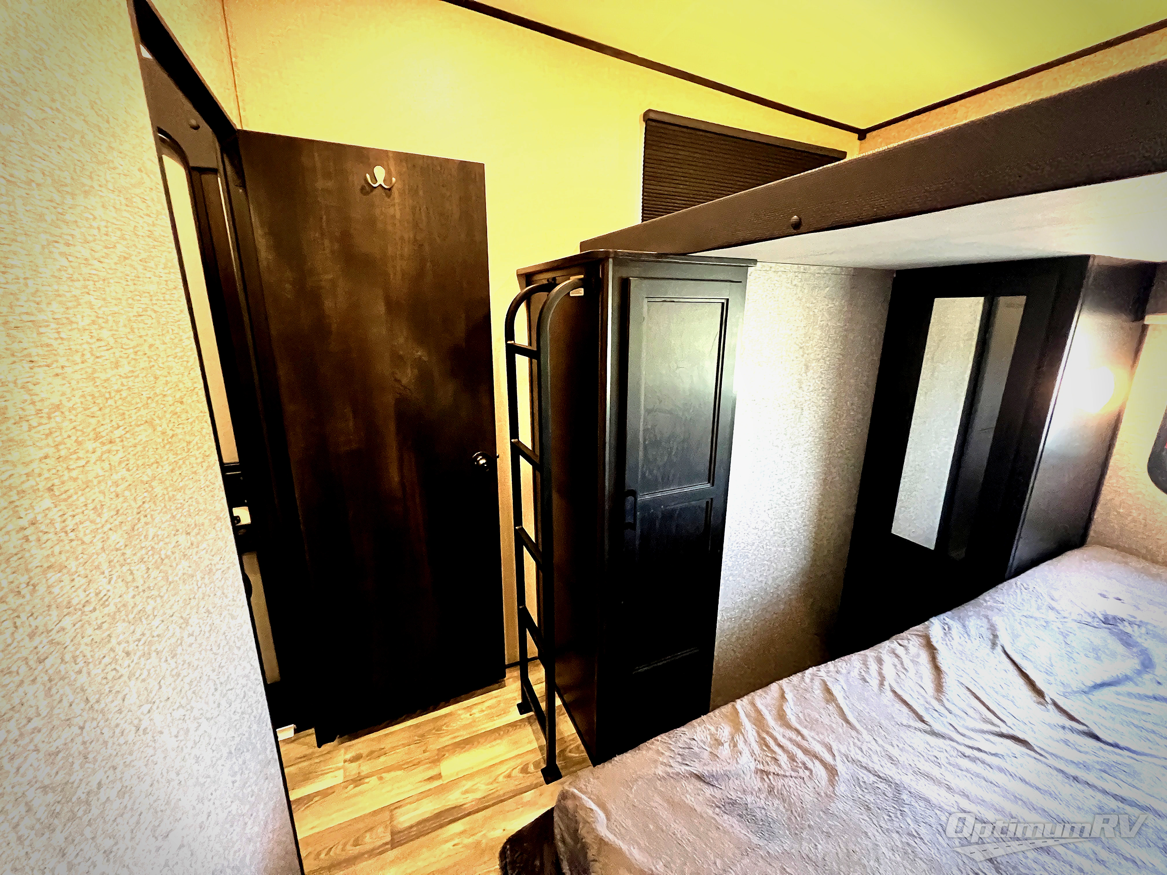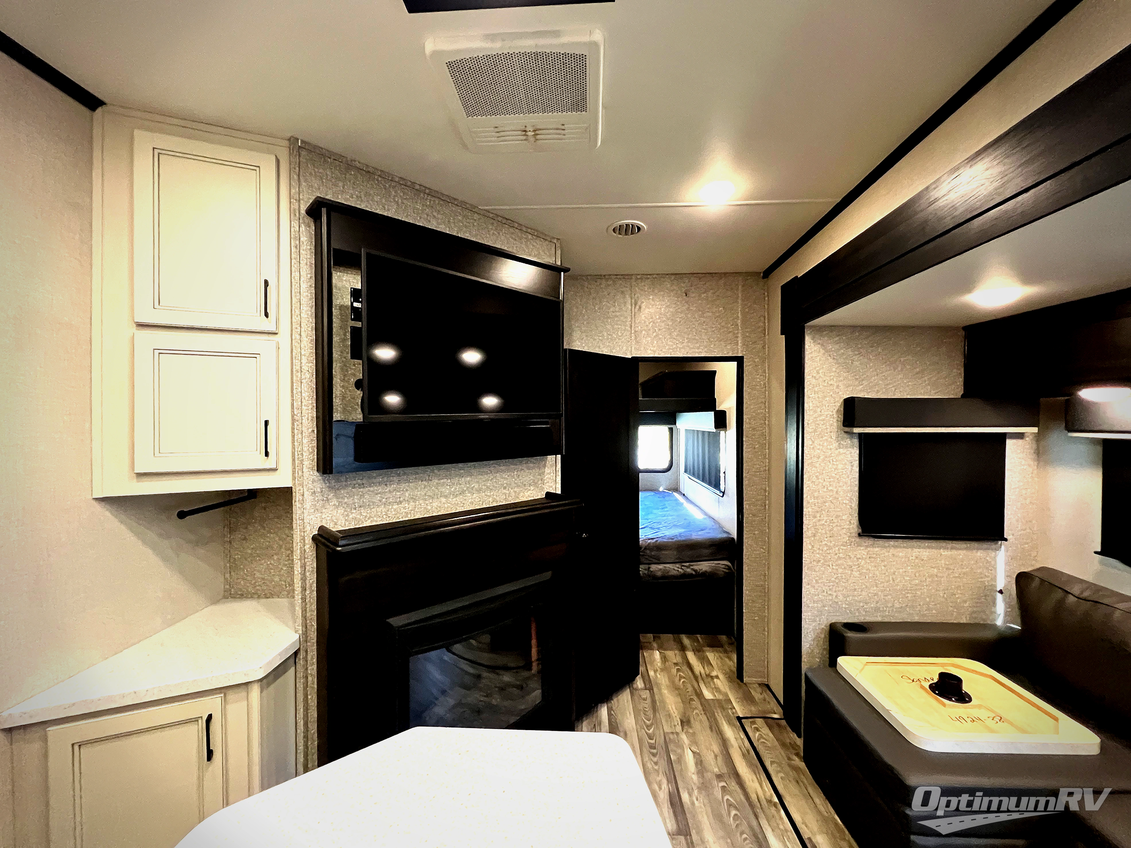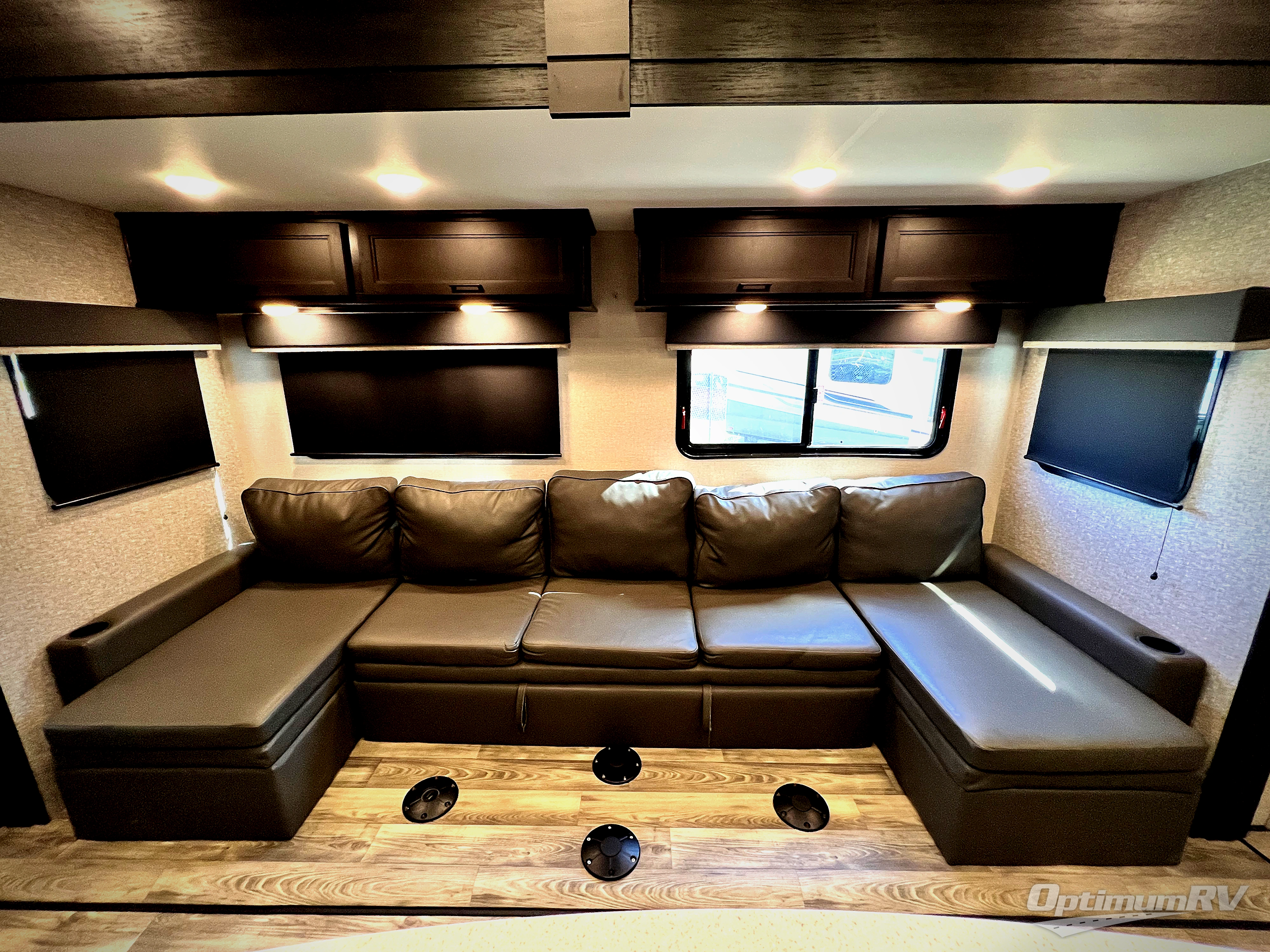 You won't believe all that this fifth wheel has to offer! From the rear private bunkhouse with a bunk bed above a bottom bed and a half bathroom to the front private bedroom with a queen bed that has a power base, a wardrobe slide, and an entrance into the dual entry bathroom which even has an area to add an optional washer and dryer. If you need to get some work done while you're at the campsite then grab a snack from the large pantry and sit at the desk. The chef can prepare their best meals either indoors with the three burner cooktop or breathe in some fresh air while cooking at the outside kitchen. There is even a BBQ hookup and outside TV hookup area underneath the two power awnings. Enjoy your meals and play card games at the U-lounge dinette slide while a fire roars in the electric fireplace or a movie plays on the 50" LED HDTV!