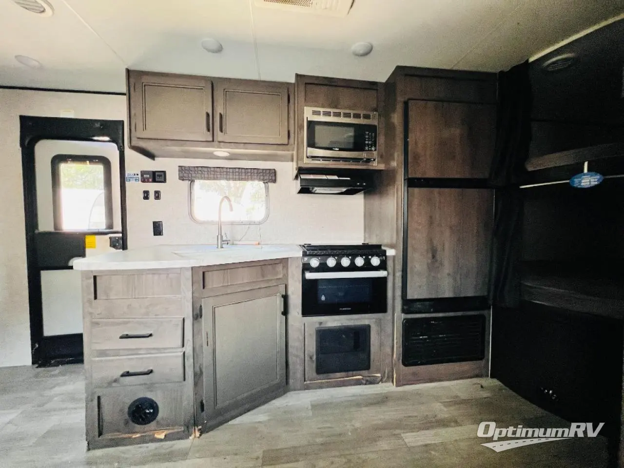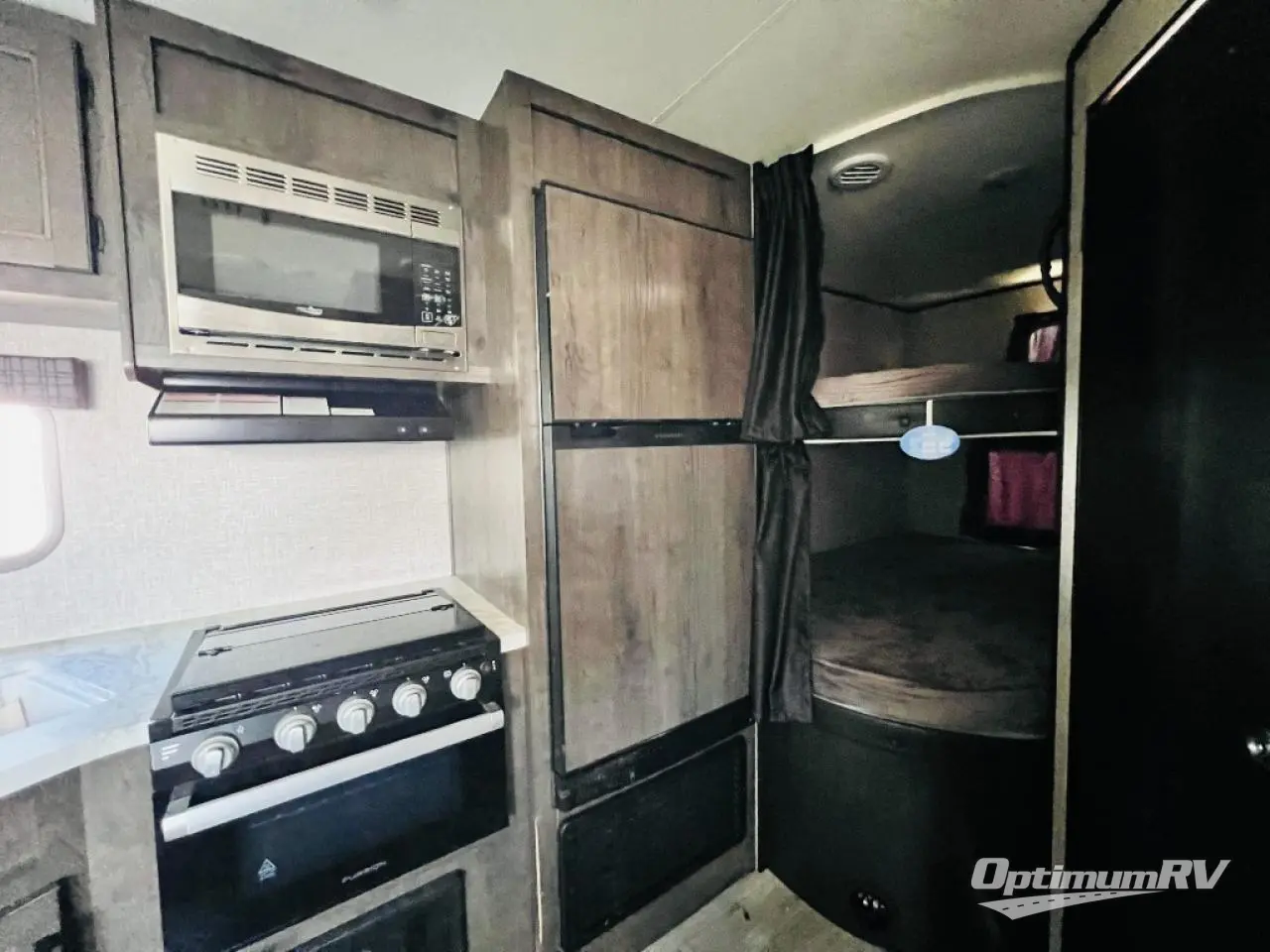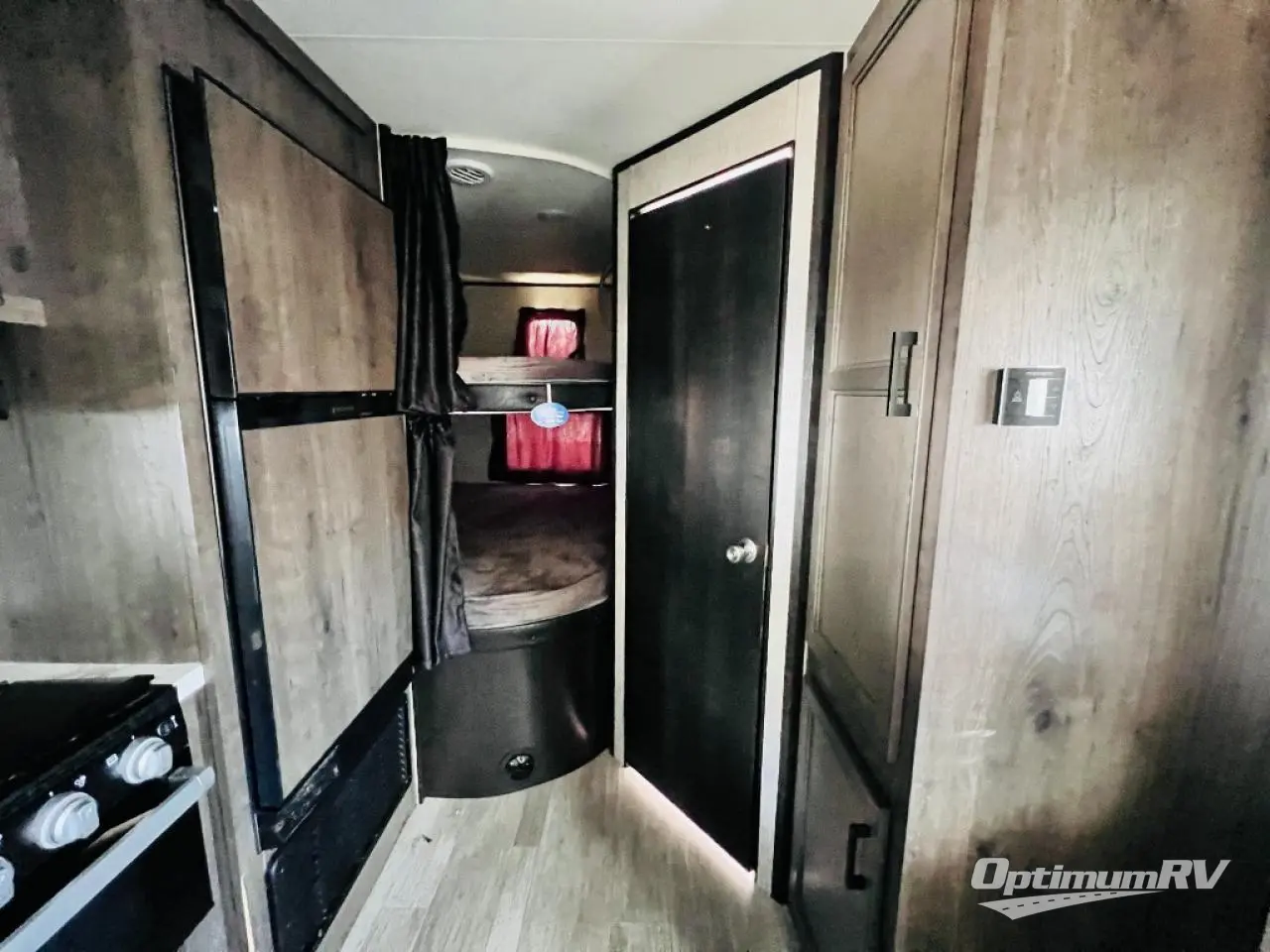 Calling larger camping groups, this trailer is waiting for your adventures! With sleeping space for eight, everyone can join you. The double size bunks offer sleeping for four, plus there is a curtain to close for privacy. The full bathroom will keep everyone clean, and the full kitchen amenities will keep everyone fed. There is an outside kitchen to use when you want to enjoy the outdoors while cooking. You will find exterior storage and a 16' power awning with LED lights that offers a covered outdoor living area when you add your camping chairs. And the front bedroom offers dual entry and wardrobes plus a queen bed, and the U-shaped dinette slide gives you extra floor space, a dining area, and sleeping space for two.