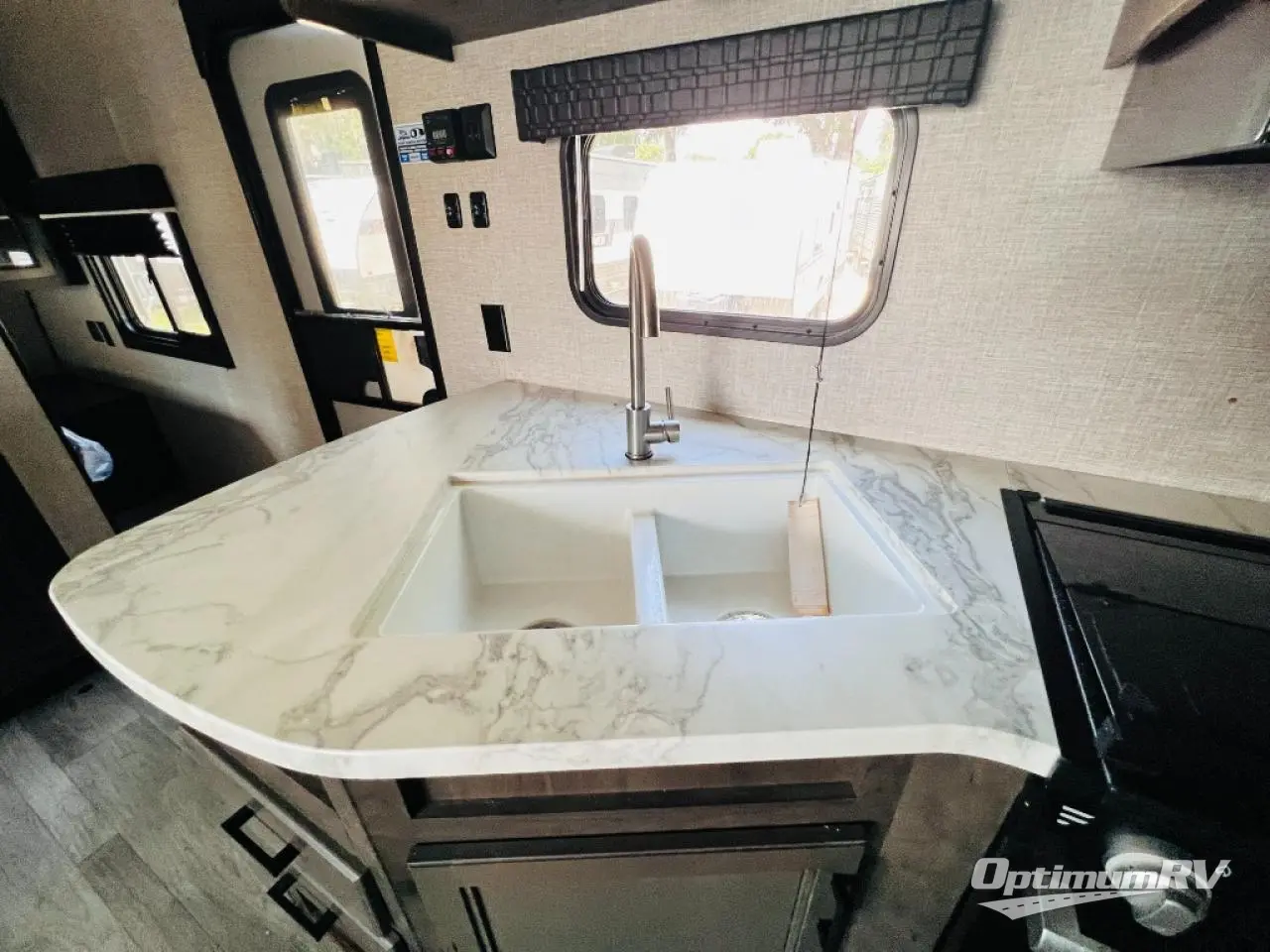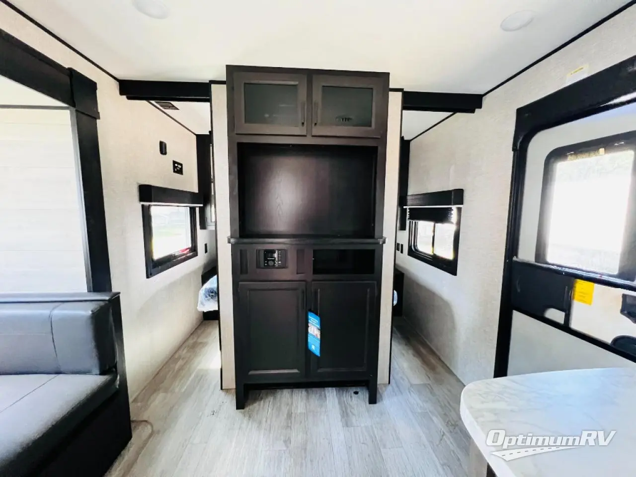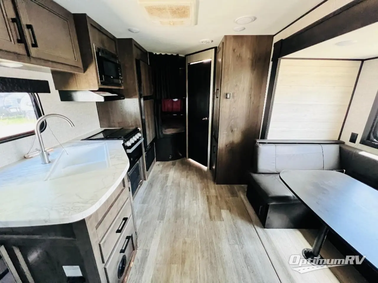 Calling larger camping groups, this trailer is waiting for your adventures! With sleeping space for eight, everyone can join you. The double size bunks offer sleeping for four, plus there is a curtain to close for privacy. The full bathroom will keep everyone clean, and the full kitchen amenities will keep everyone fed. There is an outside kitchen to use when you want to enjoy the outdoors while cooking. You will find exterior storage and a 16' power awning with LED lights that offers a covered outdoor living area when you add your camping chairs. And the front bedroom offers dual entry and wardrobes plus a queen bed, and the U-shaped dinette slide gives you extra floor space, a dining area, and sleeping space for two.