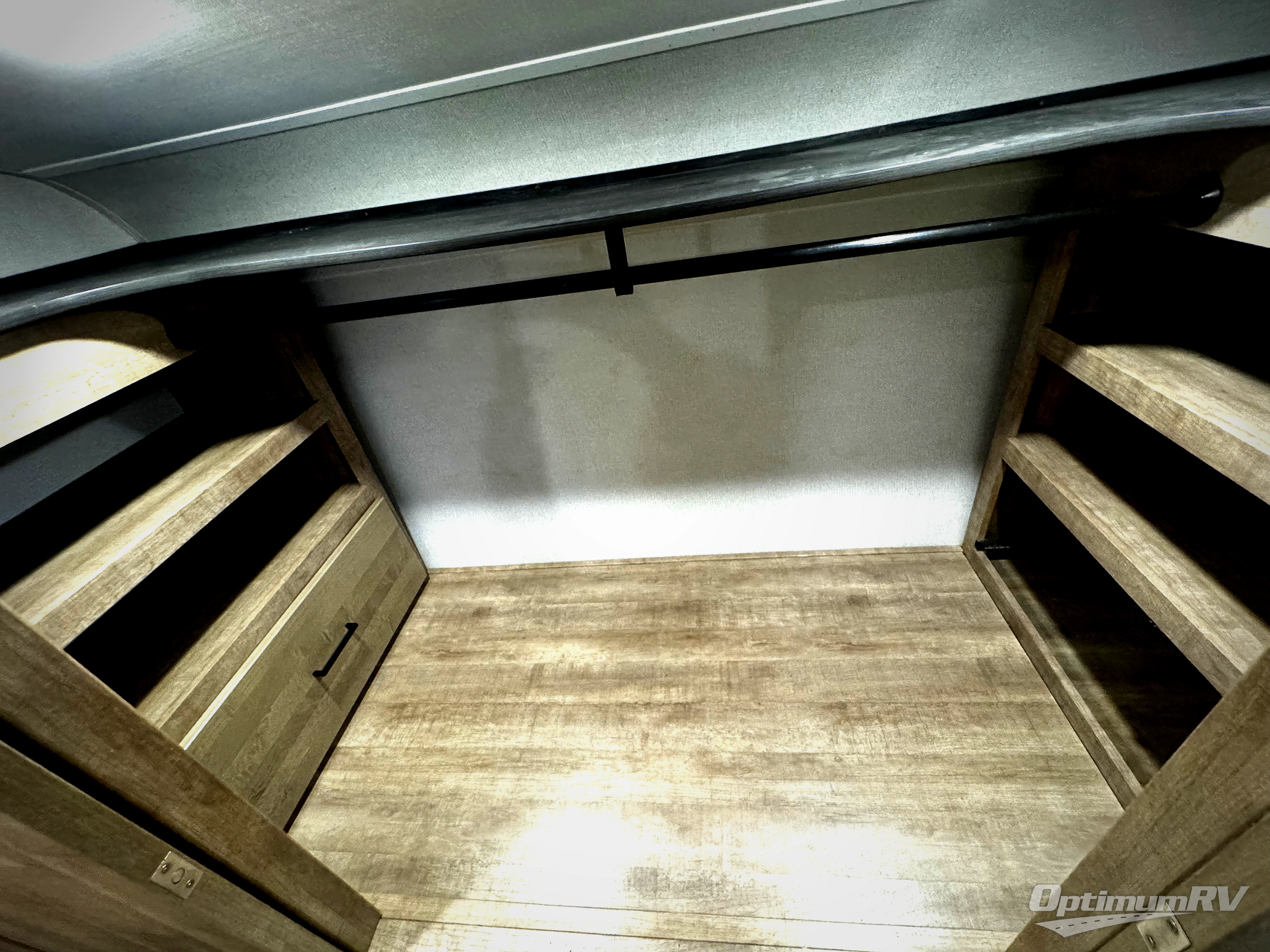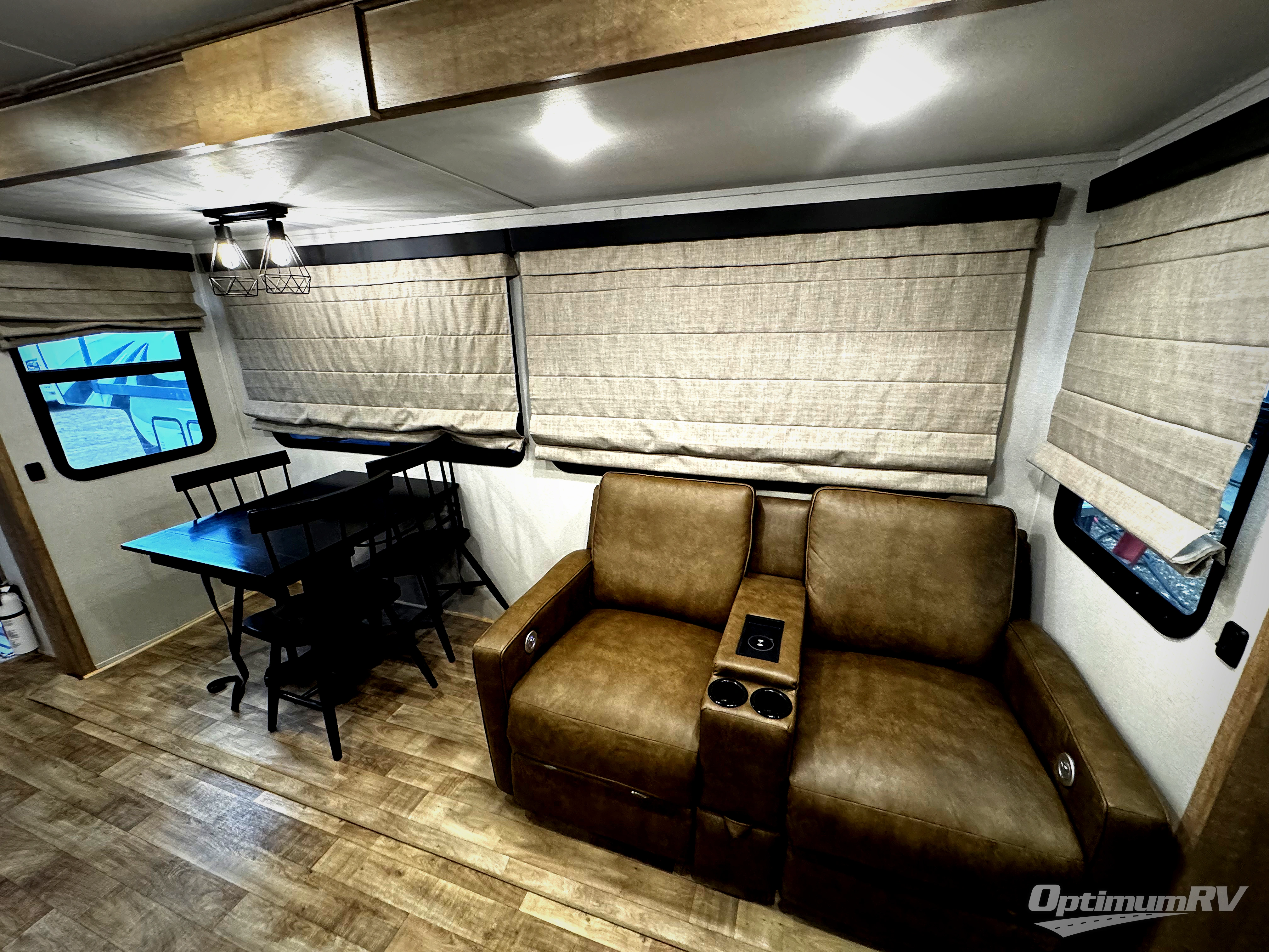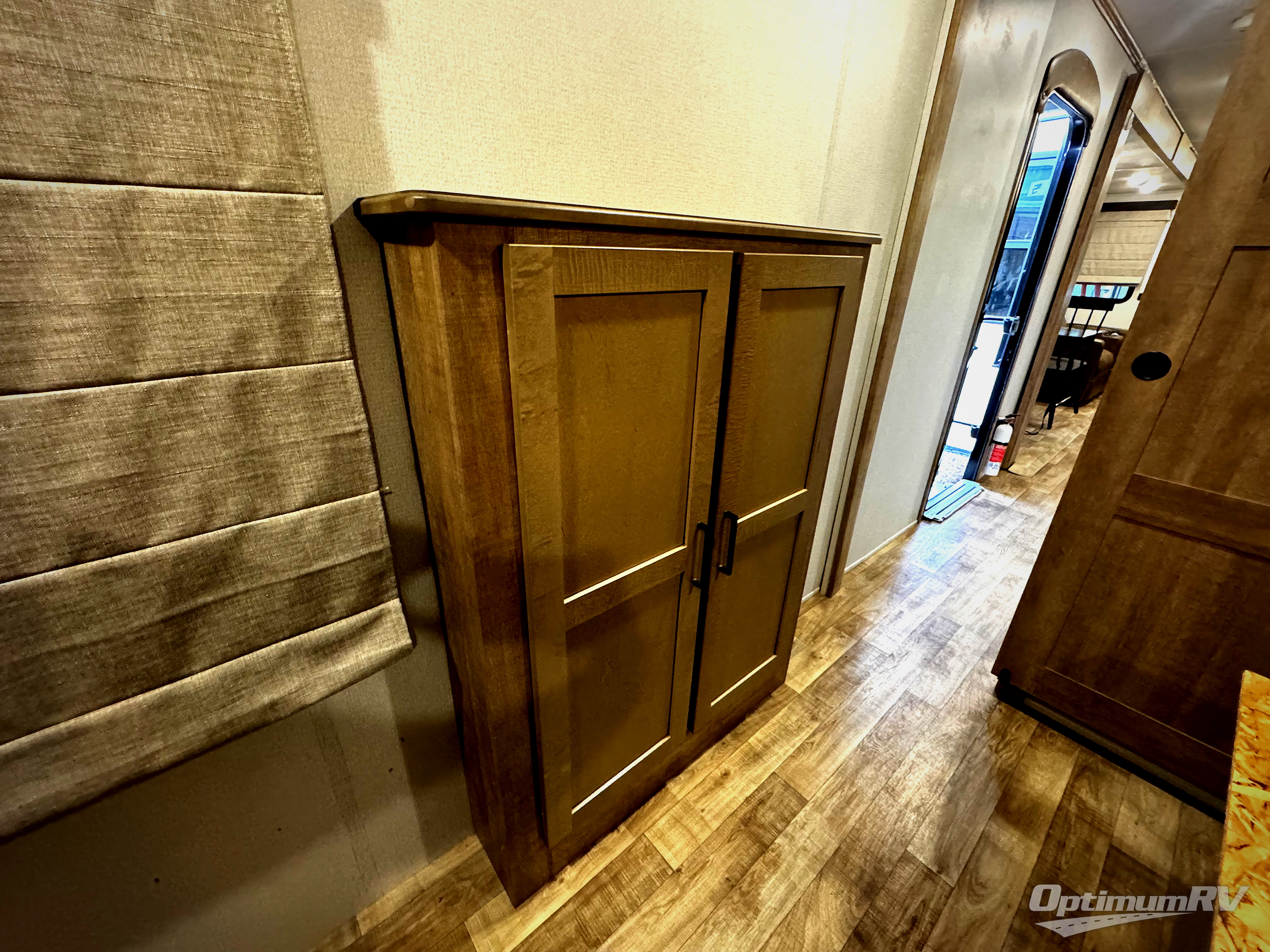 Wow! Check out the interior space in this travel trailer with dual opposing slides in the rear living area, plus a slide out California king bed in the front bedroom. You will also enjoy a walk-in closet with wrap-around shelving, plus a cozy bench seat where you can easily pull on your running shoes for a morning jog. Your crew will love to visit on the tri-fold sofa sleeper, the theater seating, or at the free-standing table with four chairs. There is also a 40" TV with storage space behind it for movies, plus a fireplace to make it feel more like home.
