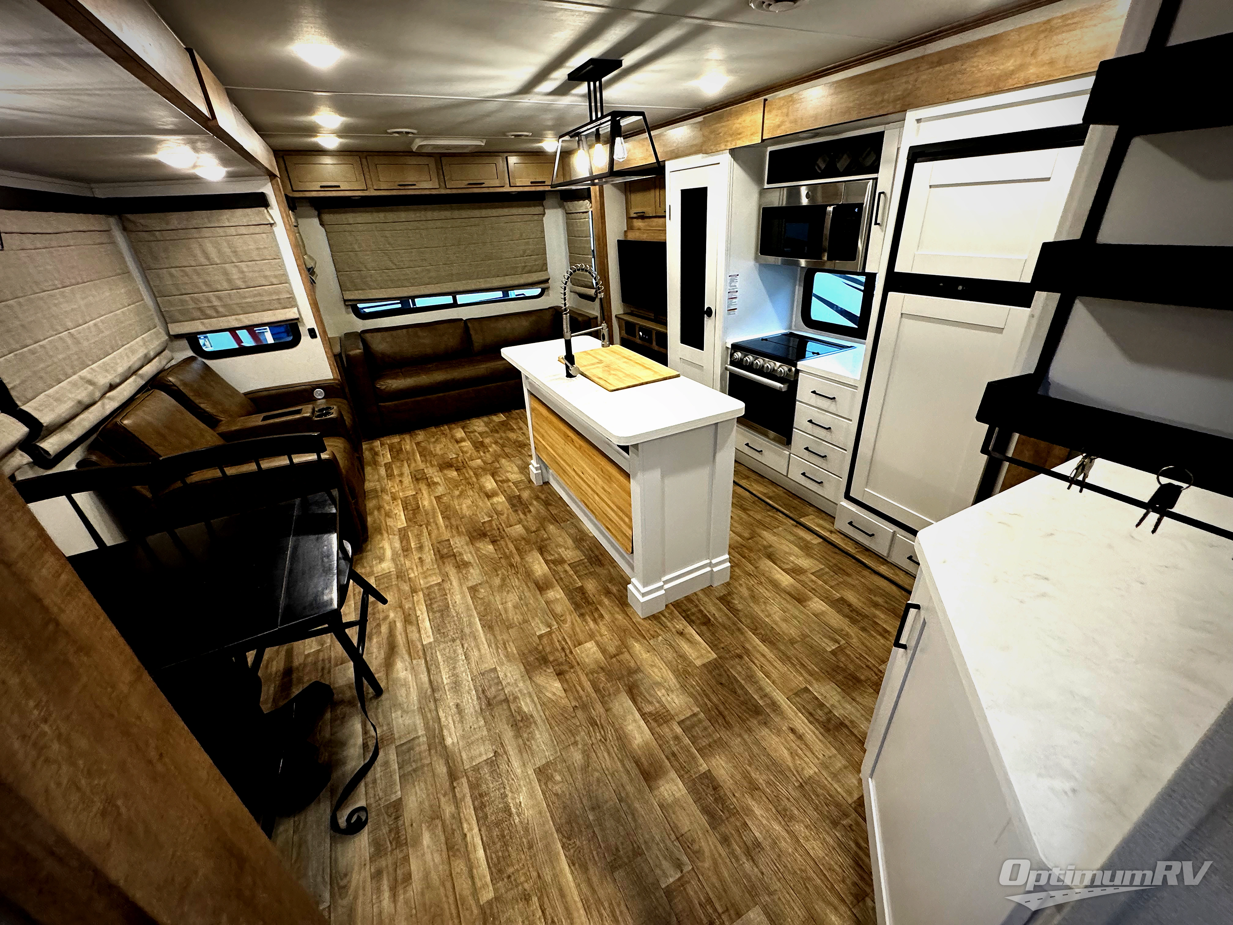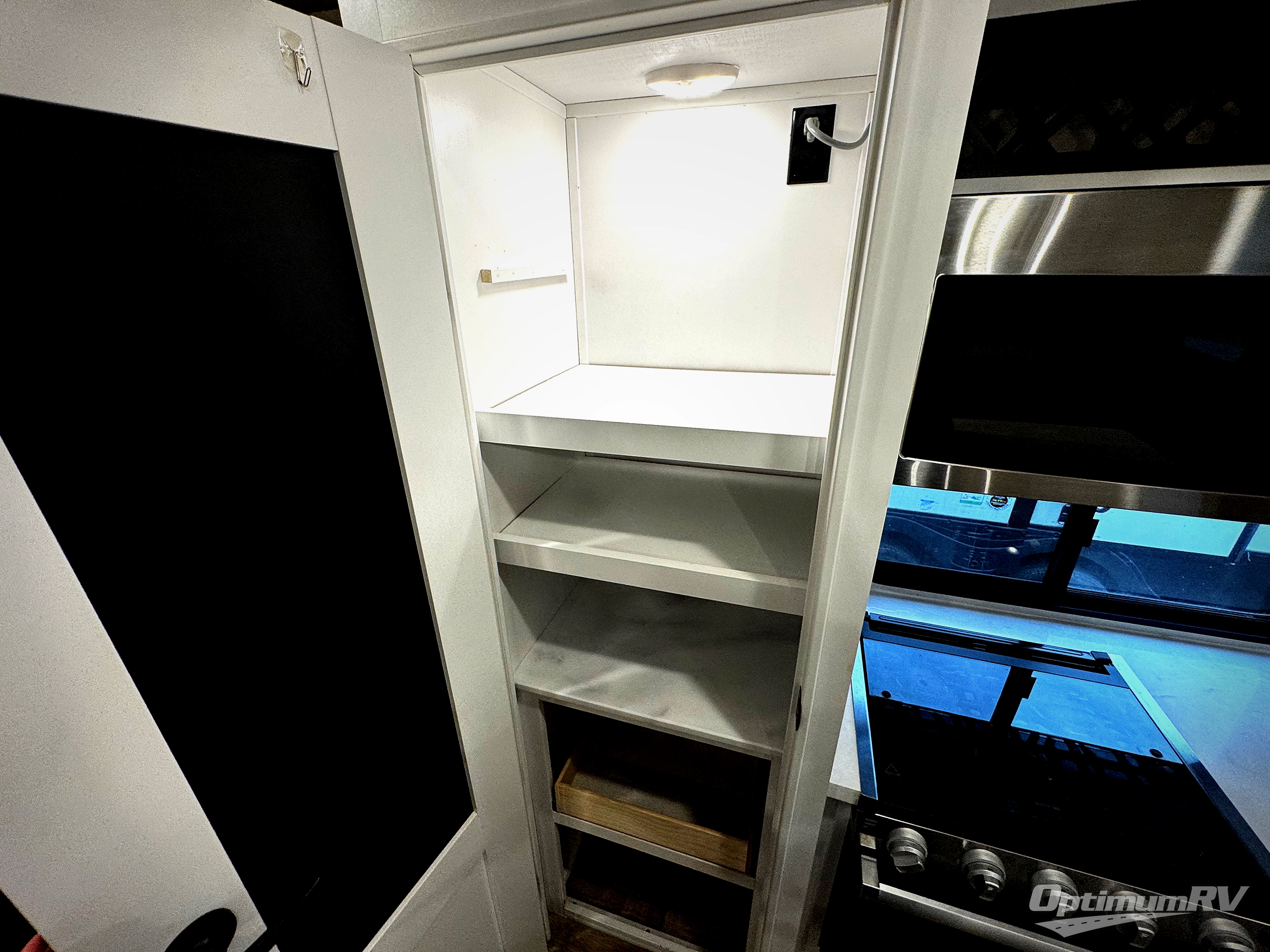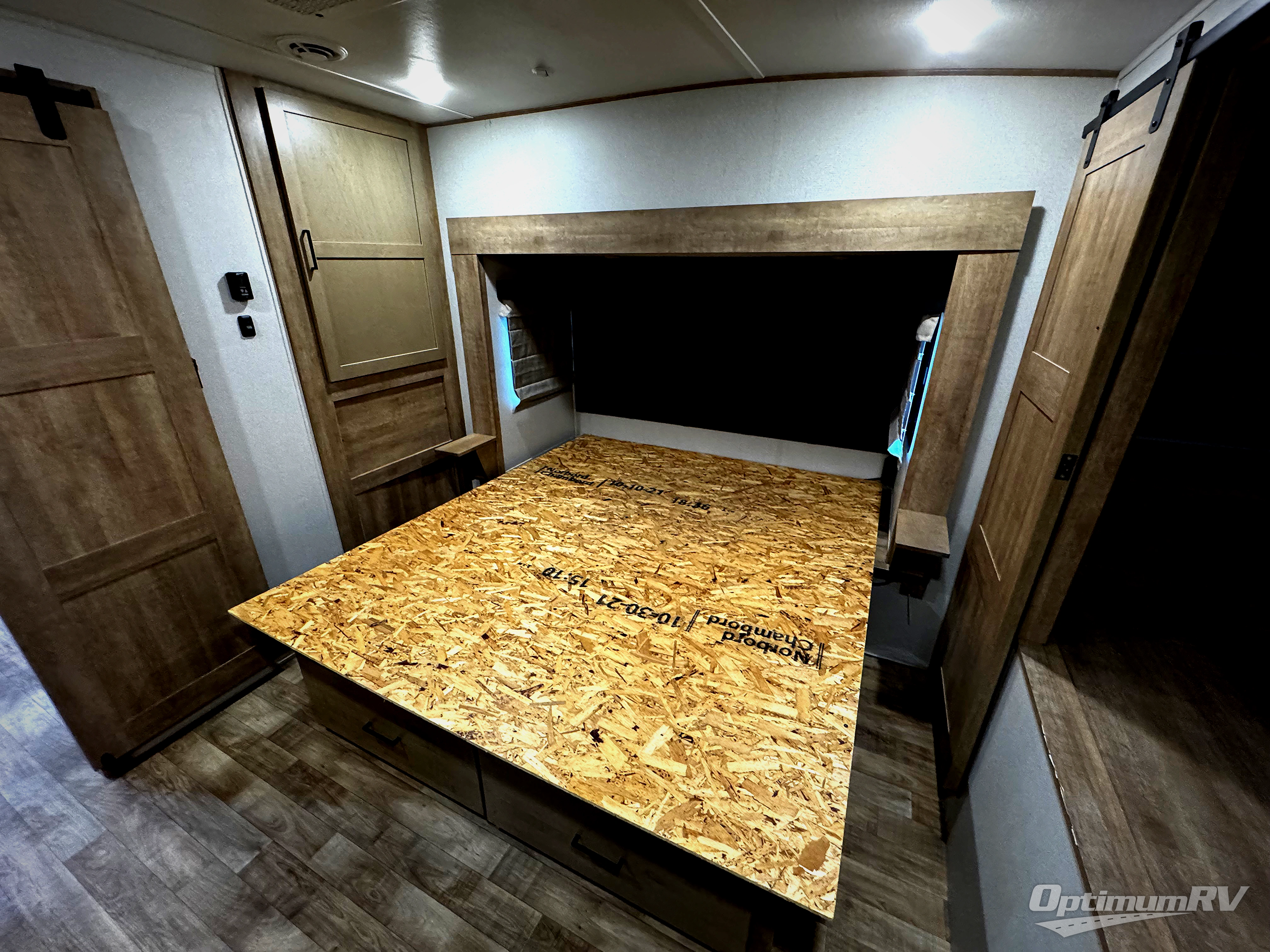 Wow! Check out the interior space in this travel trailer with dual opposing slides in the rear living area, plus a slide out California king bed in the front bedroom. You will also enjoy a walk-in closet with wrap-around shelving, plus a cozy bench seat where you can easily pull on your running shoes for a morning jog. Your crew will love to visit on the tri-fold sofa sleeper, the theater seating, or at the free-standing table with four chairs. There is also a 40" TV with storage space behind it for movies, plus a fireplace to make it feel more like home.