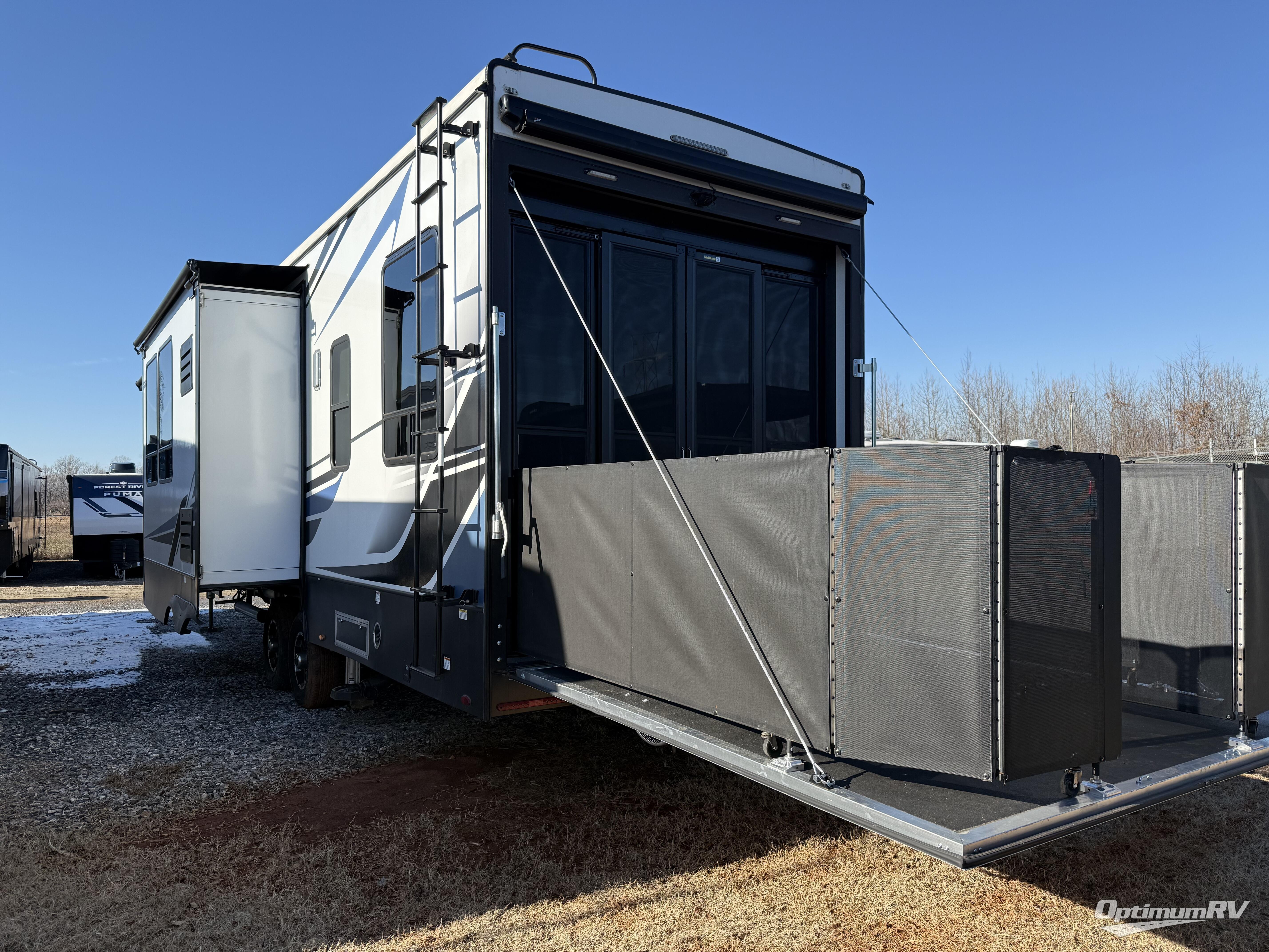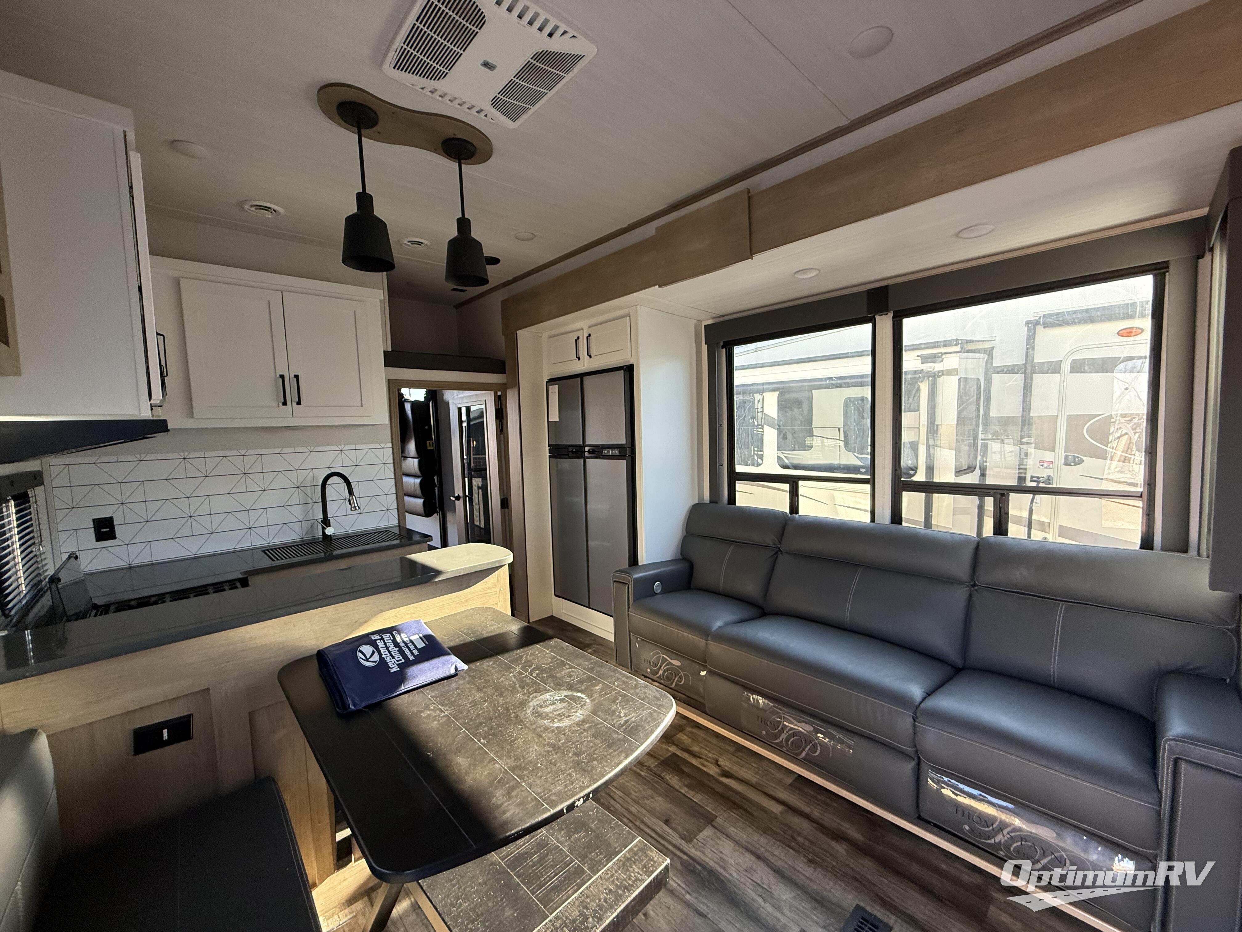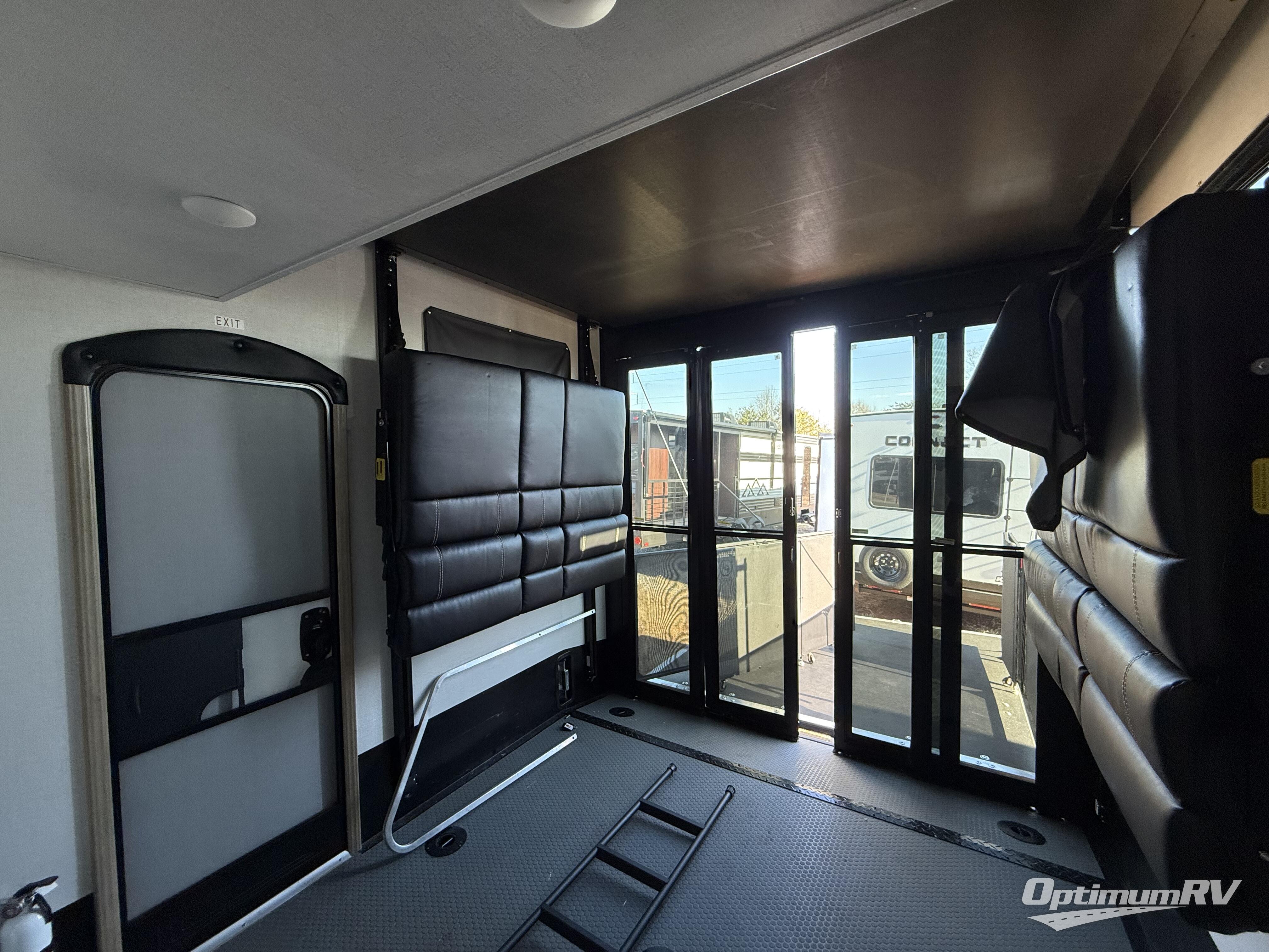 This tandem axle fifth wheel offers a 10' separate garage, two slide outs, dual entry and so much more giving you the ultimate experience while camping with your ATV, motorcycles, or whatever you want to haul in the garage. After unloading using the ramp door, you can easily set up the electric bed with dual opposing sofas to sleep or relax on, and the loft includes a twin bed and there is access from the main living and kitchen area. The U-shaped counter includes a large farmhouse style sink, kitchen appliances, and overhead cabinets. You can dine at the dinette table with bench seating, or while at the 97" sofa with recliners, and everyone can watch the 50" LED TV with surround sound. There is a full bathroom to get cleaned up in, and the front bedroom offers a queen bed, a wardrobe slide, plus wireless phone chargers, nightstands and wardrobes.