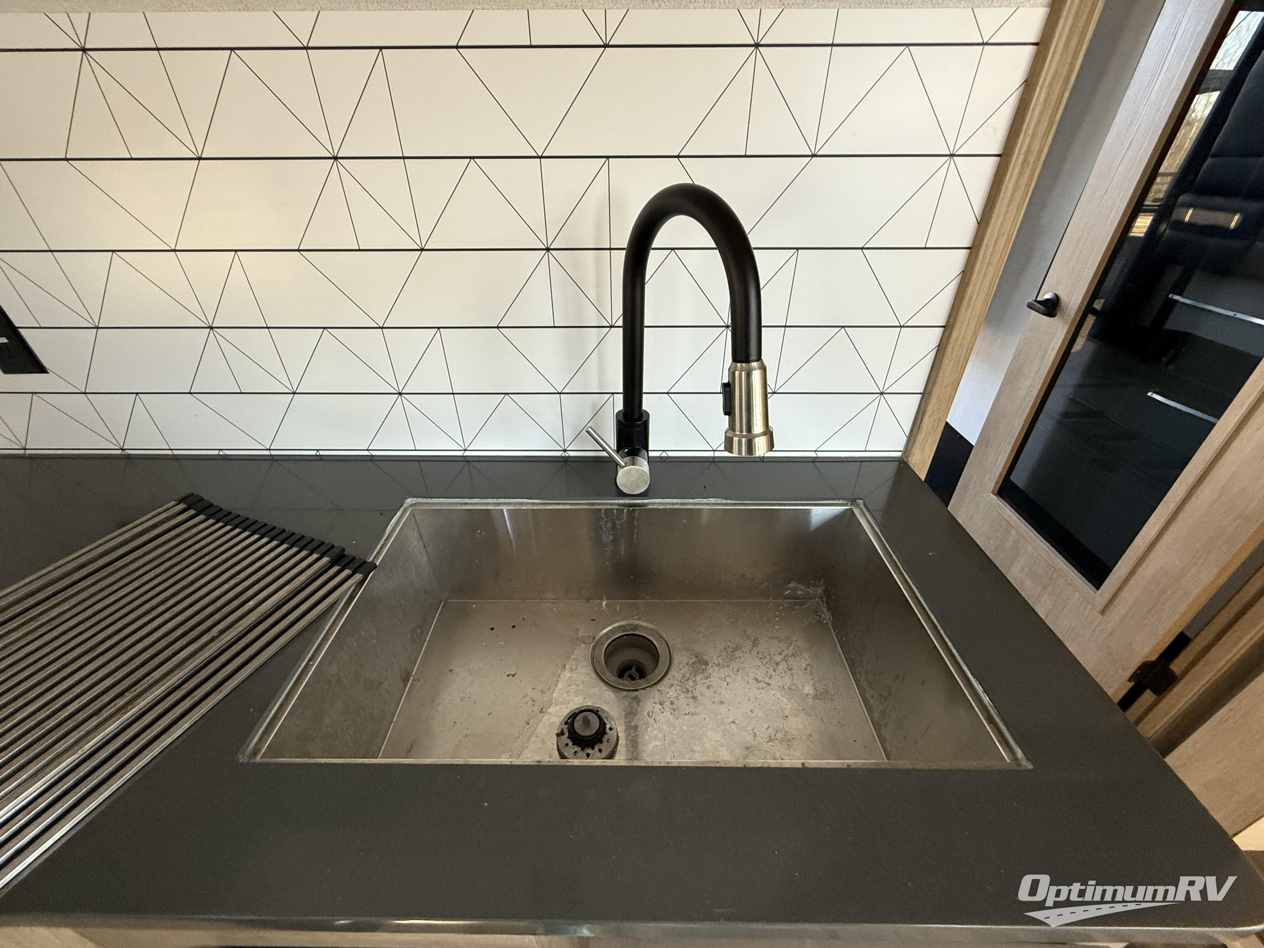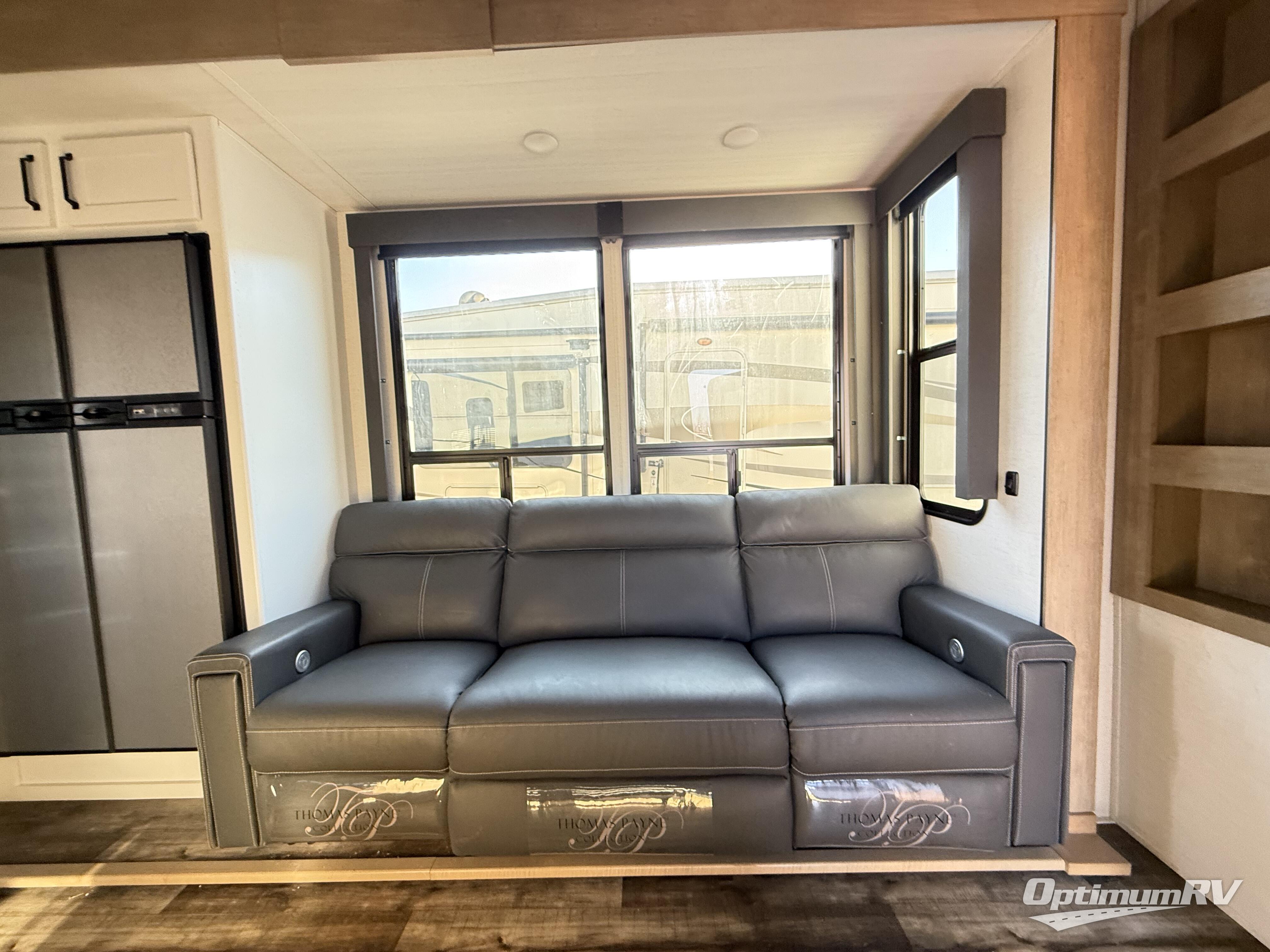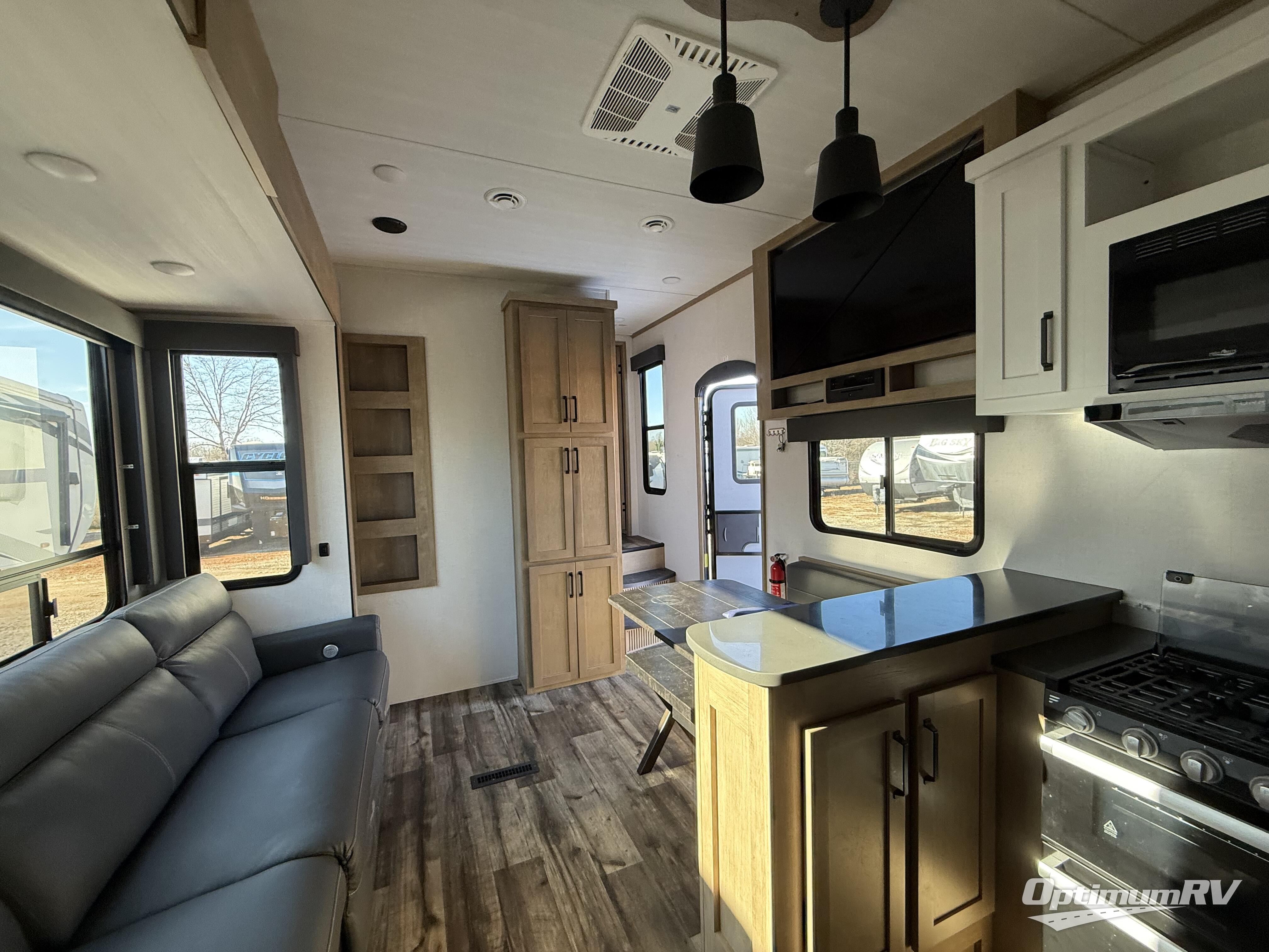 This tandem axle fifth wheel offers a 10' separate garage, two slide outs, dual entry and so much more giving you the ultimate experience while camping with your ATV, motorcycles, or whatever you want to haul in the garage. After unloading using the ramp door, you can easily set up the electric bed with dual opposing sofas to sleep or relax on, and the loft includes a twin bed and there is access from the main living and kitchen area. The U-shaped counter includes a large farmhouse style sink, kitchen appliances, and overhead cabinets. You can dine at the dinette table with bench seating, or while at the 97" sofa with recliners, and everyone can watch the 50" LED TV with surround sound. There is a full bathroom to get cleaned up in, and the front bedroom offers a queen bed, a wardrobe slide, plus wireless phone chargers, nightstands and wardrobes.