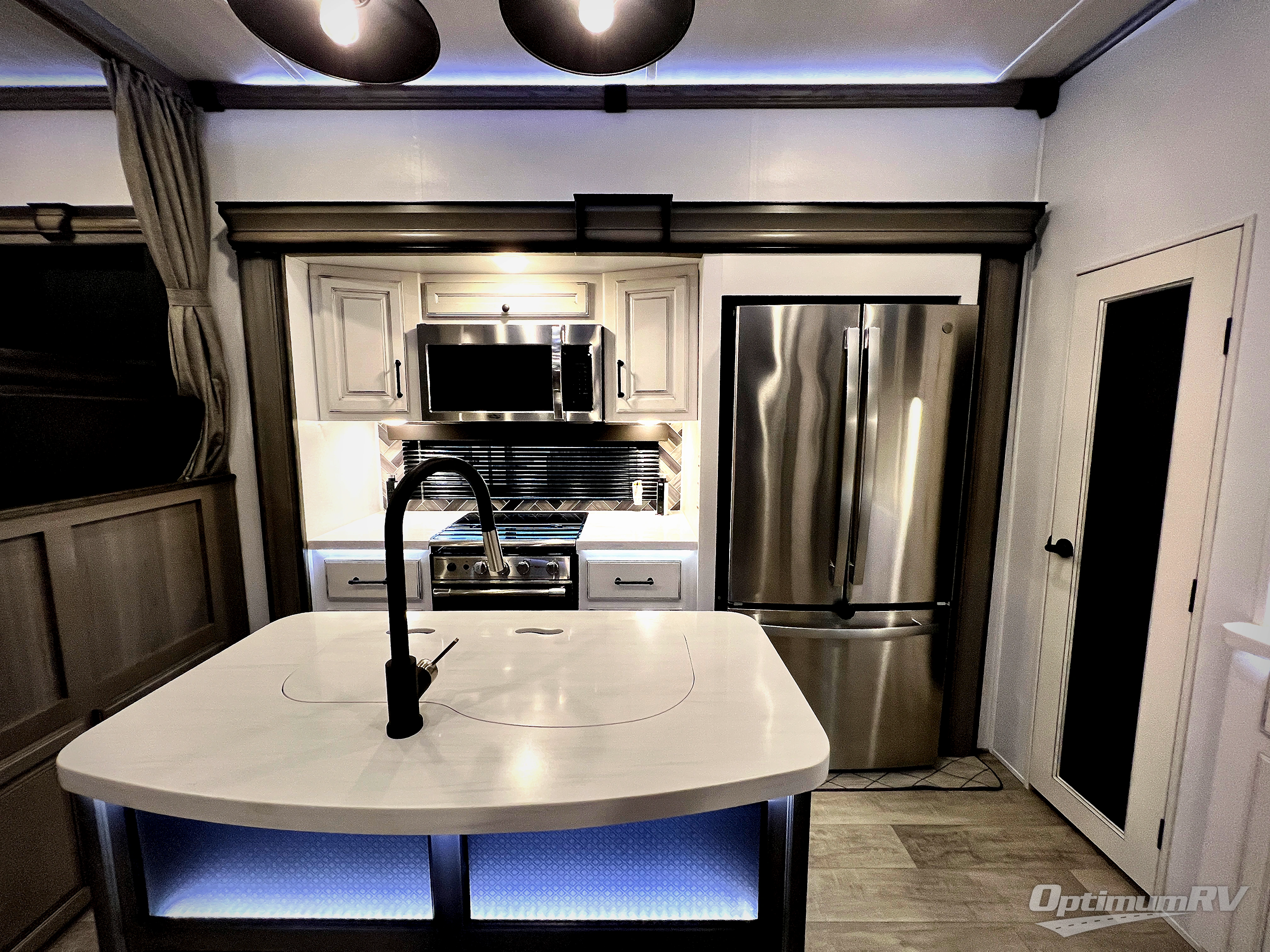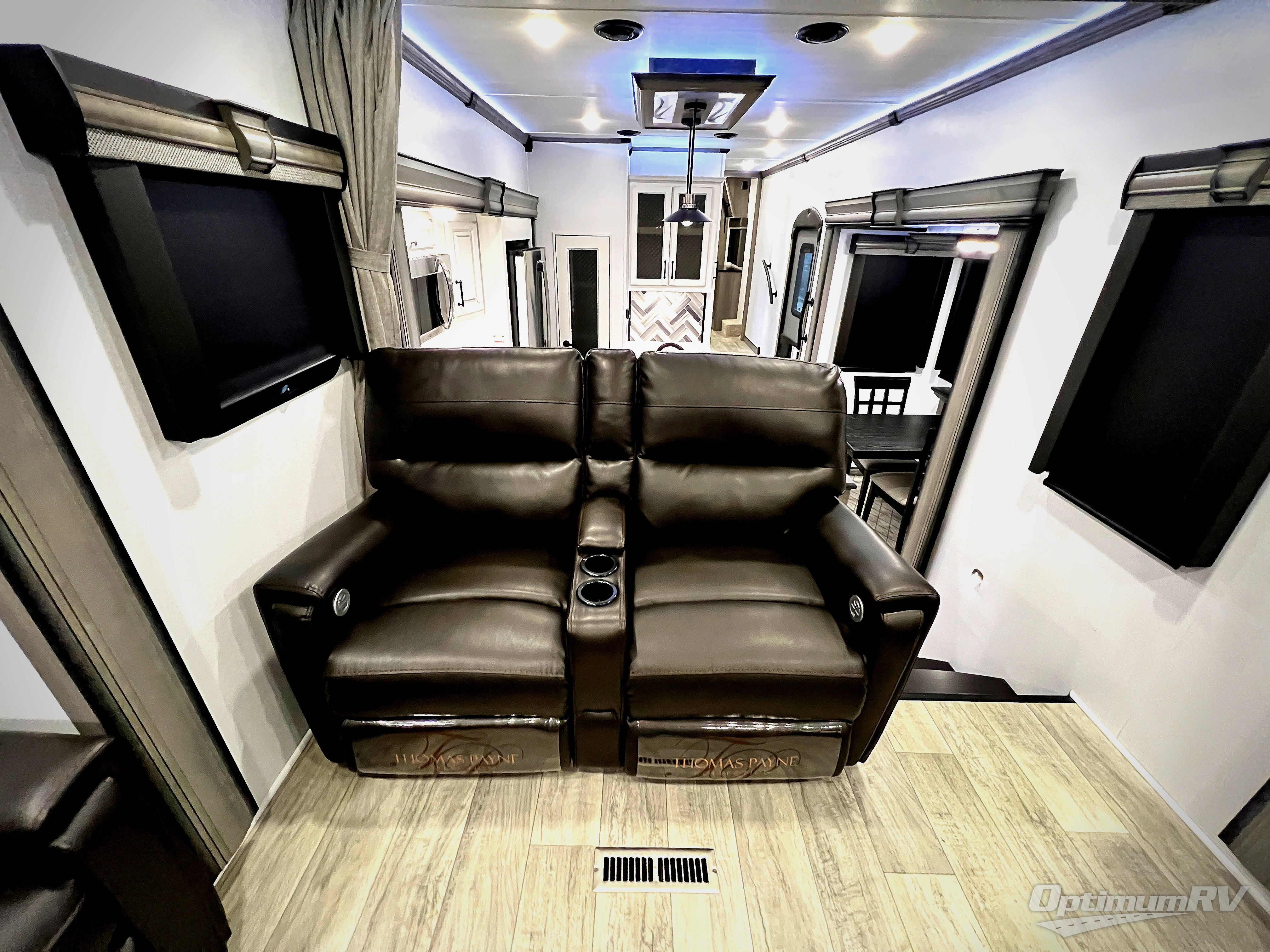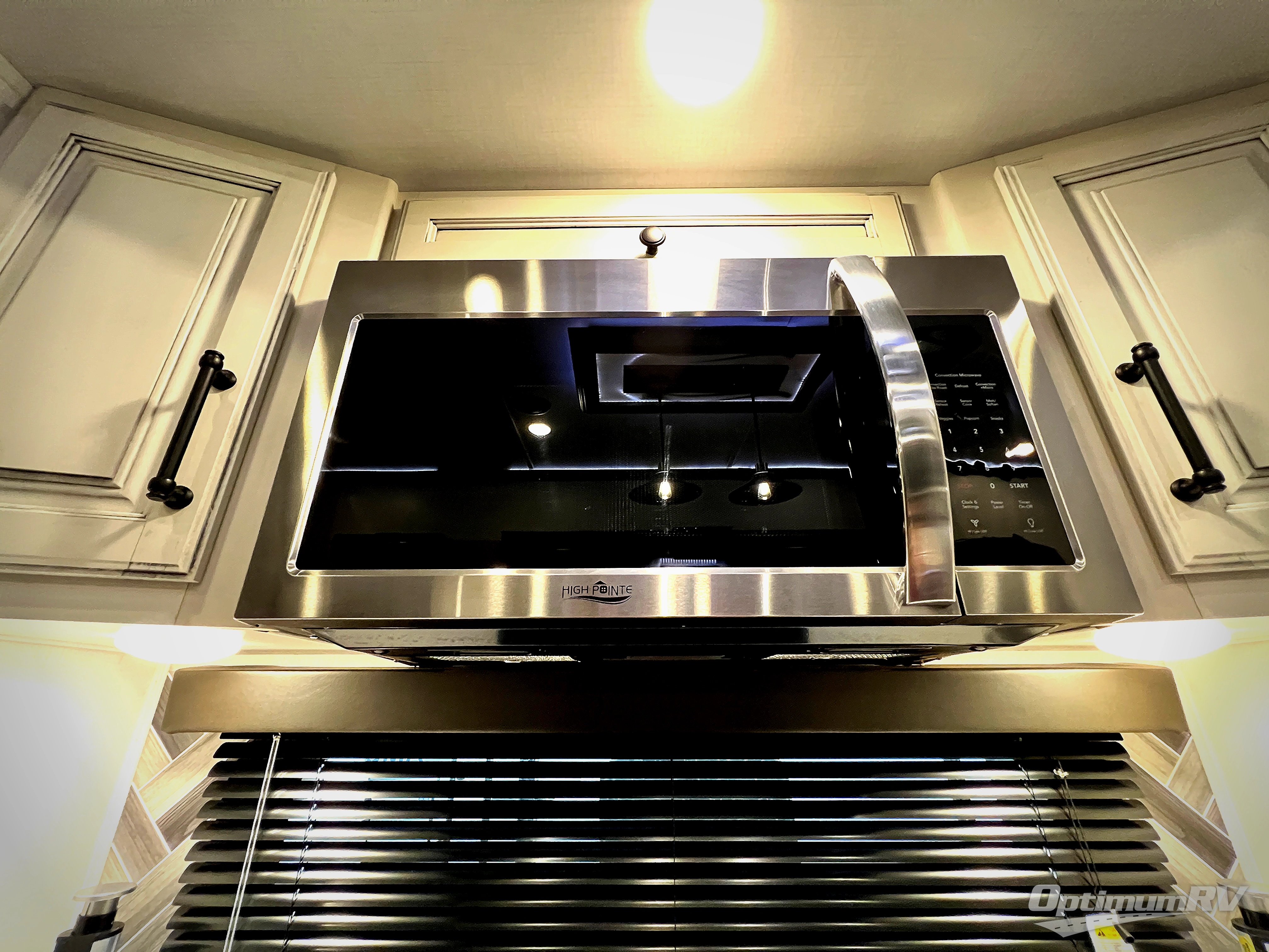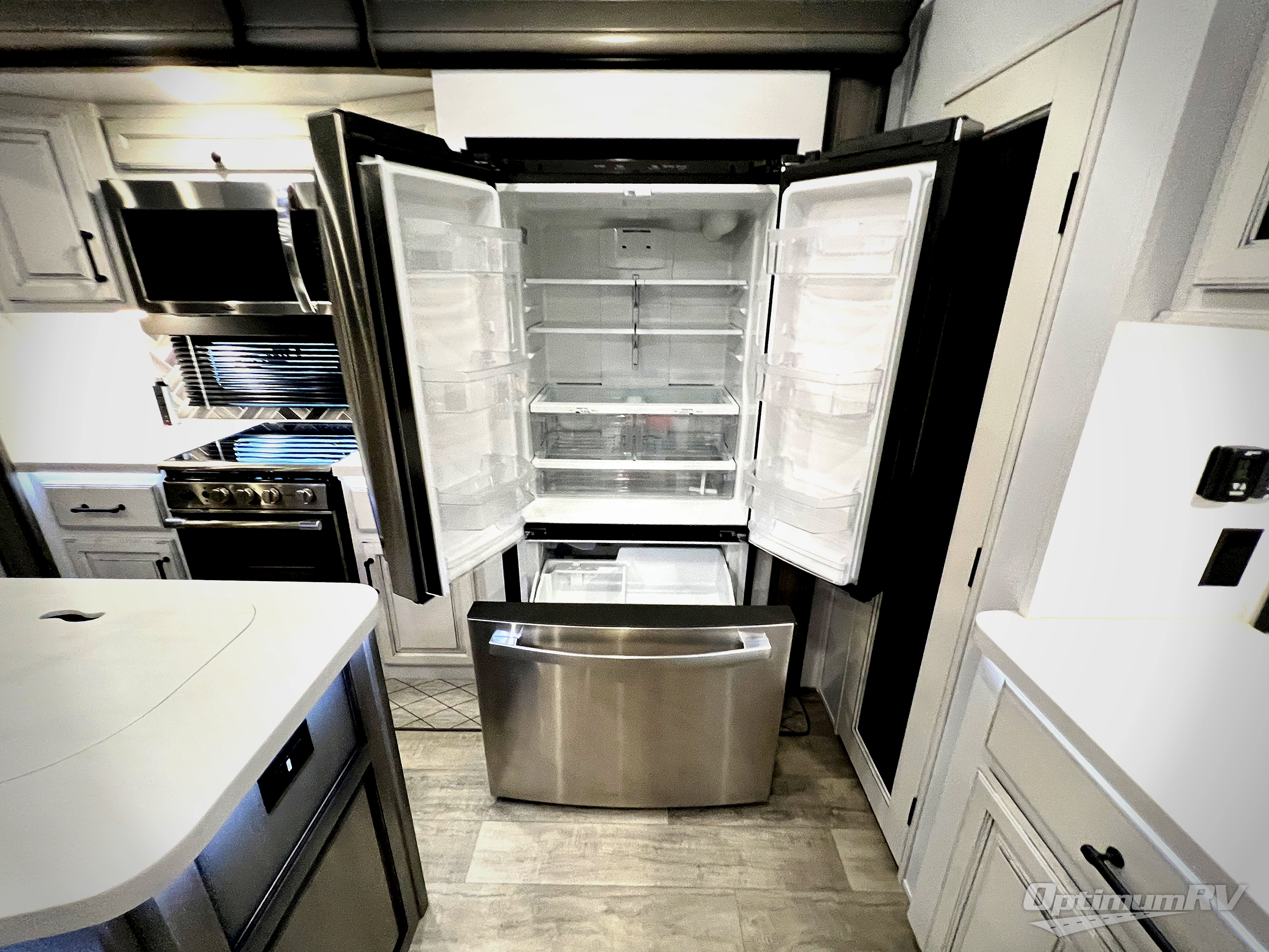 The coffee lover will enjoy camping in this fifth wheel with the coffee station in the kitchen! The kitchen also has an island, a large pantry, a glass top range with convection microwave and range hood that has a pull-down spice rack, a 18 cu. ft. residential refrigerator, and floor cabinets for your storage needs. Eat your meals and play card games at the free standing legless dinette with 110V outlets to charge your electronics. The separated living area has opposing hide-a-bed sofas and power Thomas Payne theater seating across from a rear entertainment center with a telescoping 50" LCD HDTV and a 5,000 BTU decorative fireplace heater with storage on either side. When you're ready to wind down your nights, head to the front private bedroom to enjoy a good night's rest on the king bed slide with storage underneath and there is a front closet with a clothing hamper and an area to add the optional stackable washer and dryer to have clean clothes for your longer trips!