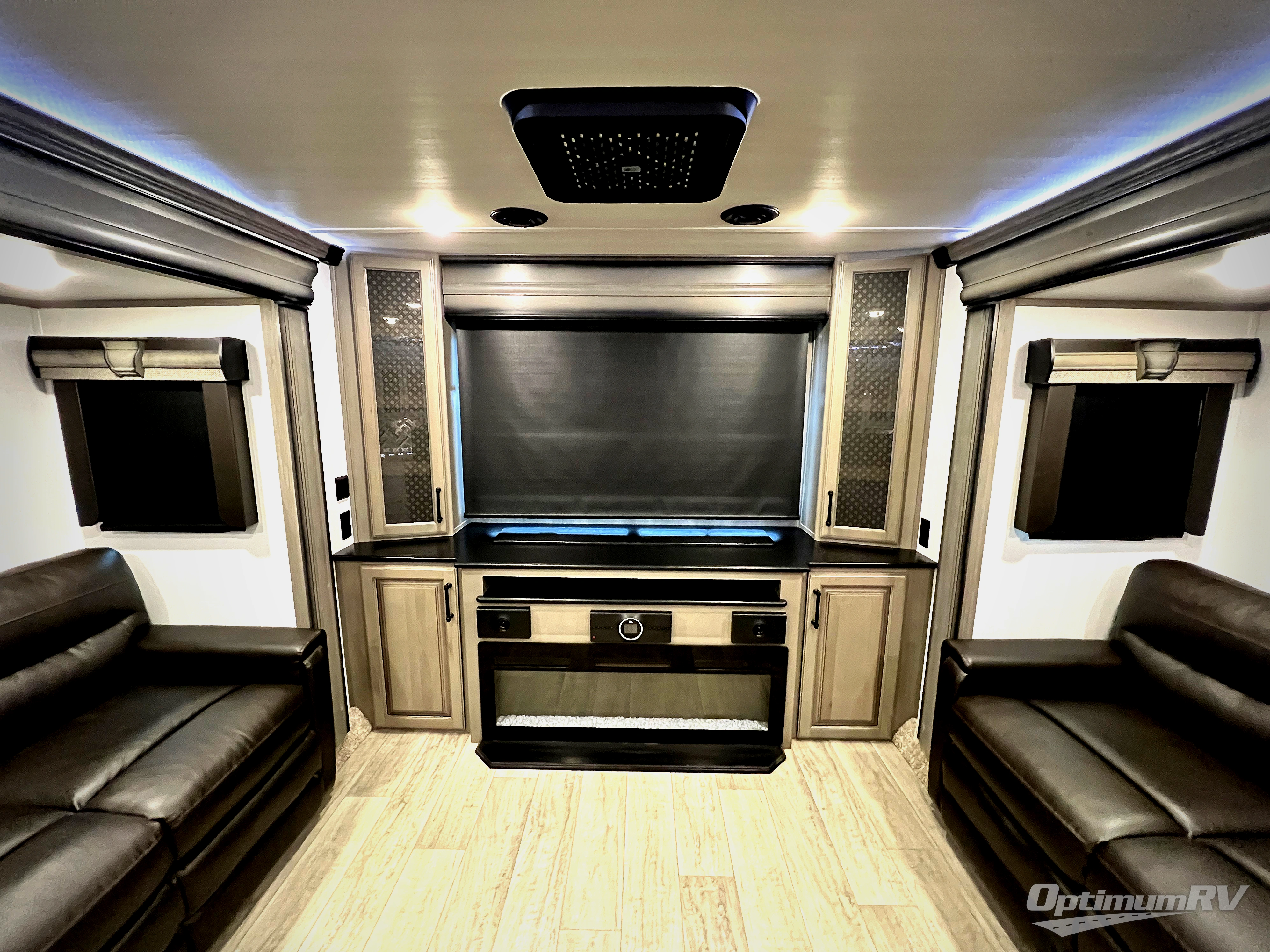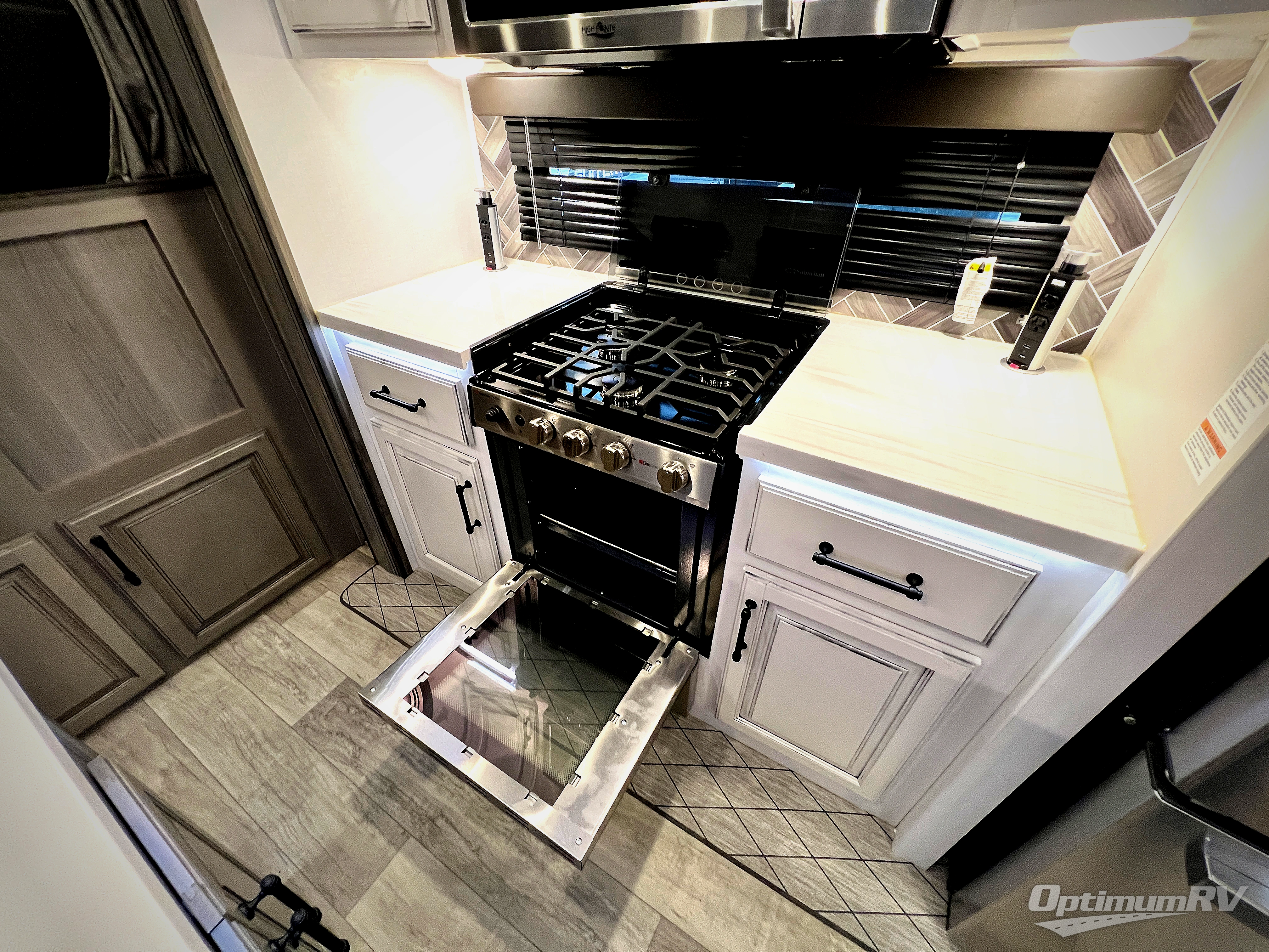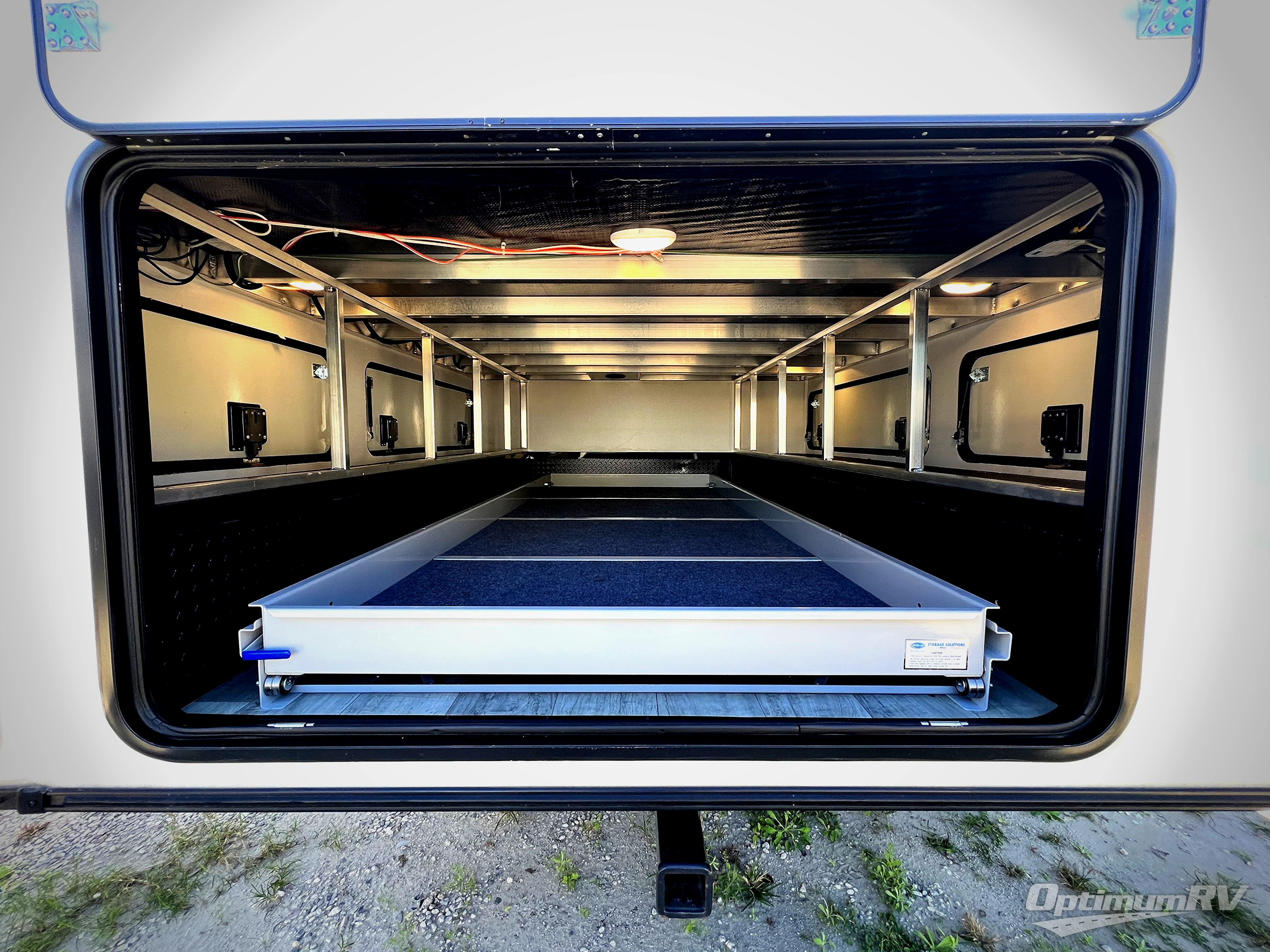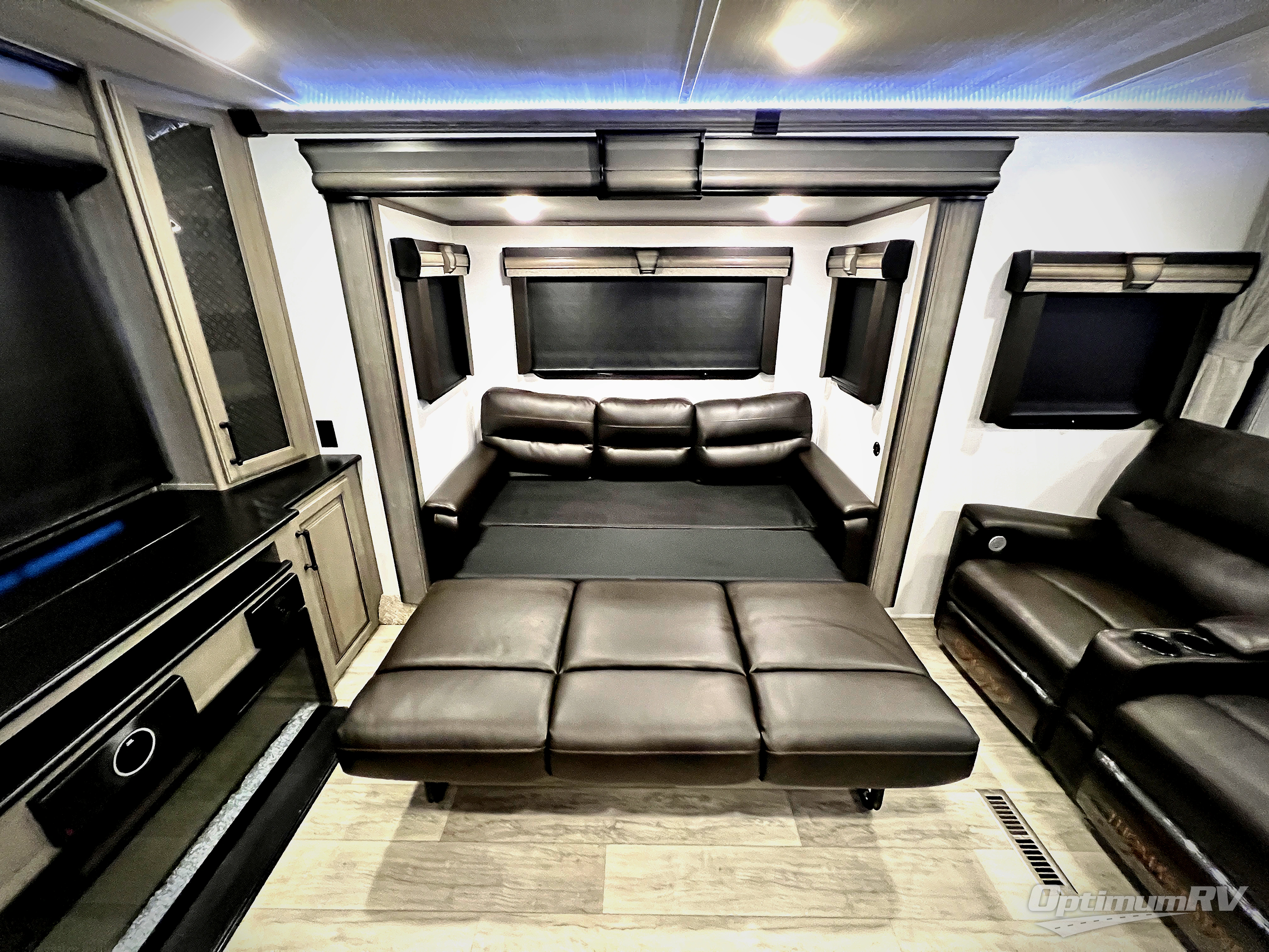 The coffee lover will enjoy camping in this fifth wheel with the coffee station in the kitchen! The kitchen also has an island, a large pantry, a glass top range with convection microwave and range hood that has a pull-down spice rack, a 18 cu. ft. residential refrigerator, and floor cabinets for your storage needs. Eat your meals and play card games at the free standing legless dinette with 110V outlets to charge your electronics. The separated living area has opposing hide-a-bed sofas and power Thomas Payne theater seating across from a rear entertainment center with a telescoping 50" LCD HDTV and a 5,000 BTU decorative fireplace heater with storage on either side. When you're ready to wind down your nights, head to the front private bedroom to enjoy a good night's rest on the king bed slide with storage underneath and there is a front closet with a clothing hamper and an area to add the optional stackable washer and dryer to have clean clothes for your longer trips!