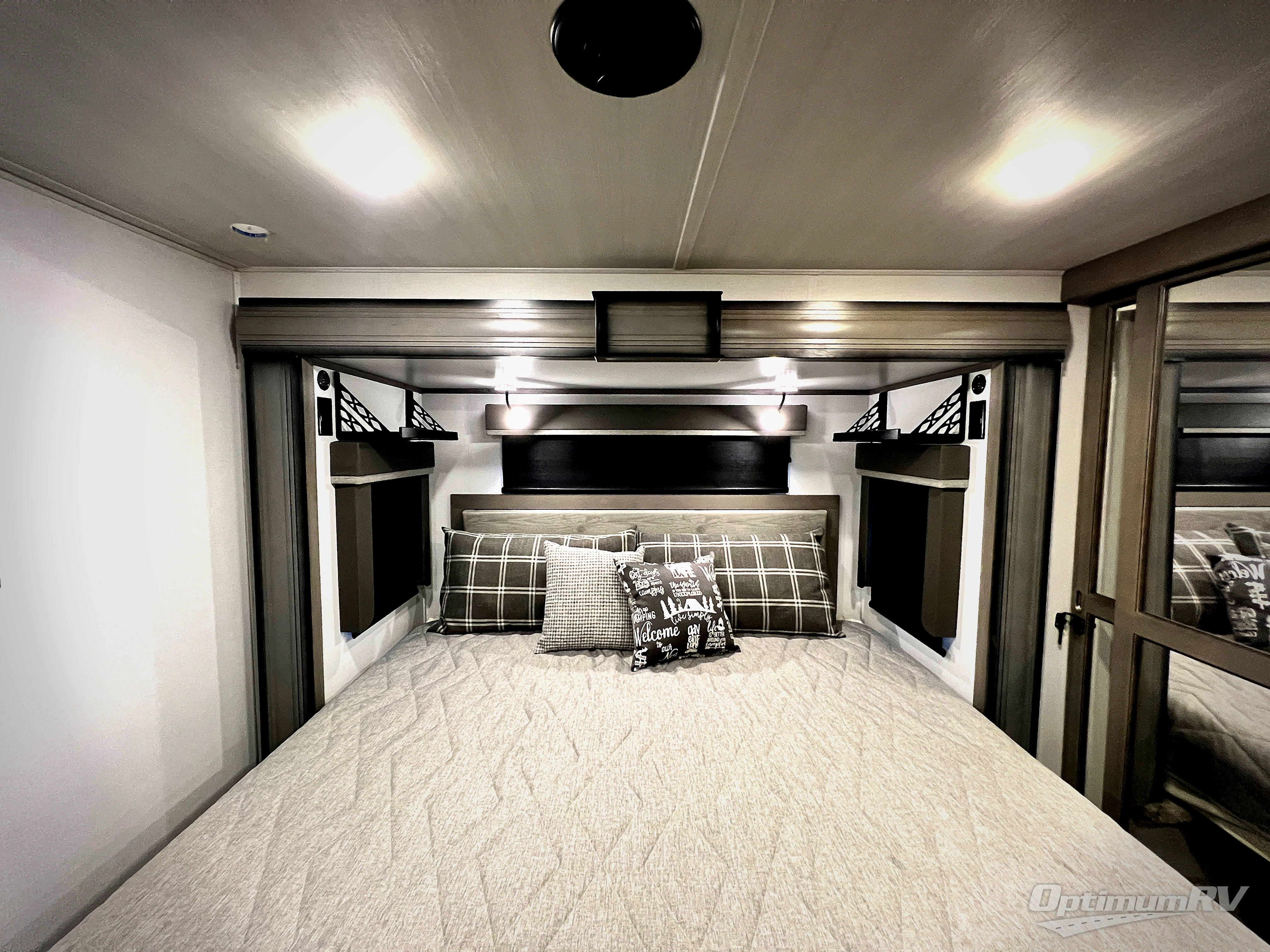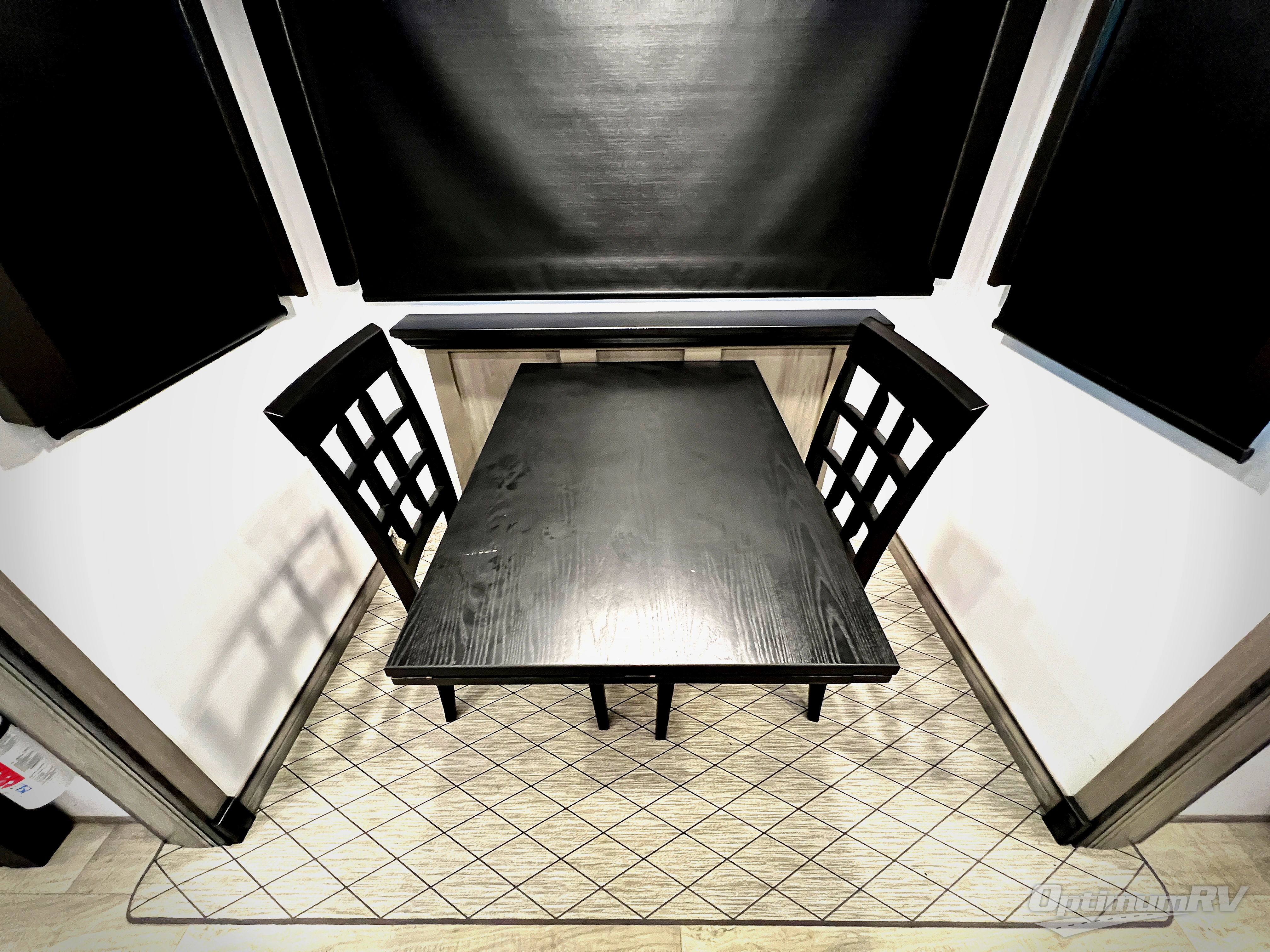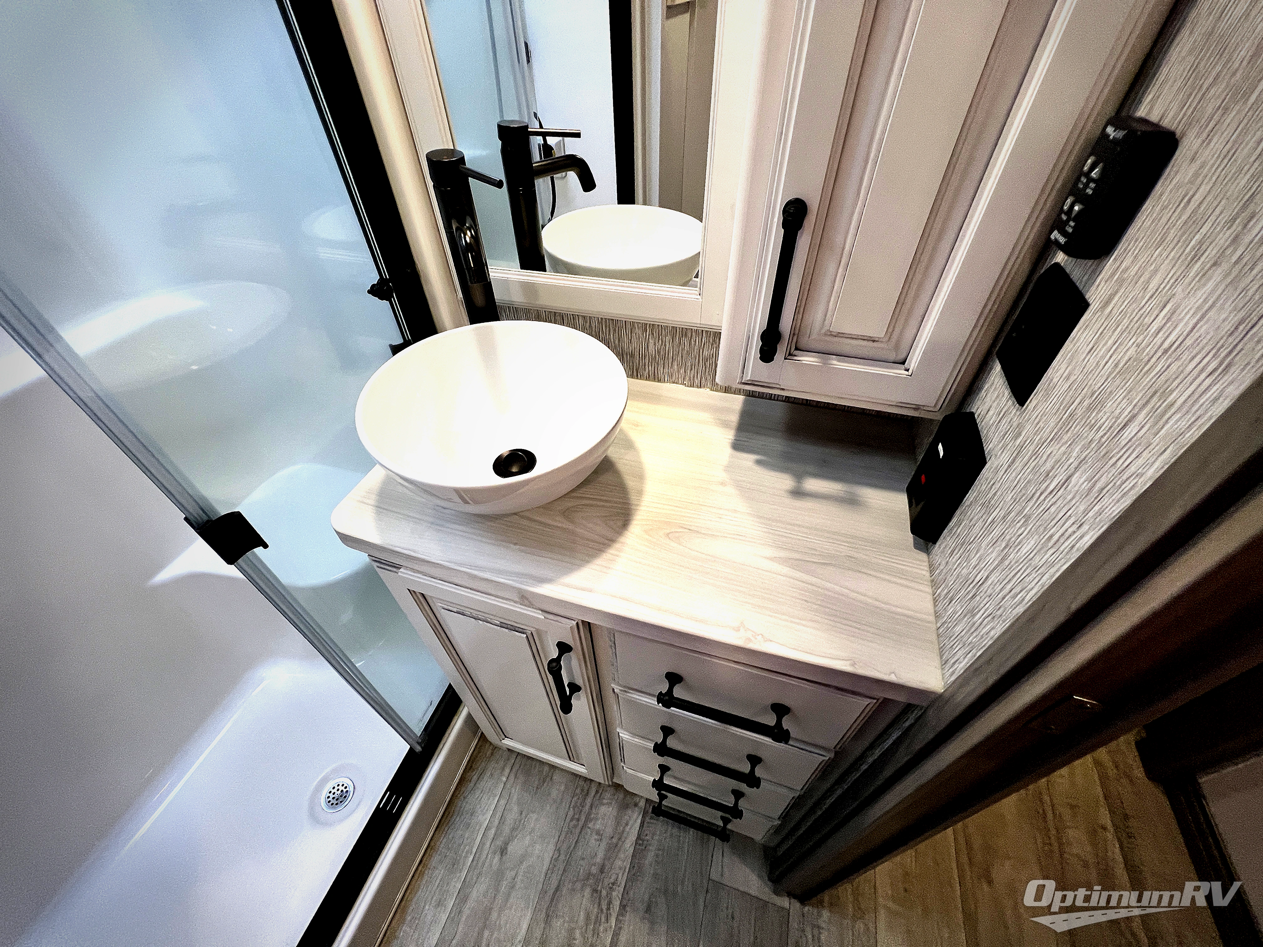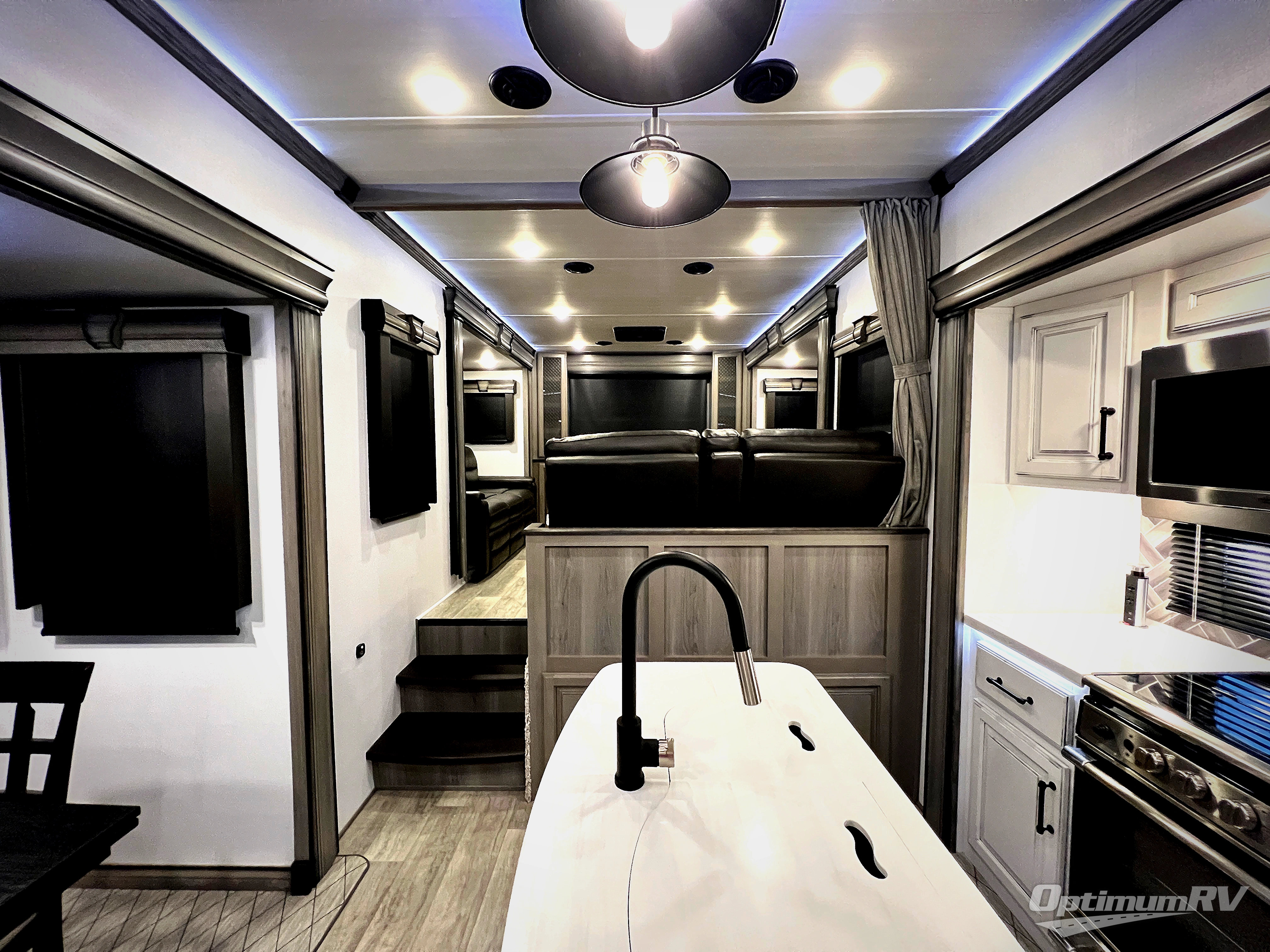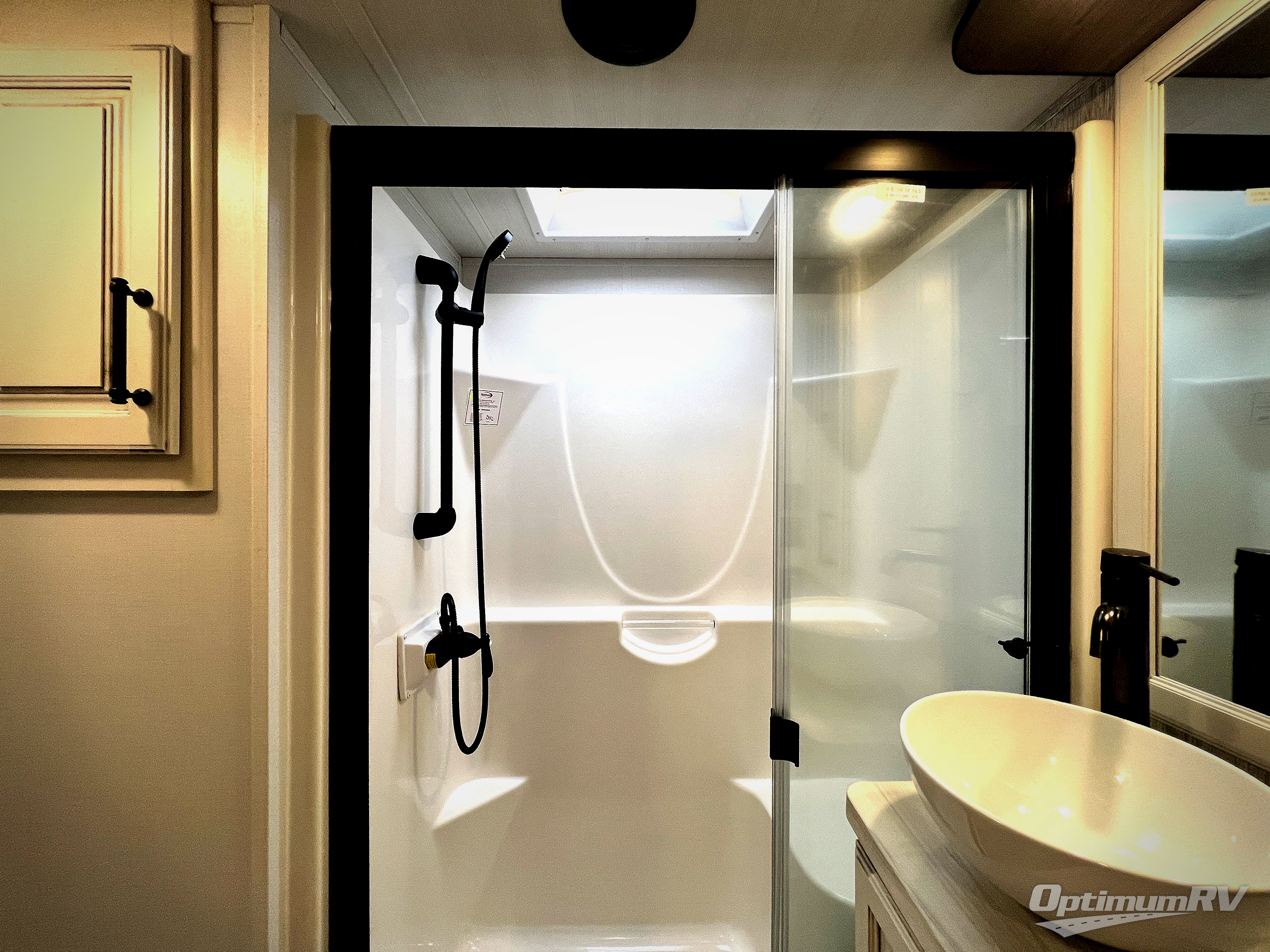 The coffee lover will enjoy camping in this fifth wheel with the coffee station in the kitchen! The kitchen also has an island, a large pantry, a glass top range with convection microwave and range hood that has a pull-down spice rack, a 18 cu. ft. residential refrigerator, and floor cabinets for your storage needs. Eat your meals and play card games at the free standing legless dinette with 110V outlets to charge your electronics. The separated living area has opposing hide-a-bed sofas and power Thomas Payne theater seating across from a rear entertainment center with a telescoping 50" LCD HDTV and a 5,000 BTU decorative fireplace heater with storage on either side. When you're ready to wind down your nights, head to the front private bedroom to enjoy a good night's rest on the king bed slide with storage underneath and there is a front closet with a clothing hamper and an area to add the optional stackable washer and dryer to have clean clothes for your longer trips!