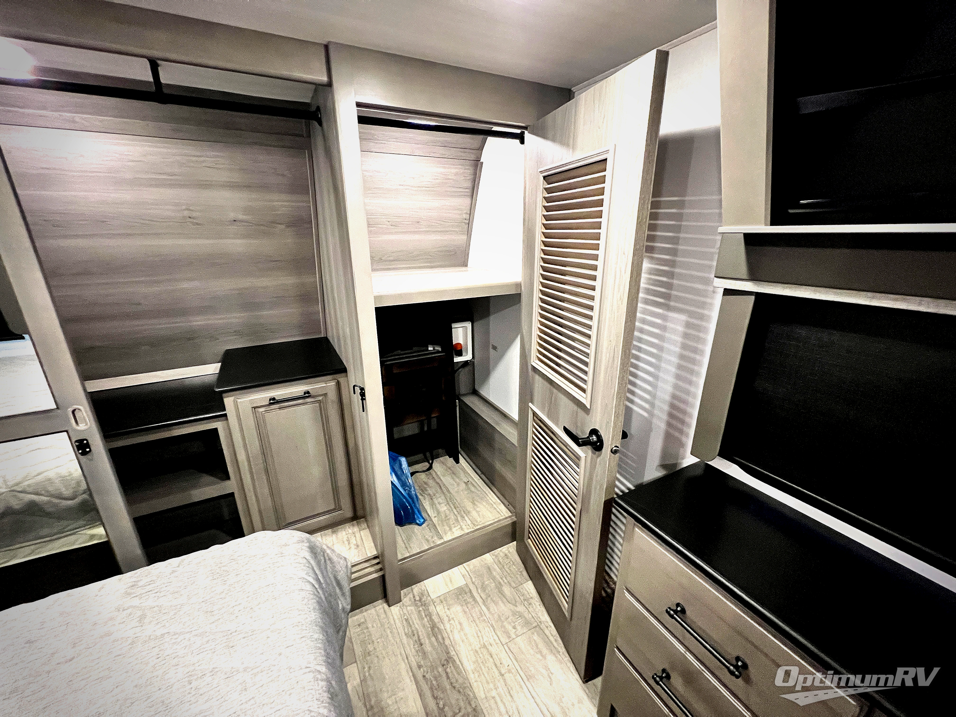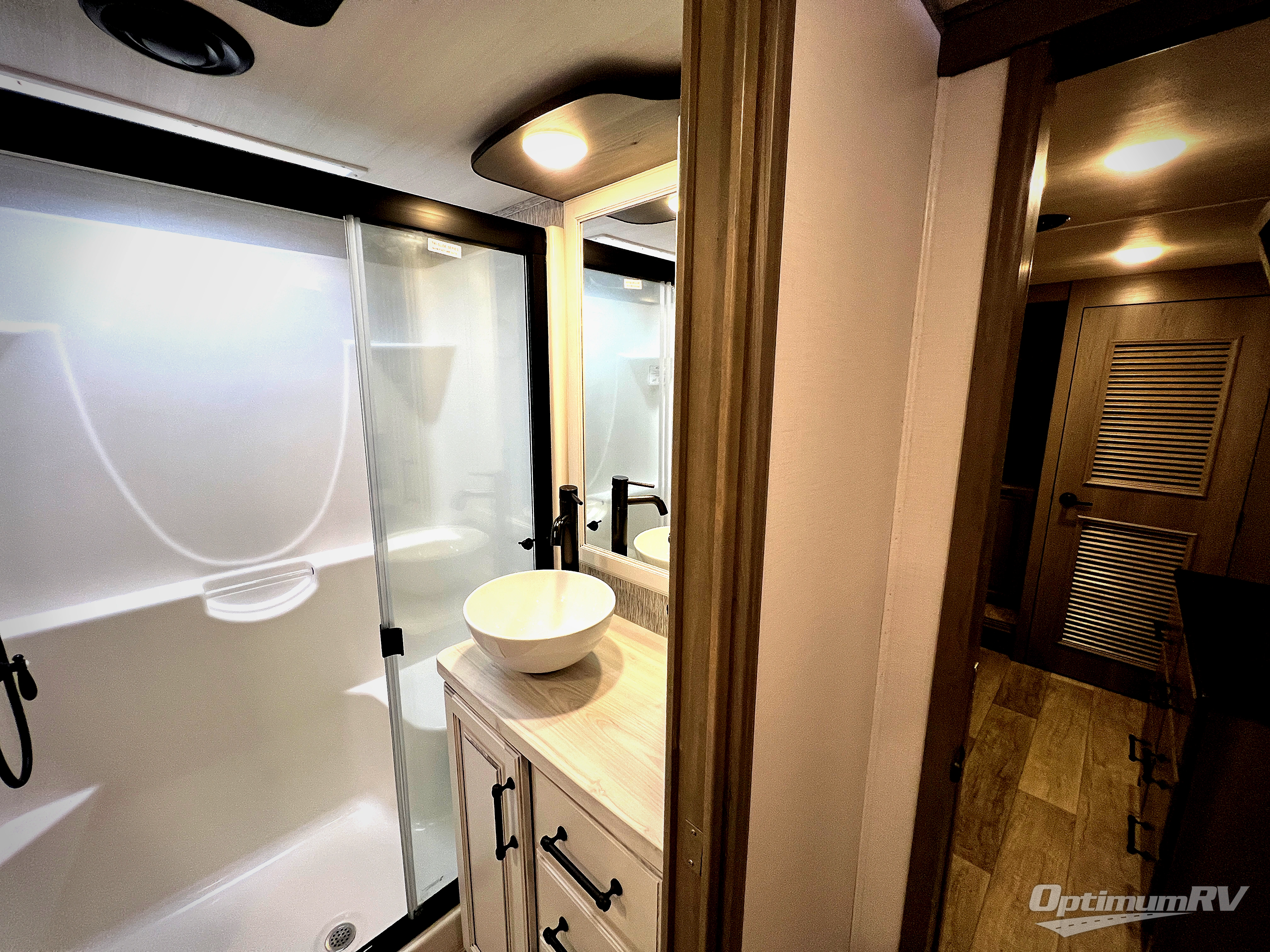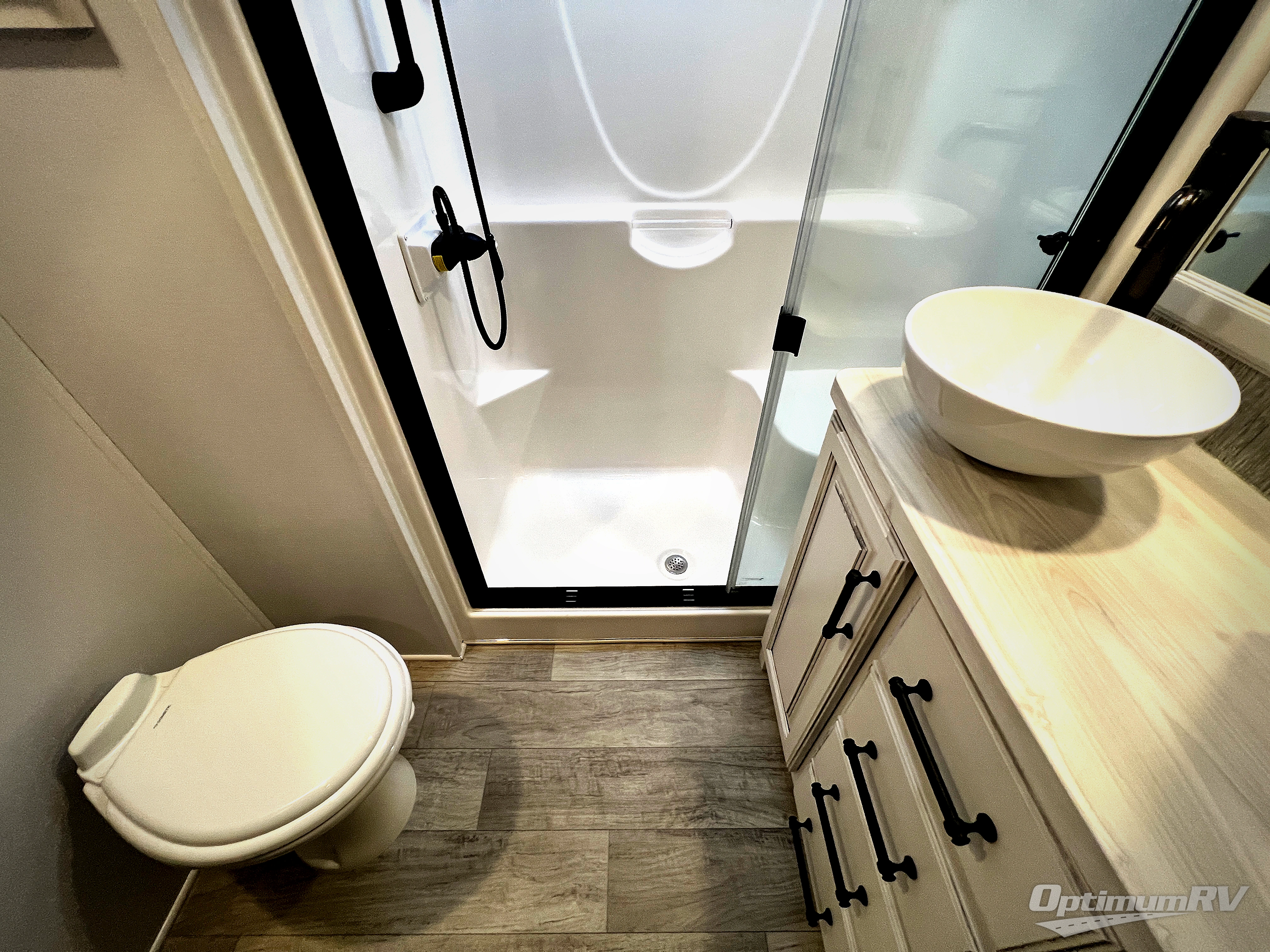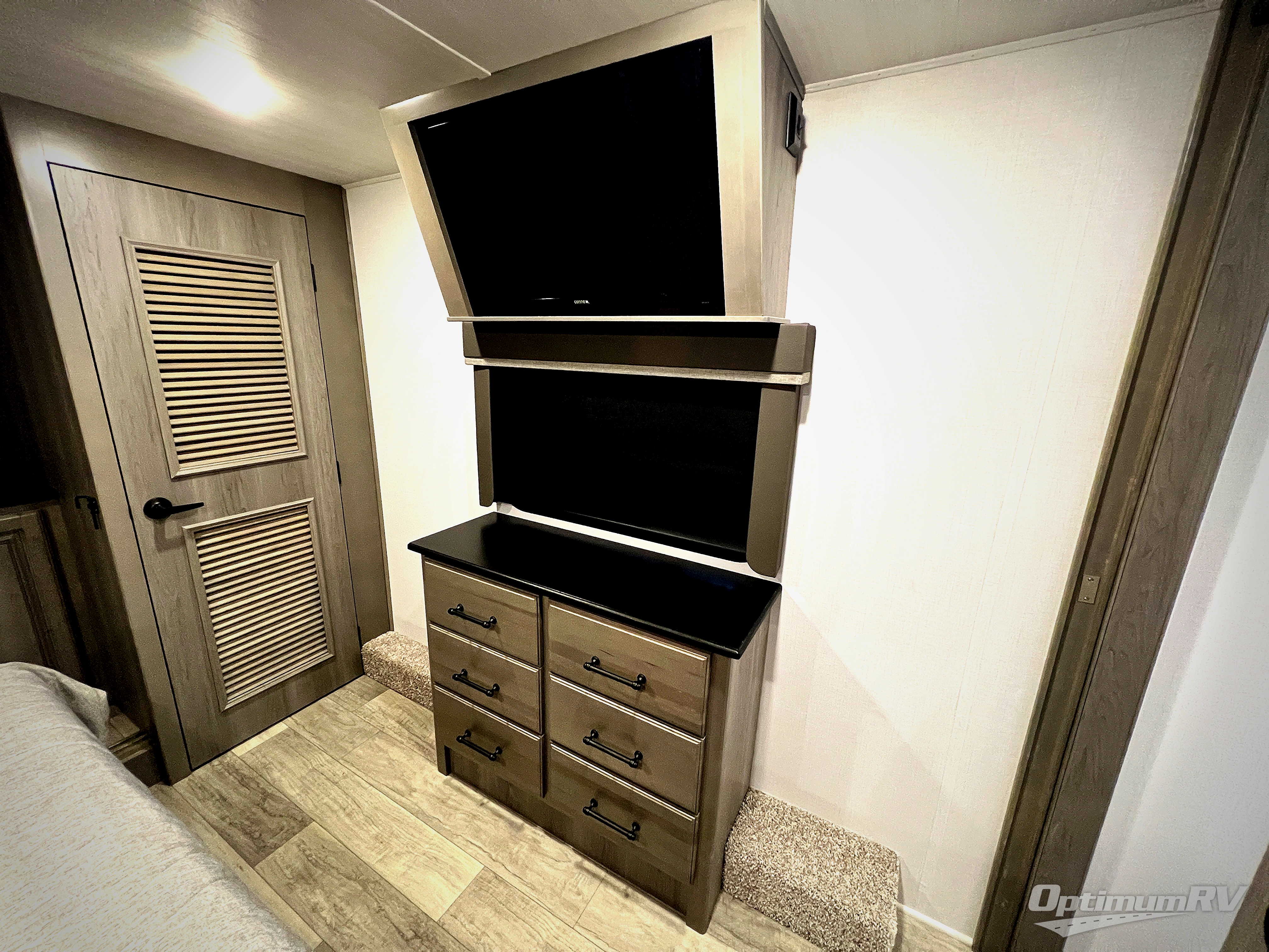 The coffee lover will enjoy camping in this fifth wheel with the coffee station in the kitchen! The kitchen also has an island, a large pantry, a glass top range with convection microwave and range hood that has a pull-down spice rack, a 18 cu. ft. residential refrigerator, and floor cabinets for your storage needs. Eat your meals and play card games at the free standing legless dinette with 110V outlets to charge your electronics. The separated living area has opposing hide-a-bed sofas and power Thomas Payne theater seating across from a rear entertainment center with a telescoping 50" LCD HDTV and a 5,000 BTU decorative fireplace heater with storage on either side. When you're ready to wind down your nights, head to the front private bedroom to enjoy a good night's rest on the king bed slide with storage underneath and there is a front closet with a clothing hamper and an area to add the optional stackable washer and dryer to have clean clothes for your longer trips!