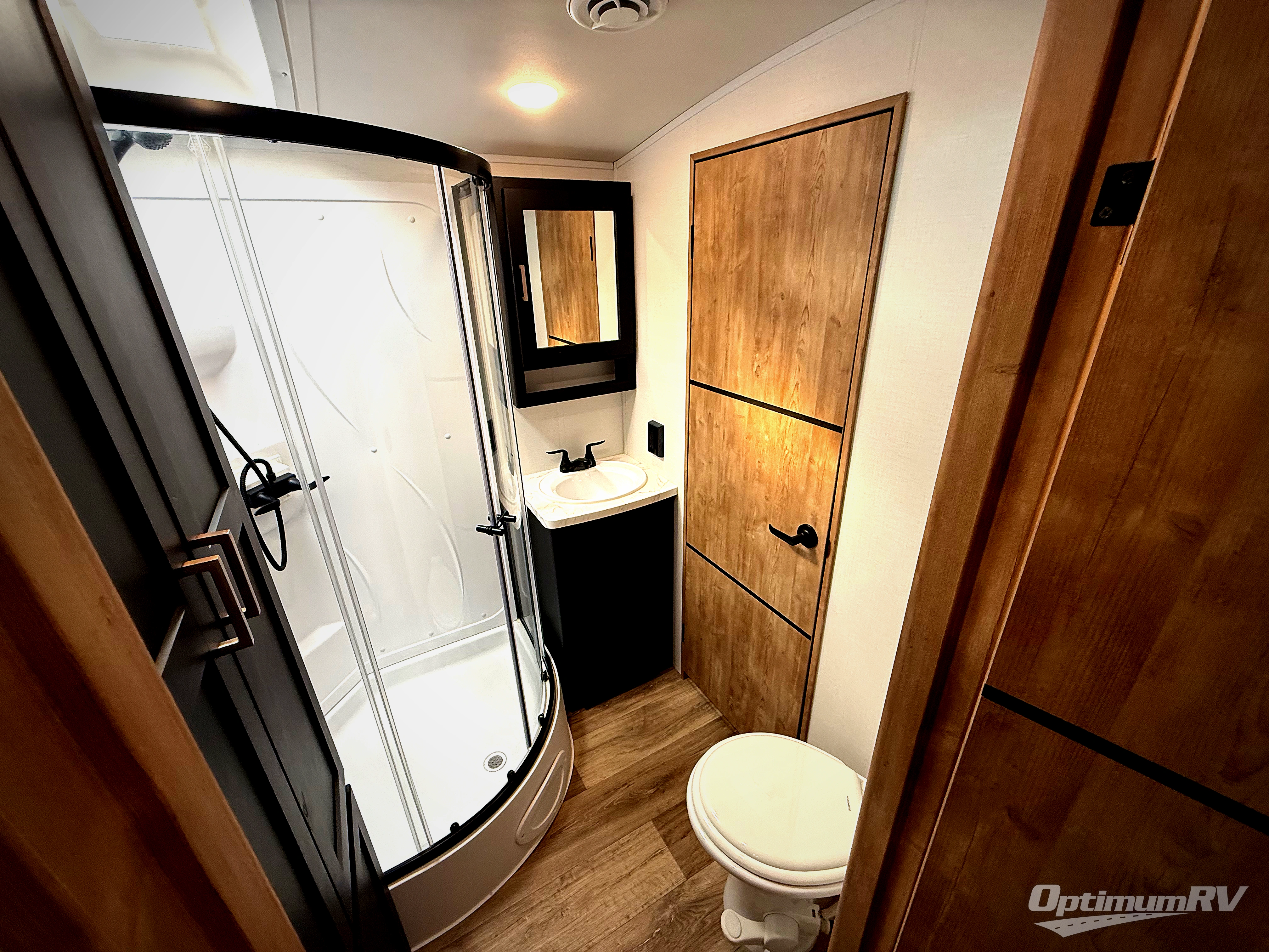 A spacious rear living area is created by two opposing slide outs giving everyone plenty of floor space to move from the sofa sleeper to the double entry bathroom and front private bedroom. You can relax on the theater seats while watching the 50" HDTV with fireplace below, and dine at the booth dinette. The kitchen island is a great place to wash the veggies and fruit, and prepare meals. The cook will have full amenities including more counter space near the microwave. And there is an outside kitchen with a flip-out stove and more. The slide out king bed gives you more space in the front bedroom, and you will find plenty of storage and a place for your best friend in the built-in pet kennel. You may choose to change the 10 cu. ft. refrigerator to an 8 cu. ft. option and/or replace the dinette that comes standard with a table and chairs option.