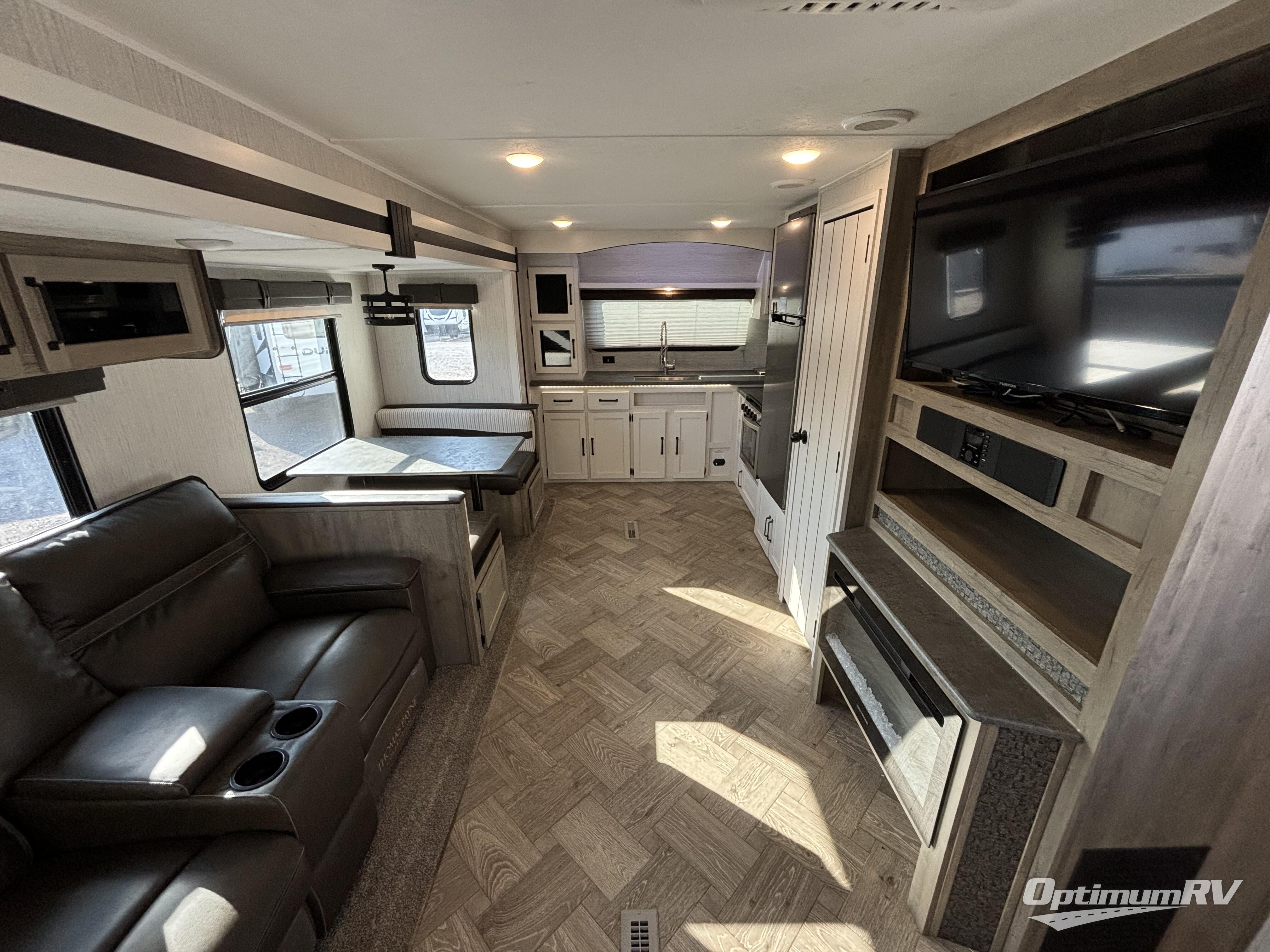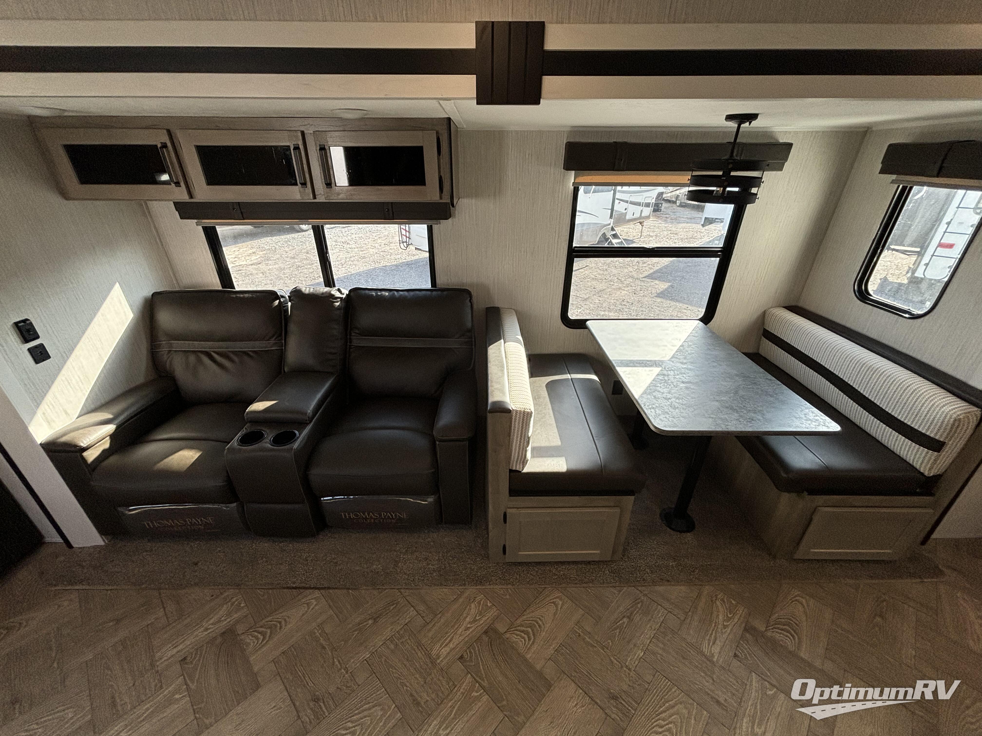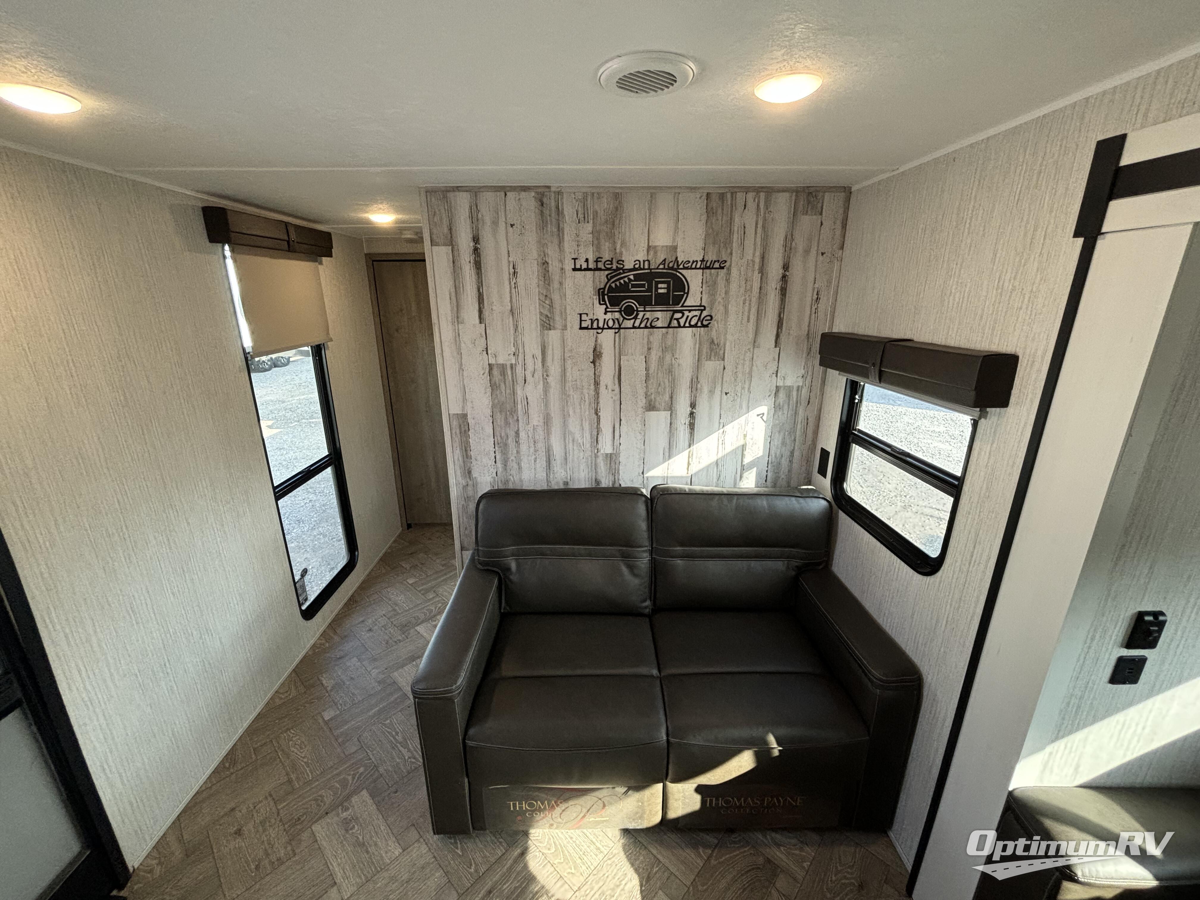 Experience a home away from home with this travel trailer! The front kitchen has everything you will need to prepare your best meals and you can enjoy them at the booth dinette. You could even add the optional exterior micro kitchen with griddle for a sunrise breakfast. The rear private bedroom has a 72" x 80" king bed slide across from a dresser, a wardrobe, and a closet next to it that is prepped to add an optional washer and dryer. Freshen up in the full bathroom with the 34" x 34" radius shower and then enjoy a cup of coffee relaxing in one of the two recliners or on the sofa!