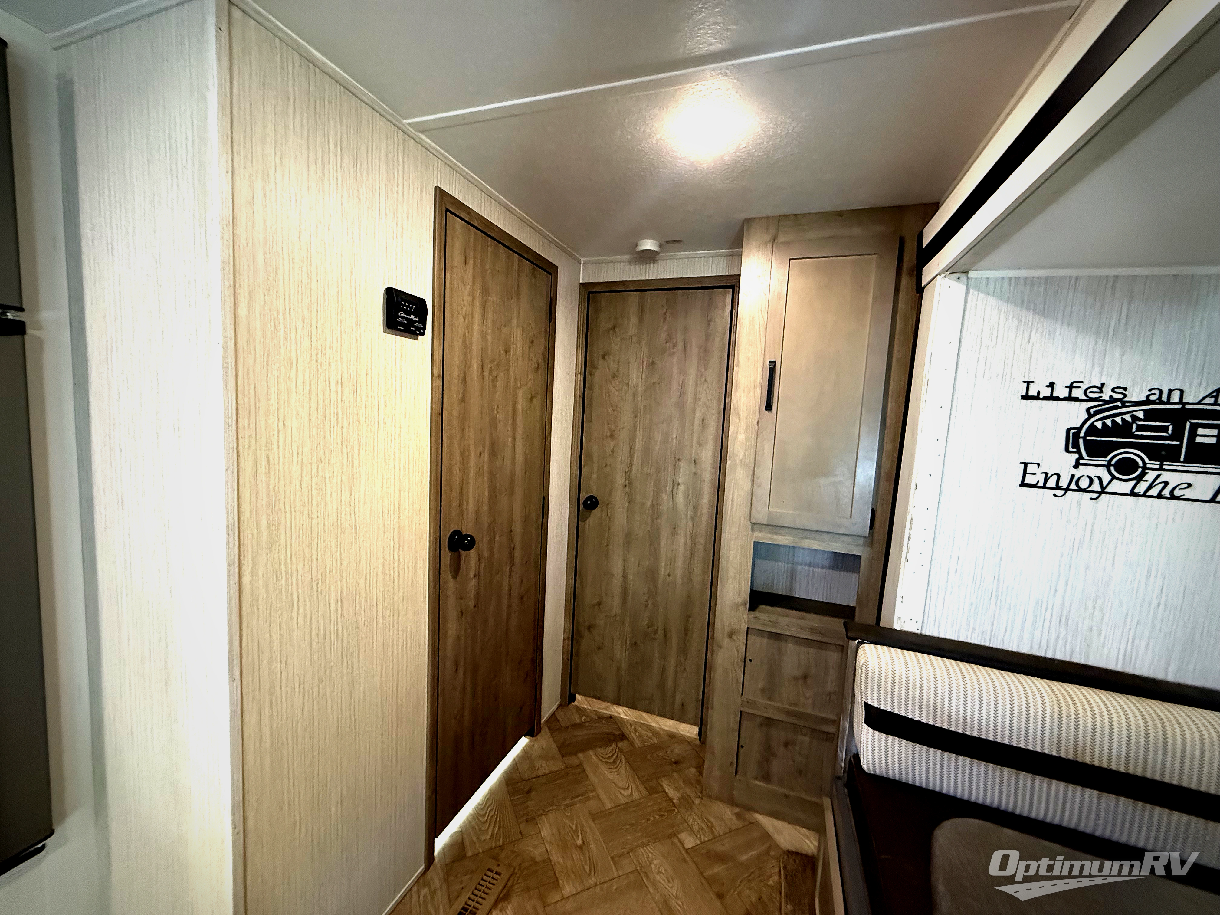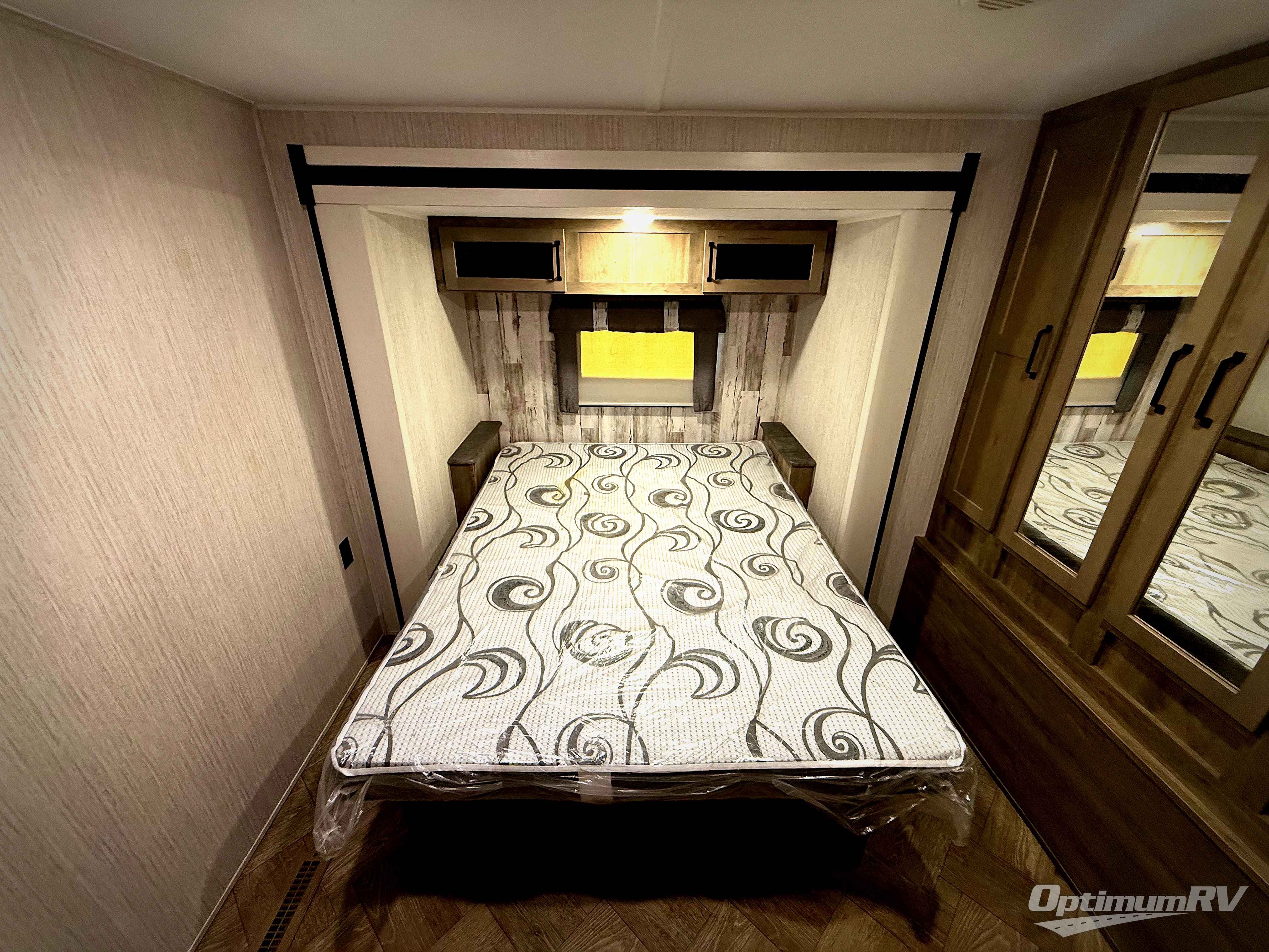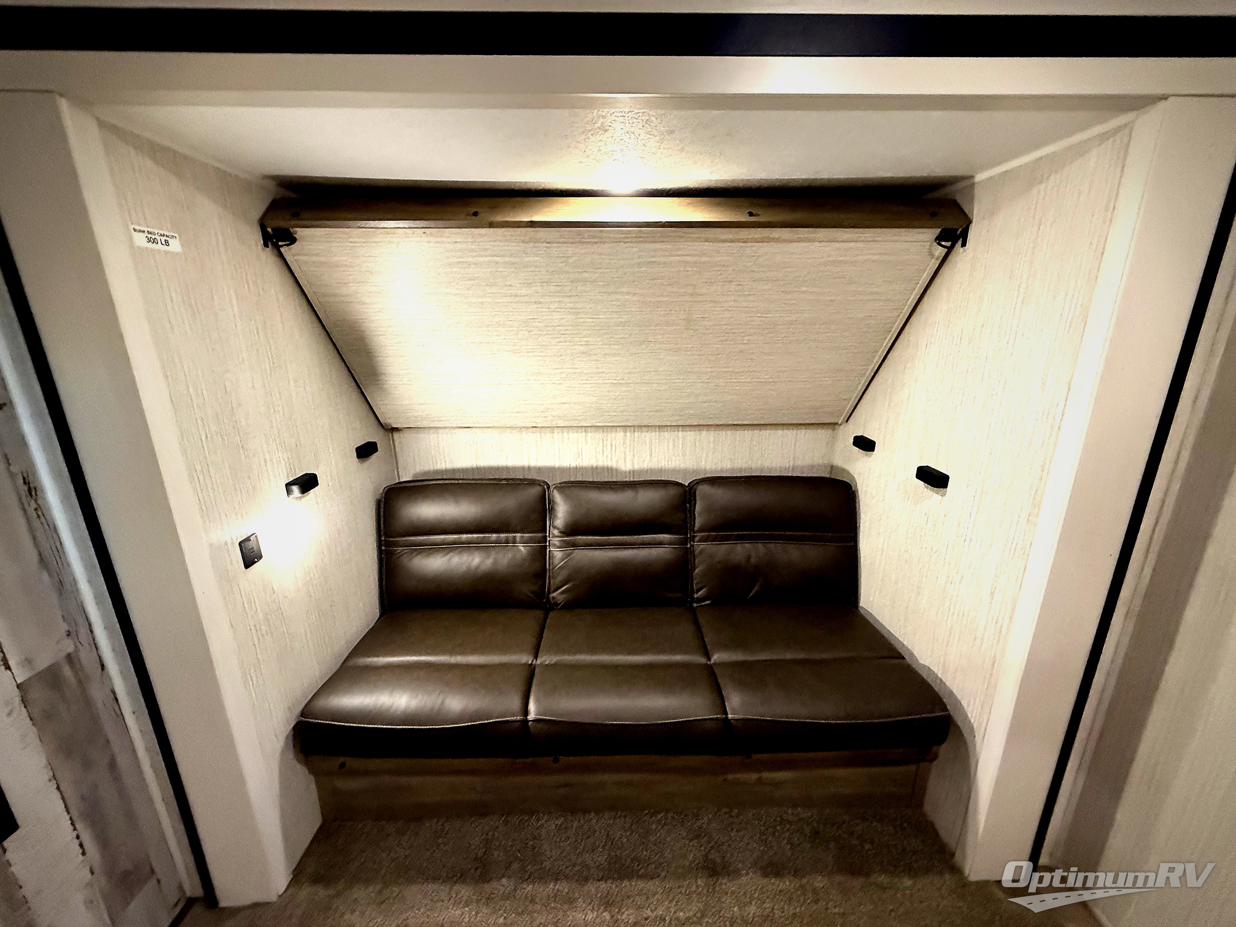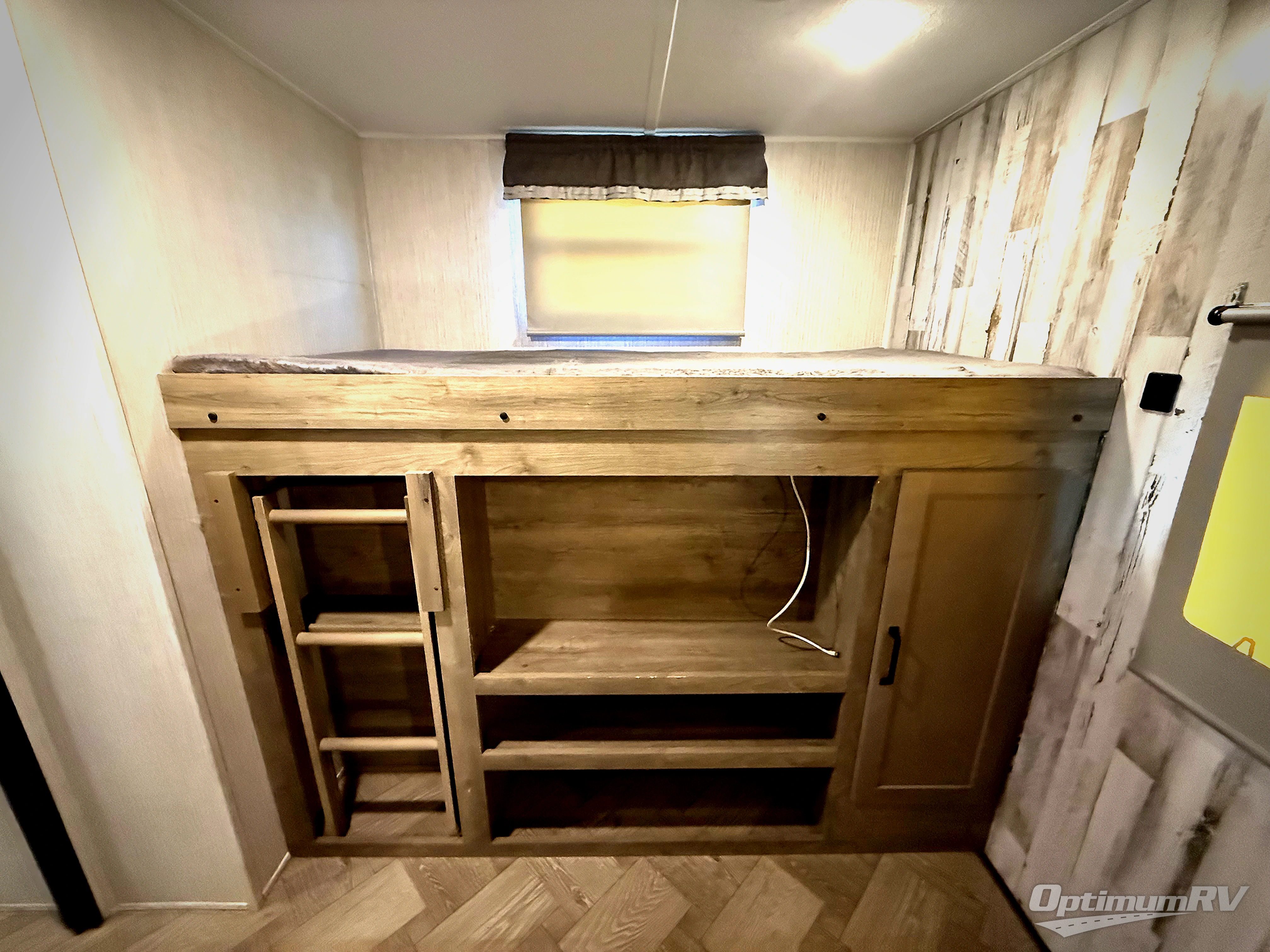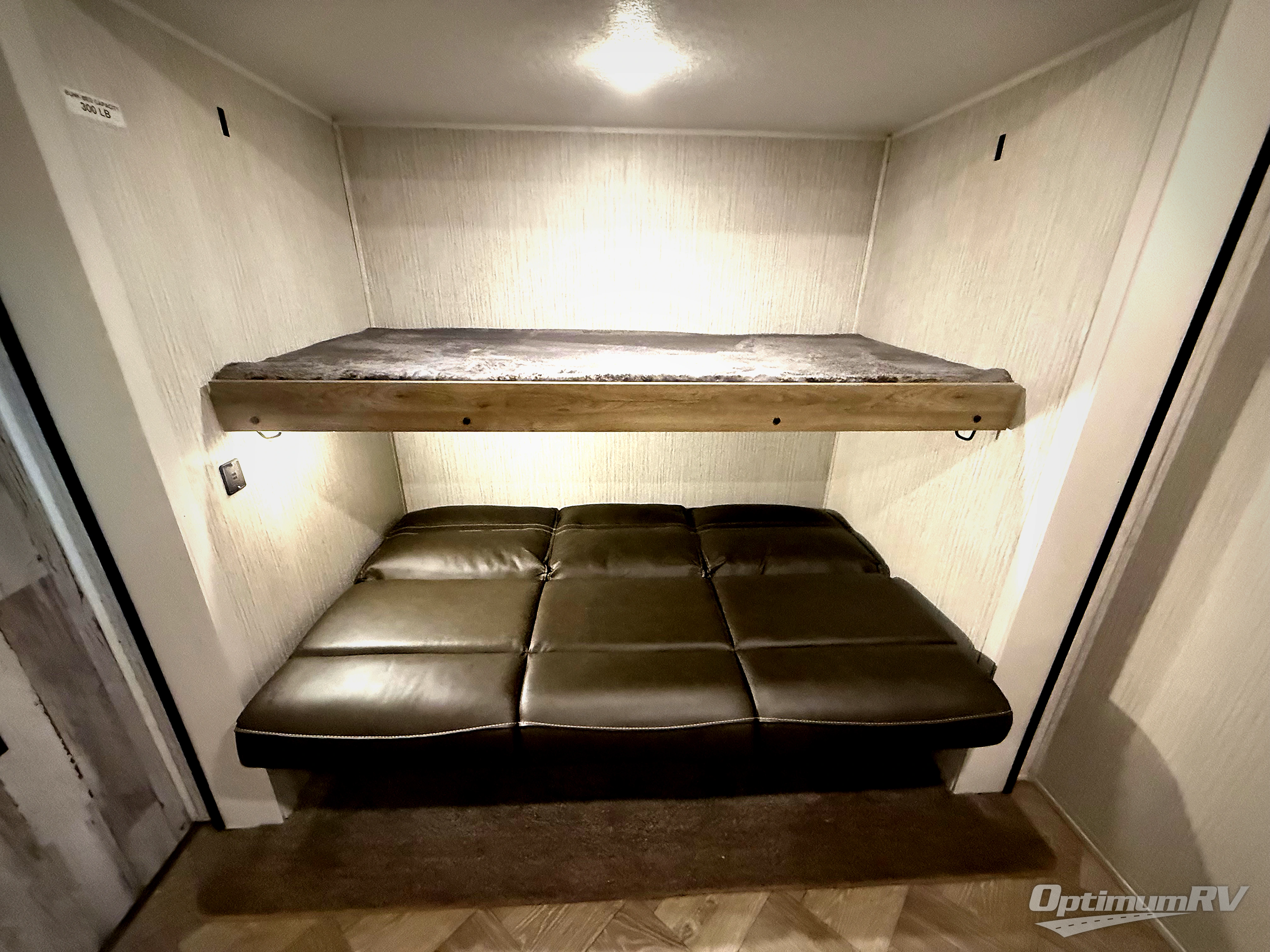 The whole family will love camping in this travel trailer! The kids will have their own privacy with the rear private bunkhouse which has a 32" x 69" bunk above a jiffy sofa slide and a 38" x 76" bunk above an entertainment center to keep them occupied on those rainy days. And you will have your own privacy with the front private bedroom that has a queen bed slide across from a dresser and a front closet with another closet next to it that is prepped to add an optional washer and dryer. Everyone can stay clean in the full bathroom with the 34" x 34" radius shower and their bellies full with a three burner cooktop. There is also an optional exterior kitchen with different layouts to choose from so you can be sure to have the one that meets your needs the best!