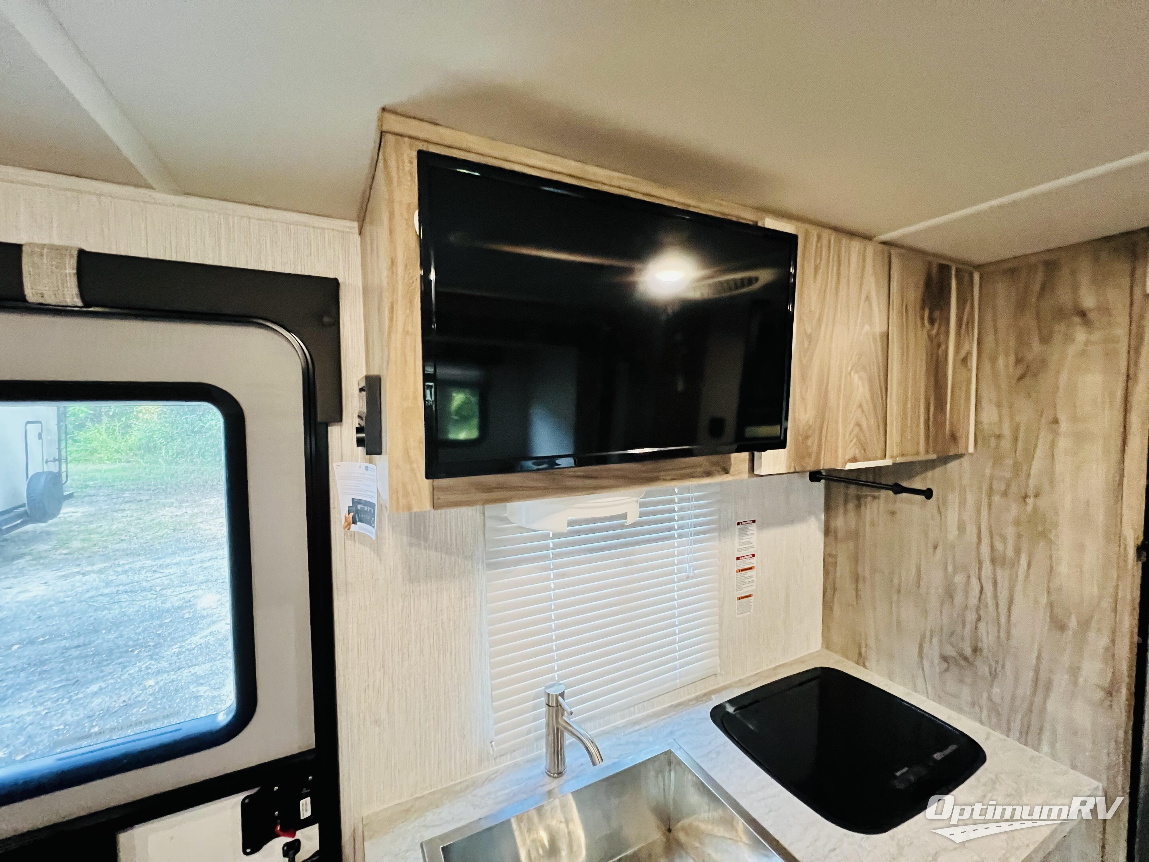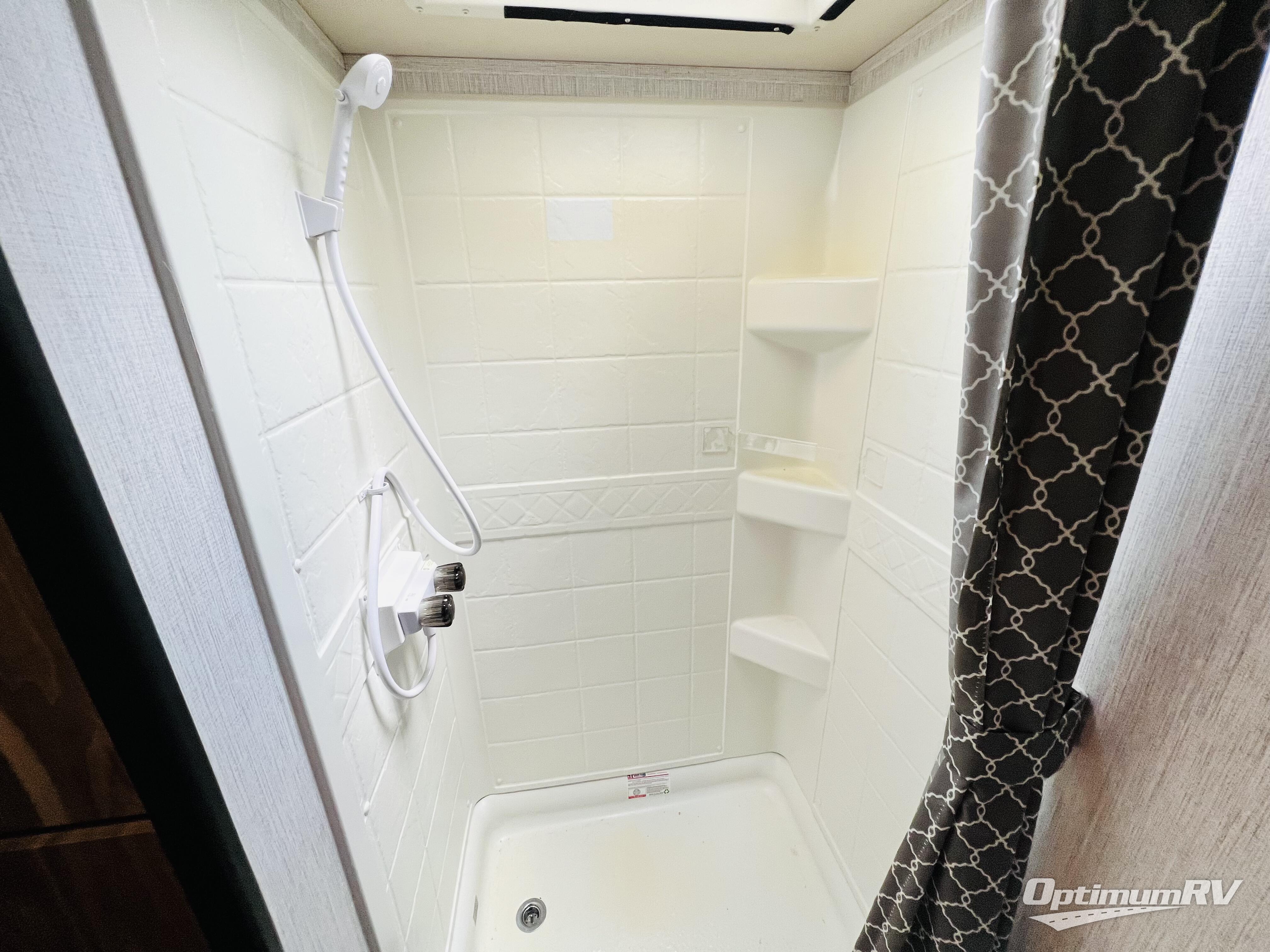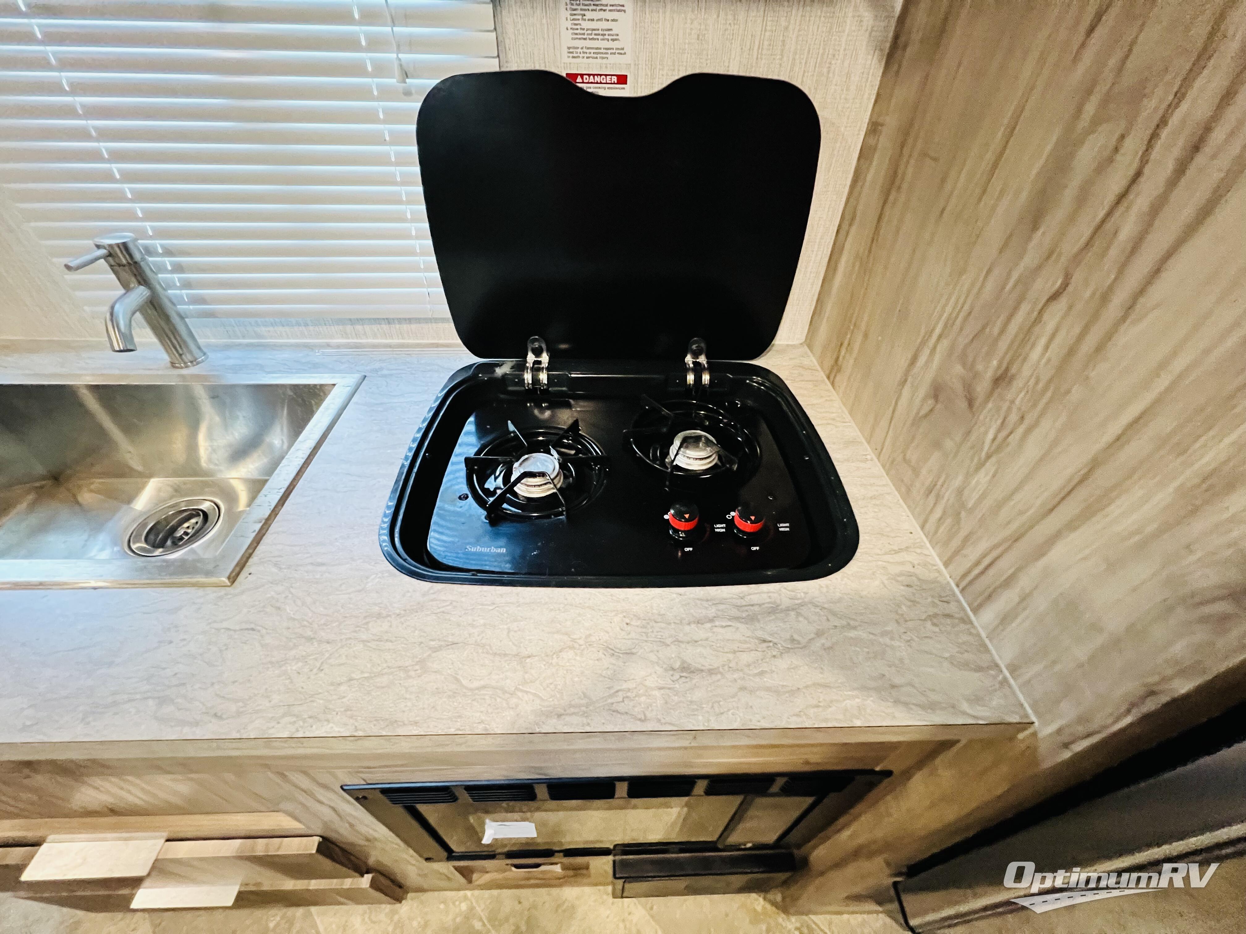 This Mini is great for a family that needs sleeping space for five or a group of friends that enjoys camping together! The owners will have a queen Murphy bed to sleep on at night once it is easily set up after enjoying the sofa during the daytime. There is a set of bunk beds in the rear next to the toilet and shower room that offers convenience and privacy, and the dinette slide out offers dining and sleeping space, plus extra floor space for all to move about the trailer. There is a two burner cooktop and microwave for the chef to make warm meals, and a pantry for dry goods and snacks, plus a 10 cu. ft. refrigerator. Outside, the 15' power awning can provide some protection from the sun during the day and at night the LED light is handy while staying up late.