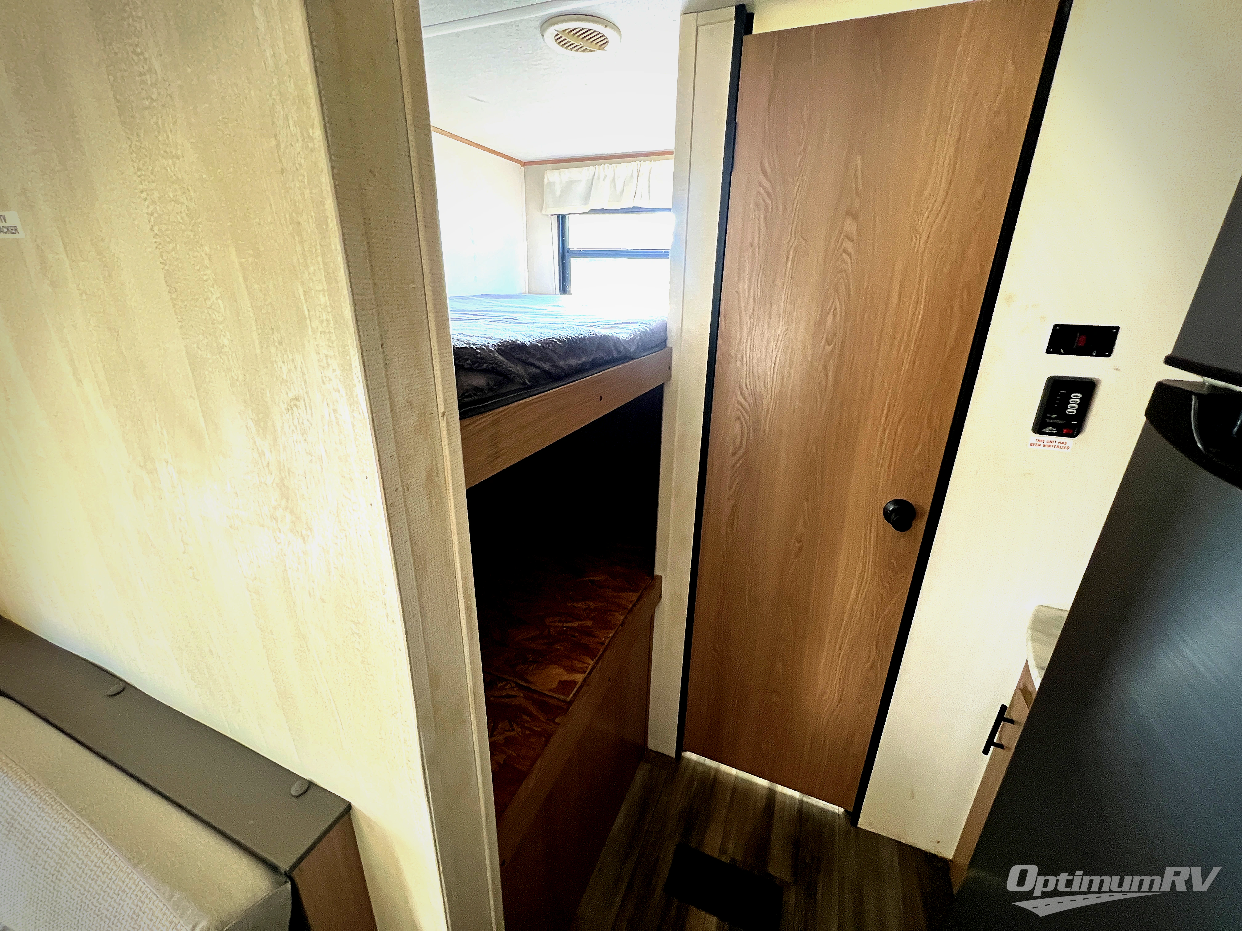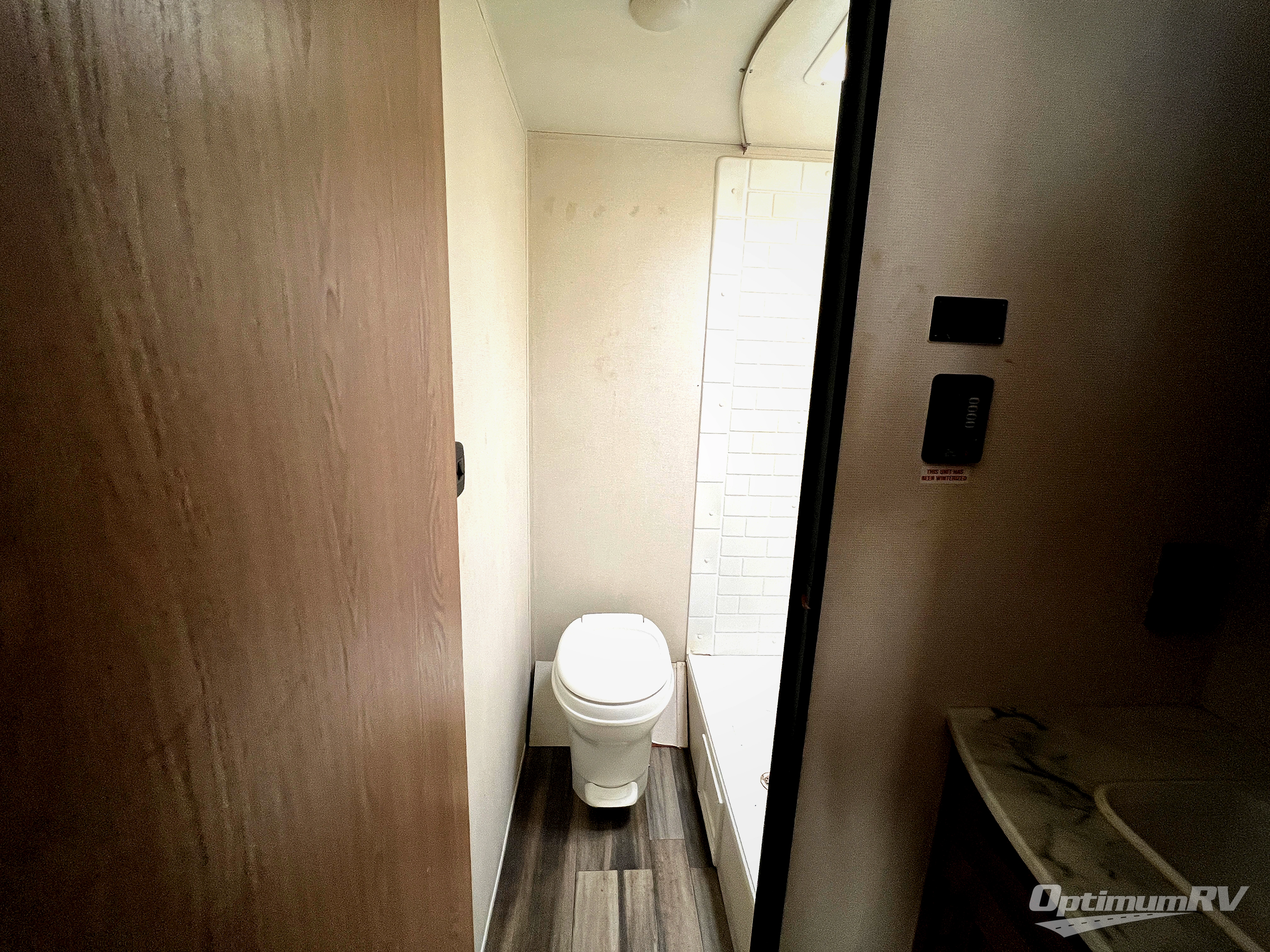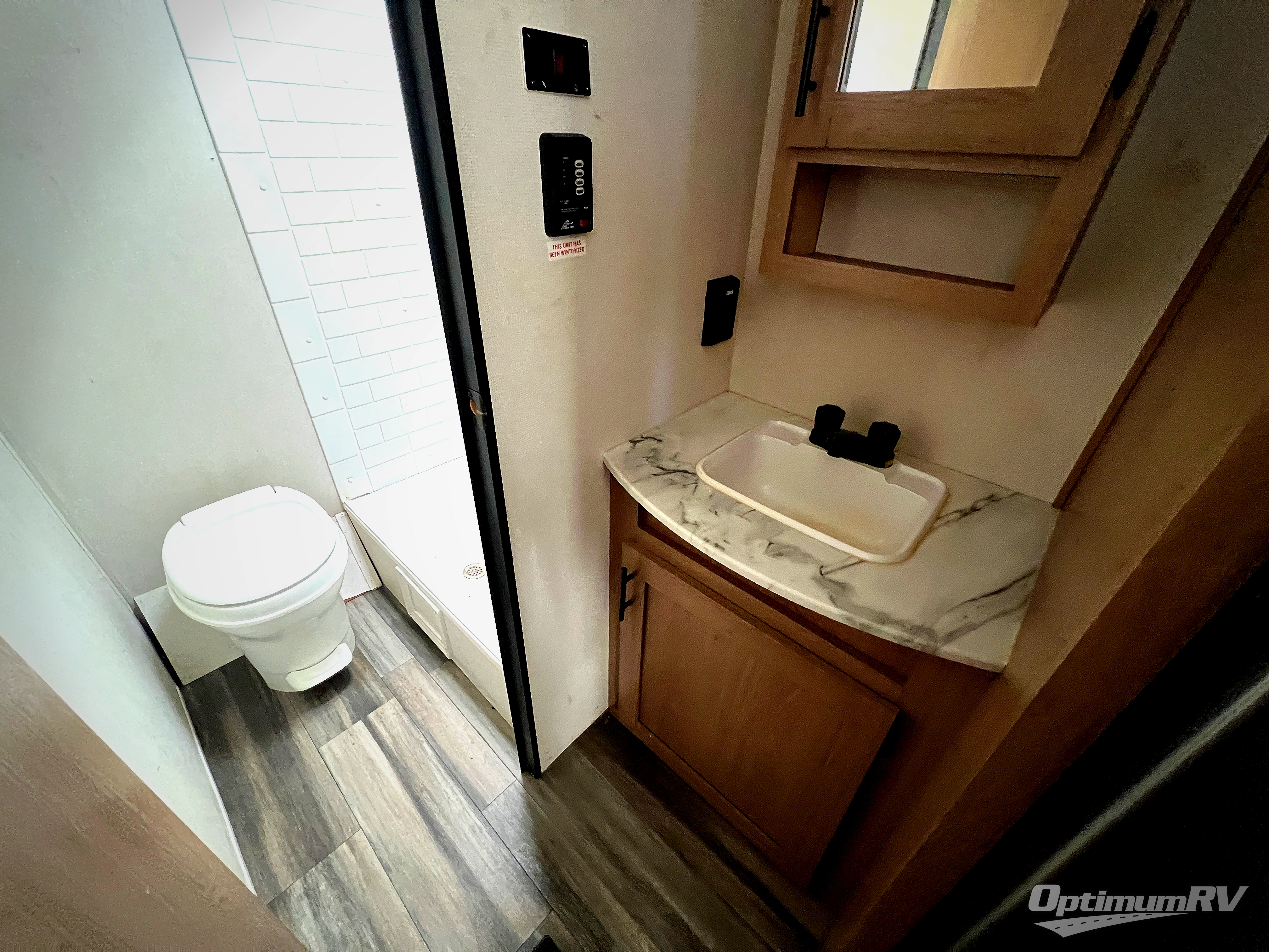 The cook is going to enjoy having choices for every meal, whether to use the full kitchen amenities inside or the outdoor kitchen while visiting with others relaxing under the 13' power awning. With the inclusion of a walk-around queen bed in the front bedroom, plus the sofa and booth dinette in the combined kitchen and living area, and the double-size bunks next to the bathroom sink and private toilet and toilet room, there is plenty of room to sleep eight or nine people each night. And the power awnings plus outdoor speakers give you an additional living area for everyone.