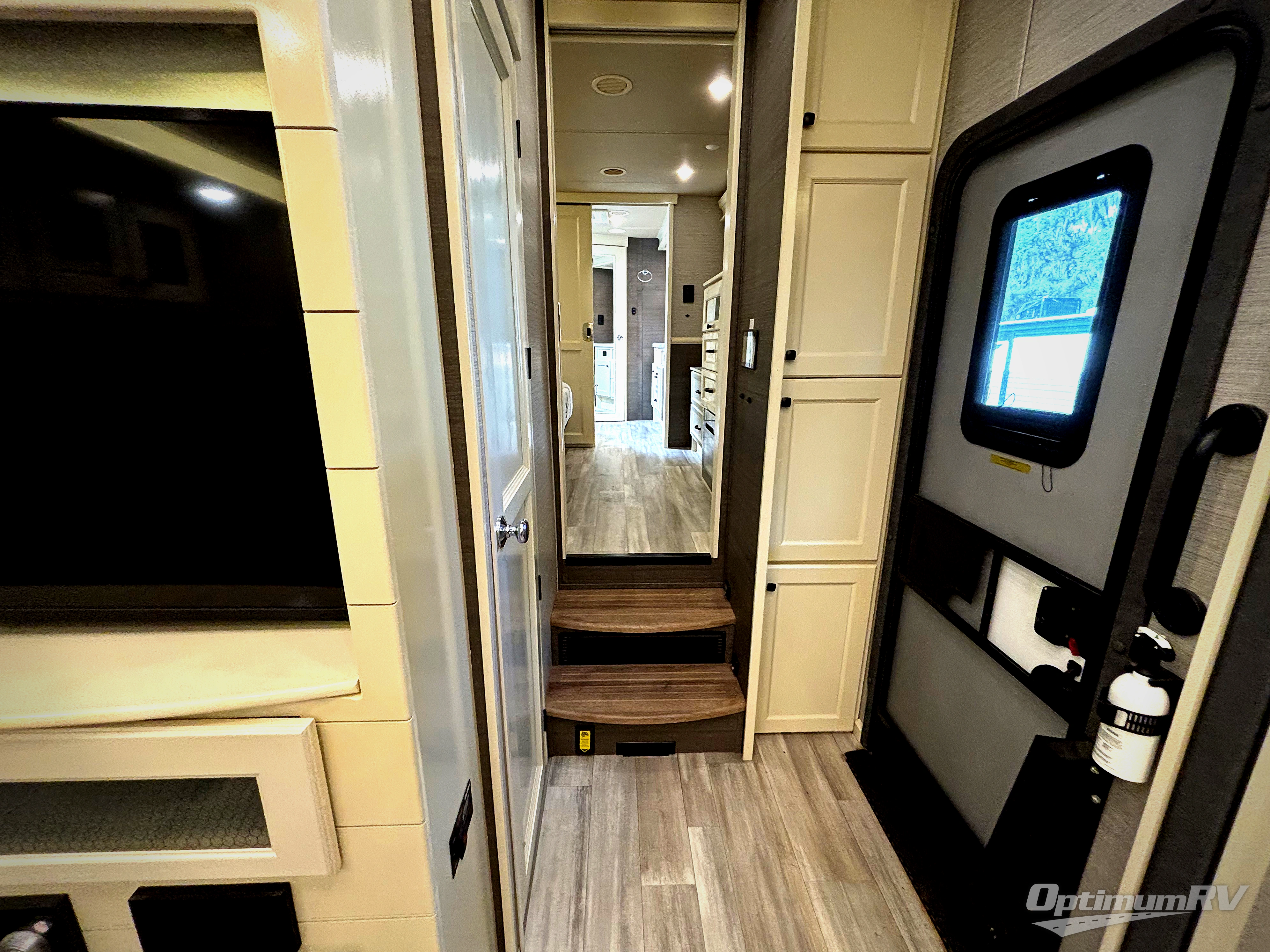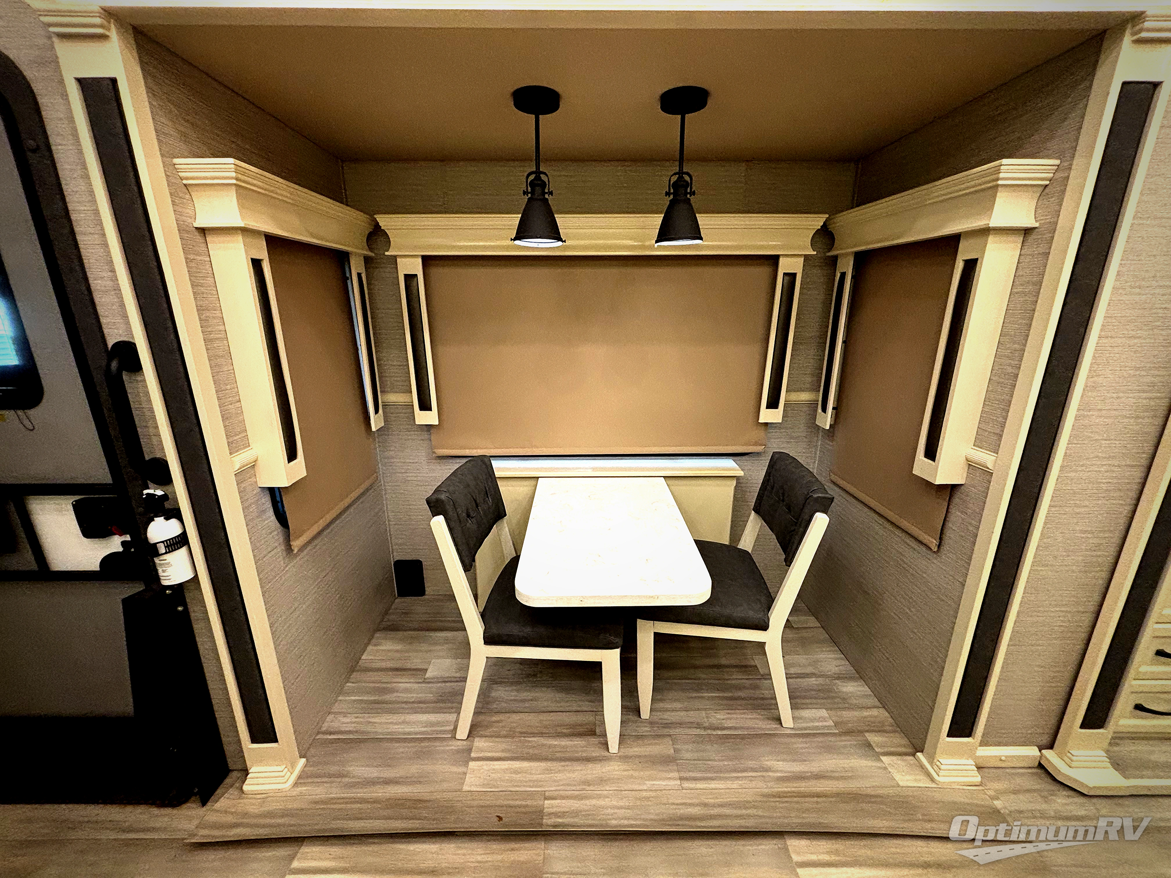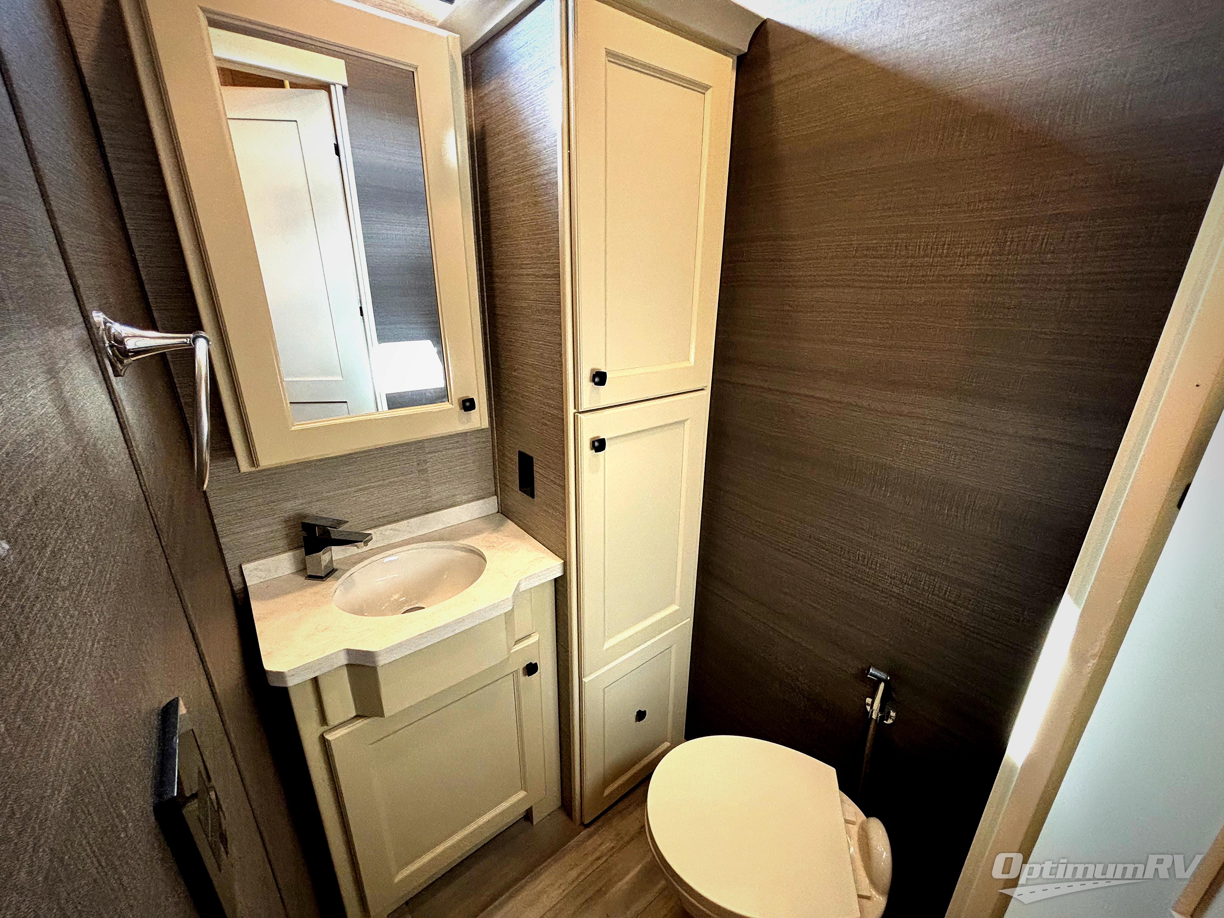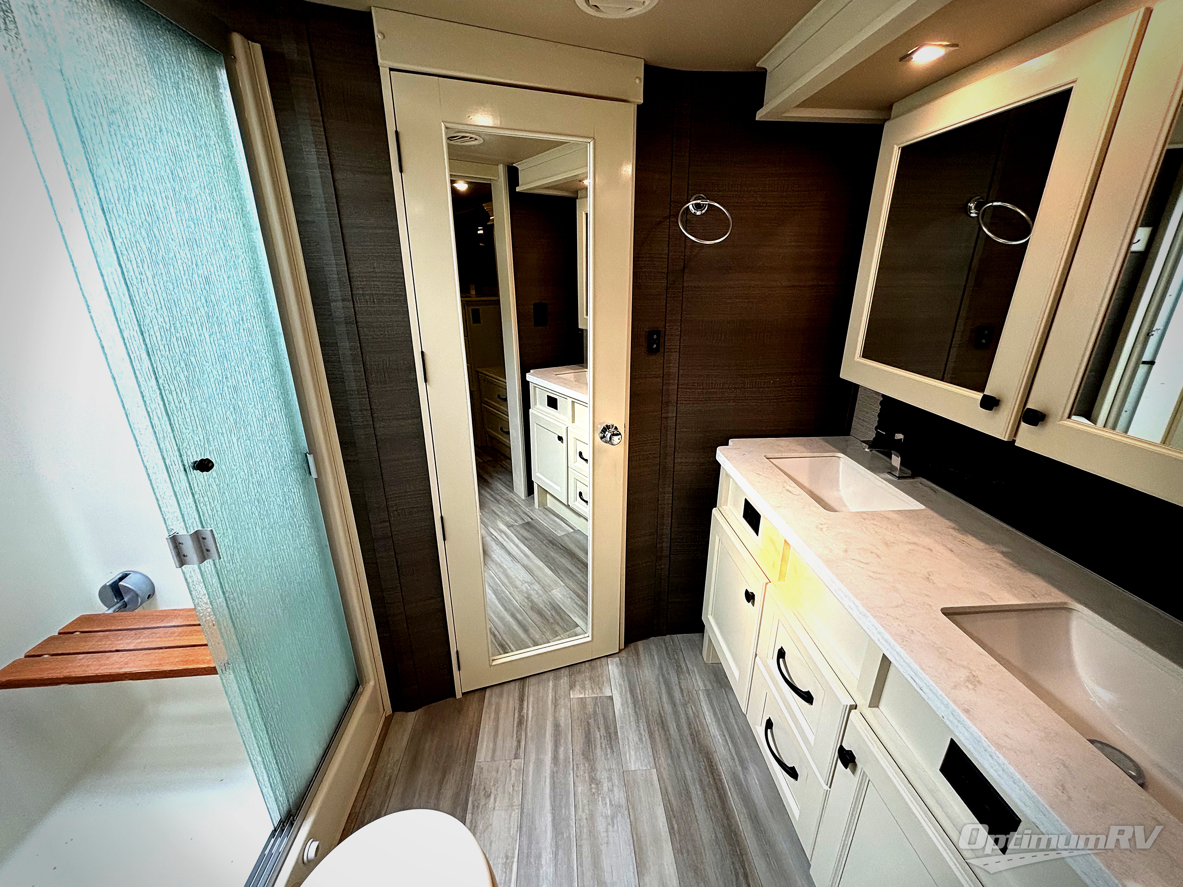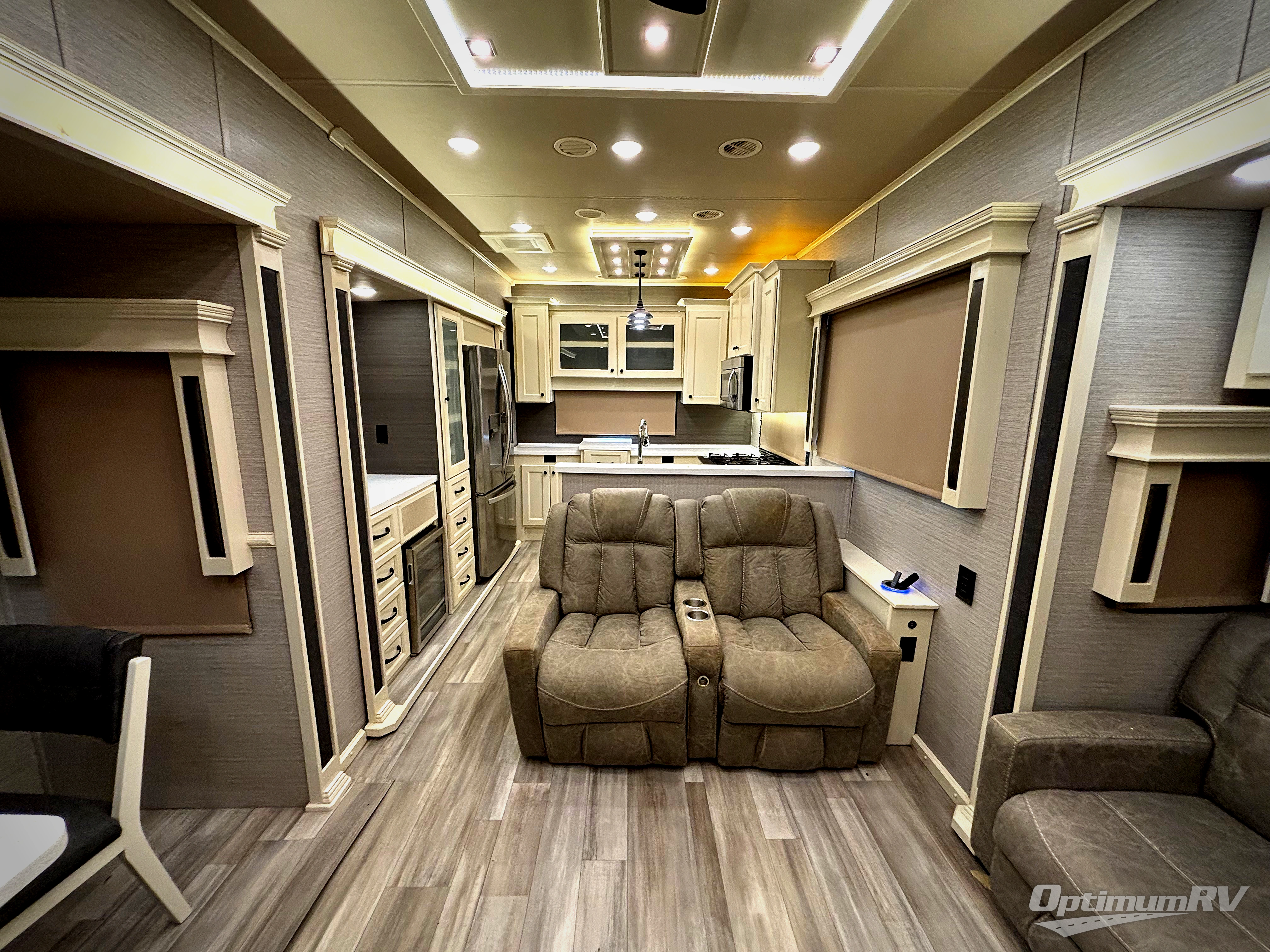 Your family vacations just got a whole lot sweeter in this fifth wheel that can sleep four people each night. Once you arrive at the campground, put out the four slides, then enjoy lunch on the dinette with chairs. The dual opposing slides here will let the kids play a board game on the floor if they want, and you and your spouse can relax on the theater sofa. Prep and cook all your meals in the rear kitchen that includes ample counter space, an Insignia oven and cooktop, plus an optional dishwasher to make cleaning up easier than ever. The master bedroom includes sliding doors to save on space, a king bed, plus a bedroom fireplace for a cozy evening indoors. You will love the front bath with its dual bath sinks, spacious shower with a Teak Wood seat, plus a large front closet with tons of storage space. This model also includes a convenient half bath for your guests, now that's what I call luxury!